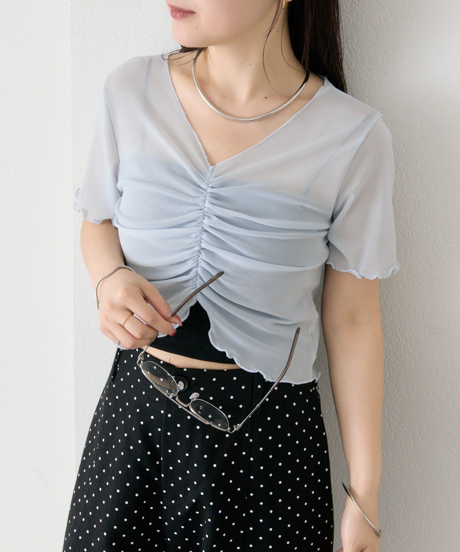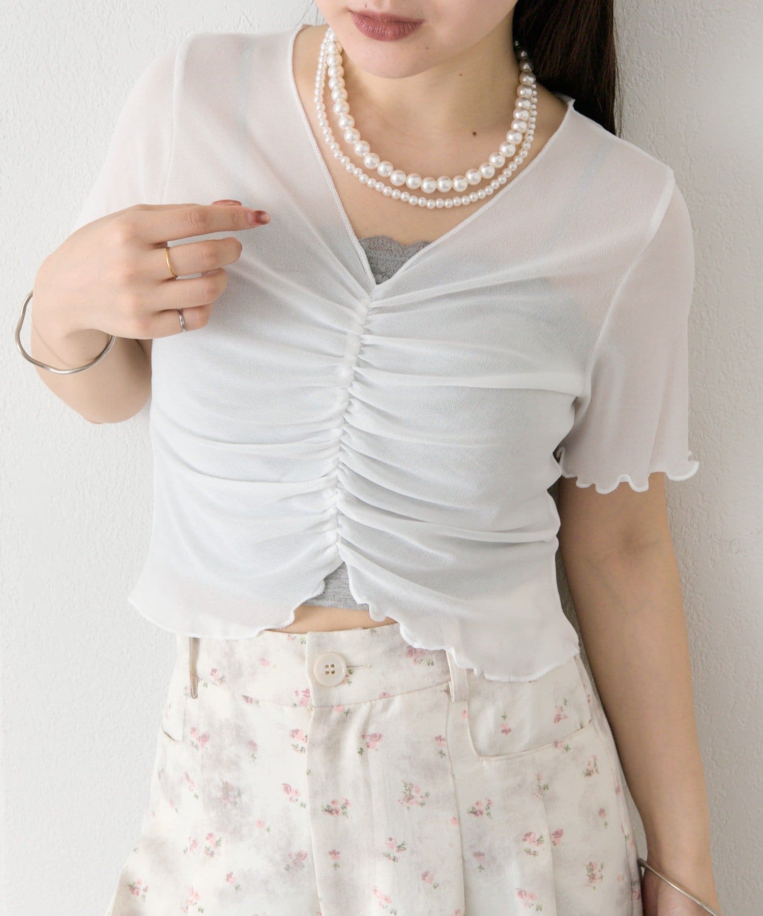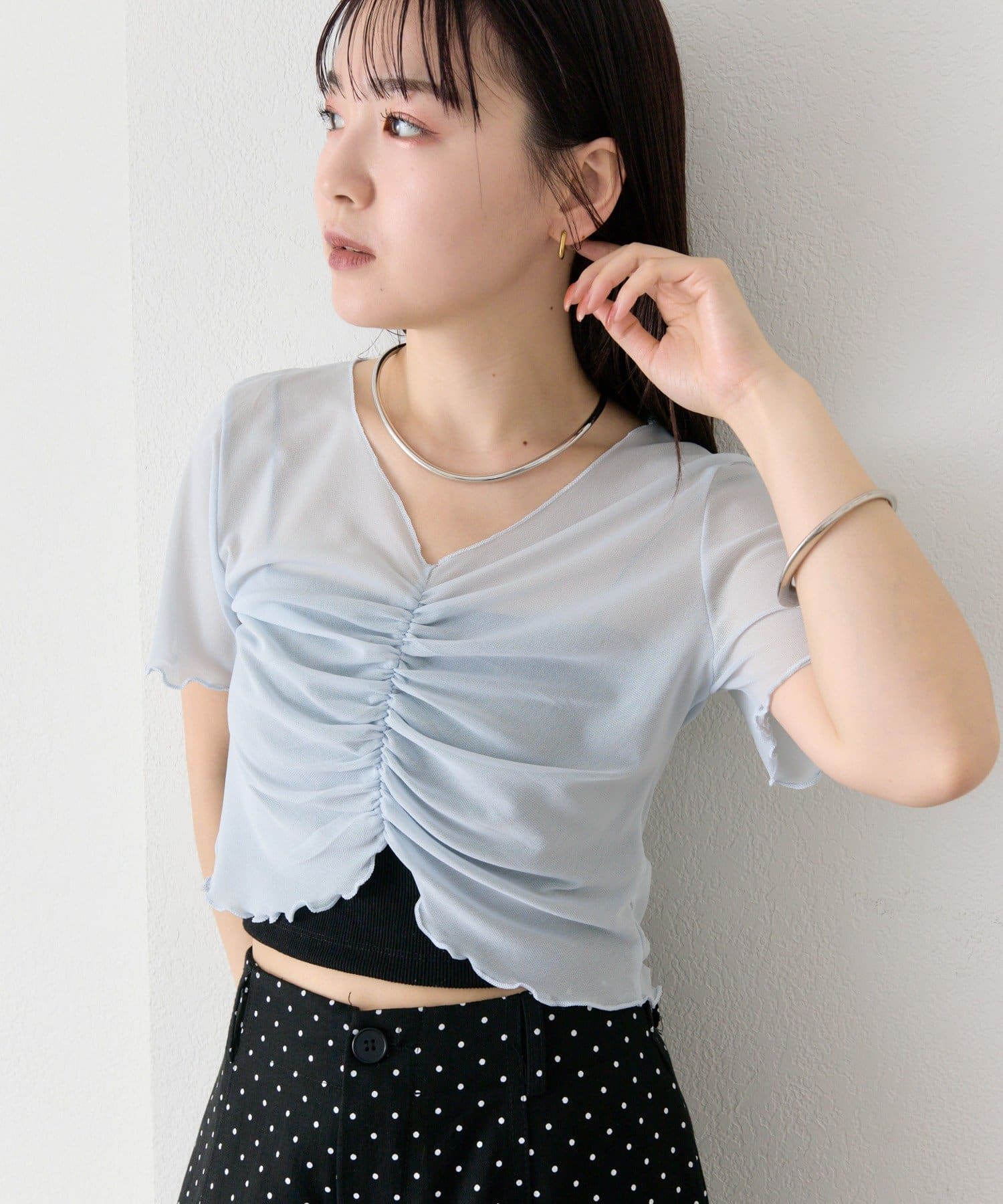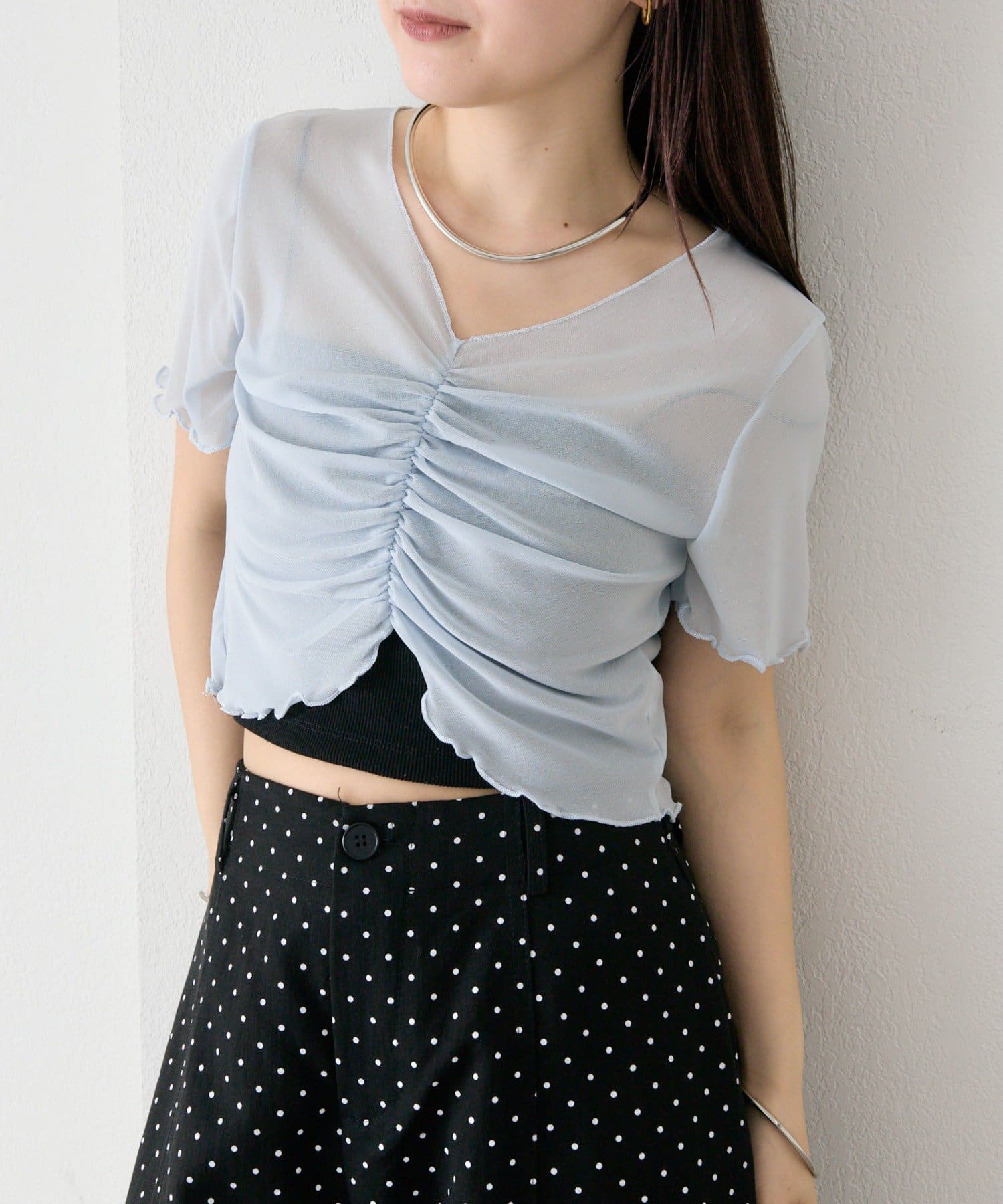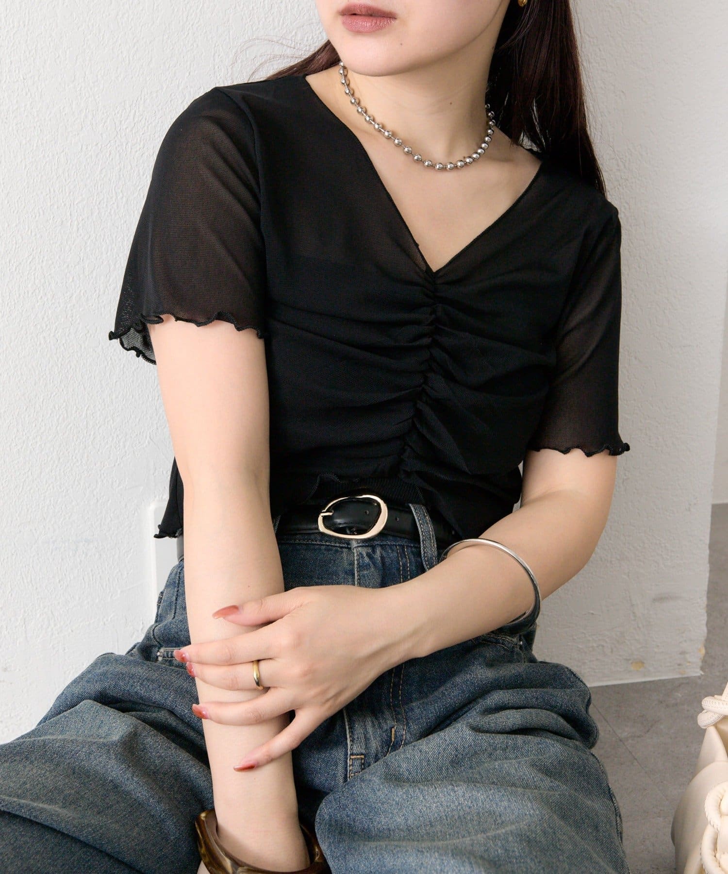 ・柔らかなチュール素材にシャーリングを施した、立体感のあるトップス。