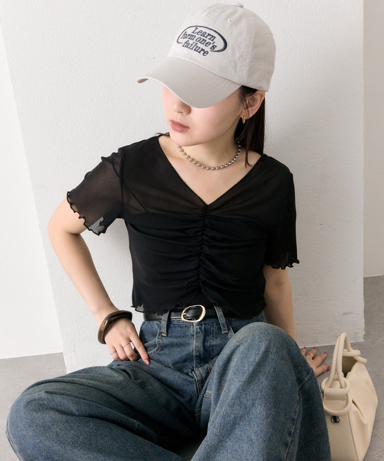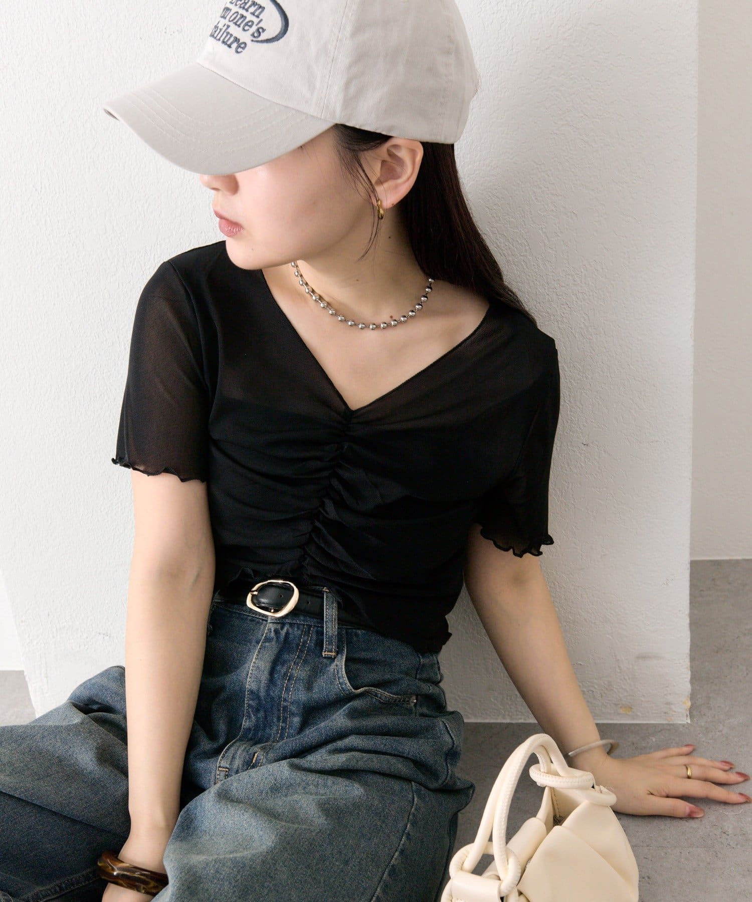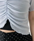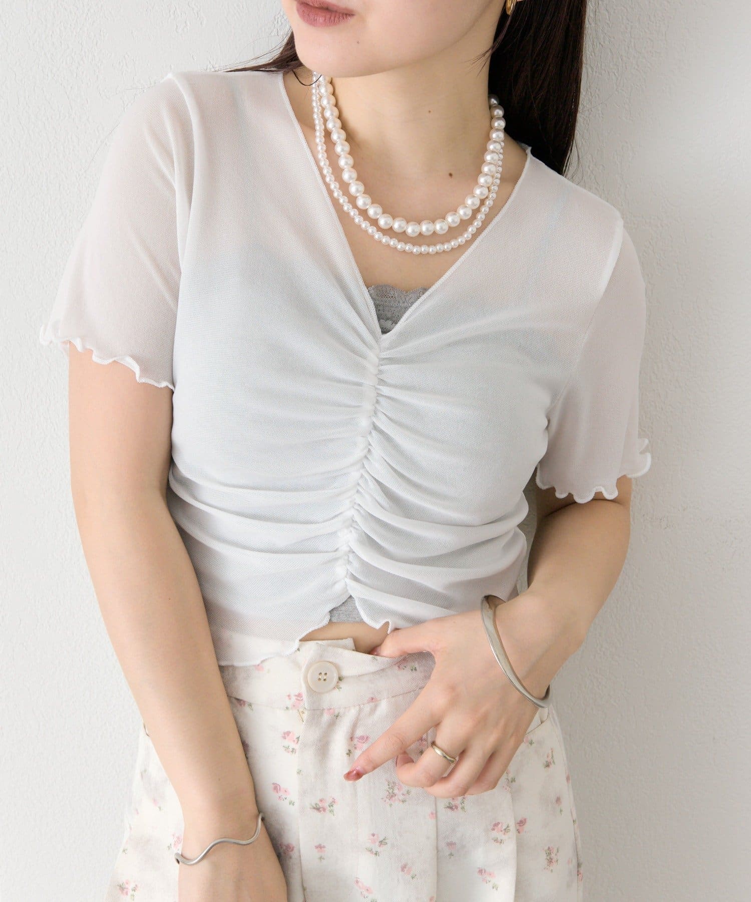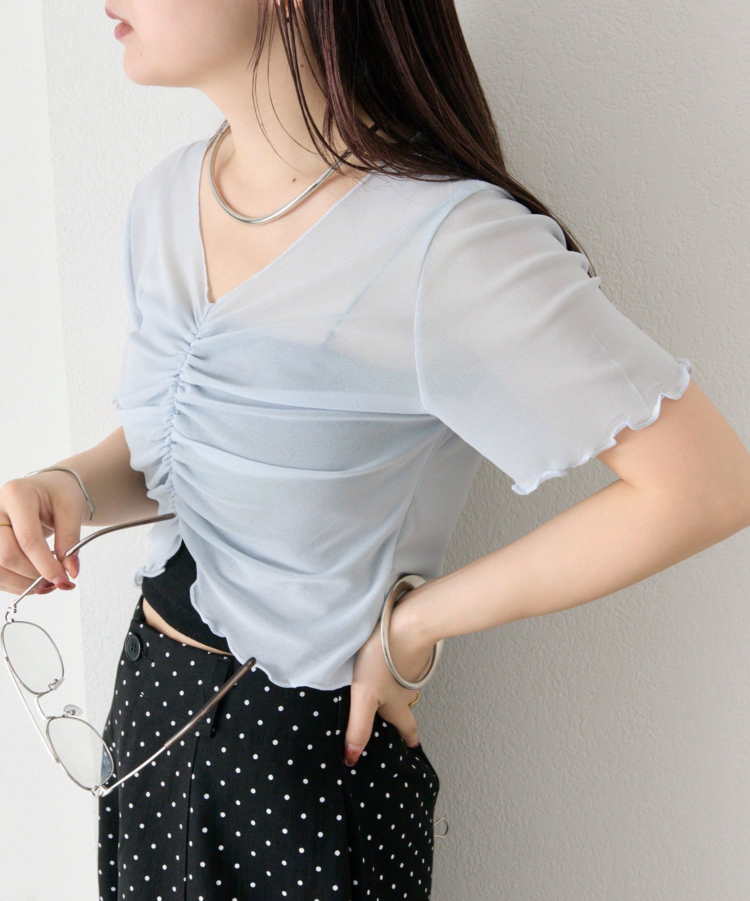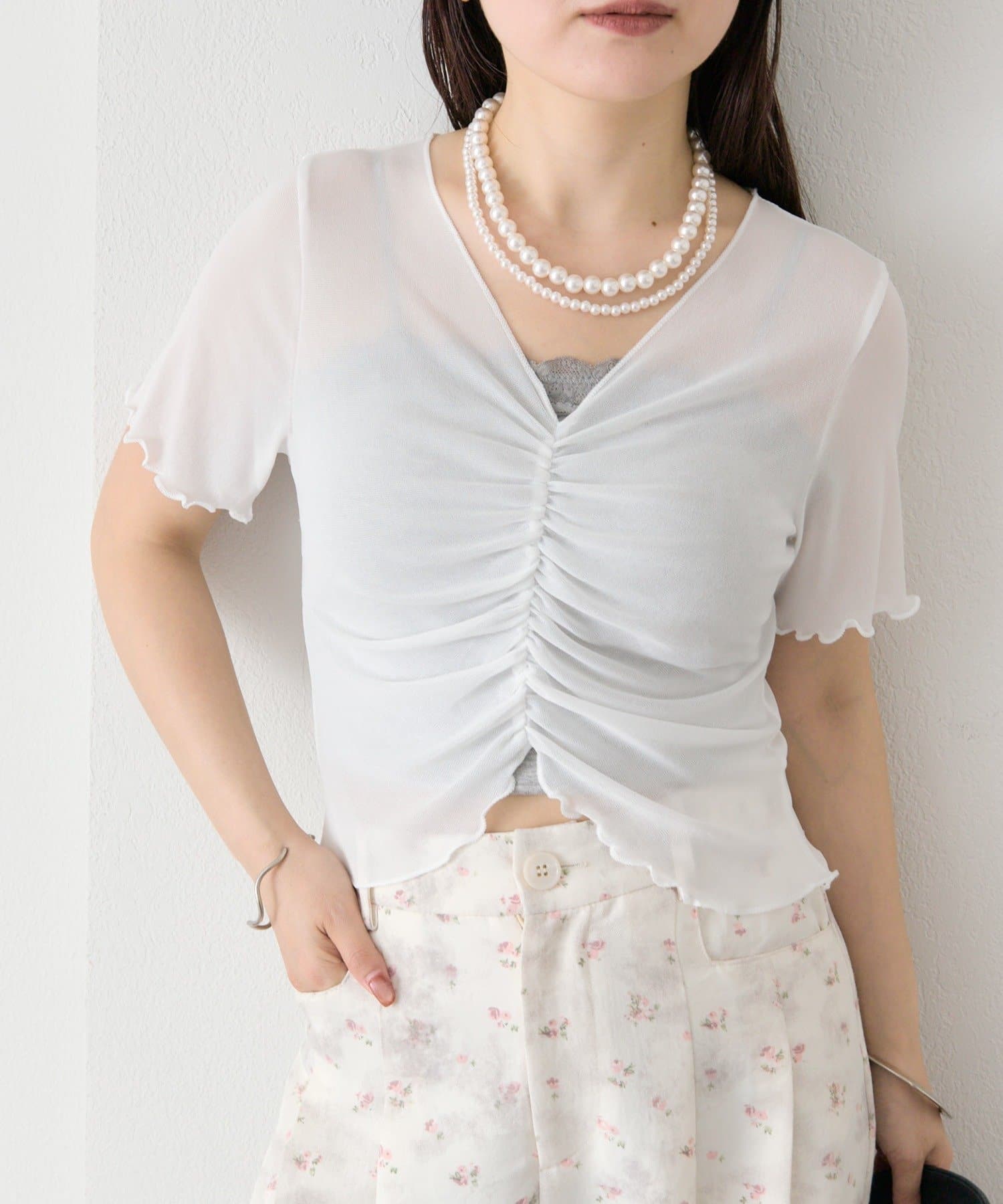 ・柔らかなチュール素材にシャーリングを施した、立体感のあるトップス。