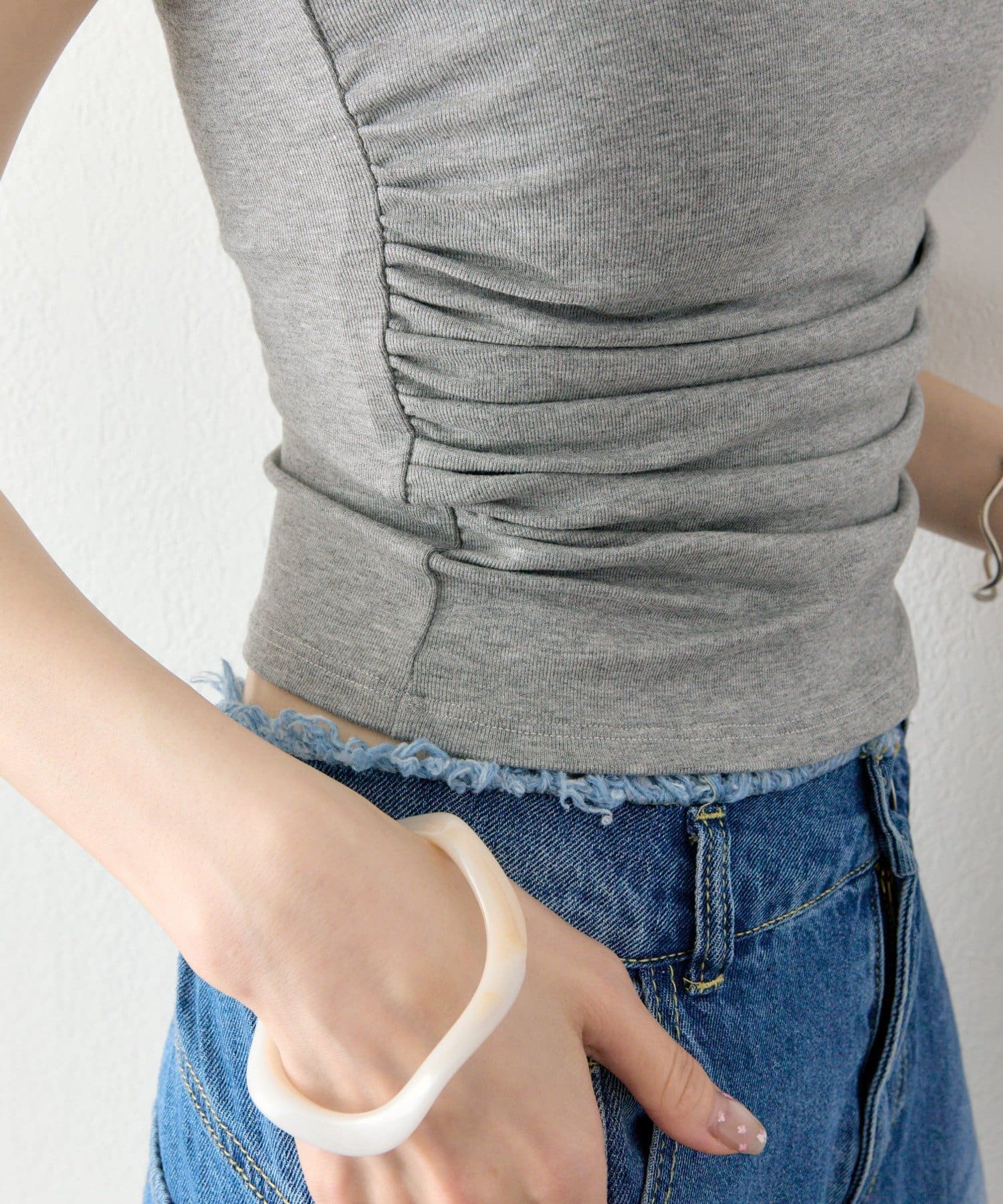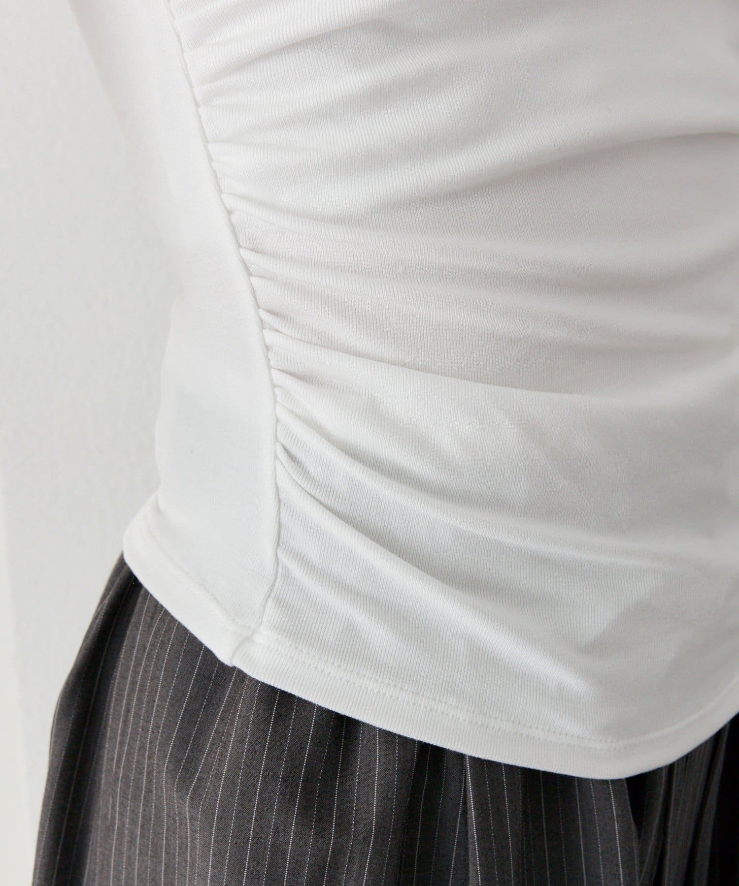 ・サイドのギャザーデザインが立体感を生み、自然にスタイルアップを叶えてくれます。