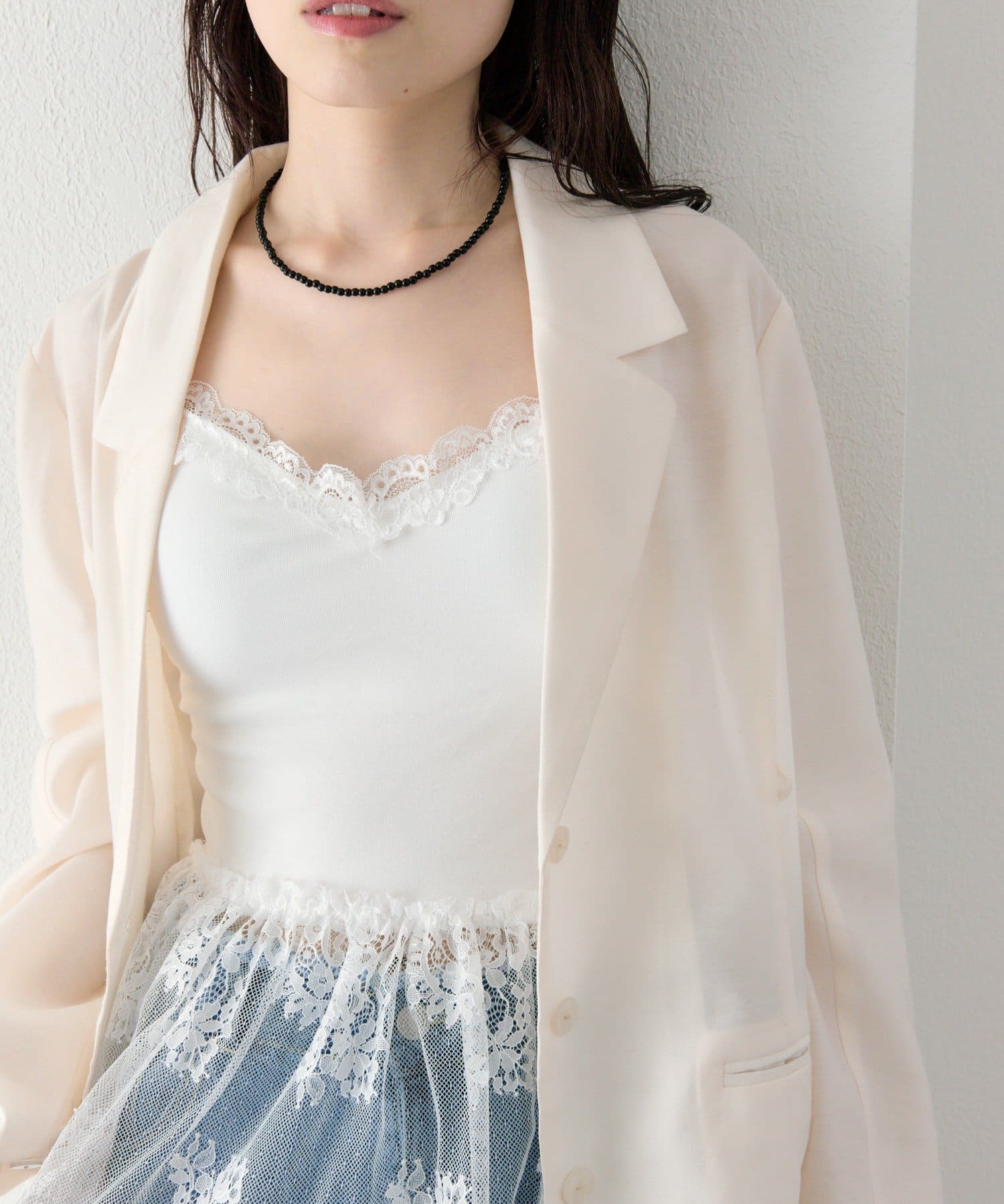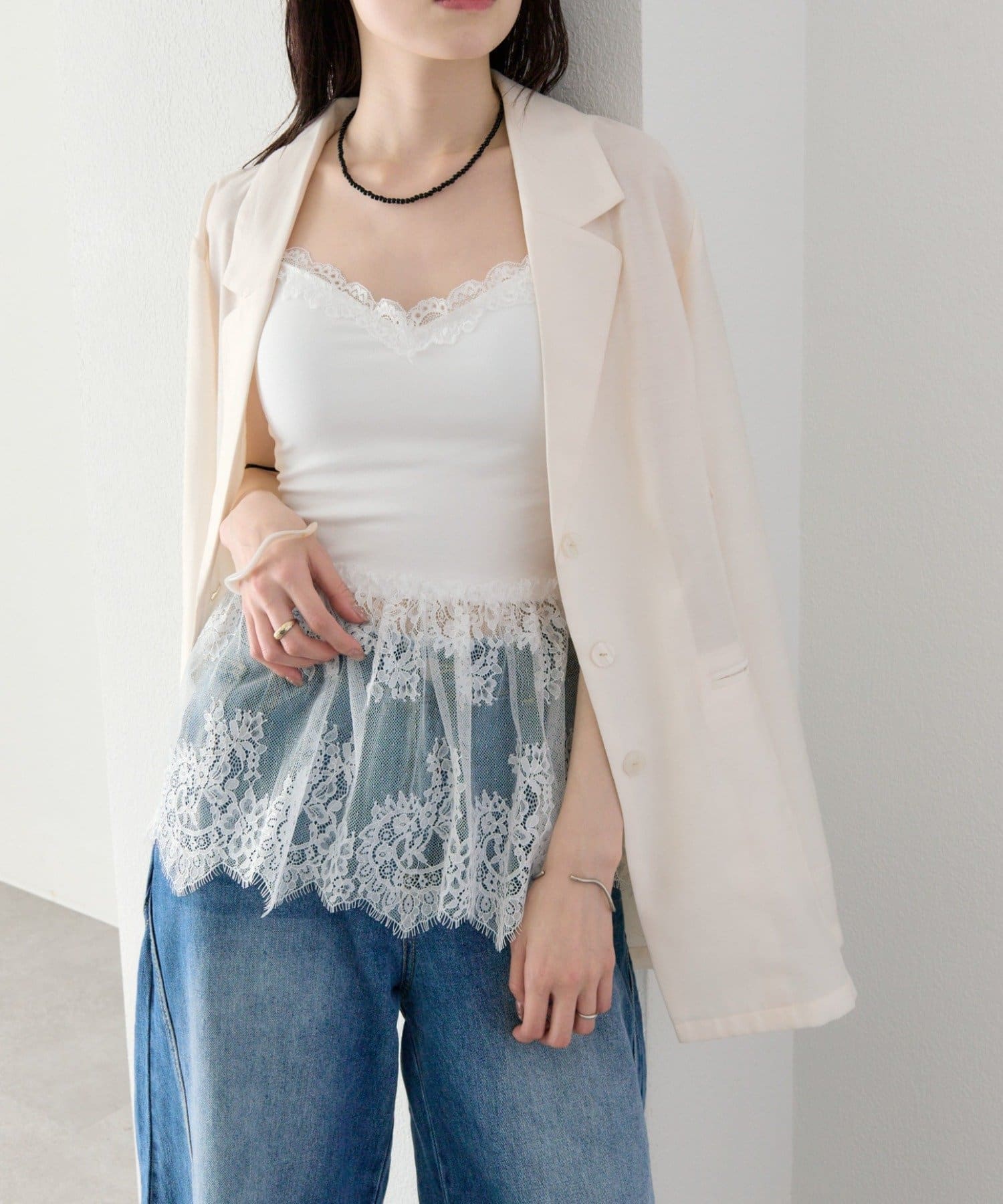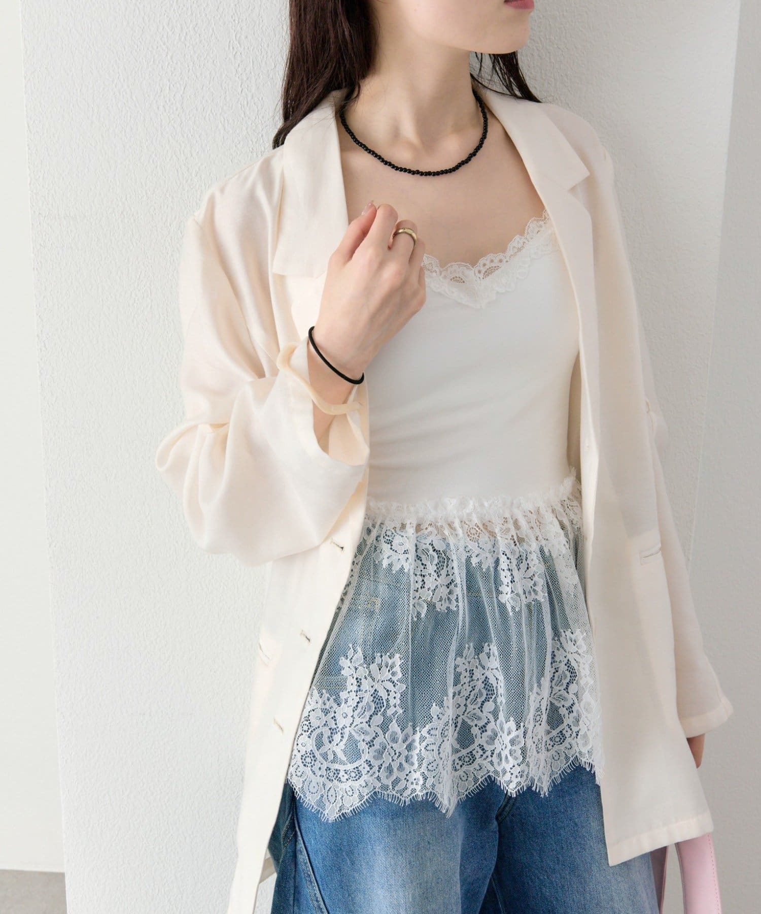 ・繊細なレースが女性らしさを引き立てつつ、甘くなりすぎないバランスに。
