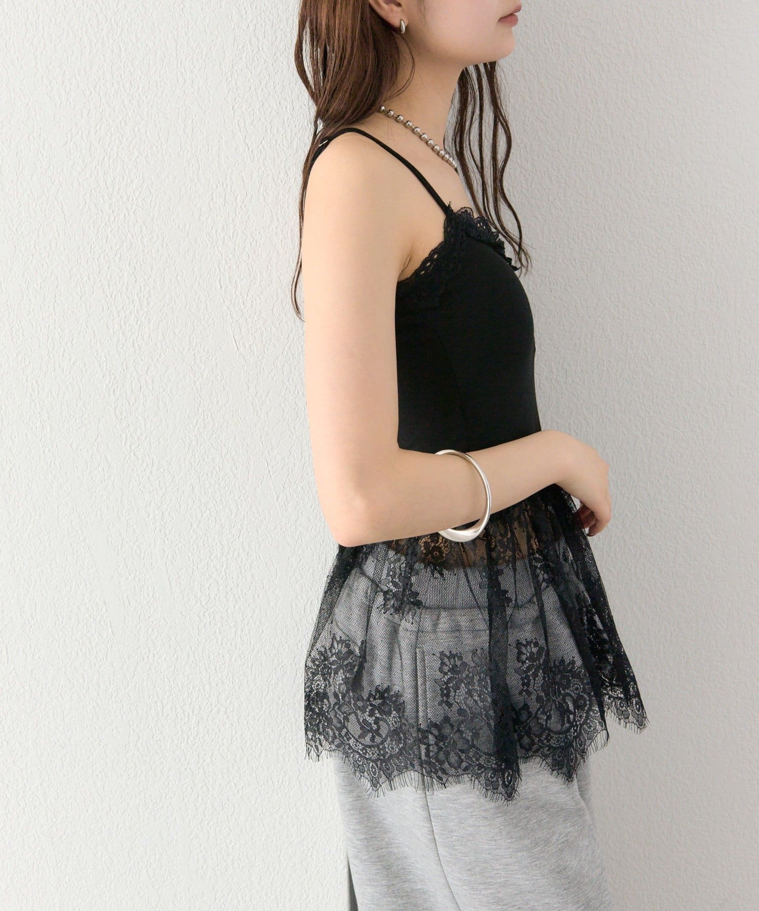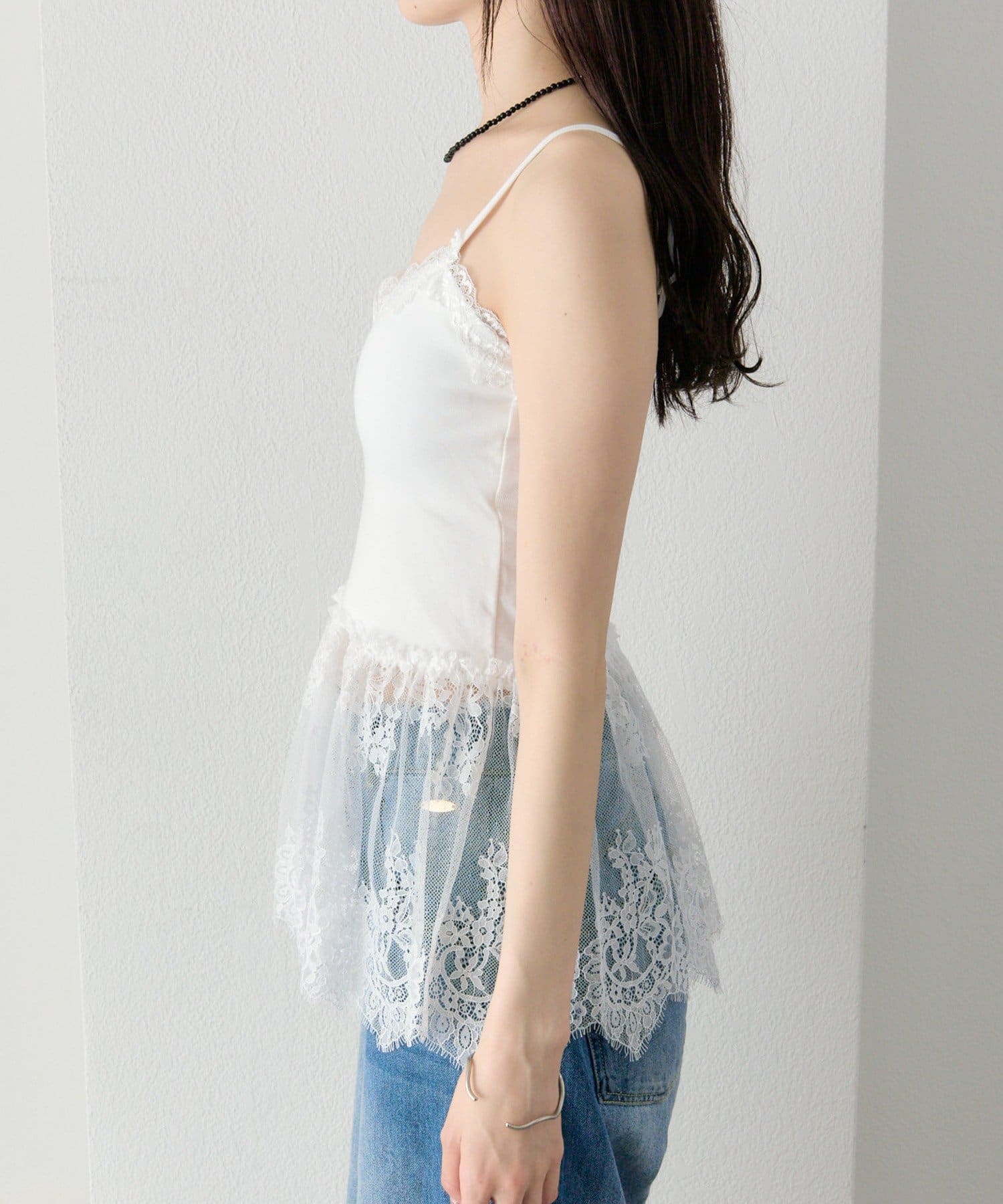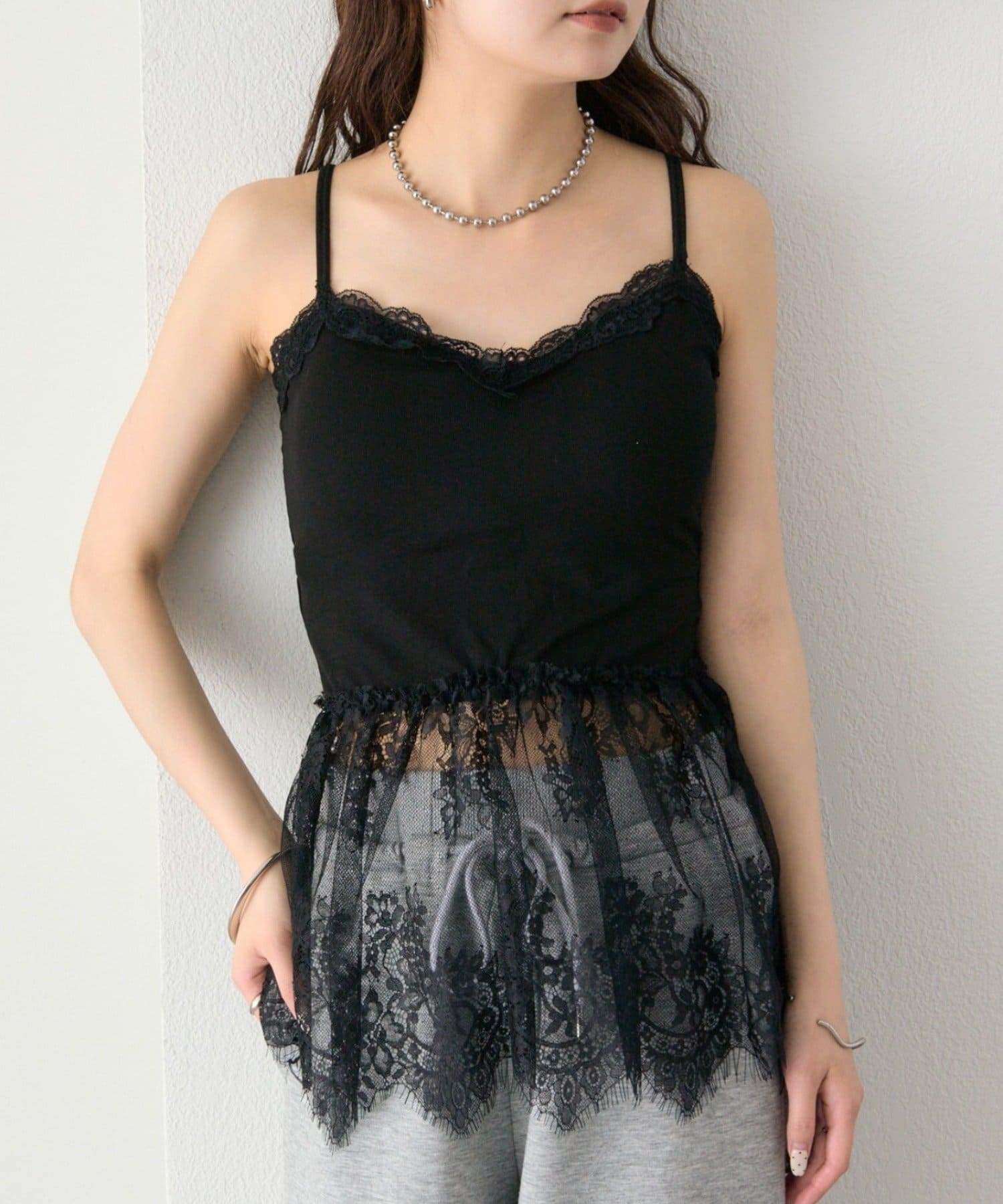 異素材ミックスで女性らしさを引き立てるレースドッキングキャミソール