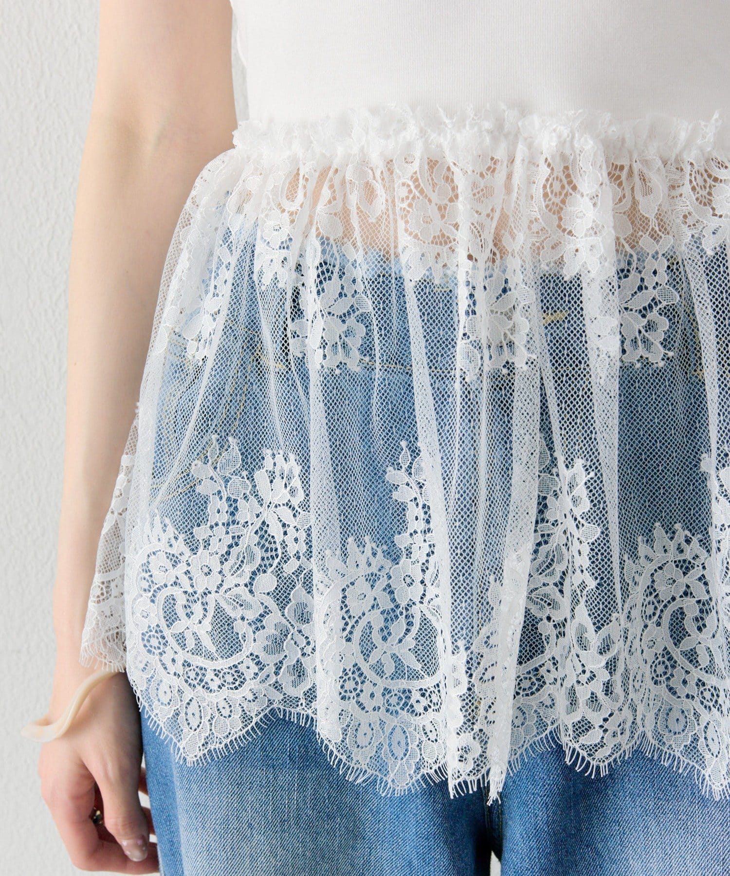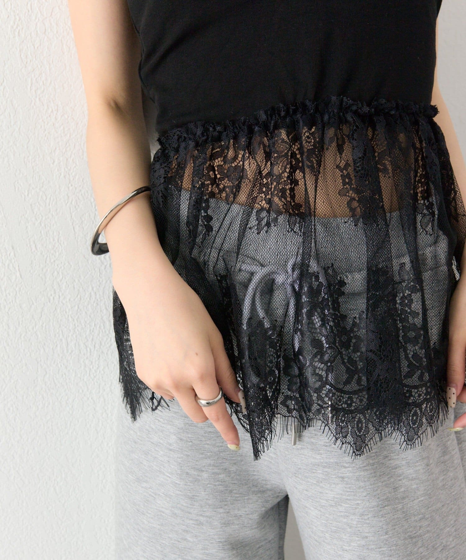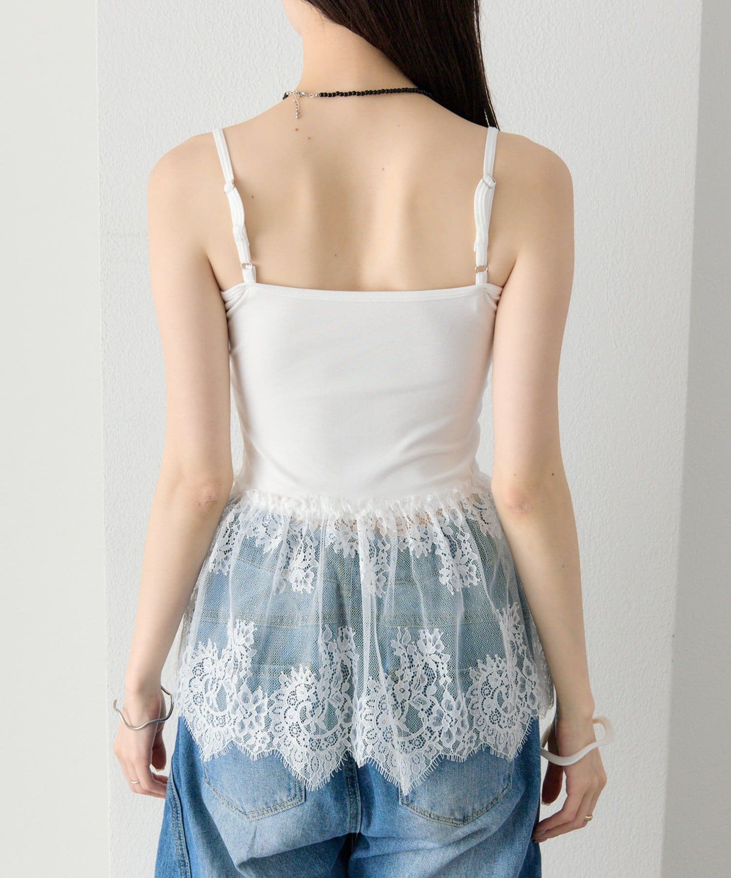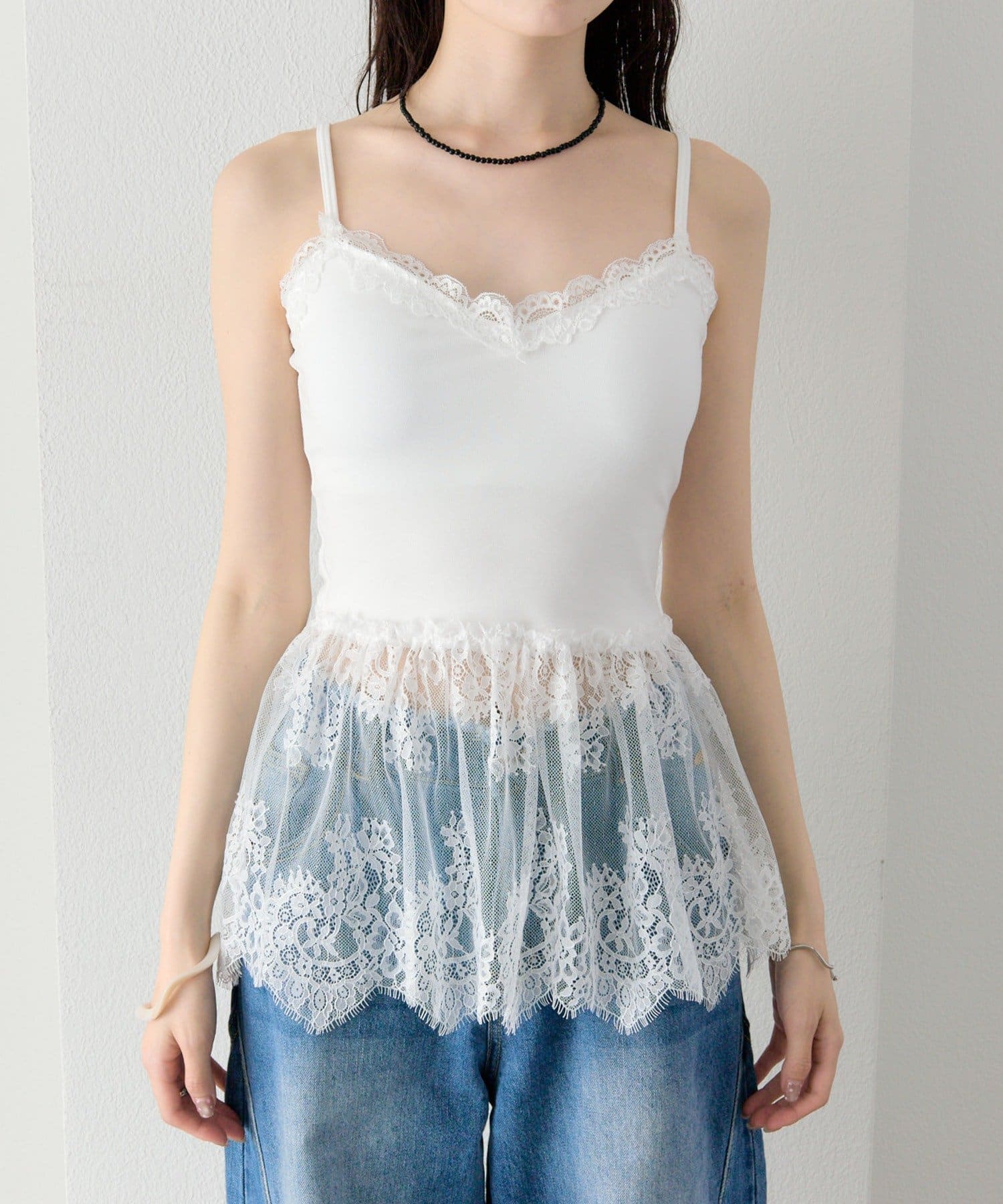 異素材ミックスで女性らしさを引き立てるレースドッキングキャミソール