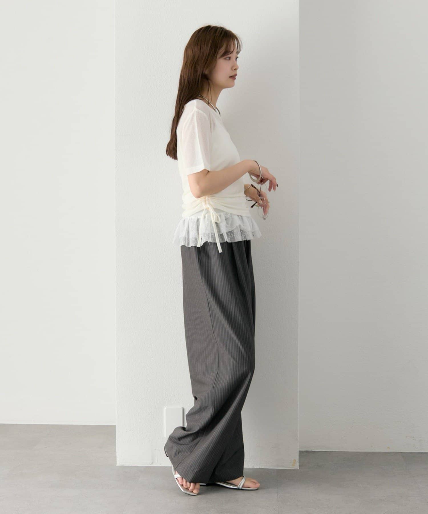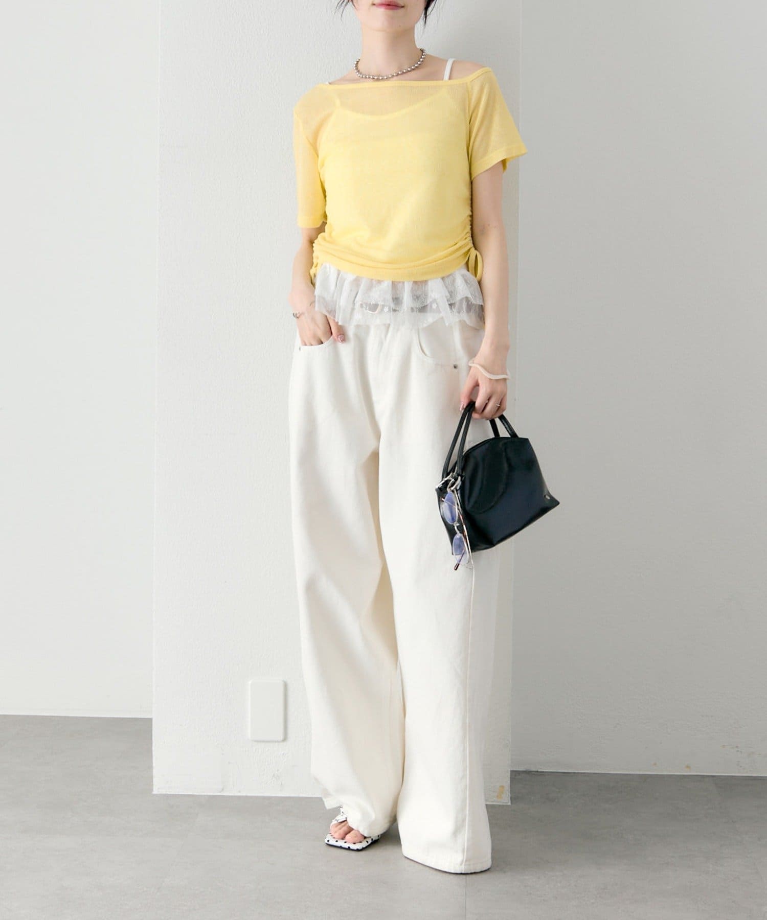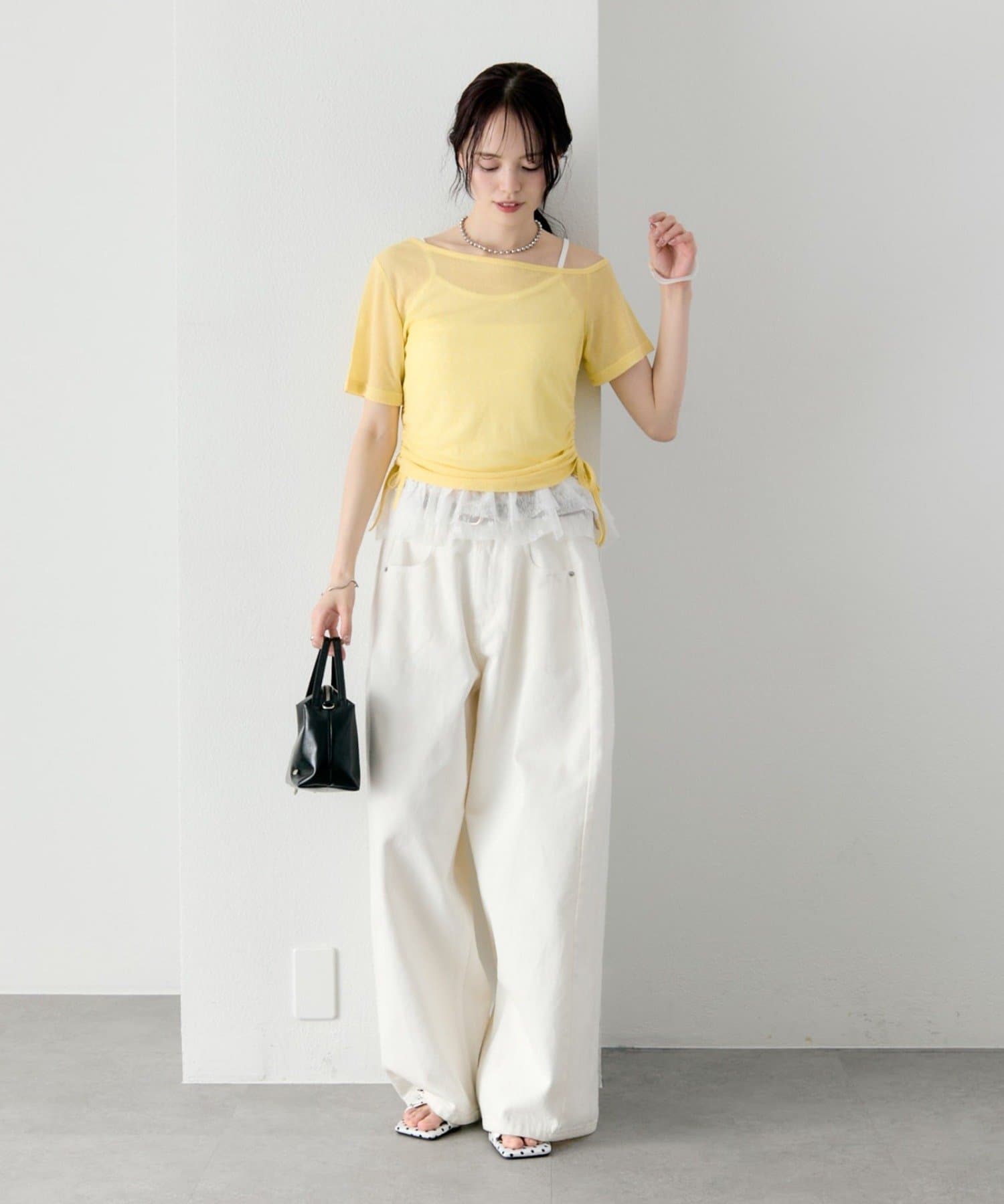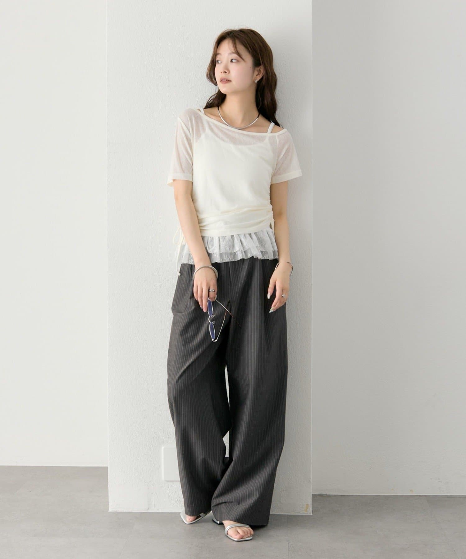 トップスはシアー感のある素材で、軽やかな抜け感をプラス。