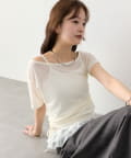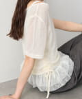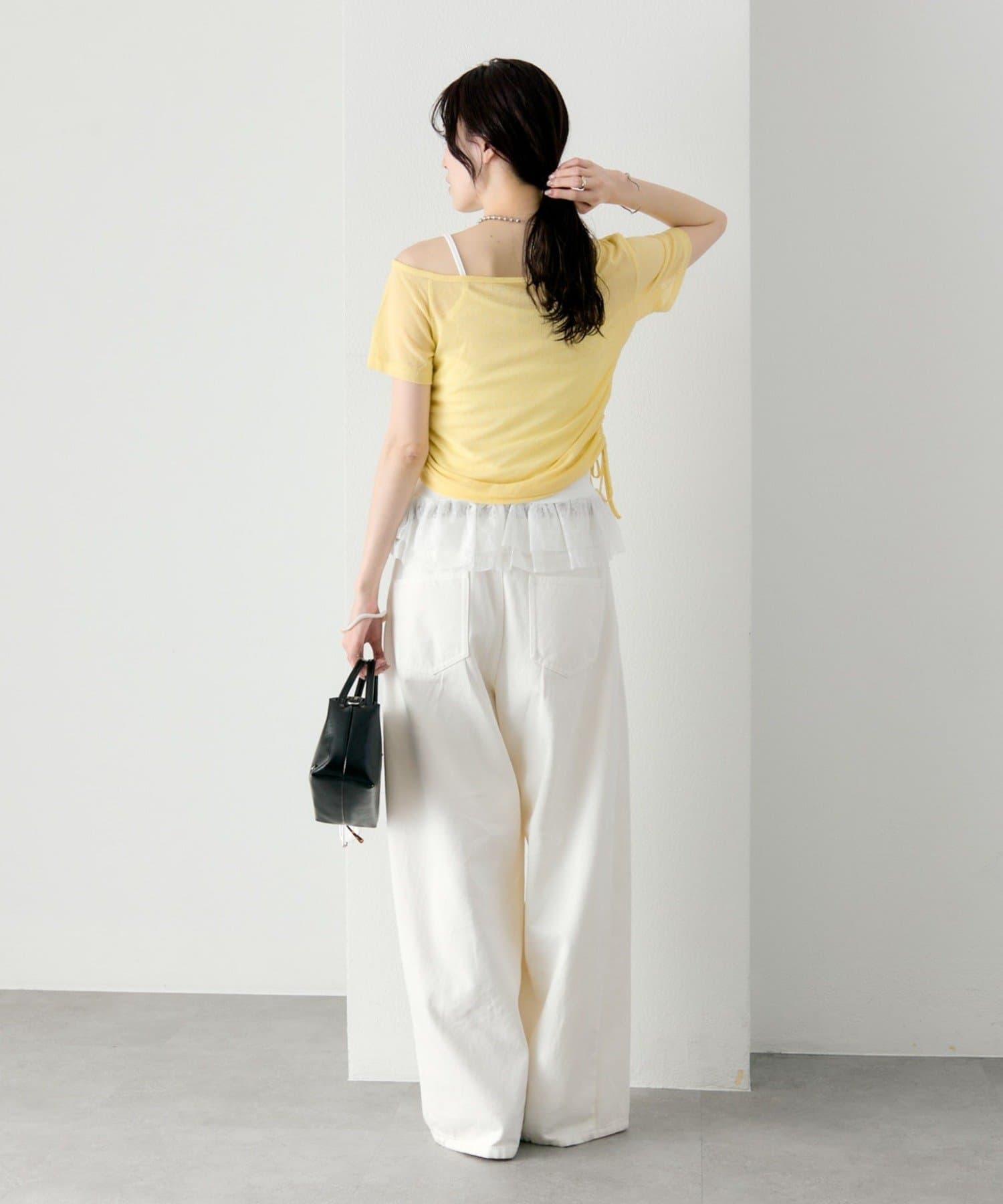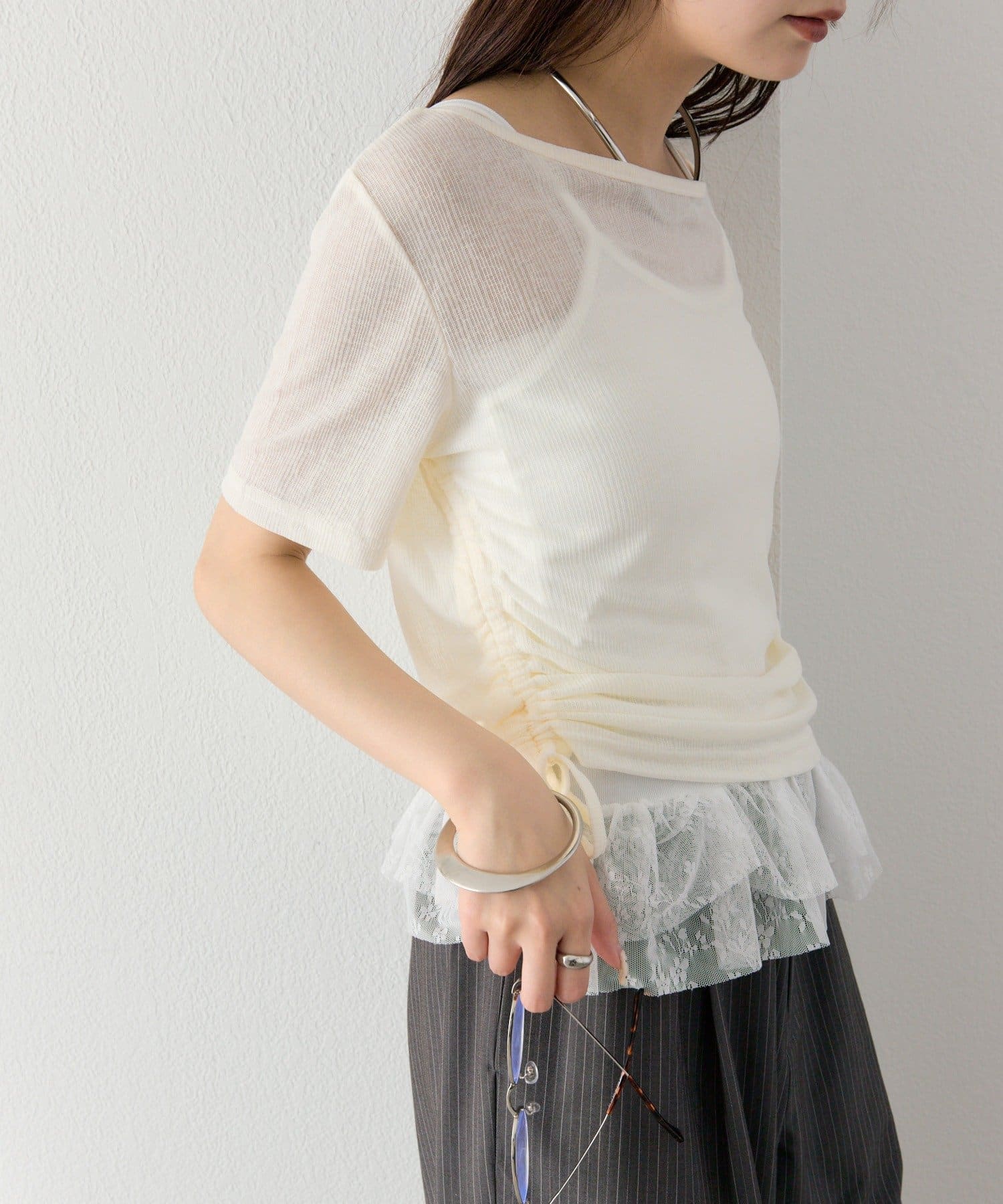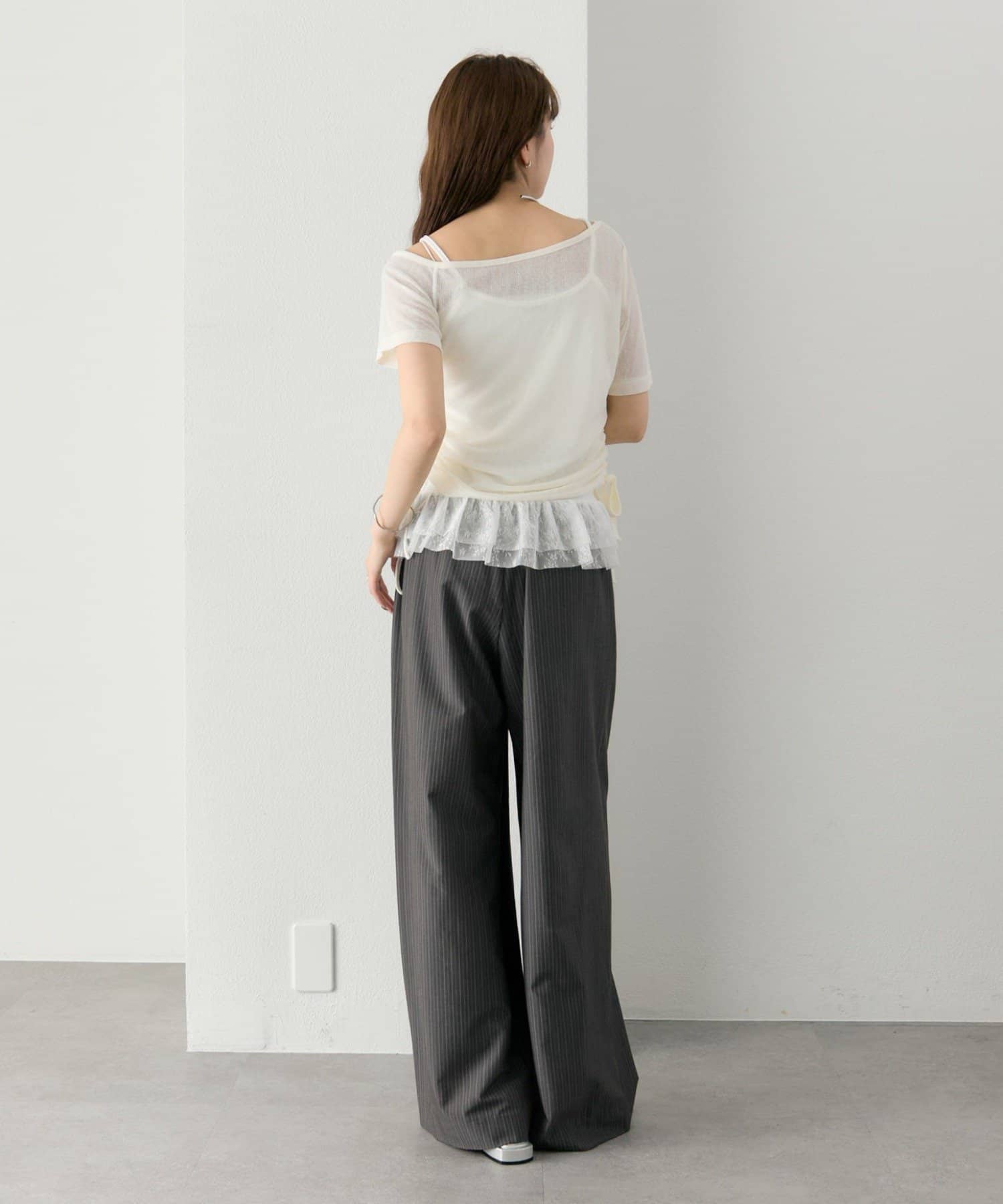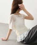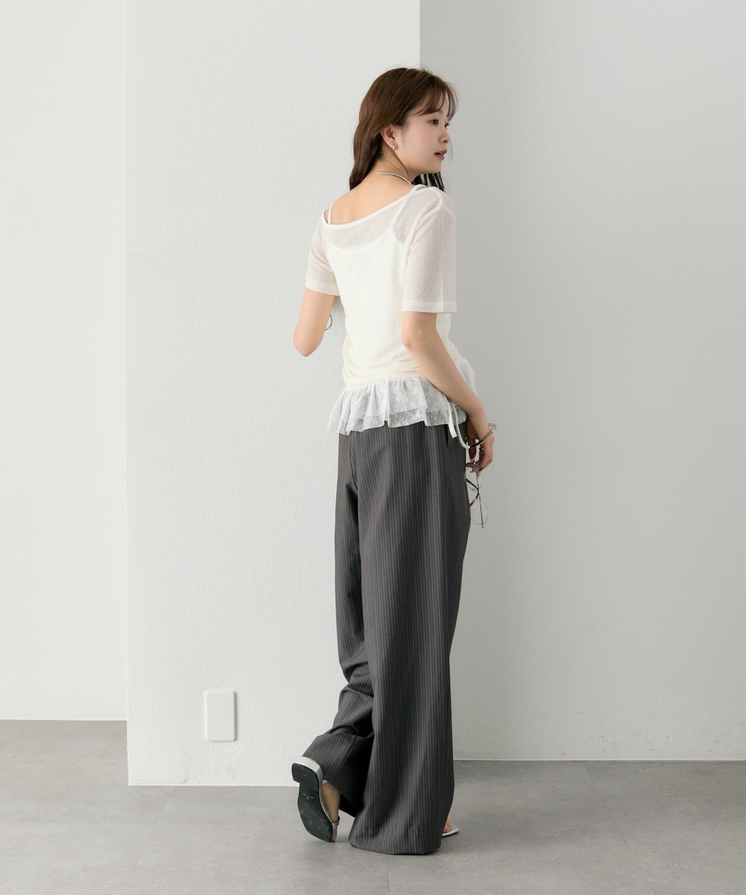トップスはシアー感のある素材で、軽やかな抜け感をプラス。