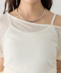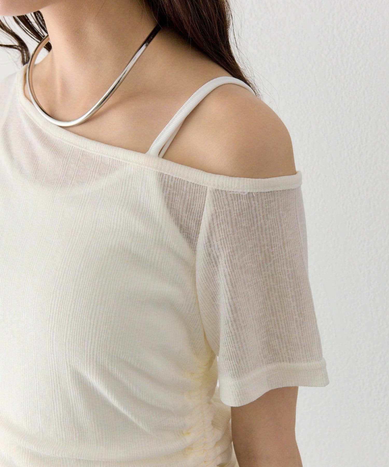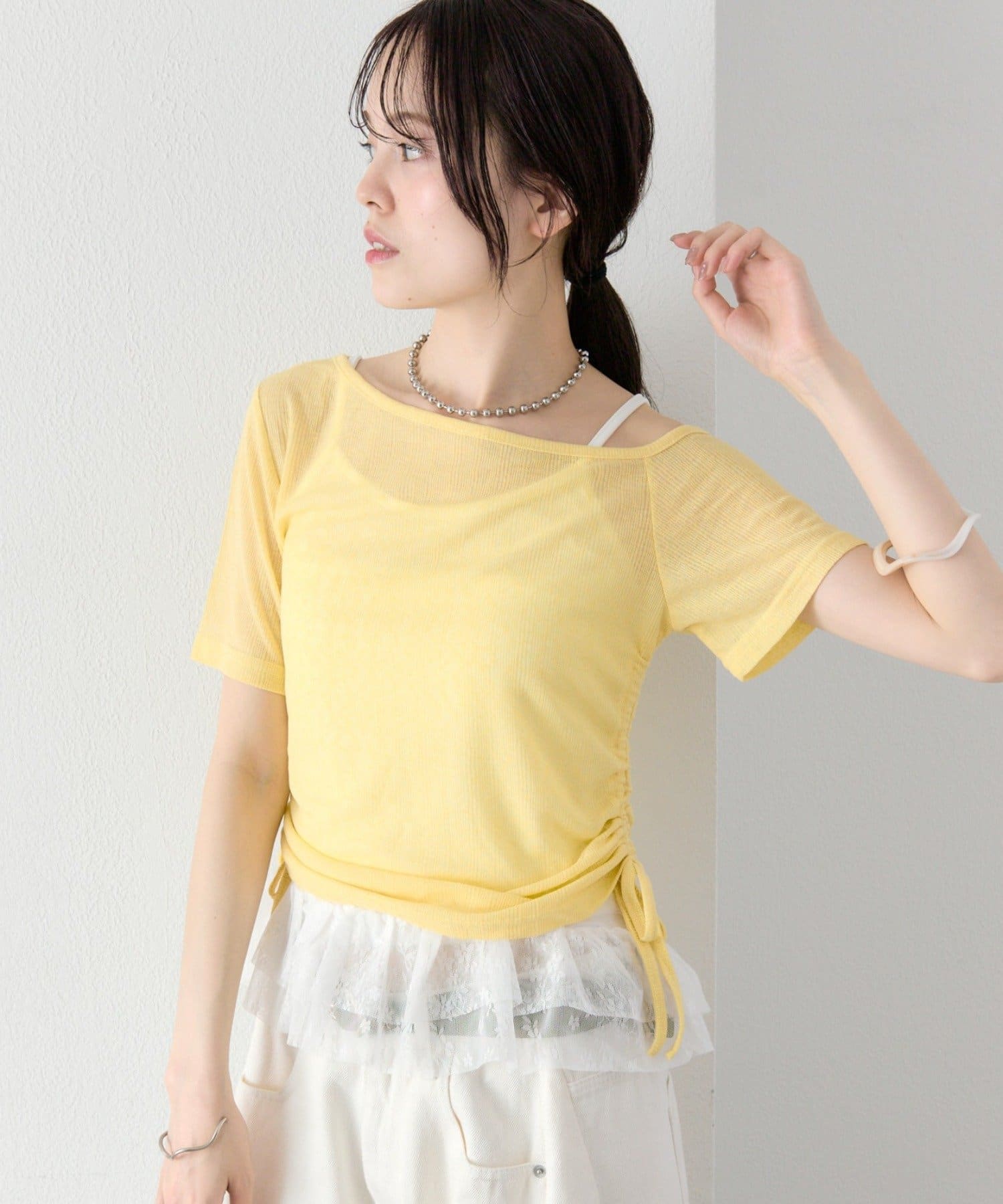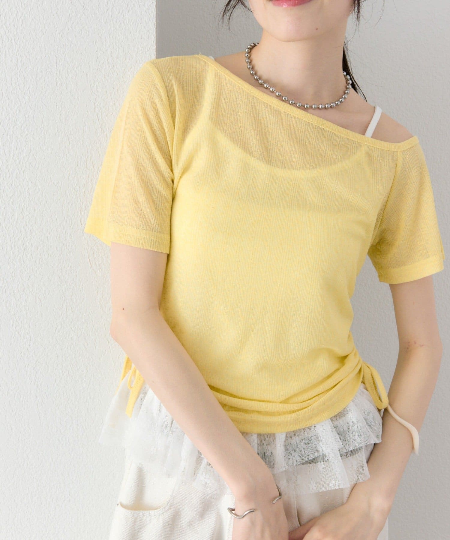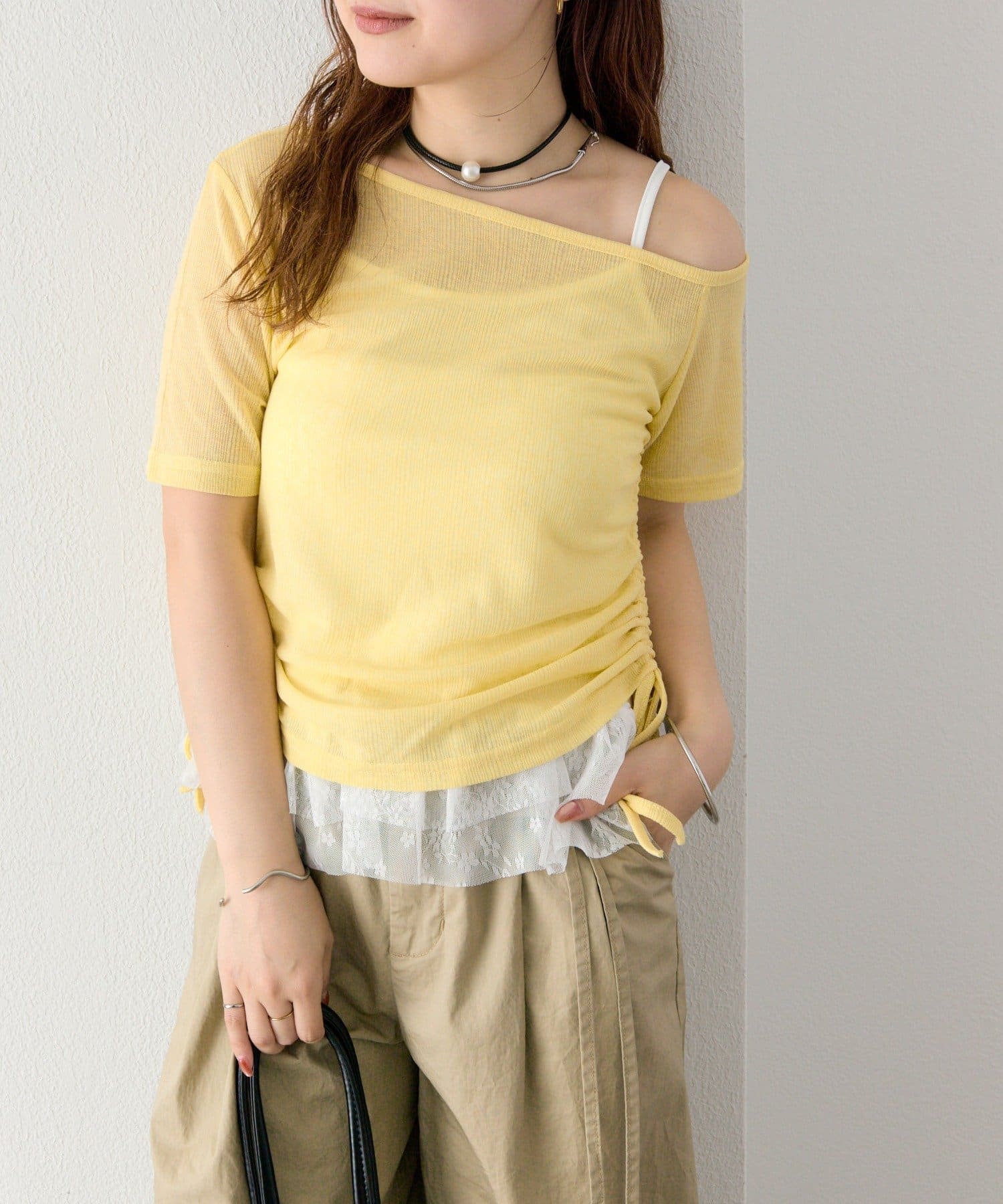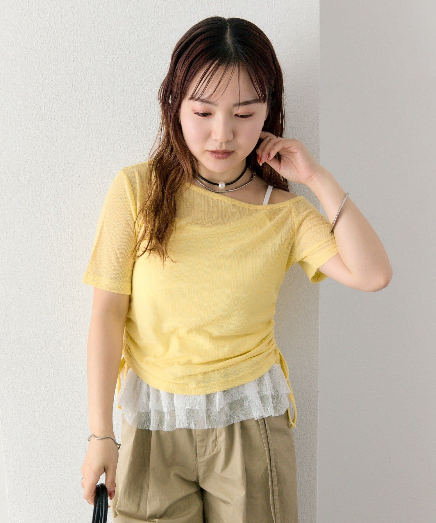 キャミソールは、Tシャツやブラウス、カーディガンにレイヤードして、トレンド感のあるスタイリングを楽しむのも◎