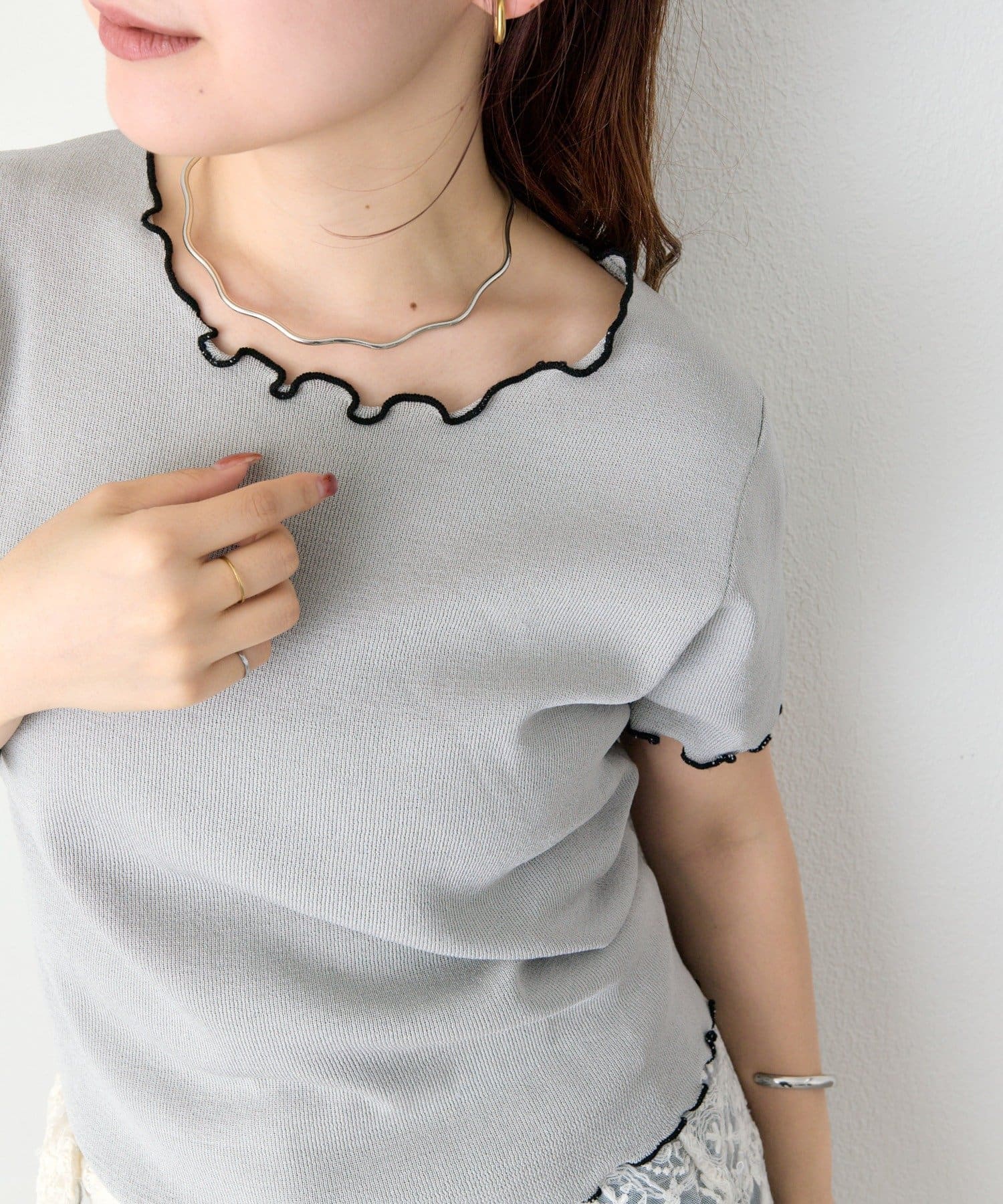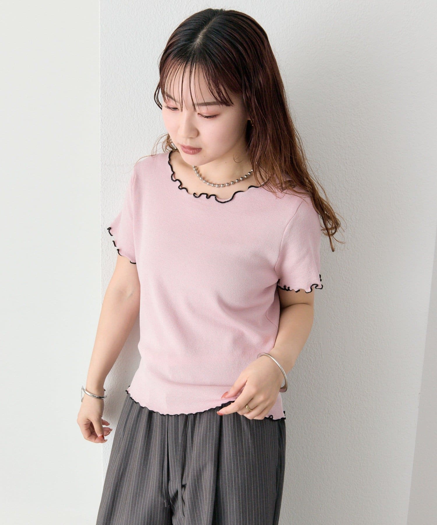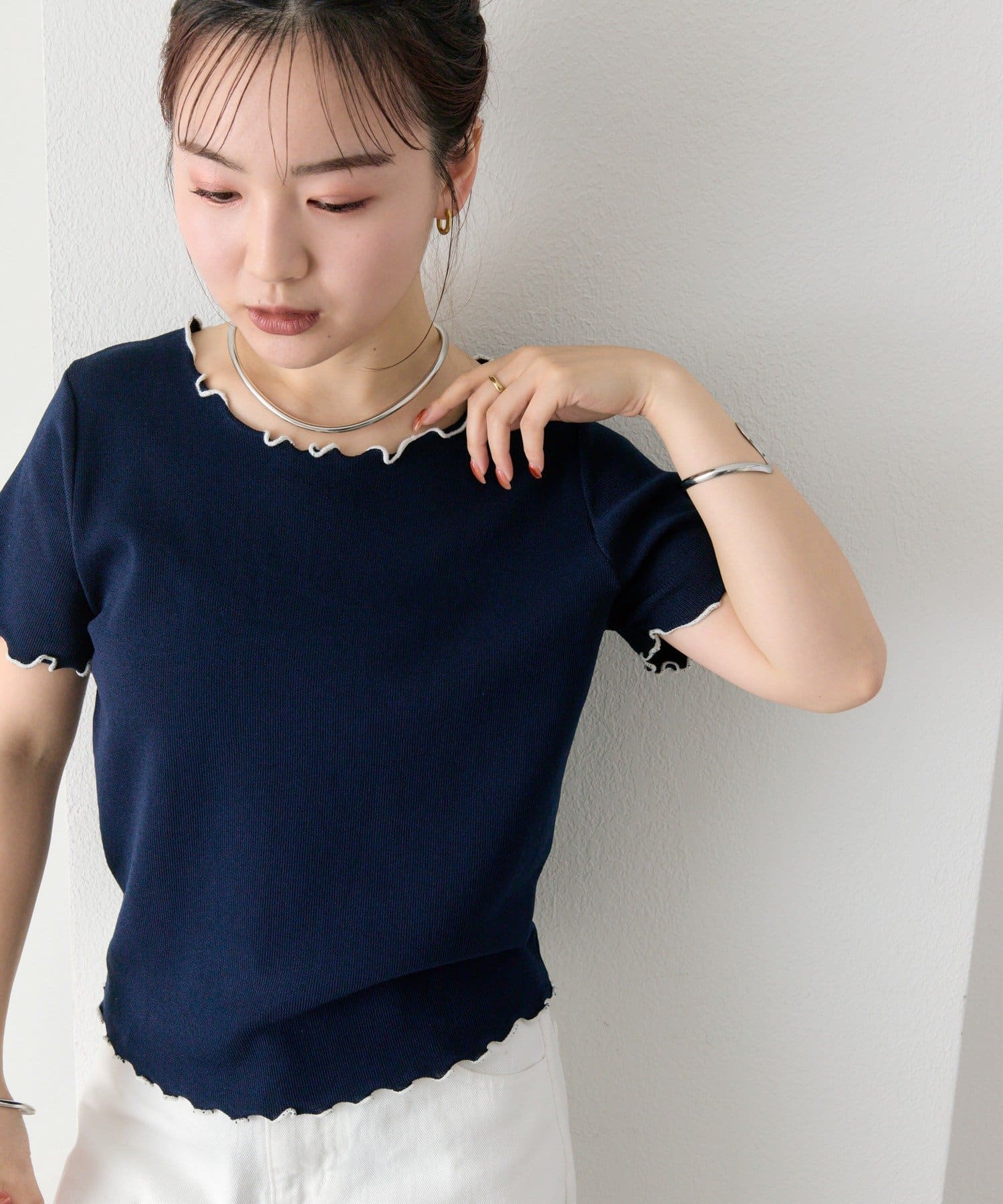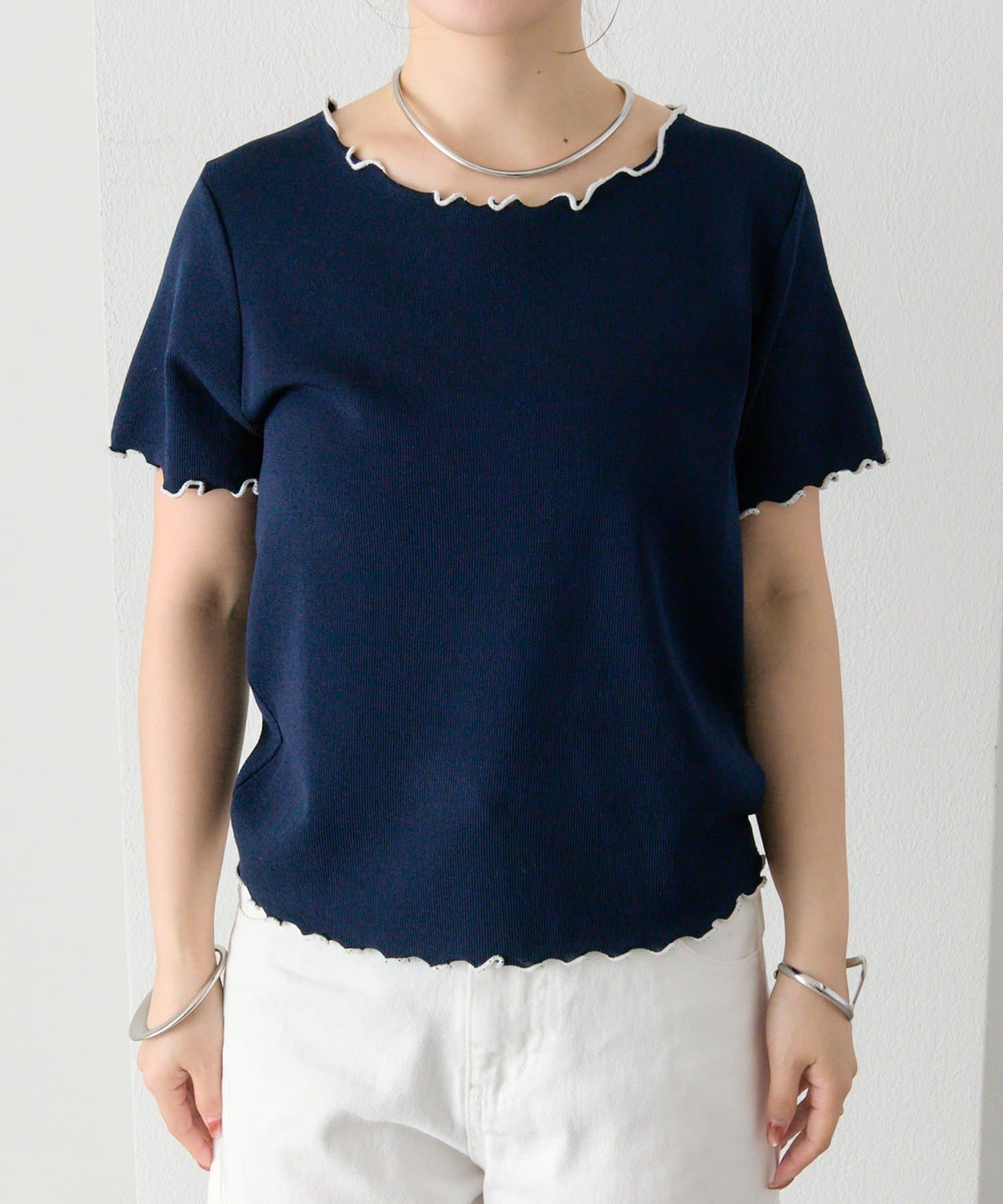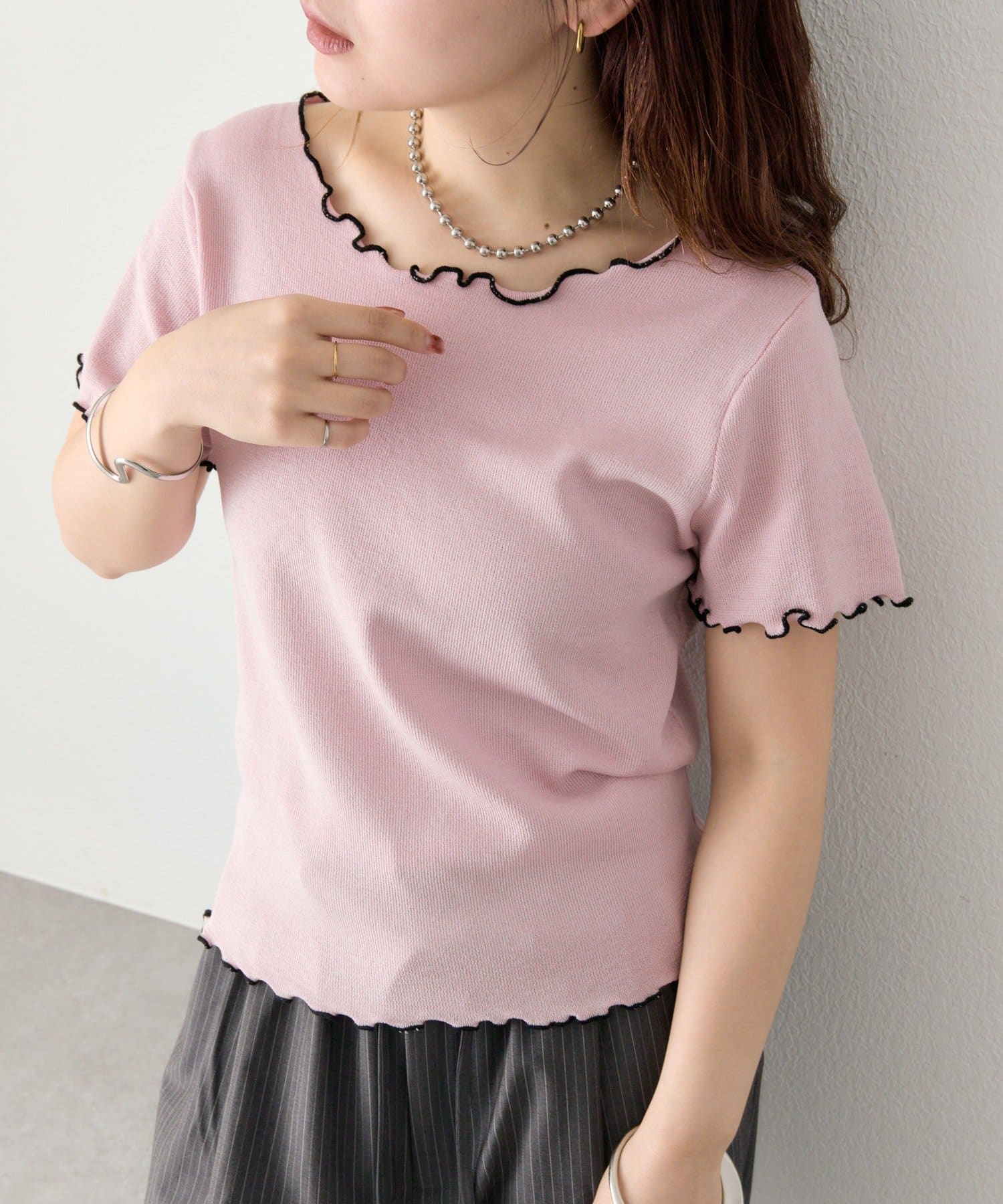 ・配色のメロウフリルがアクセントになったニットTシャツ。