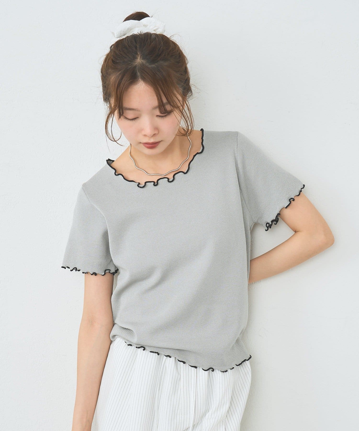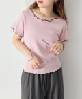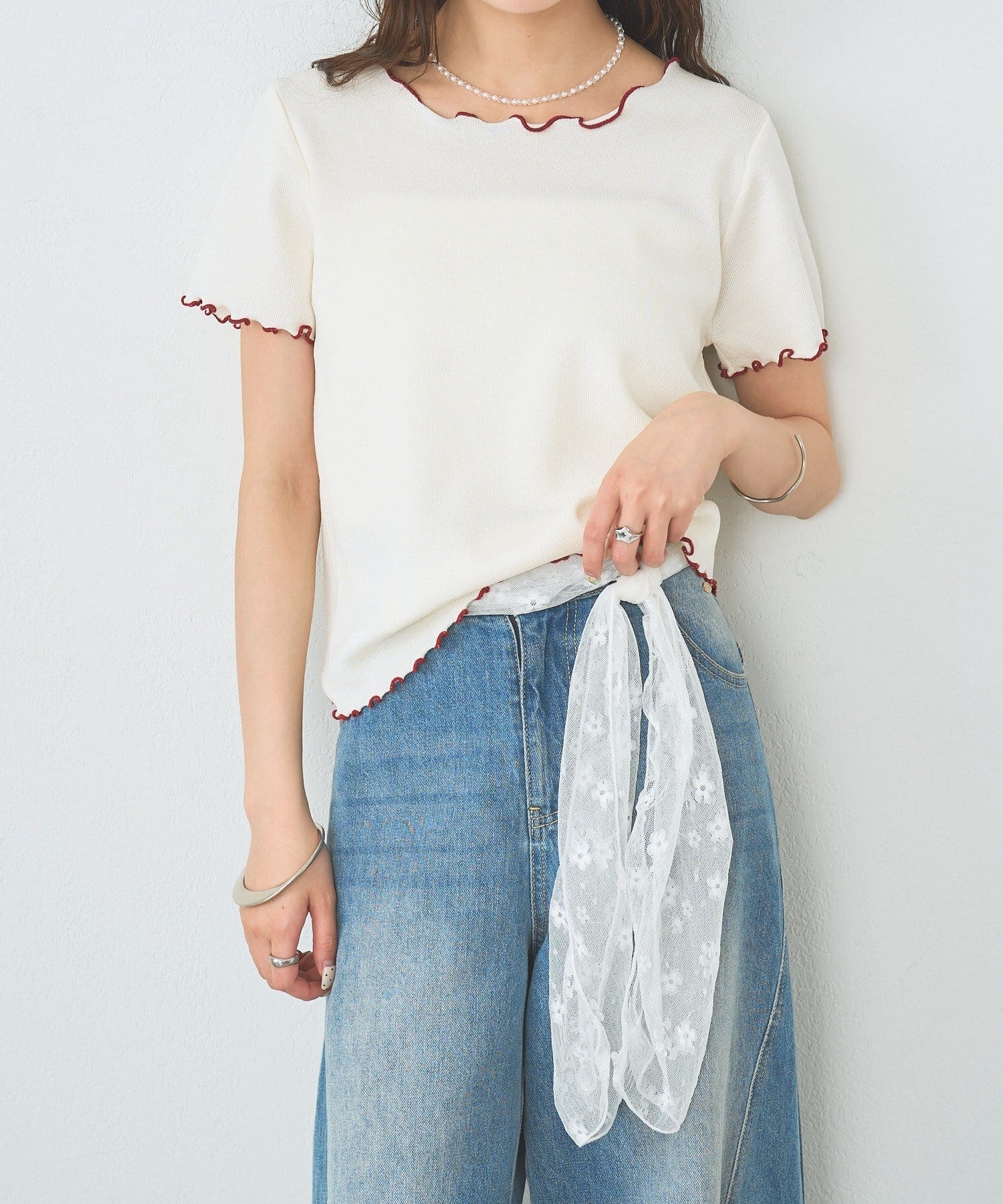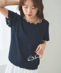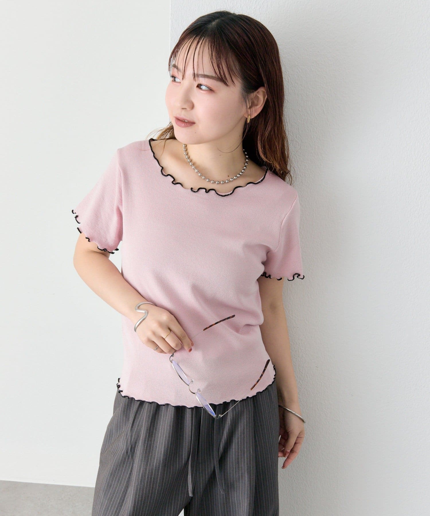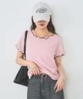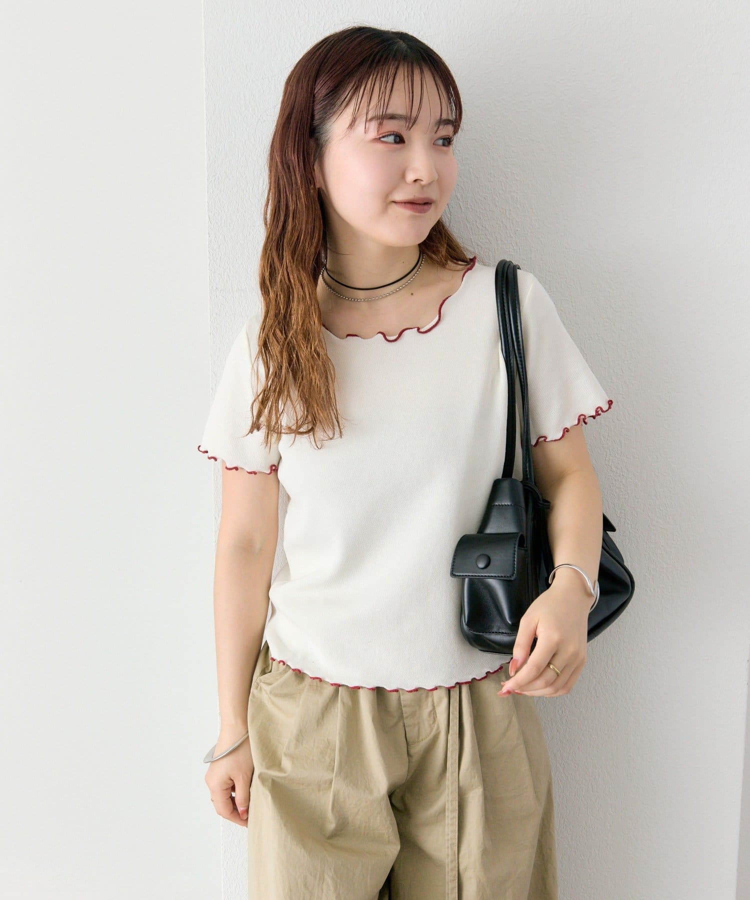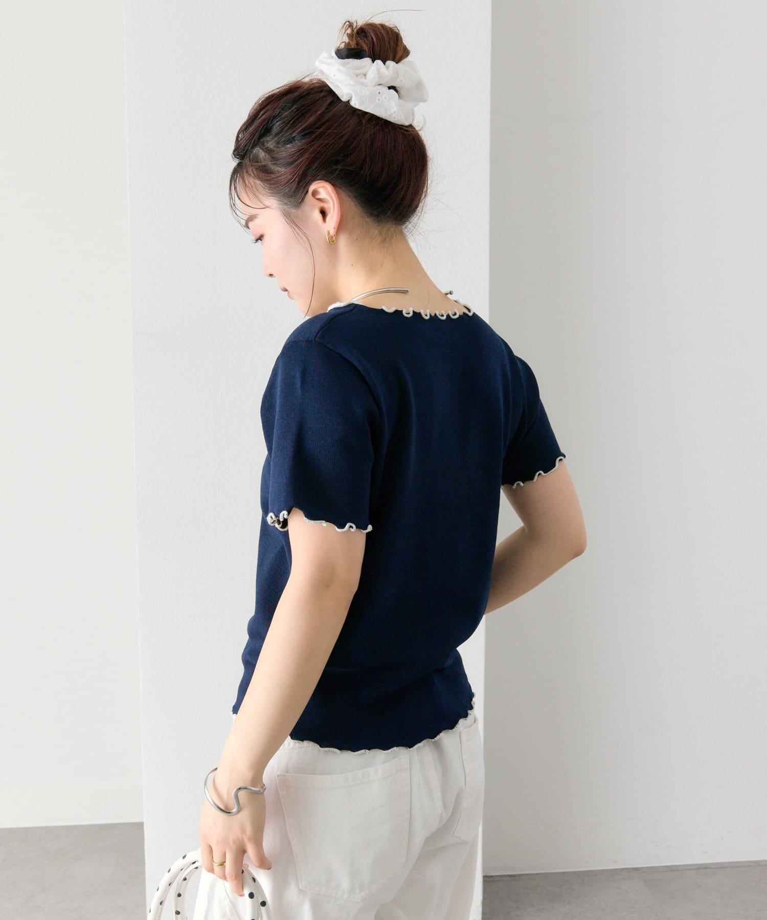 ・配色のメロウフリルがアクセントになったニットTシャツ。