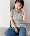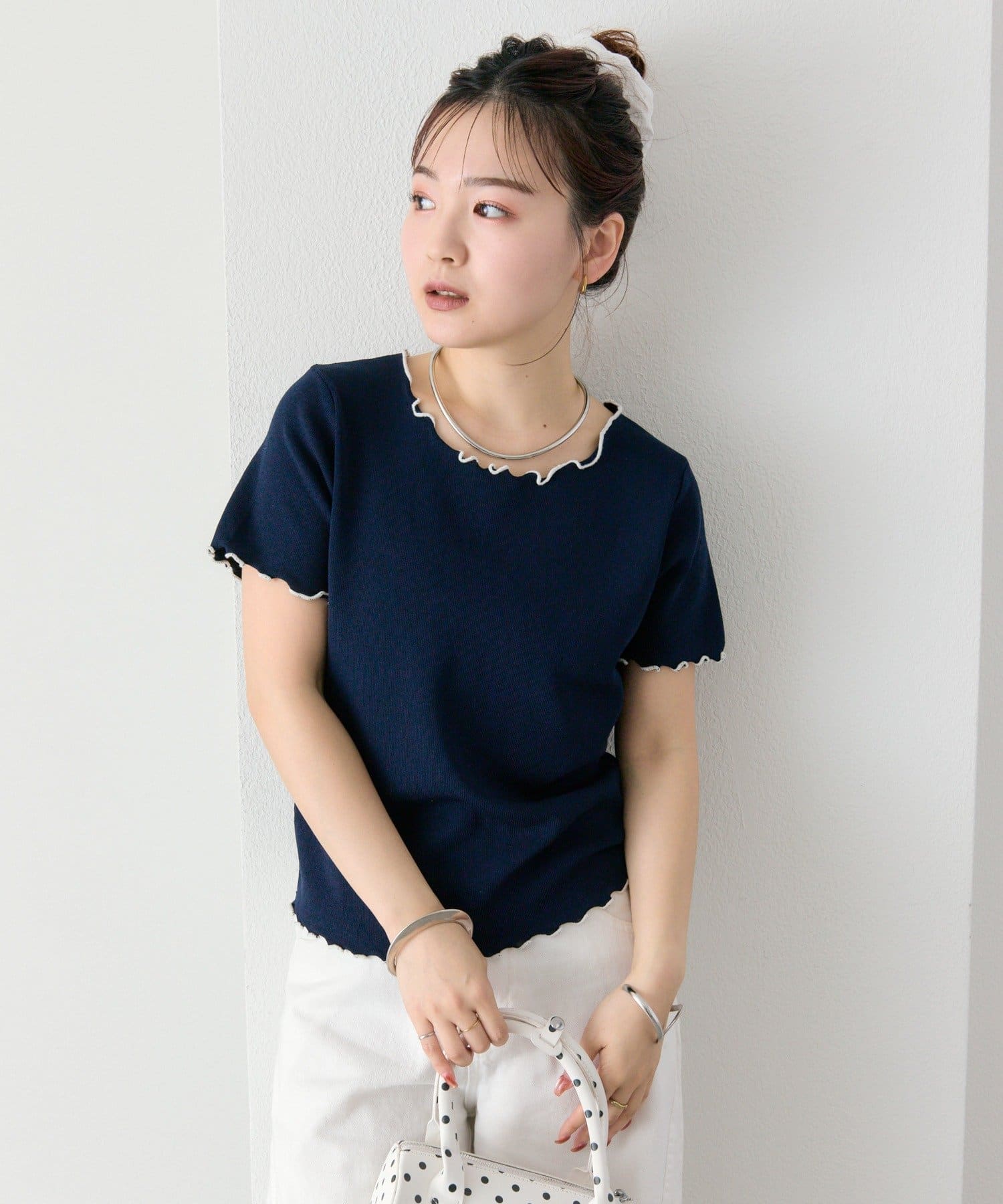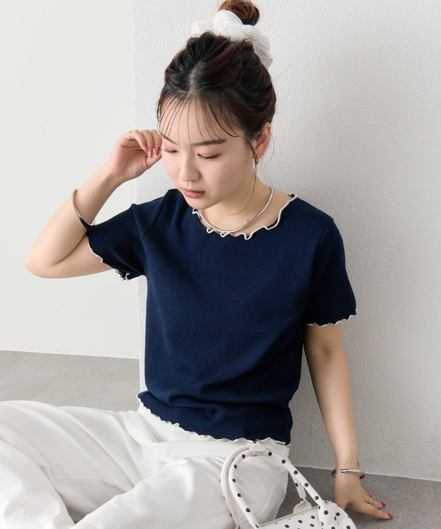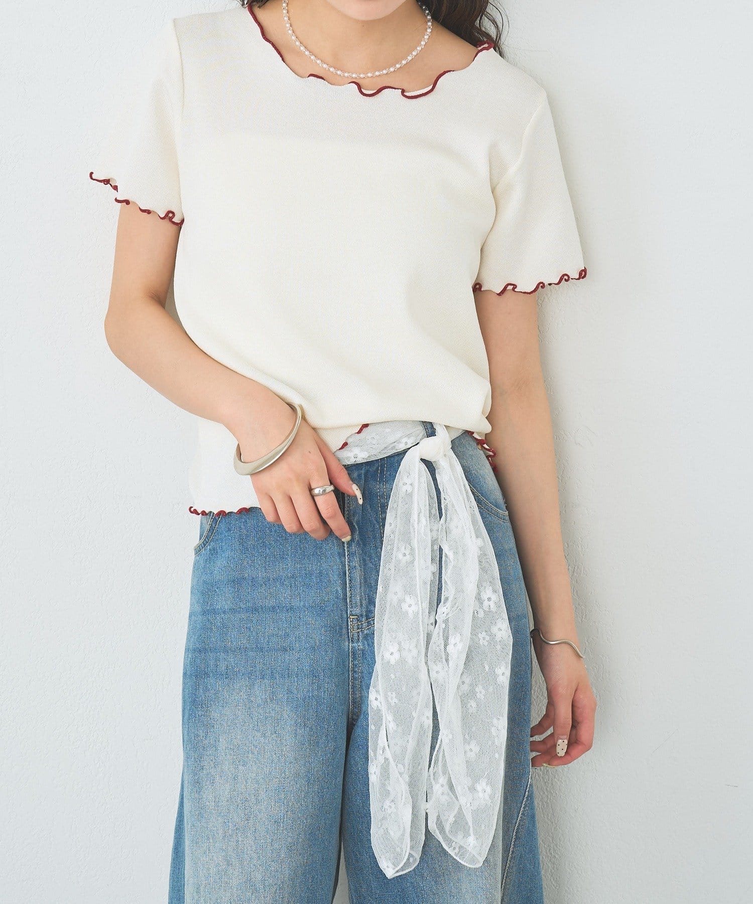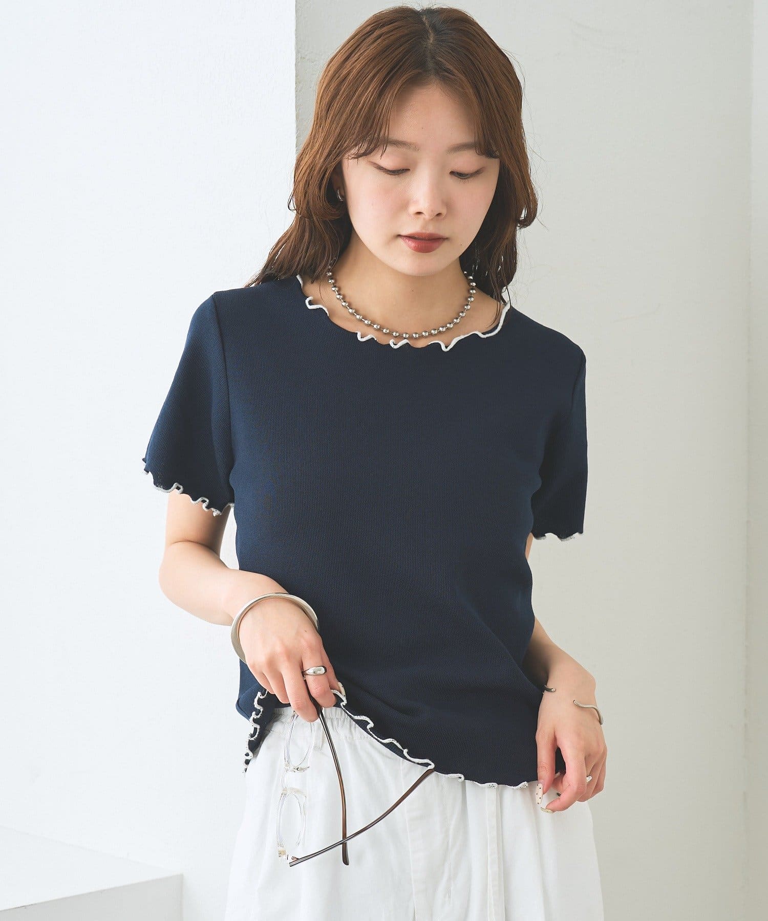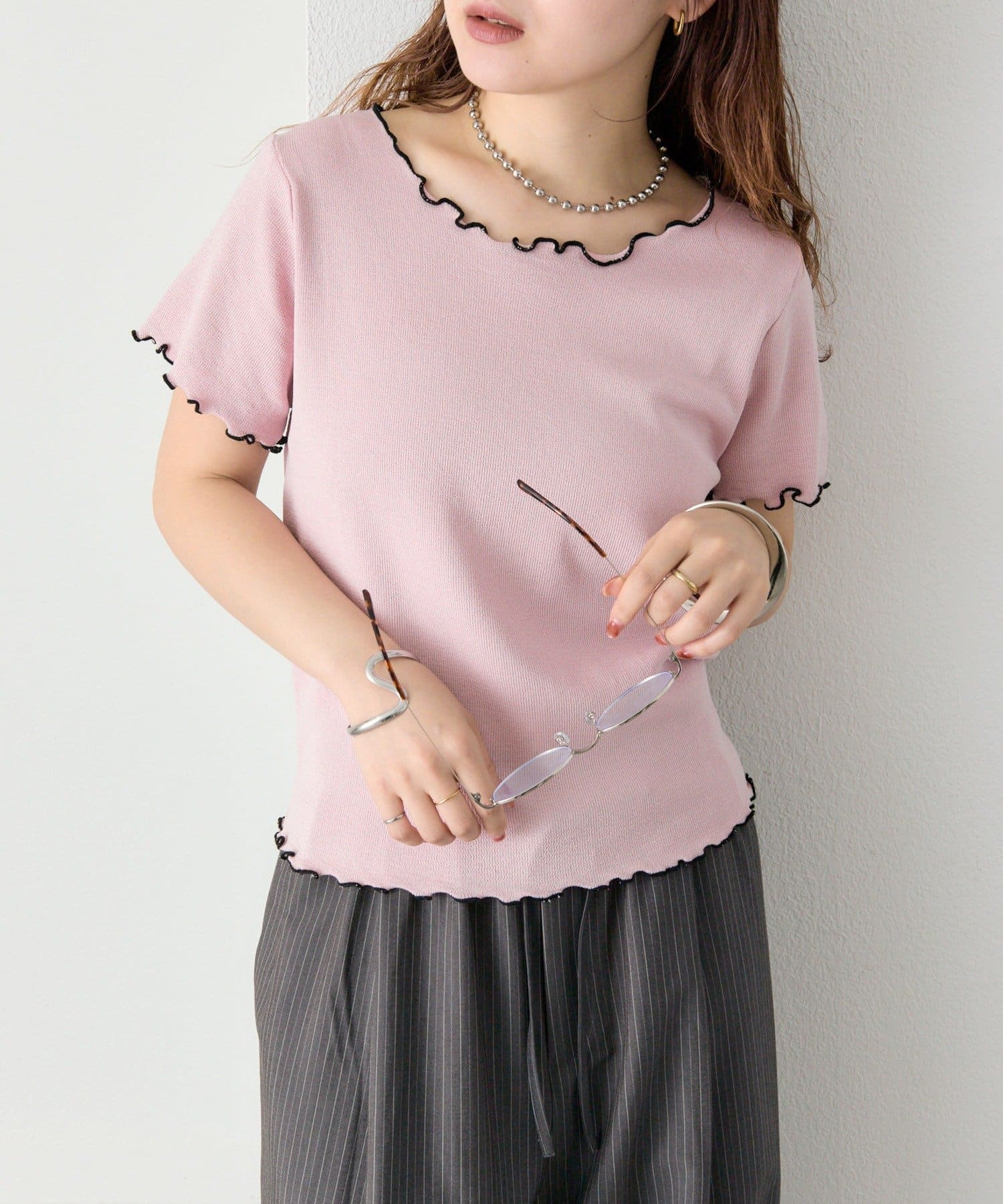 ・配色のメロウフリルがアクセントになったニットTシャツ。