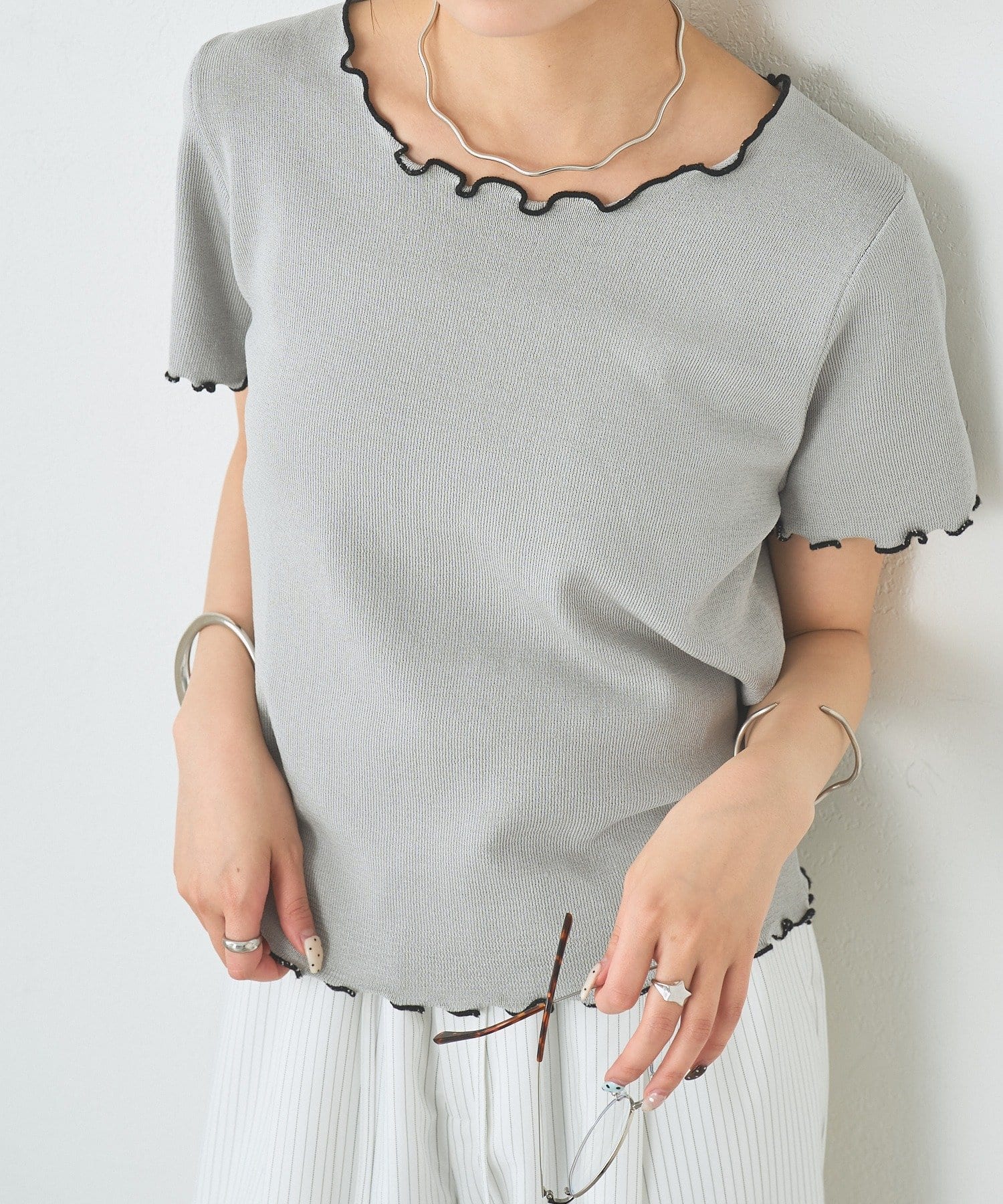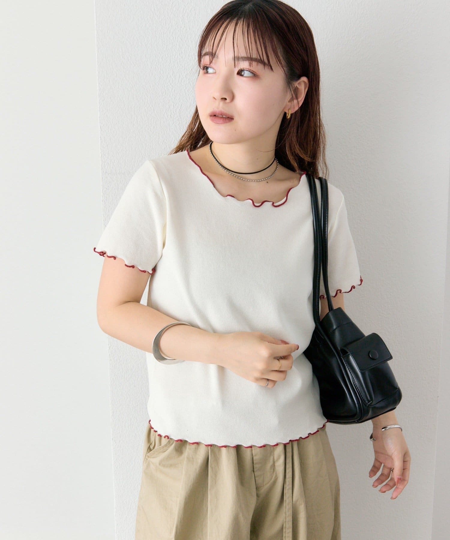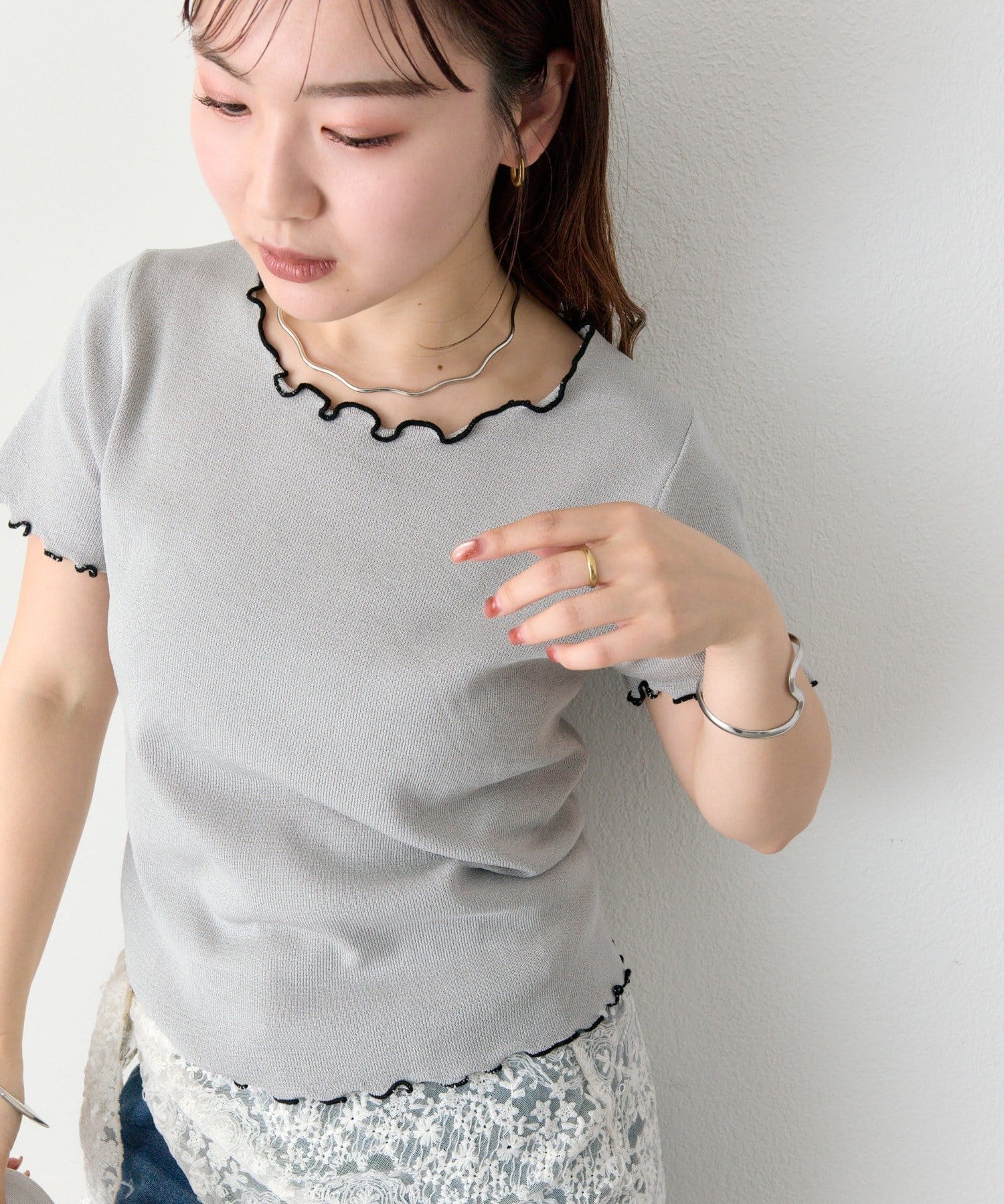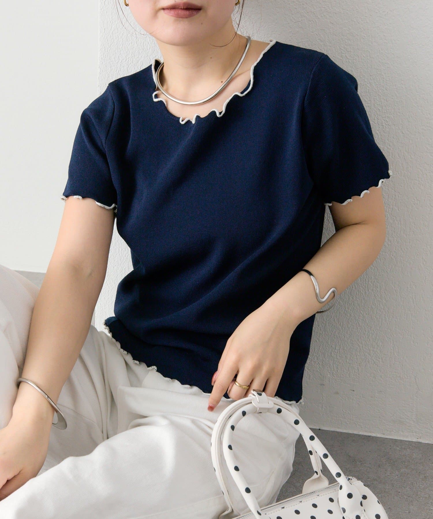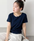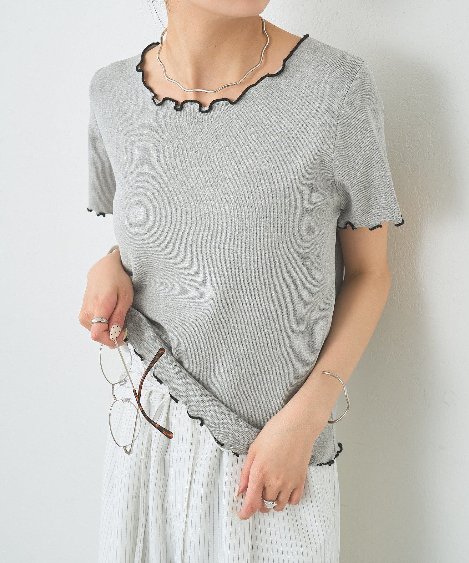 ・配色のメロウフリルがアクセントになったニットTシャツ。