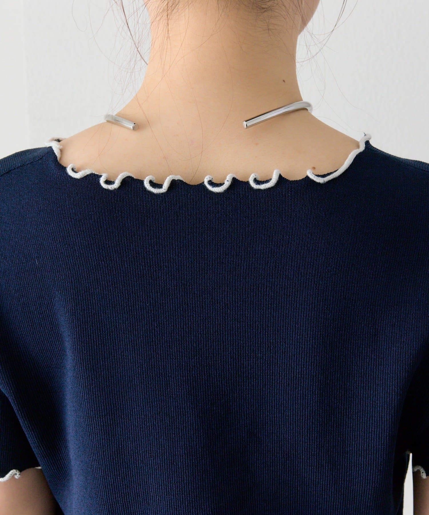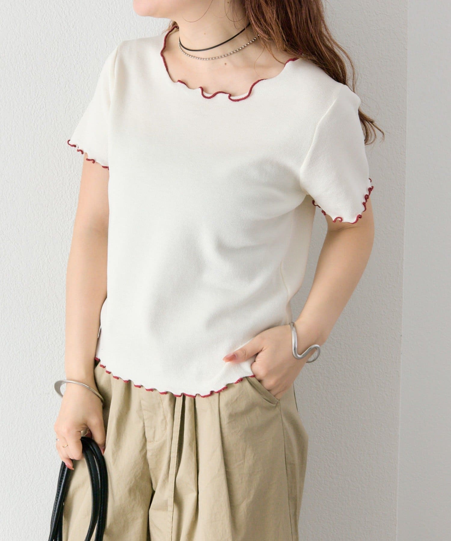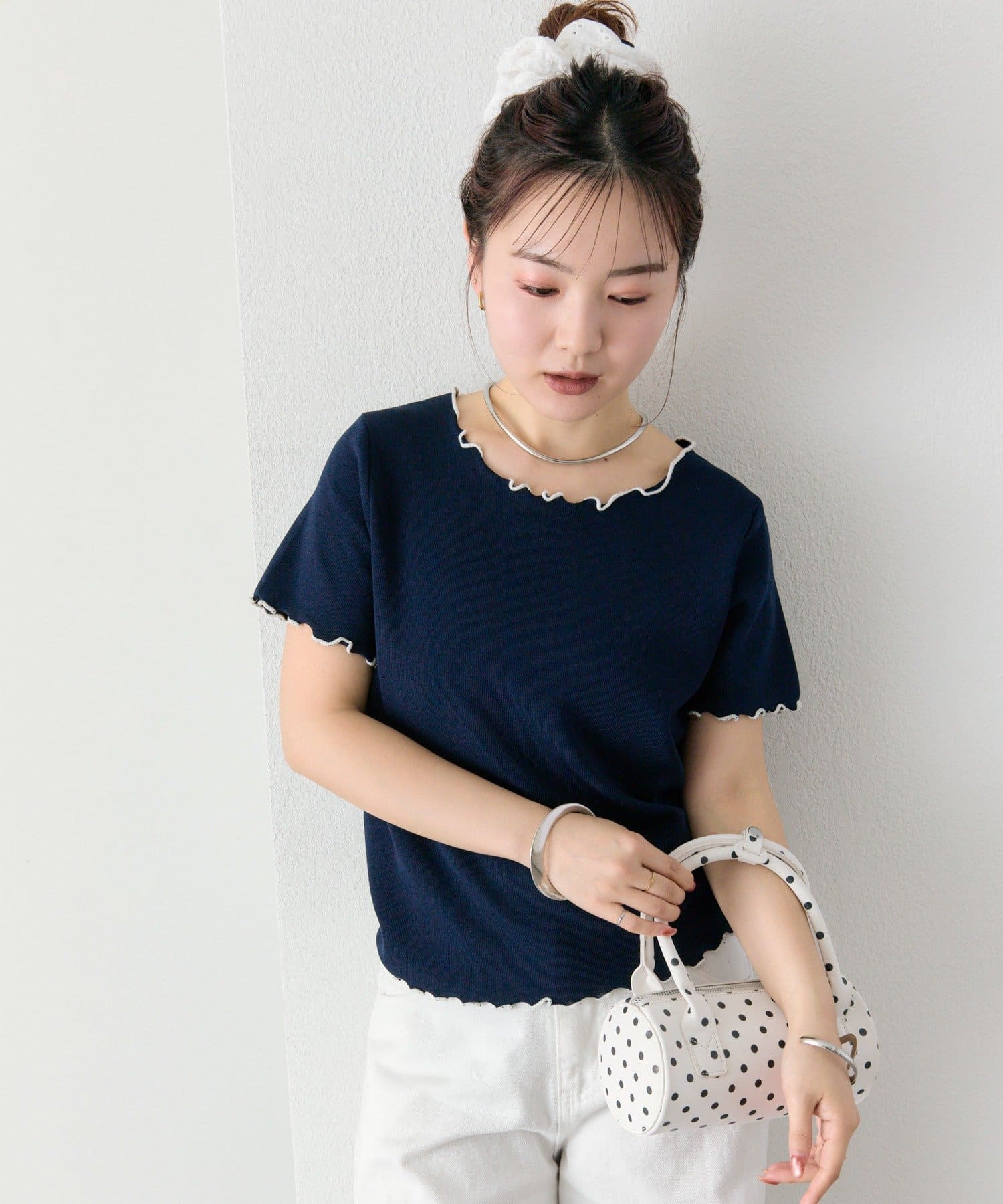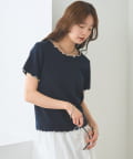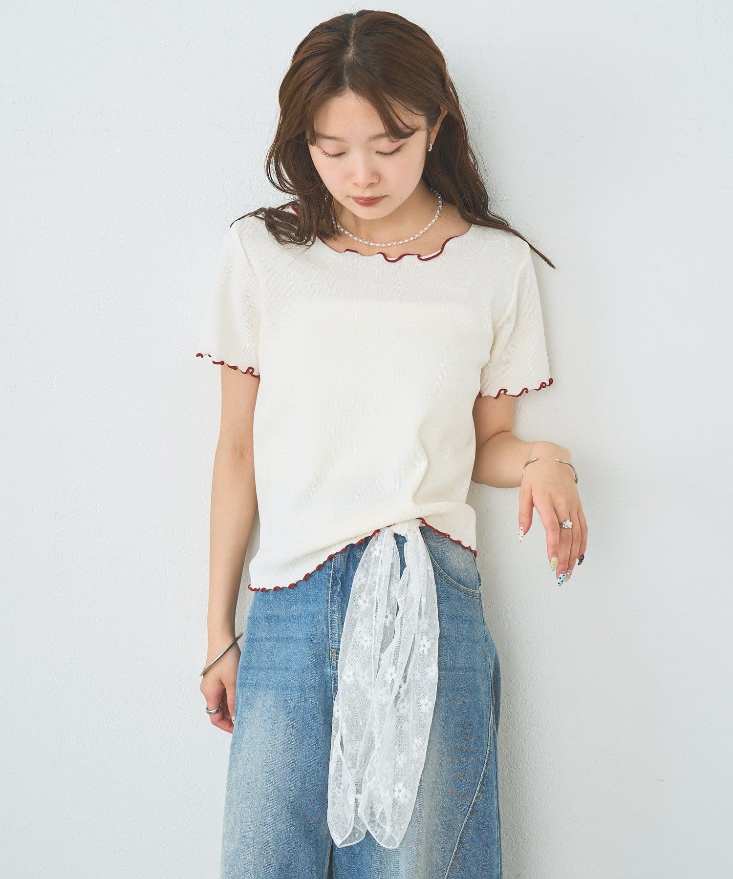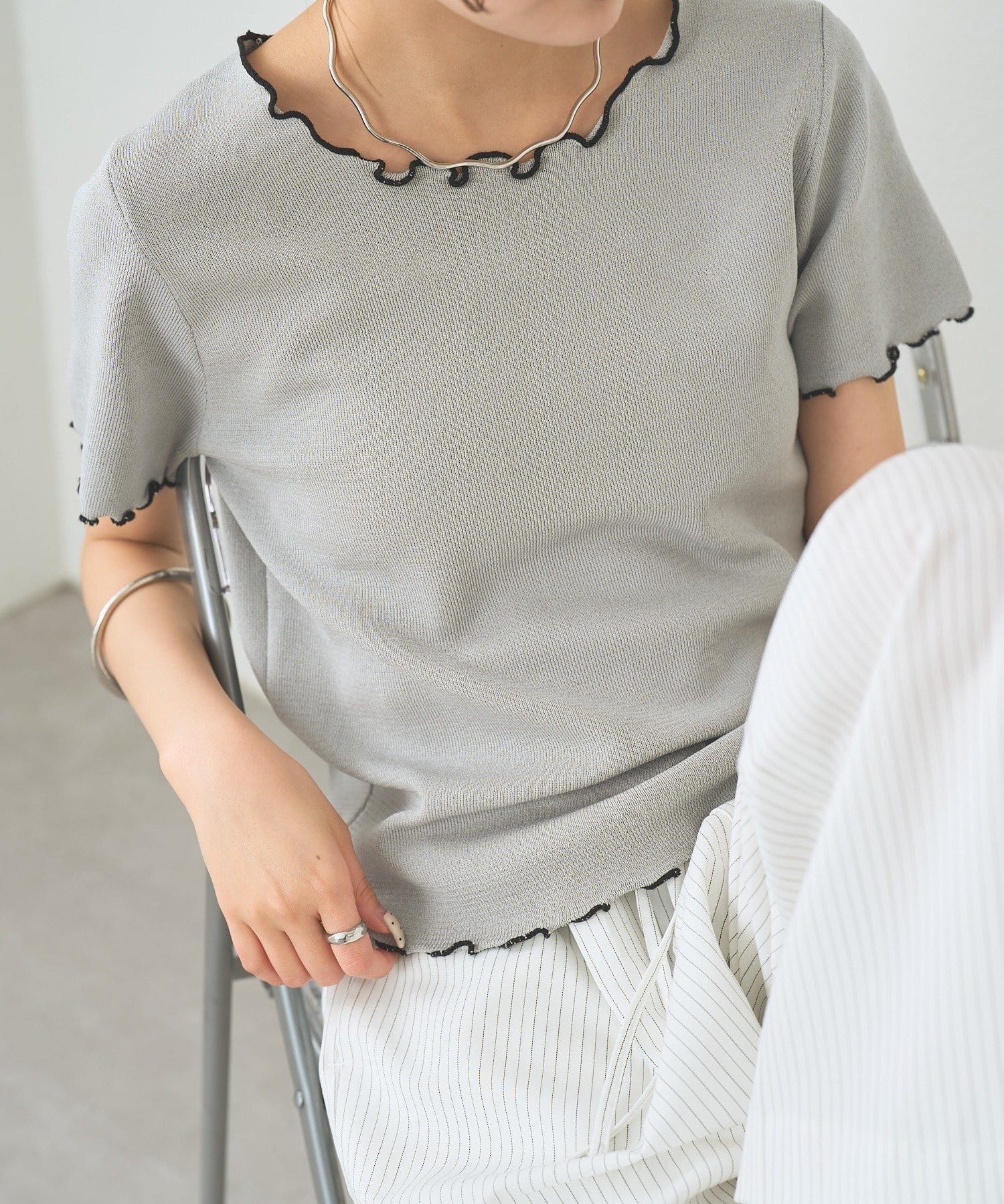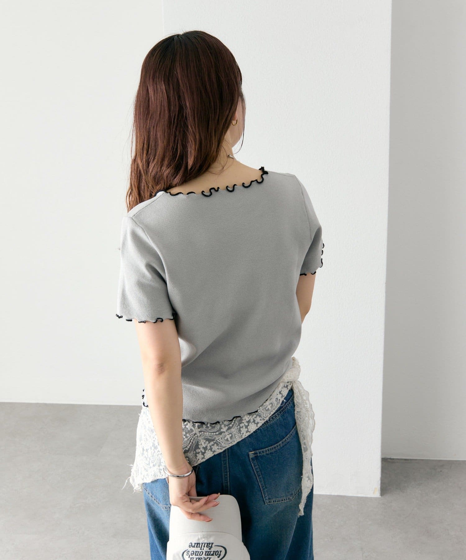 ・配色のメロウフリルがアクセントになったニットTシャツ。