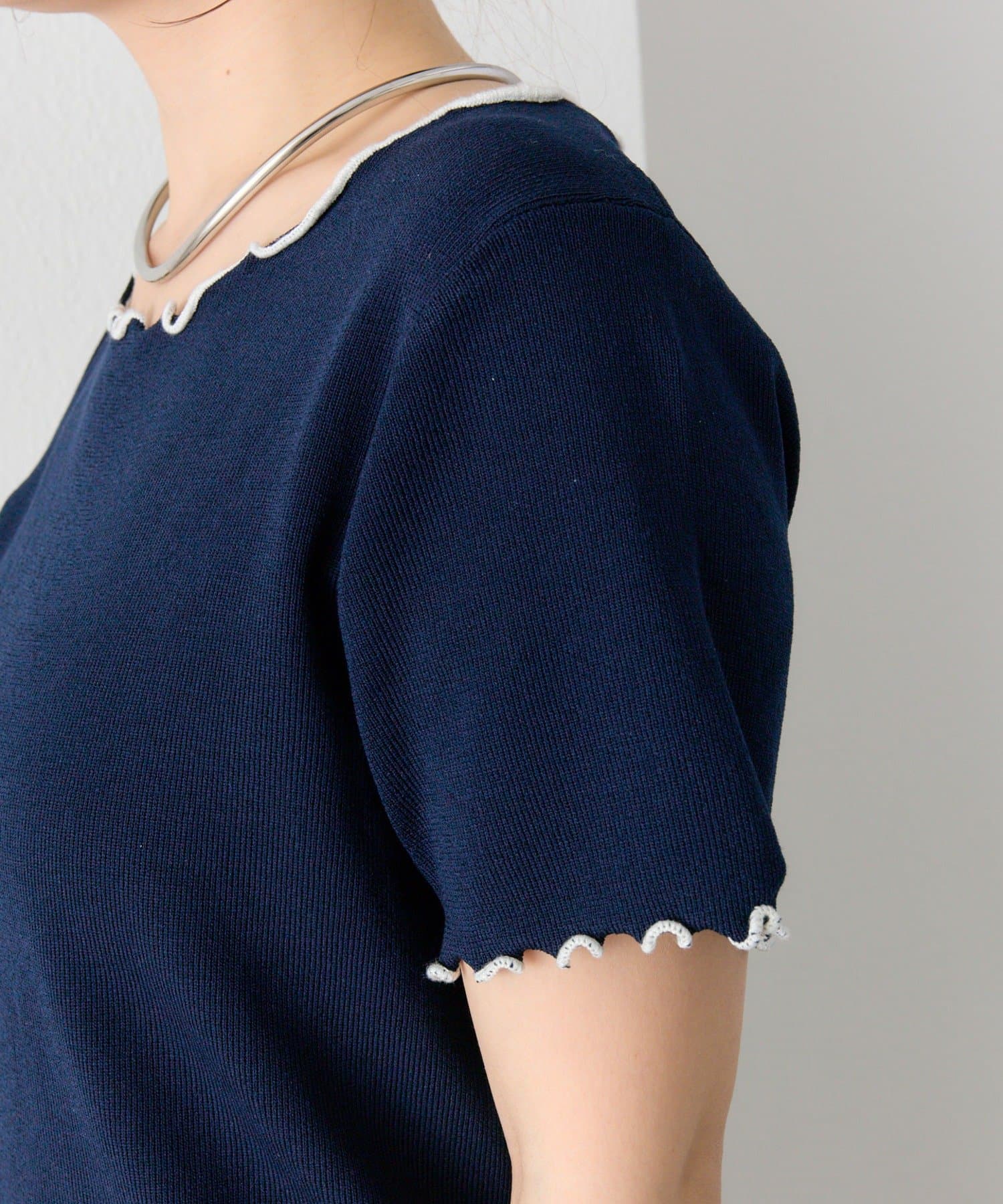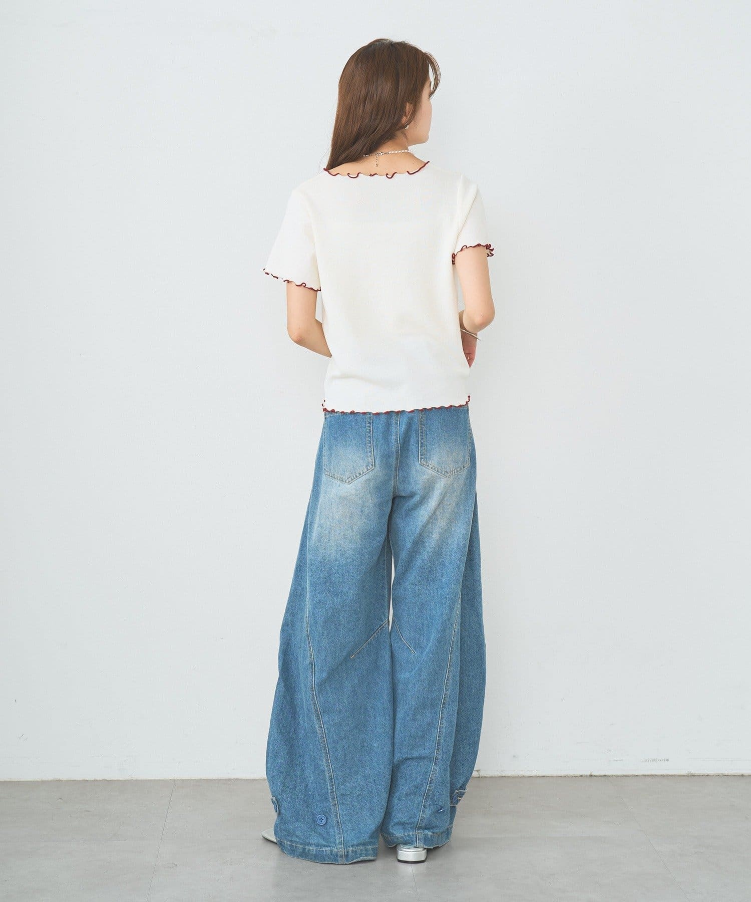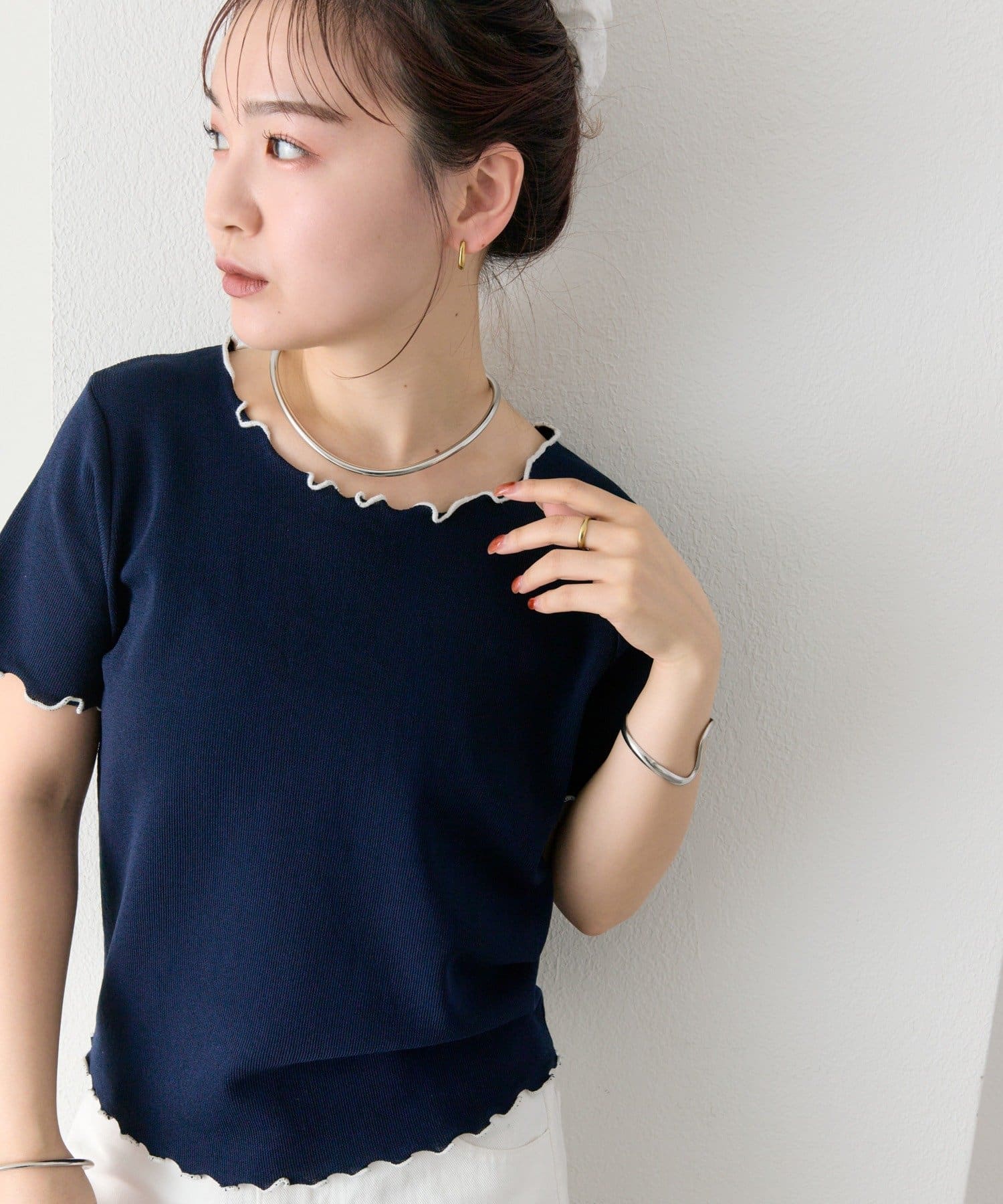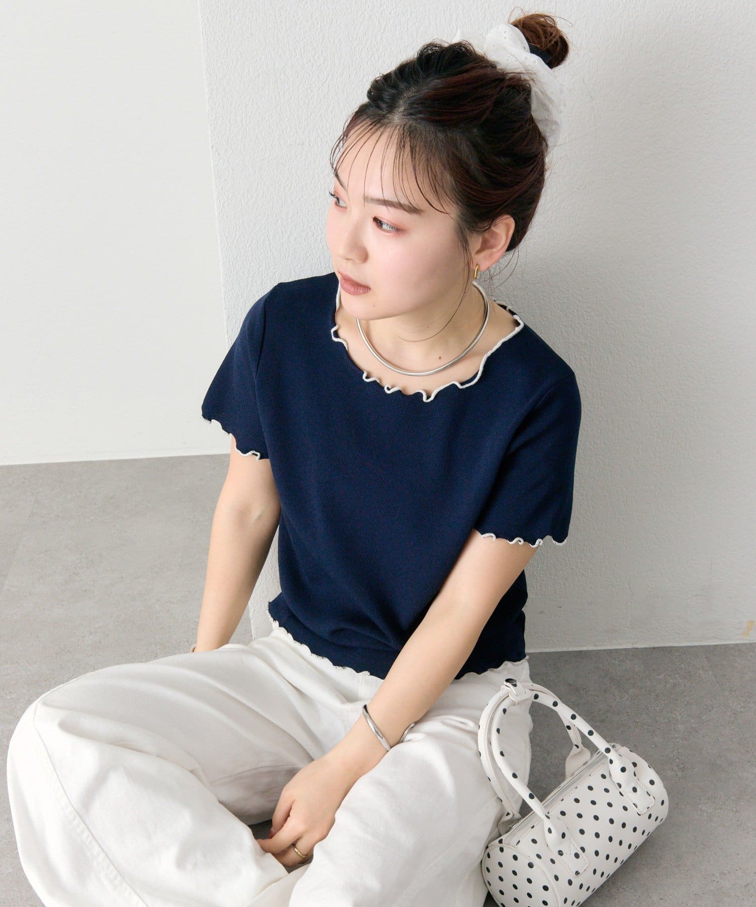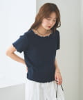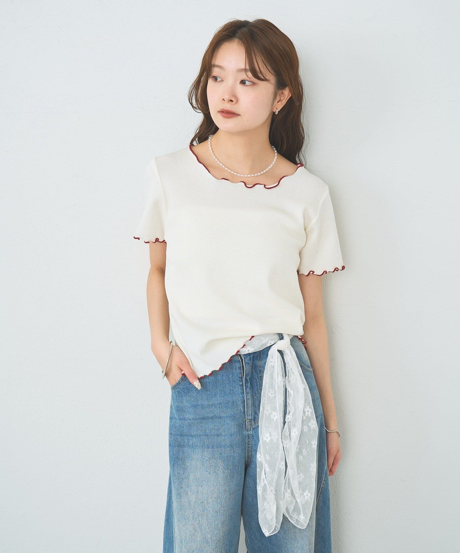 ・配色のメロウフリルがアクセントになったニットTシャツ。
