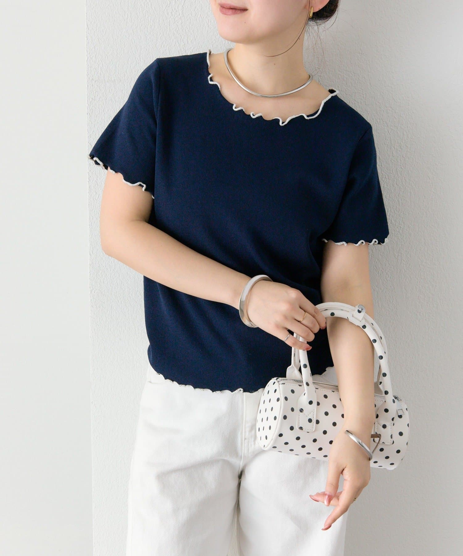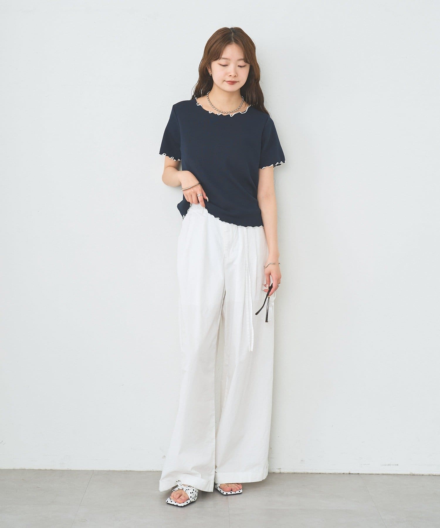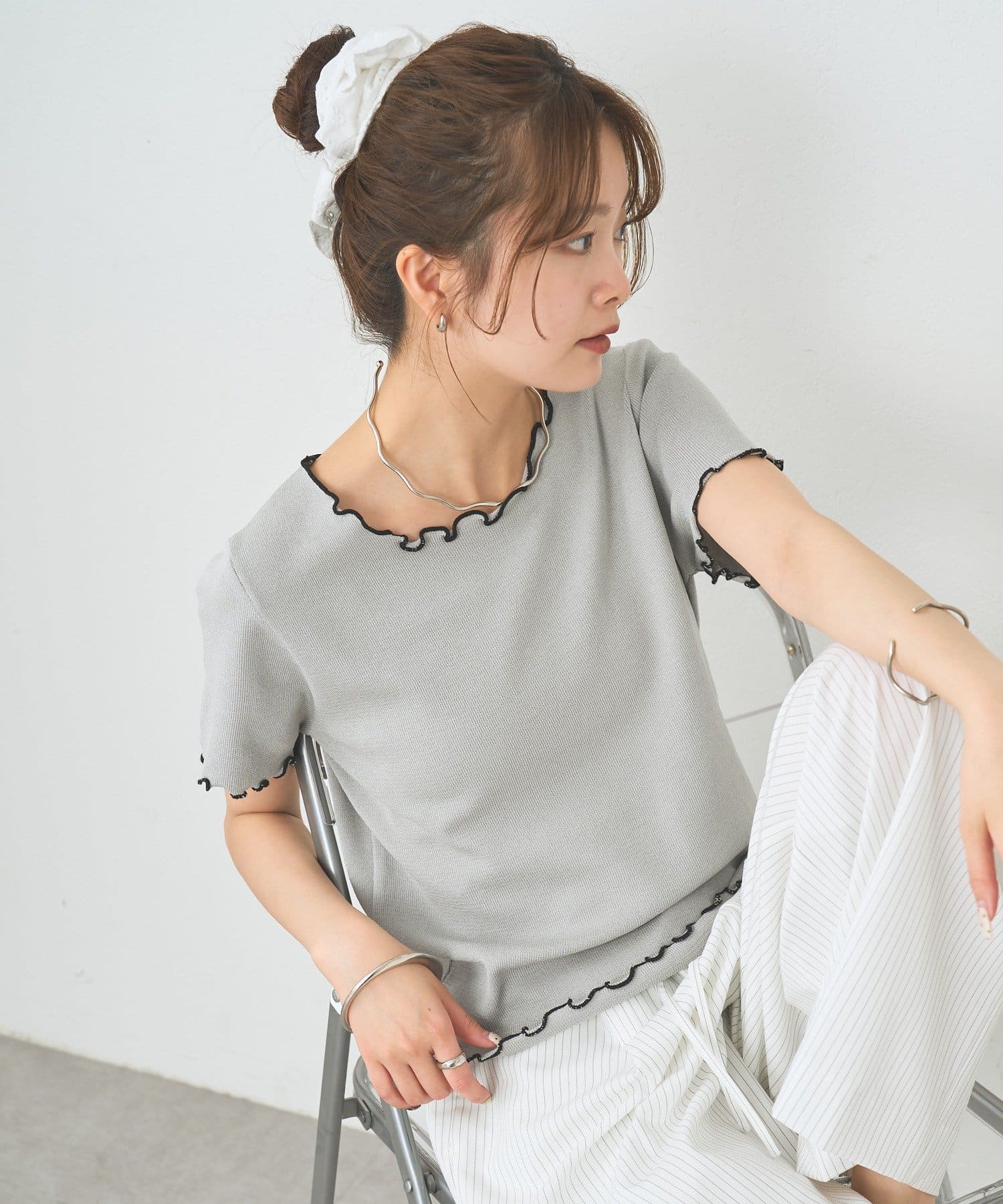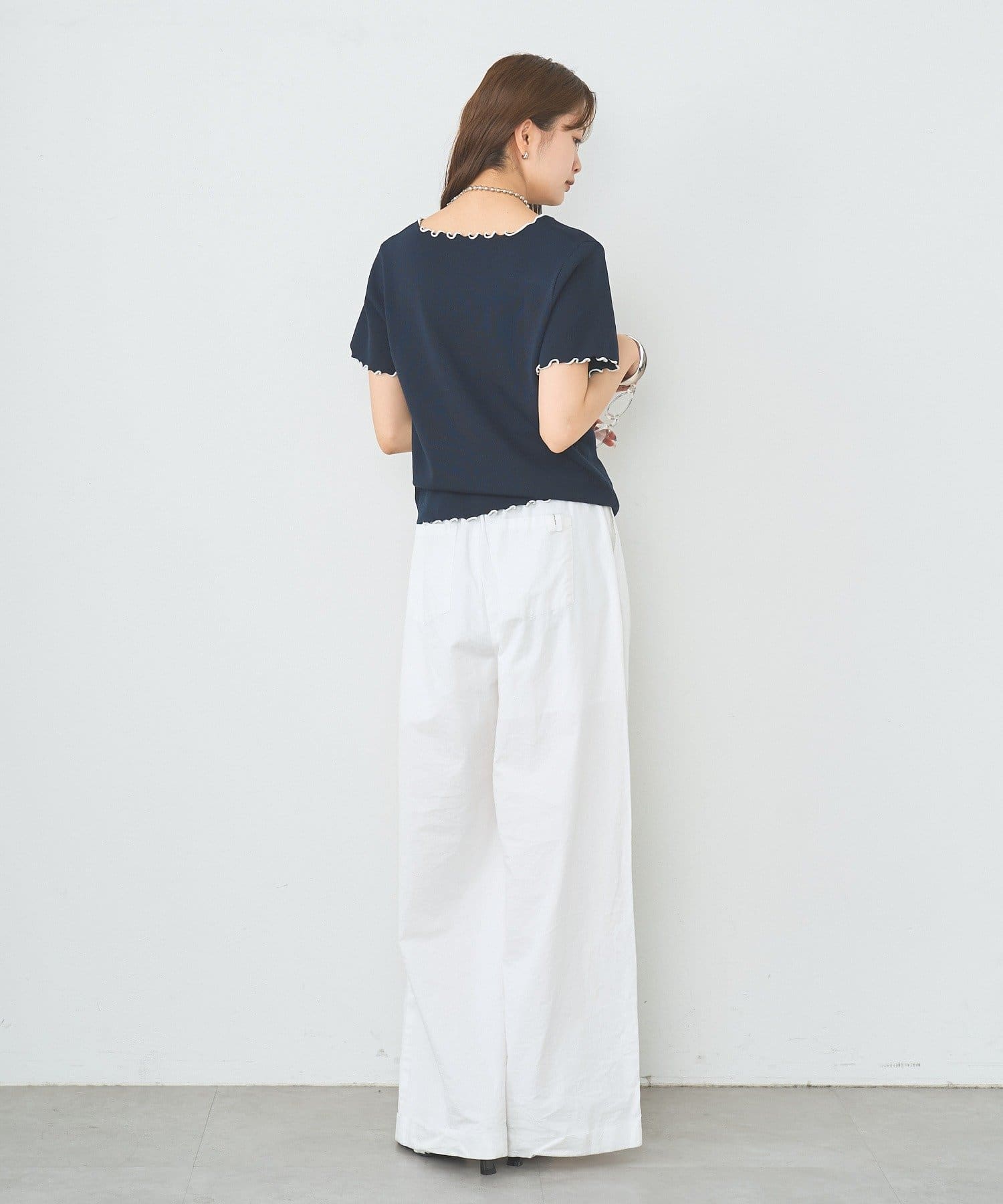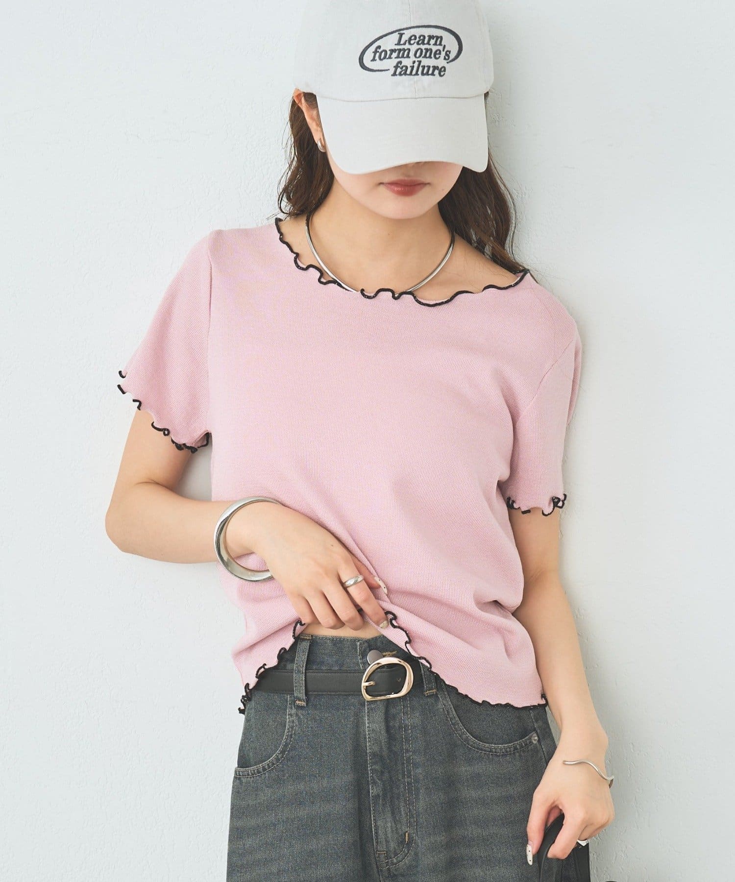 ・配色のメロウフリルがアクセントになったニットTシャツ。