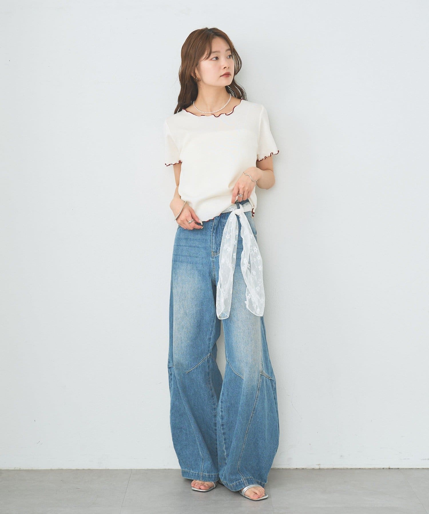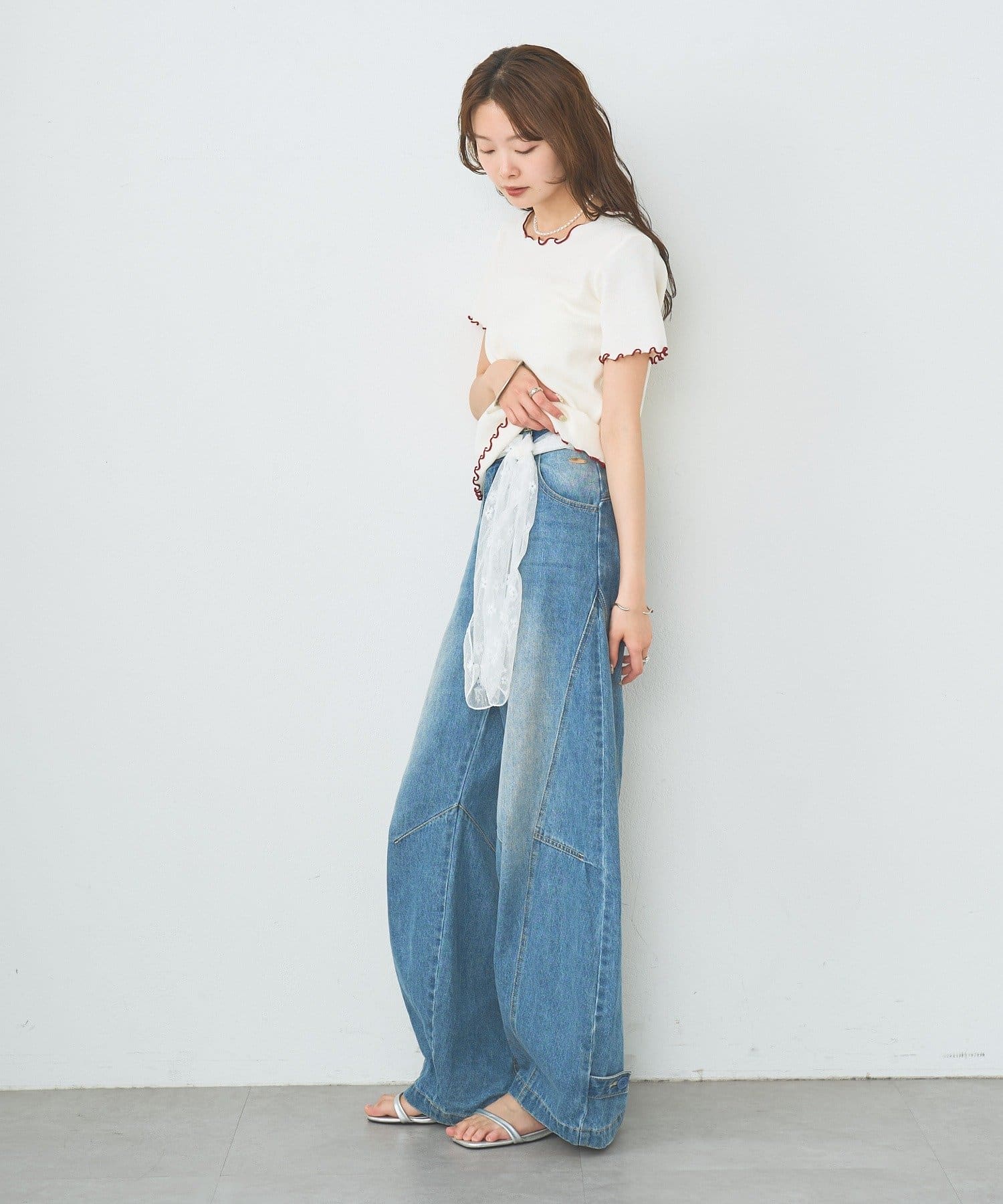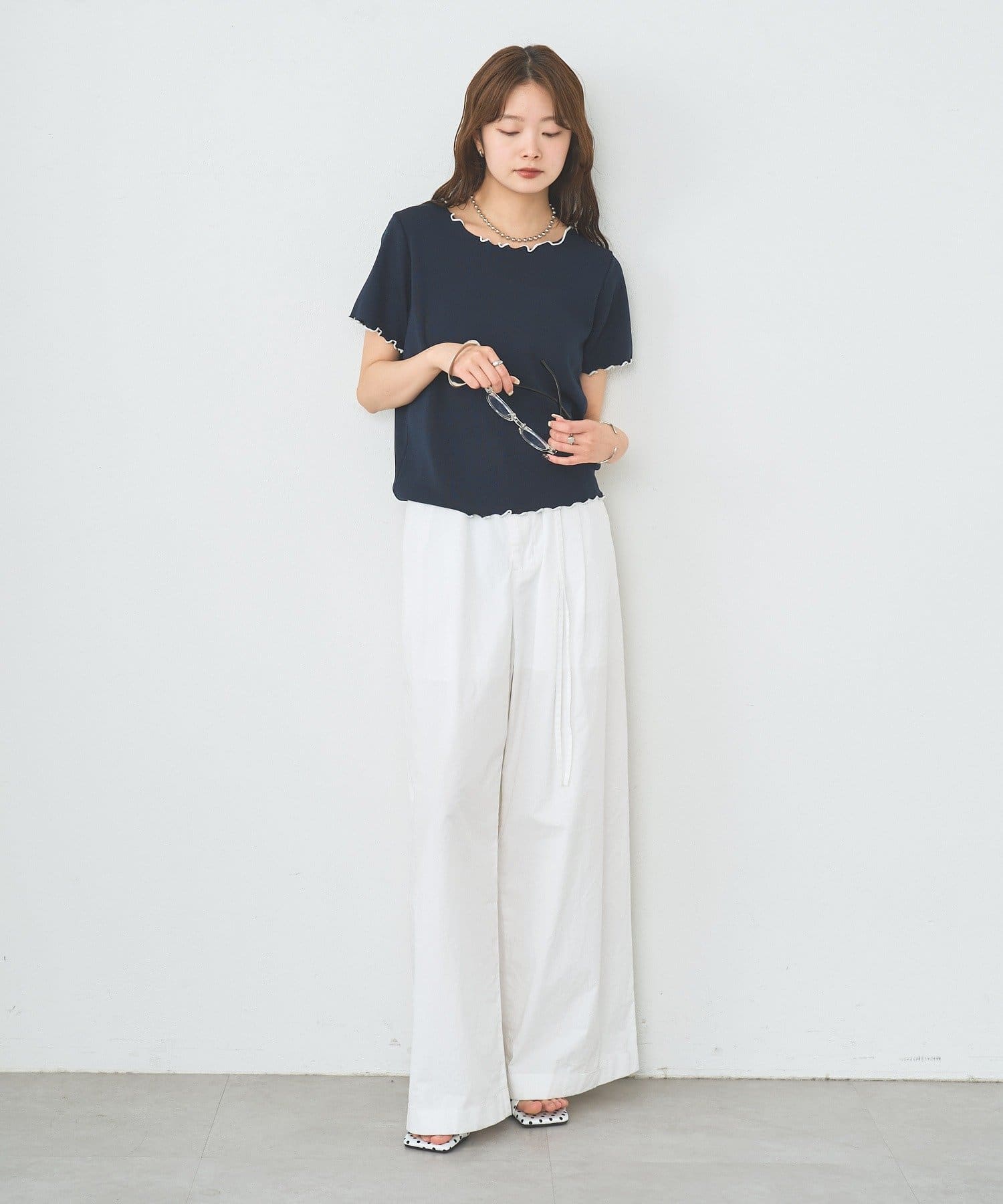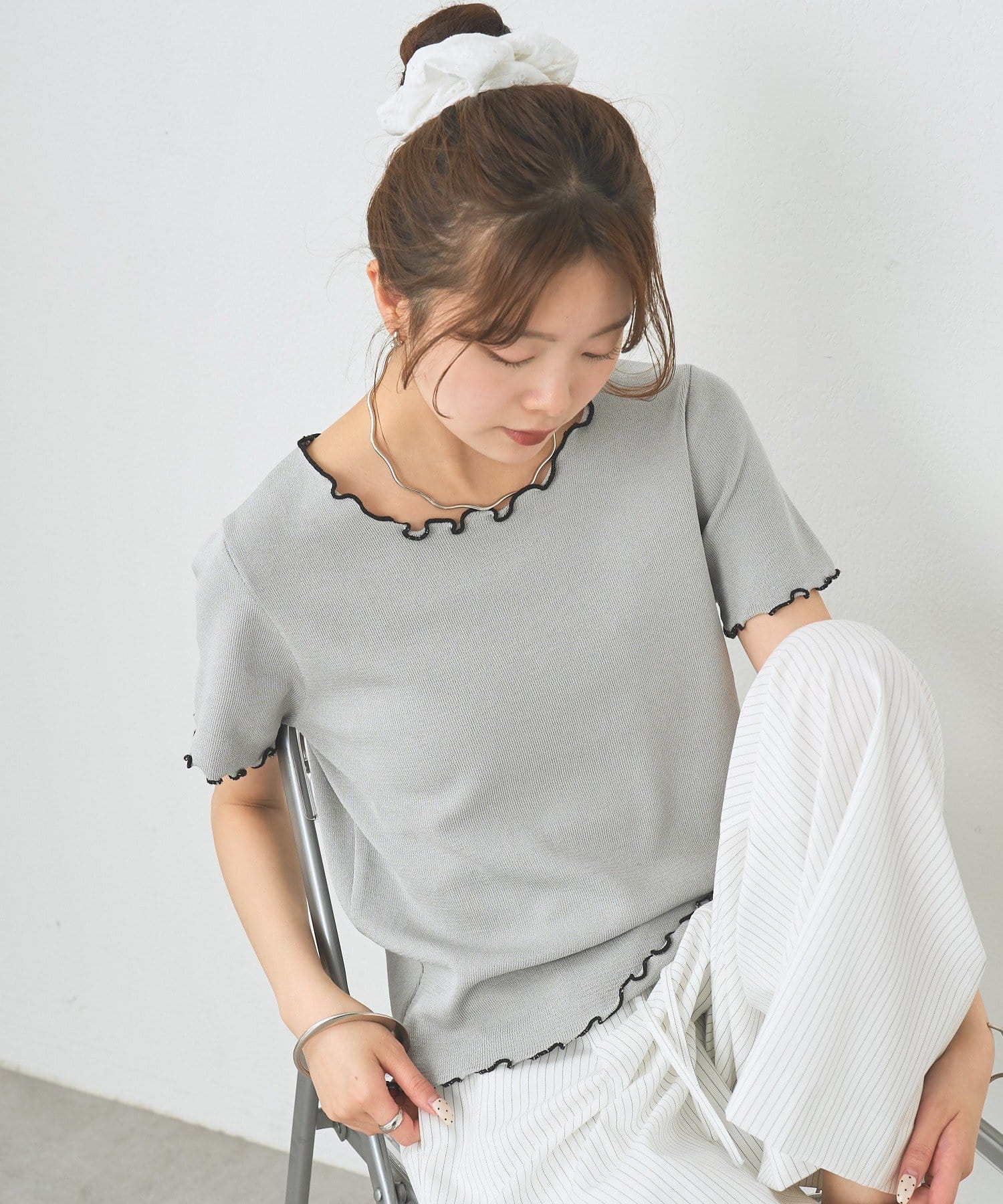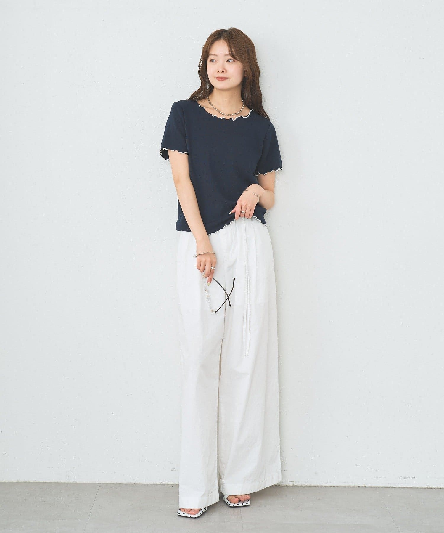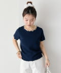 ・配色のメロウフリルがアクセントになったニットTシャツ。