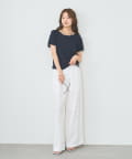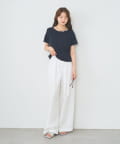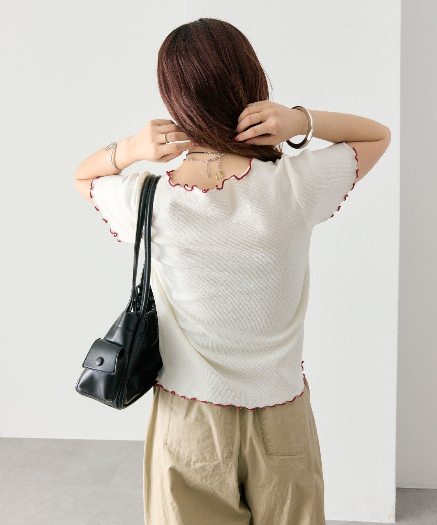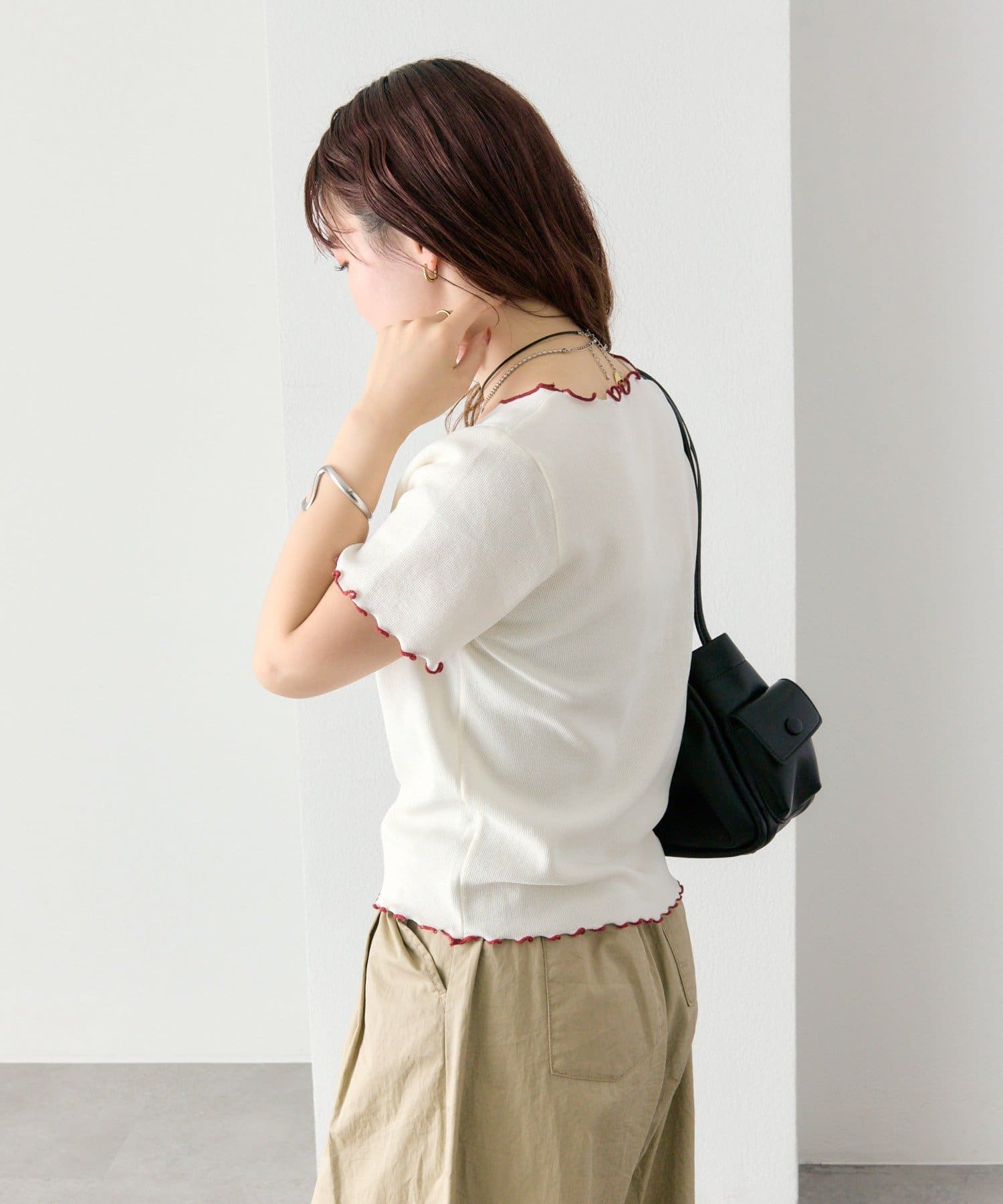 ・ネックラインや袖口、裾に施されたさりげない配色デザインがシンプルながらも目を惹く一枚。