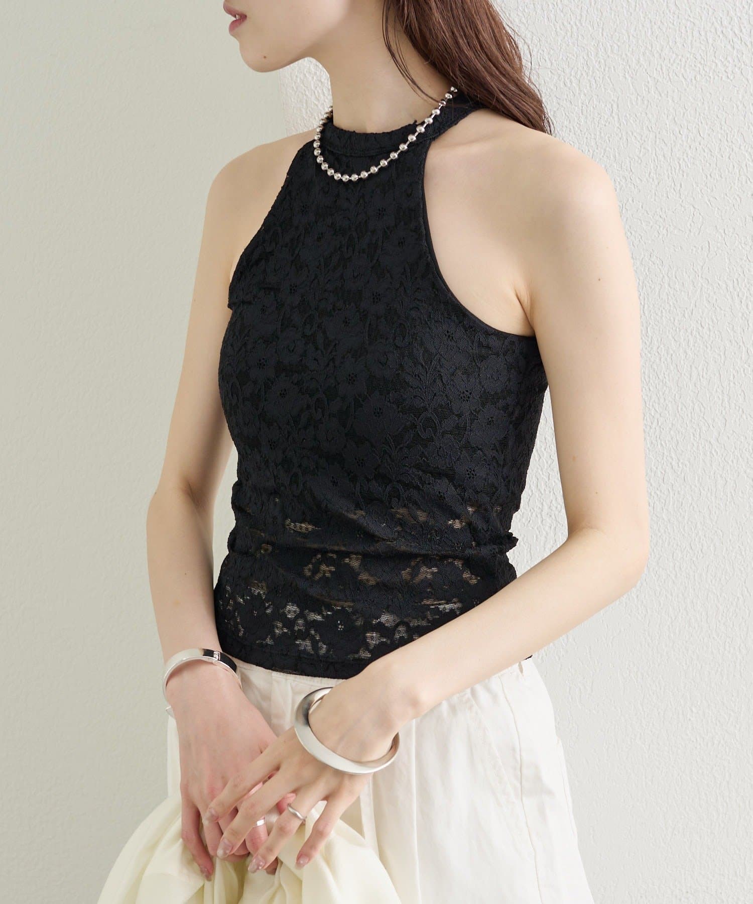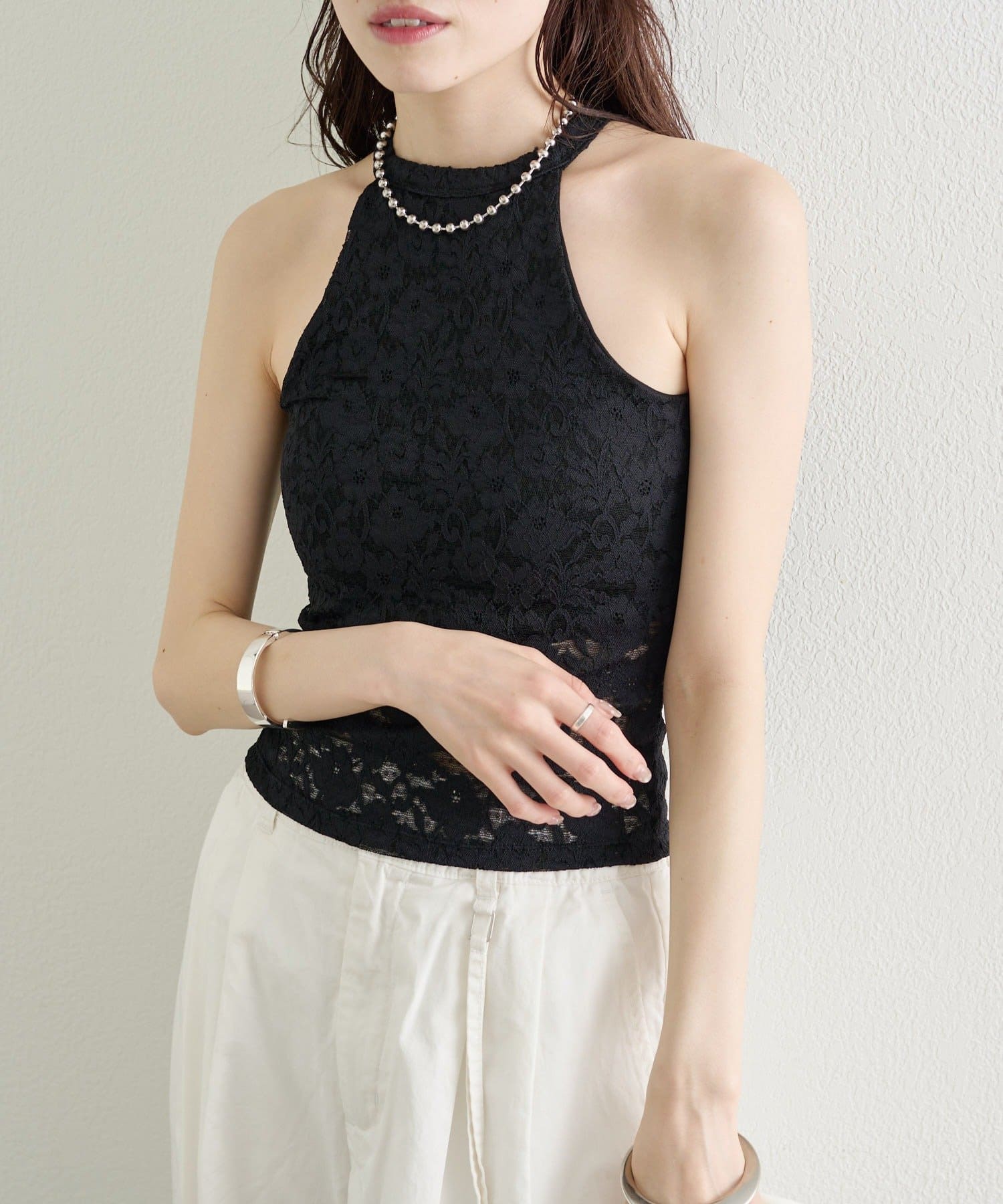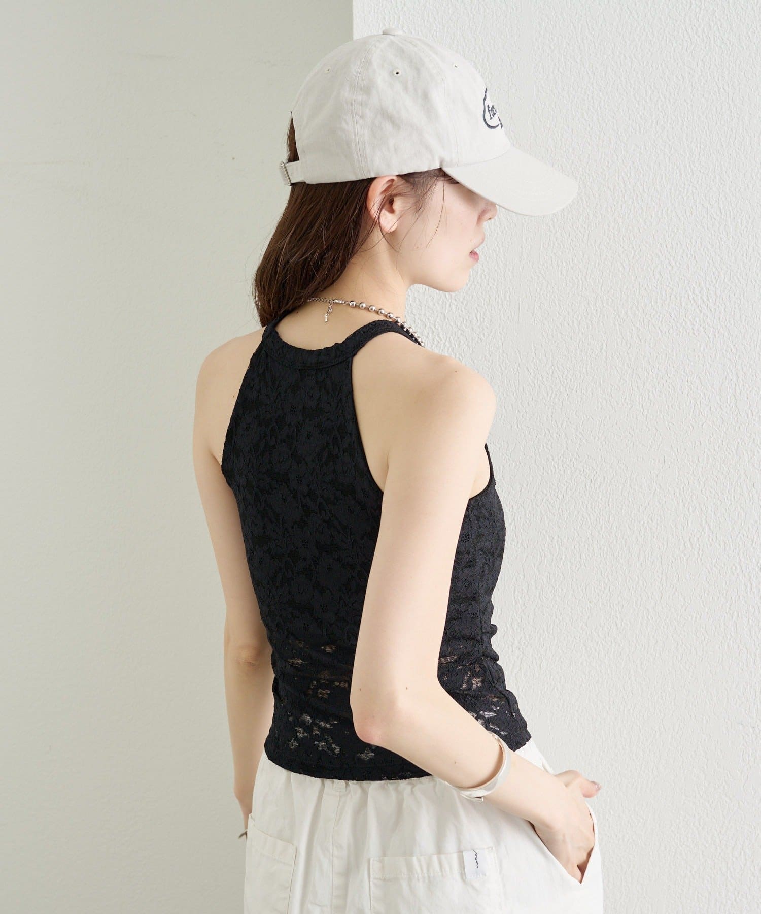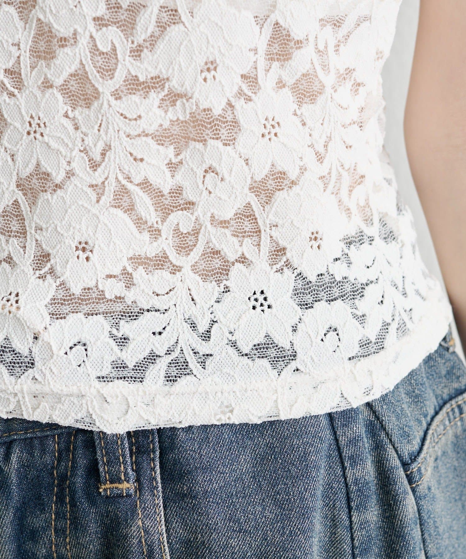 繊細なレースが大人の抜け感を演出する、アメスリデザインのキャミソール。