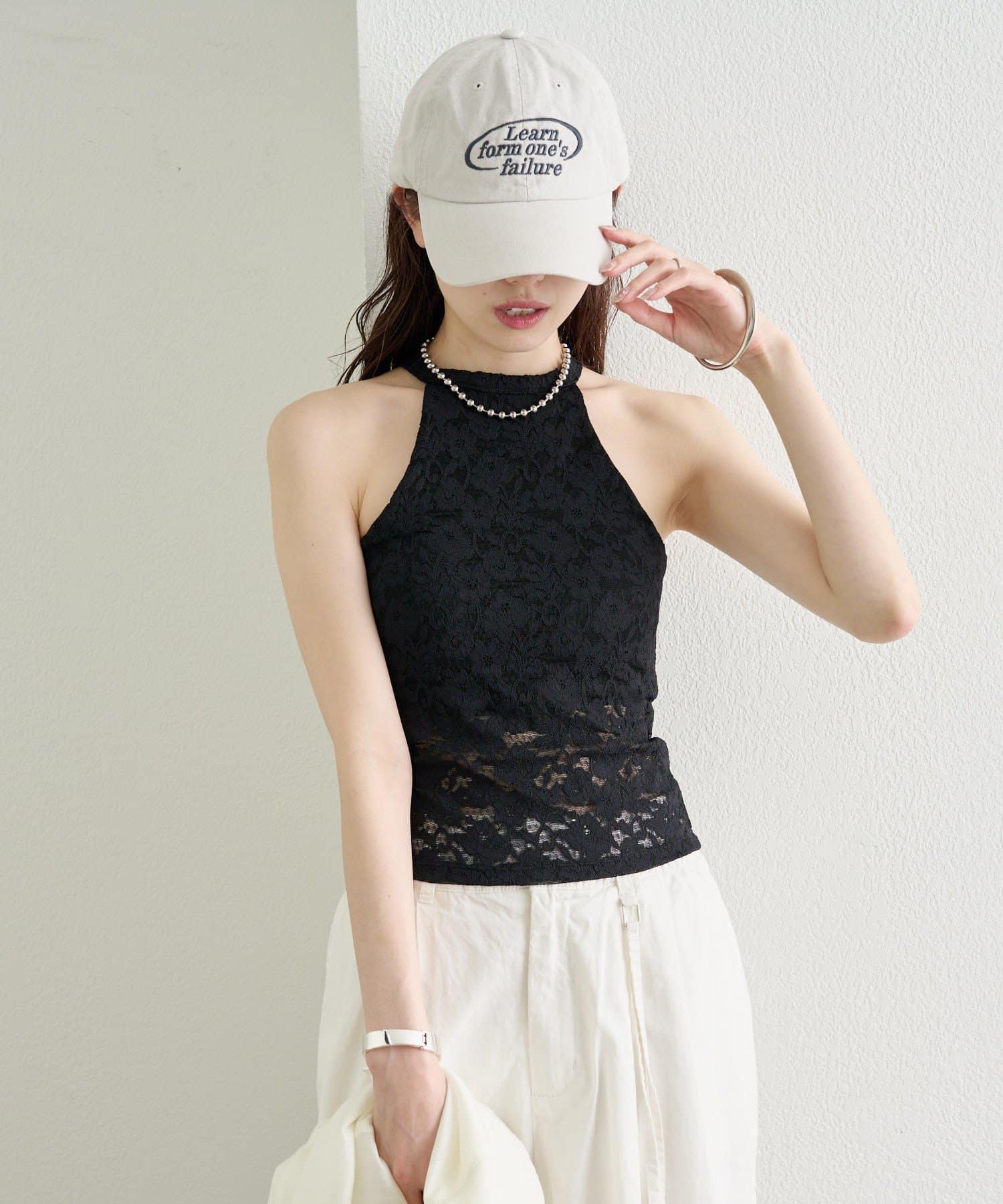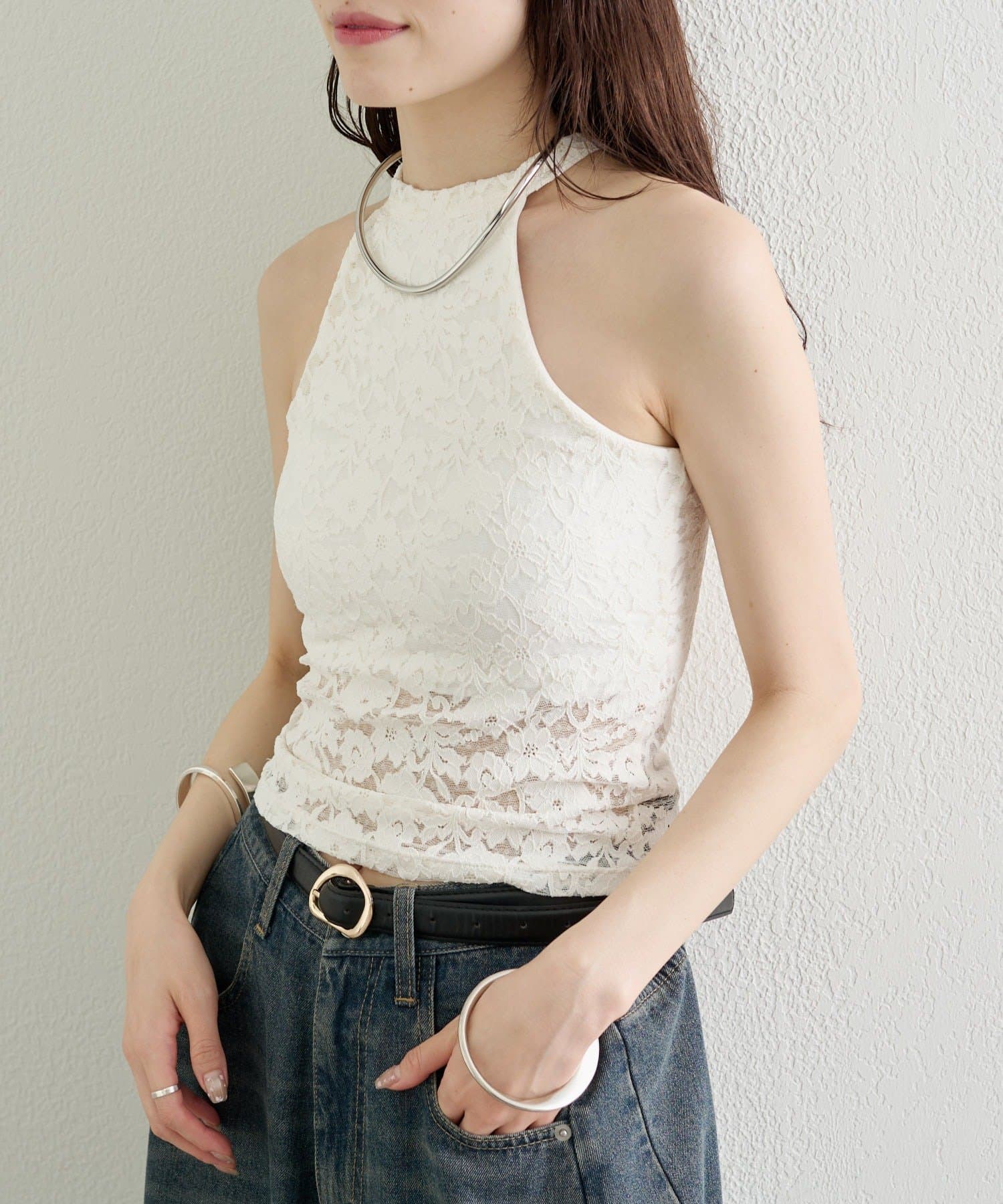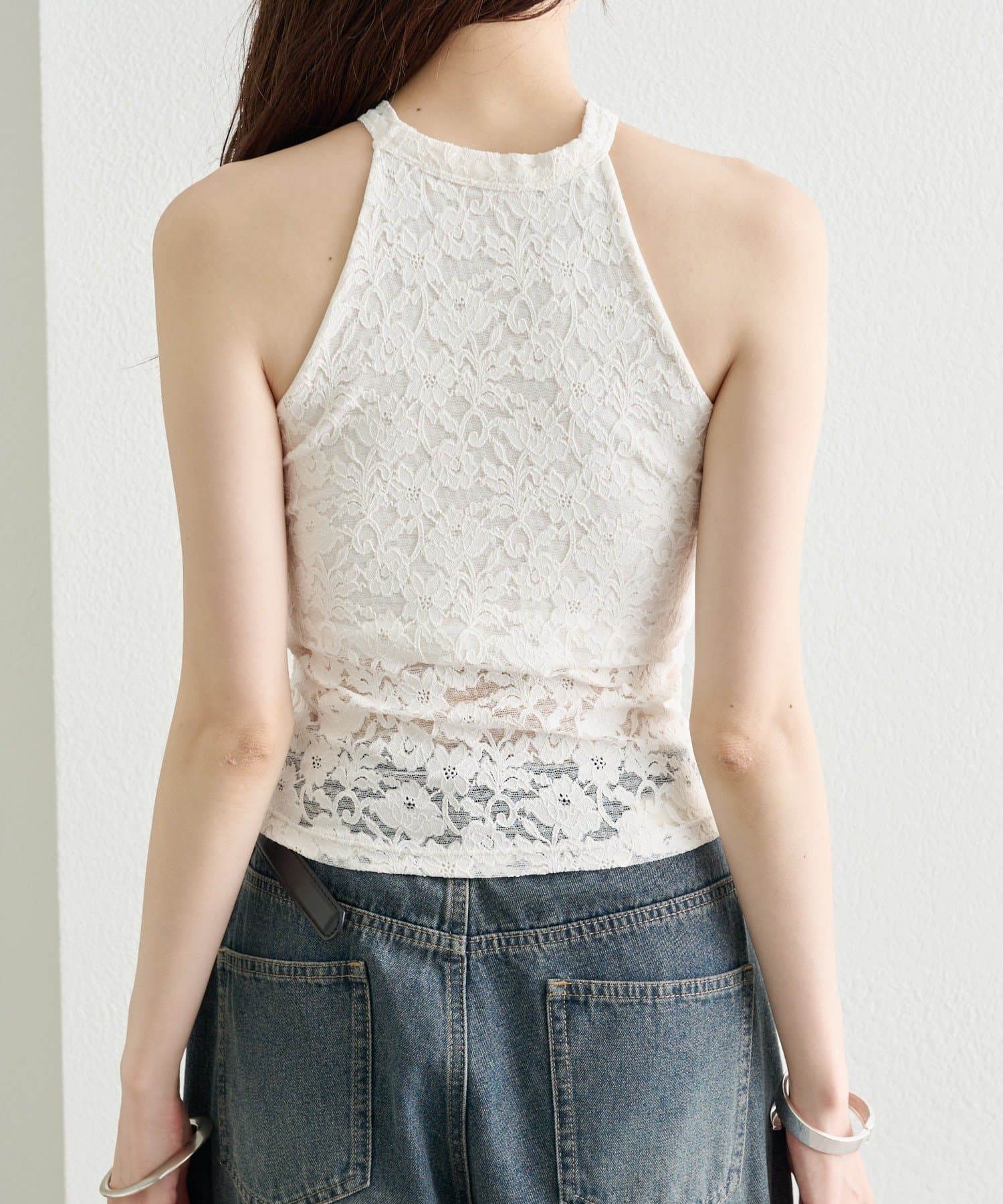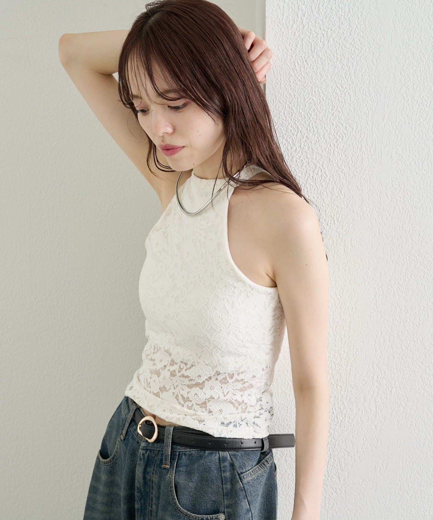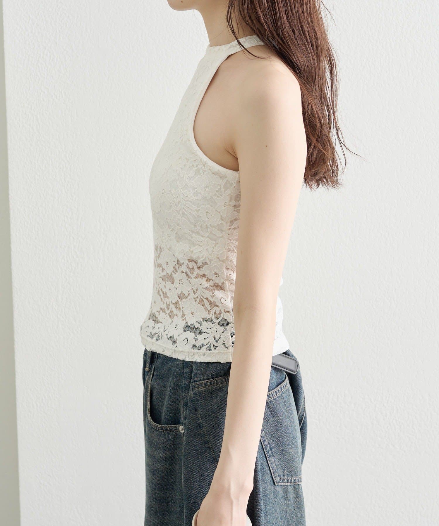 繊細なレースが大人の抜け感を演出する、アメスリデザインのキャミソール。