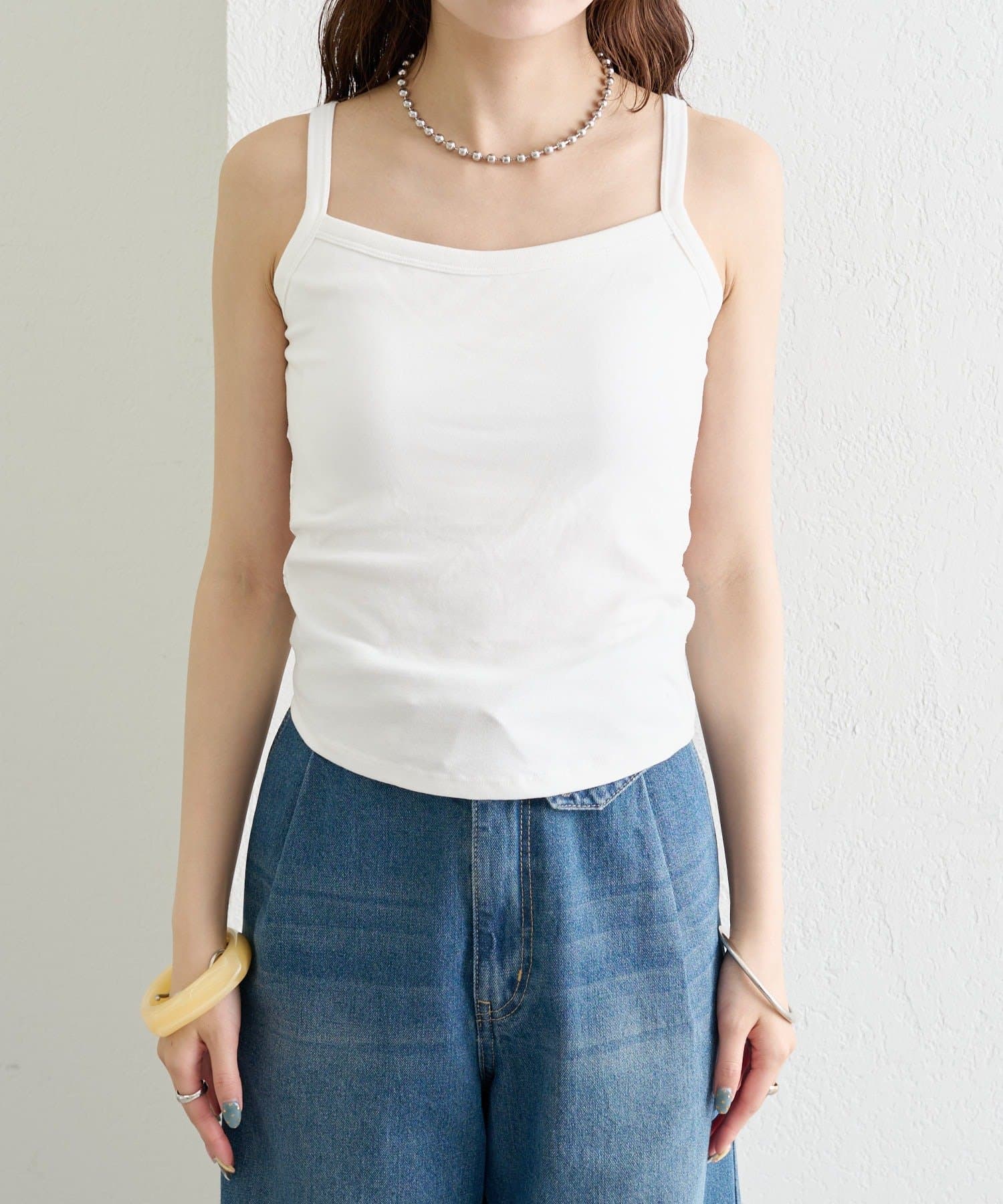 取り外し可能なパット付きで、1枚ですっきり着ていただけます。