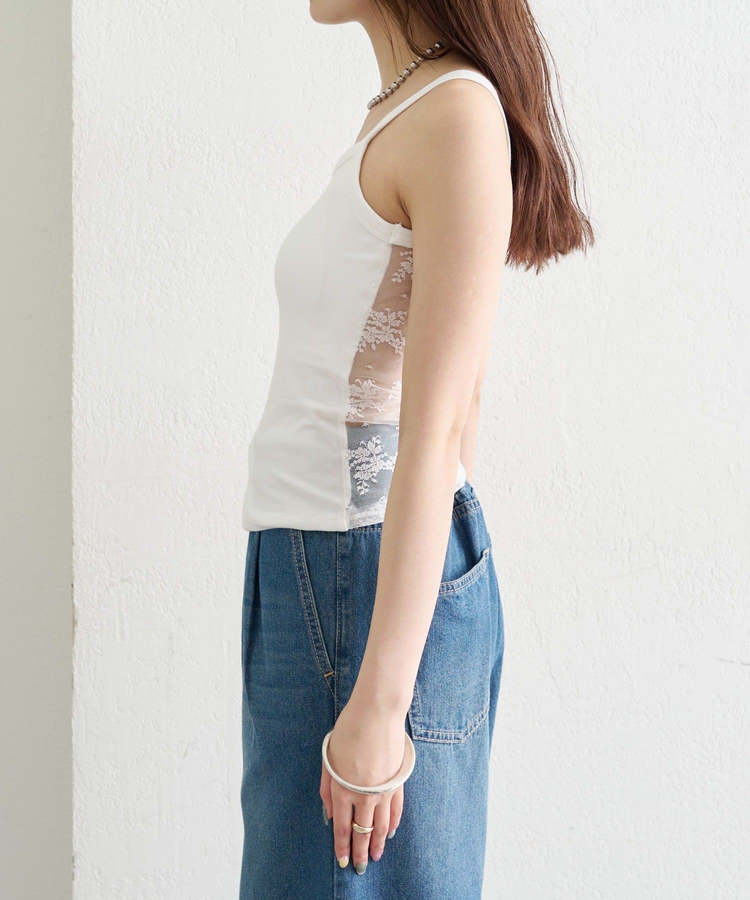 フロントはシンプルに、バックは大胆なレース使いで、大人の抜け感を演出。