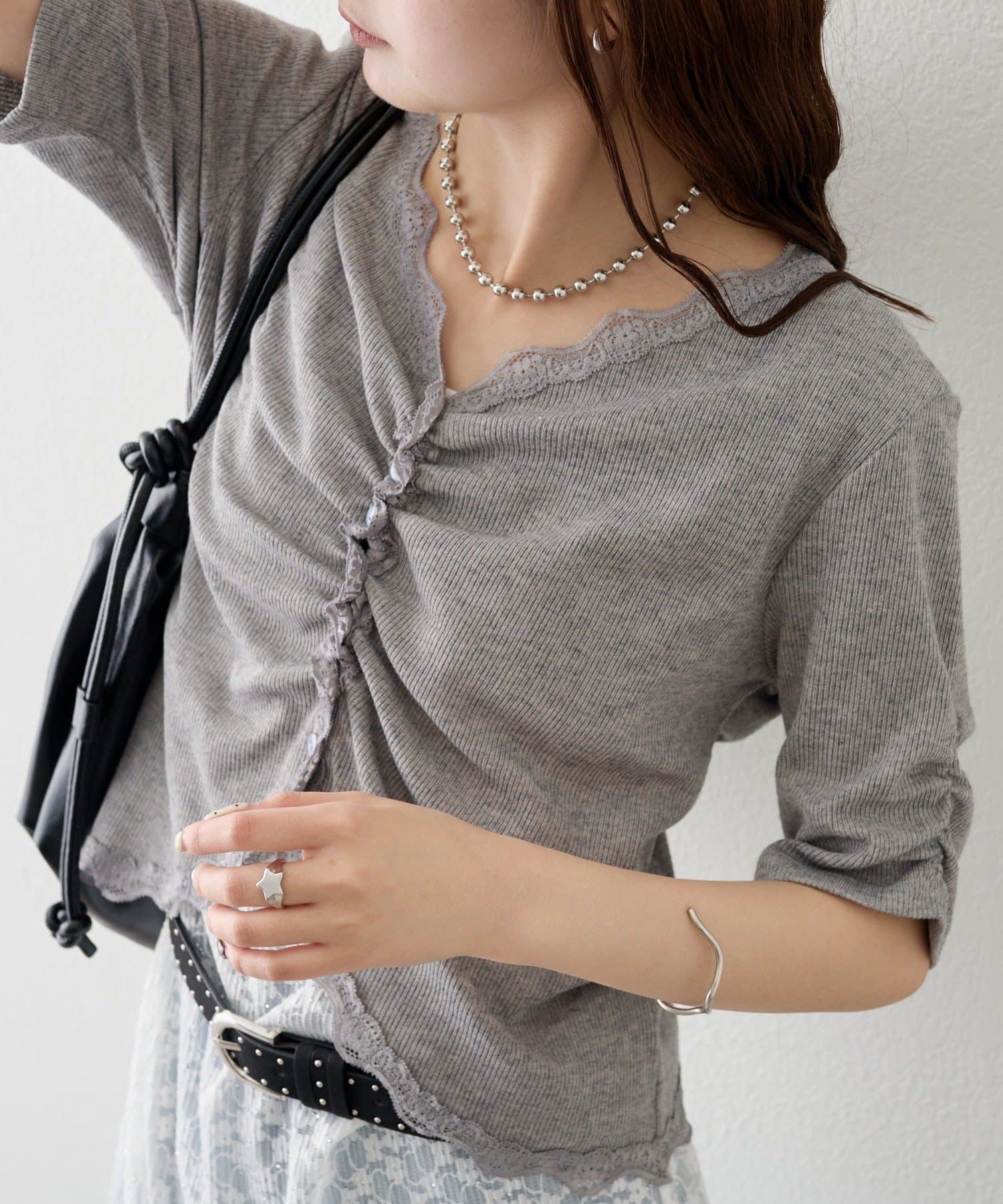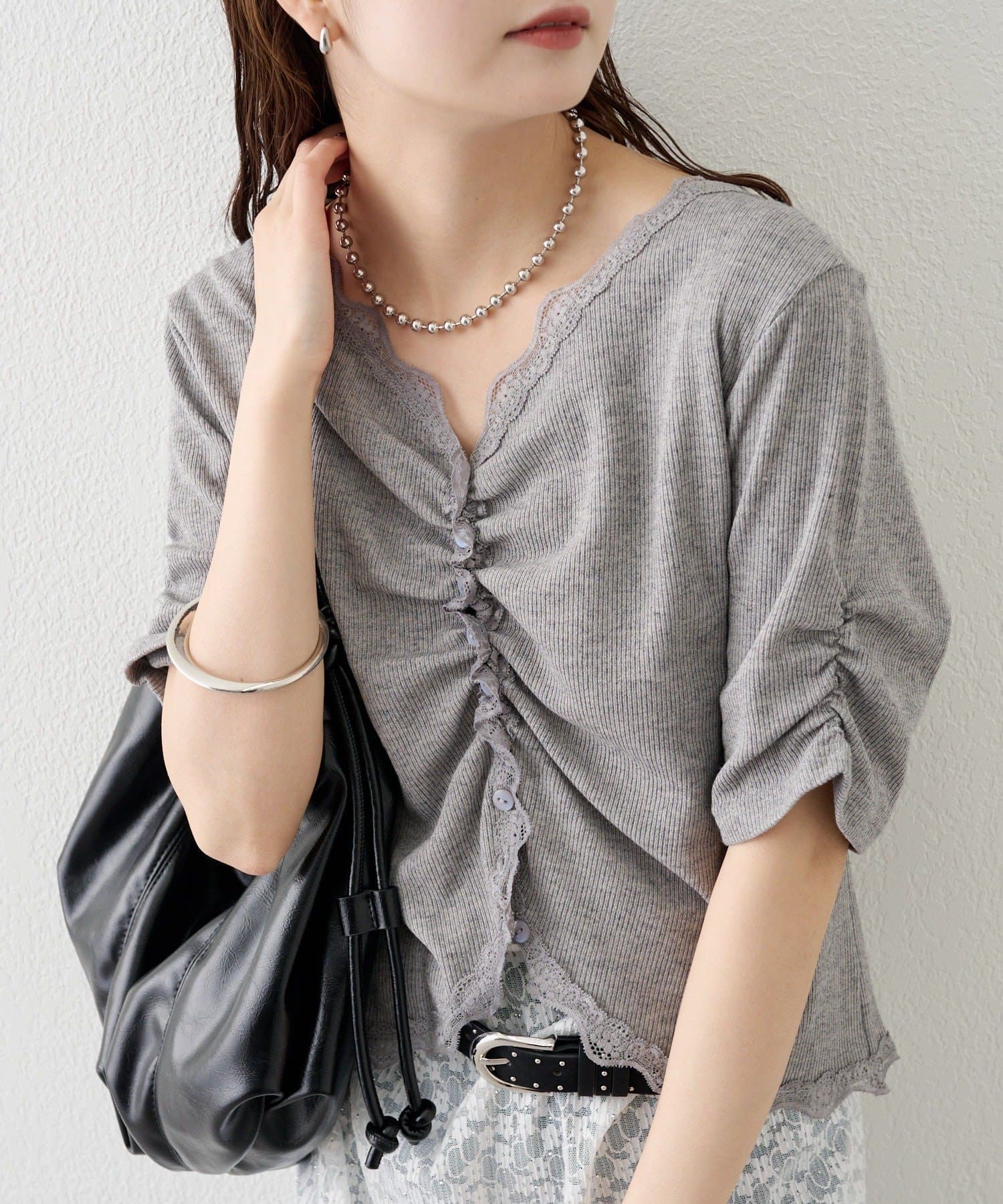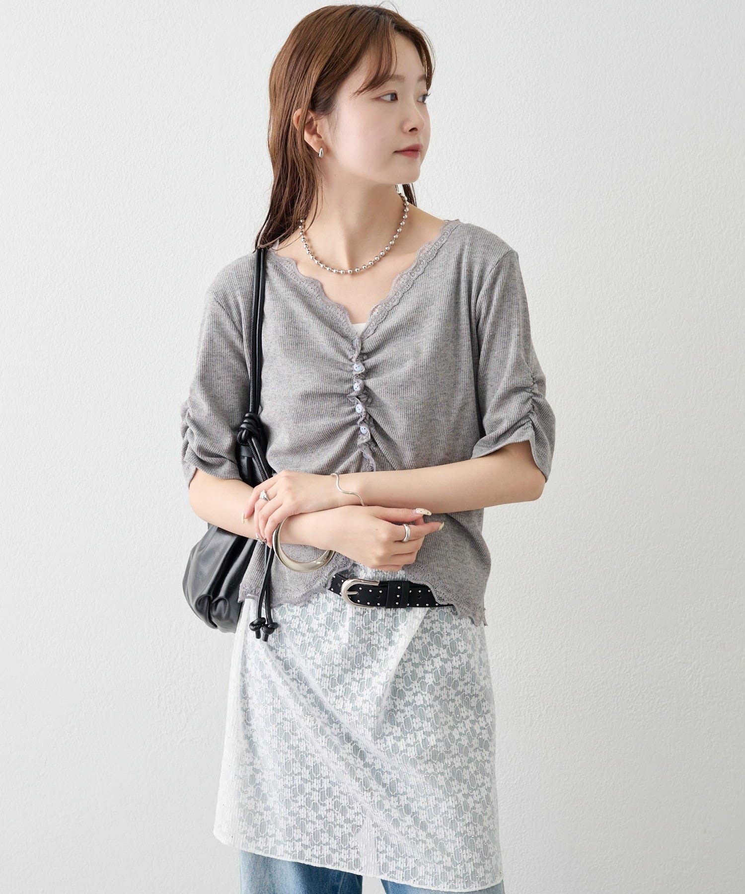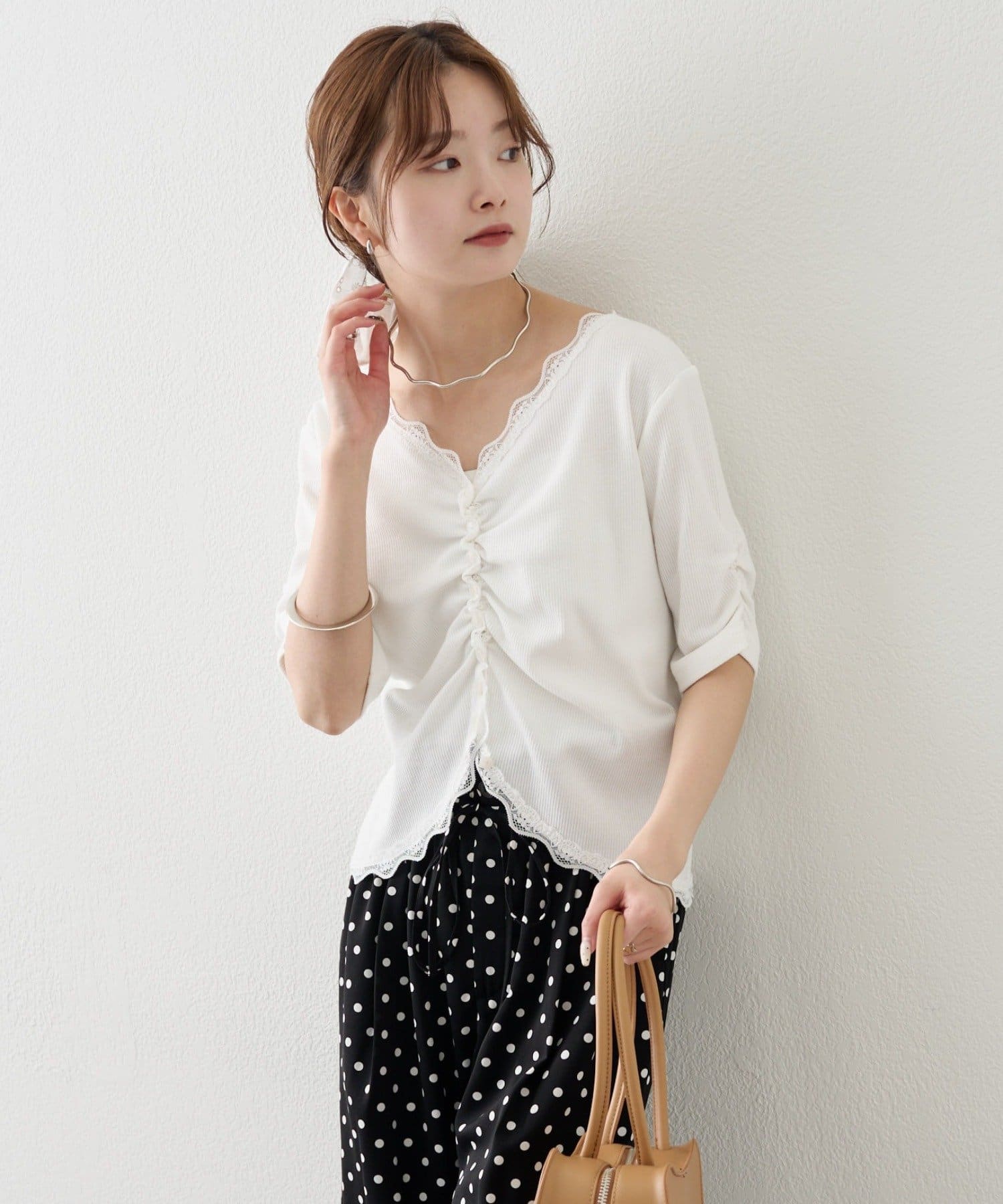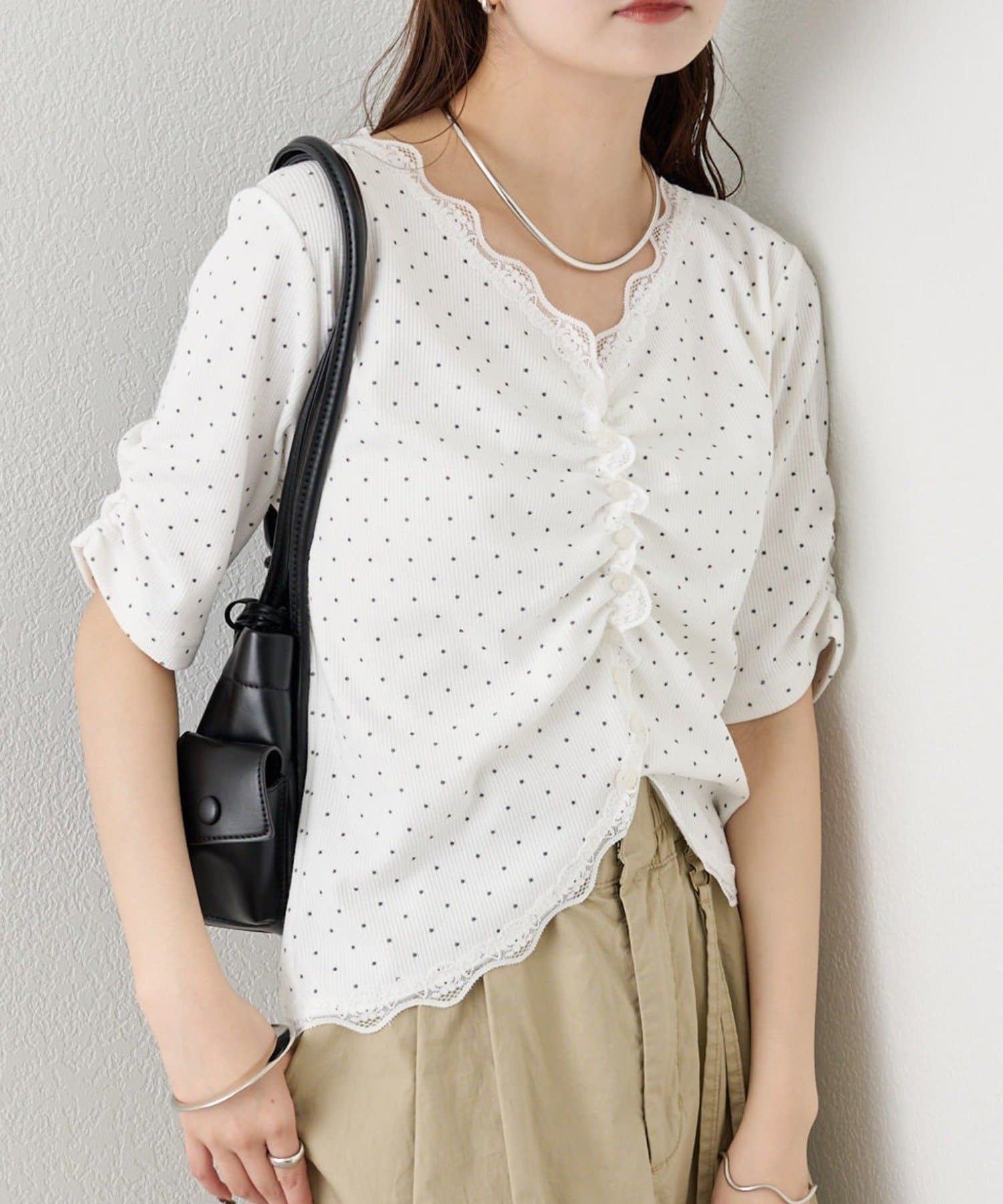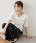 ・フロントに施されたギャザーデザインが、立体感と女性らしさを演出。
