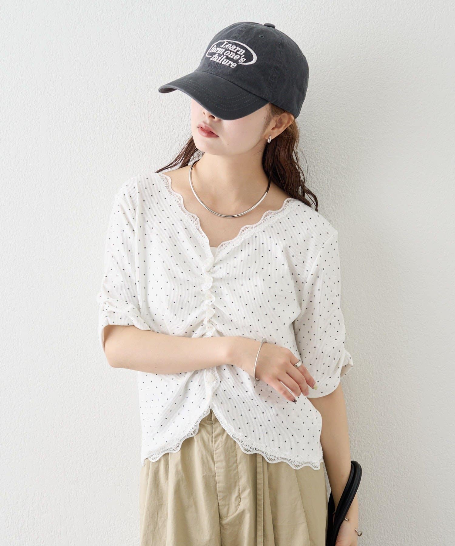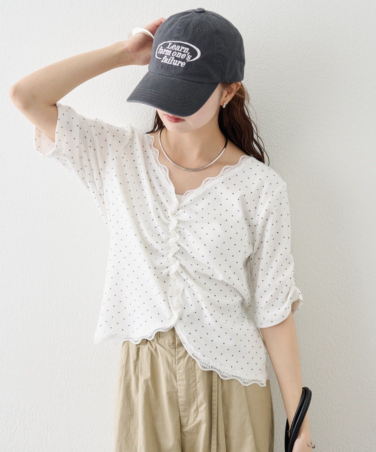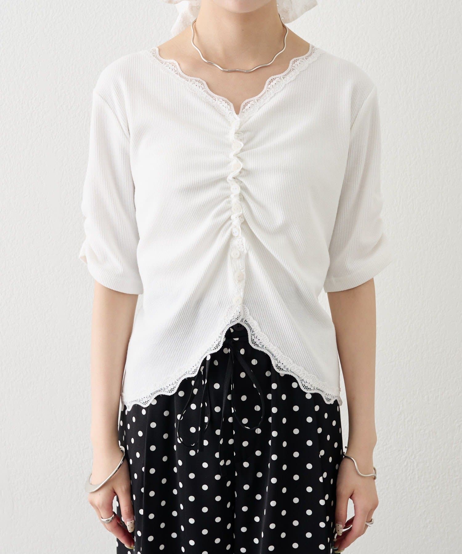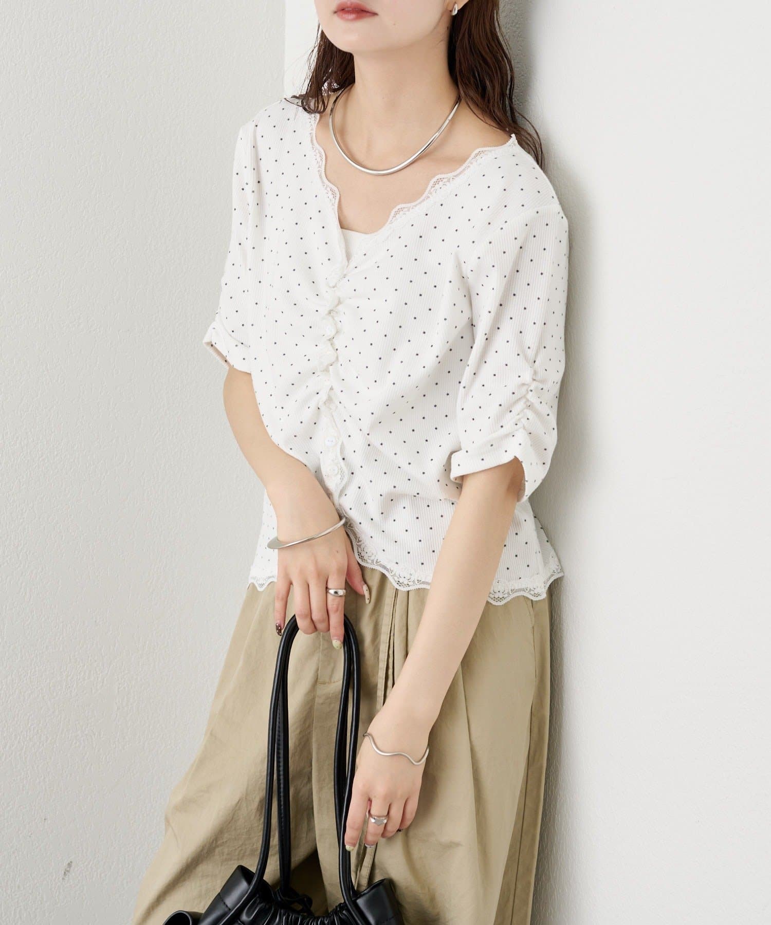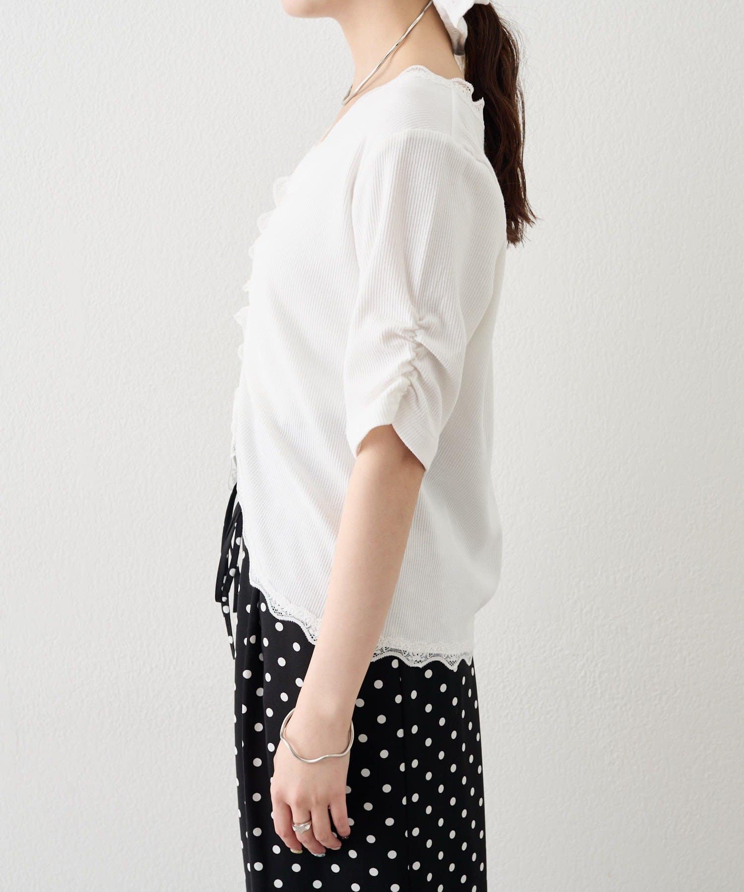 ・フロントに施されたギャザーデザインが、立体感と女性らしさを演出。