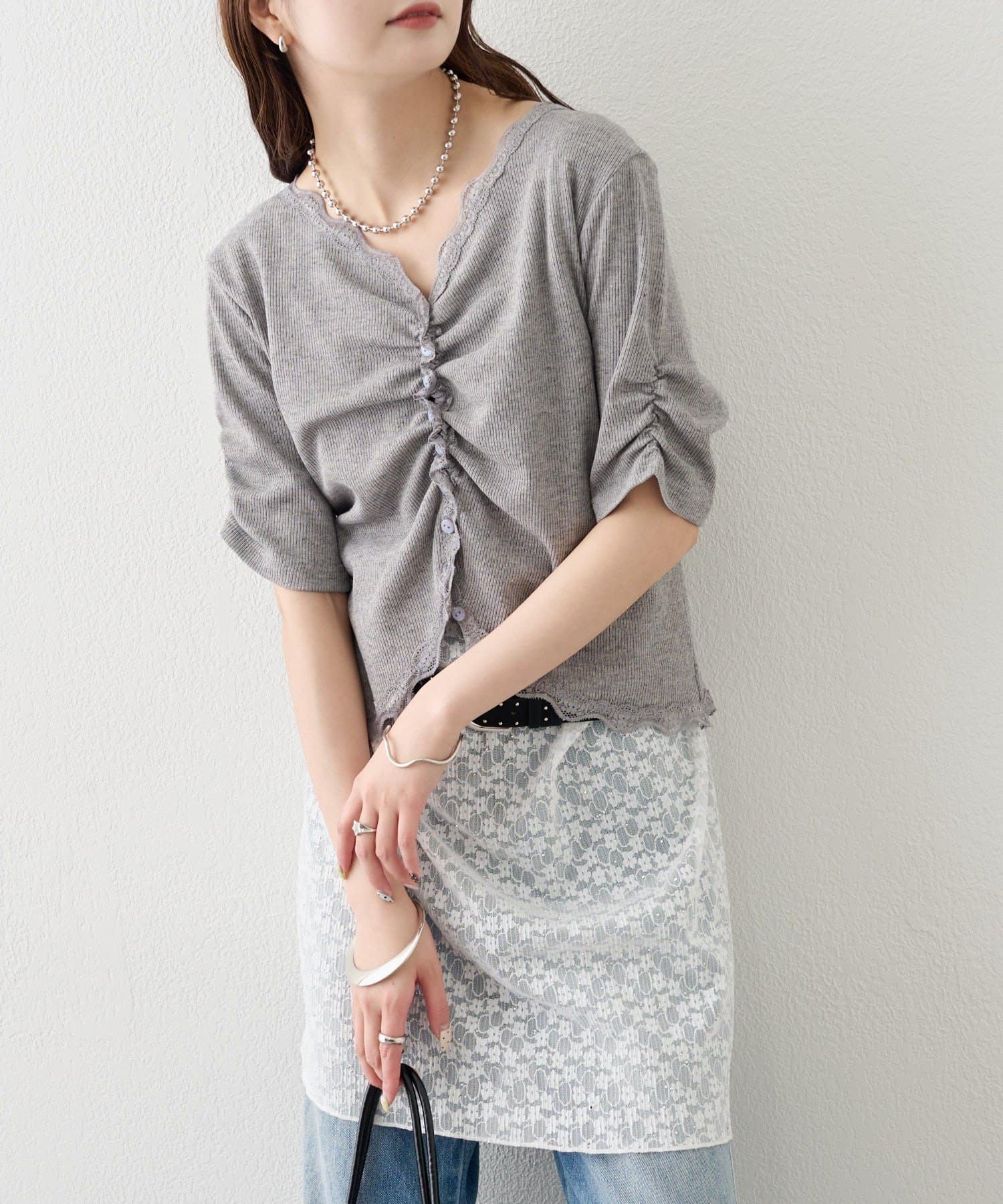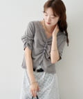 一枚で着映えする、フェミニンな半袖ギャザーリブカーディガン