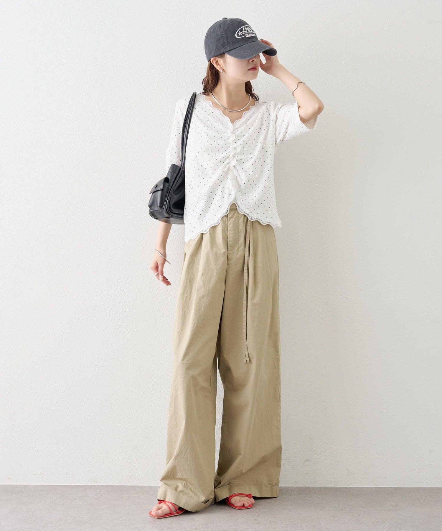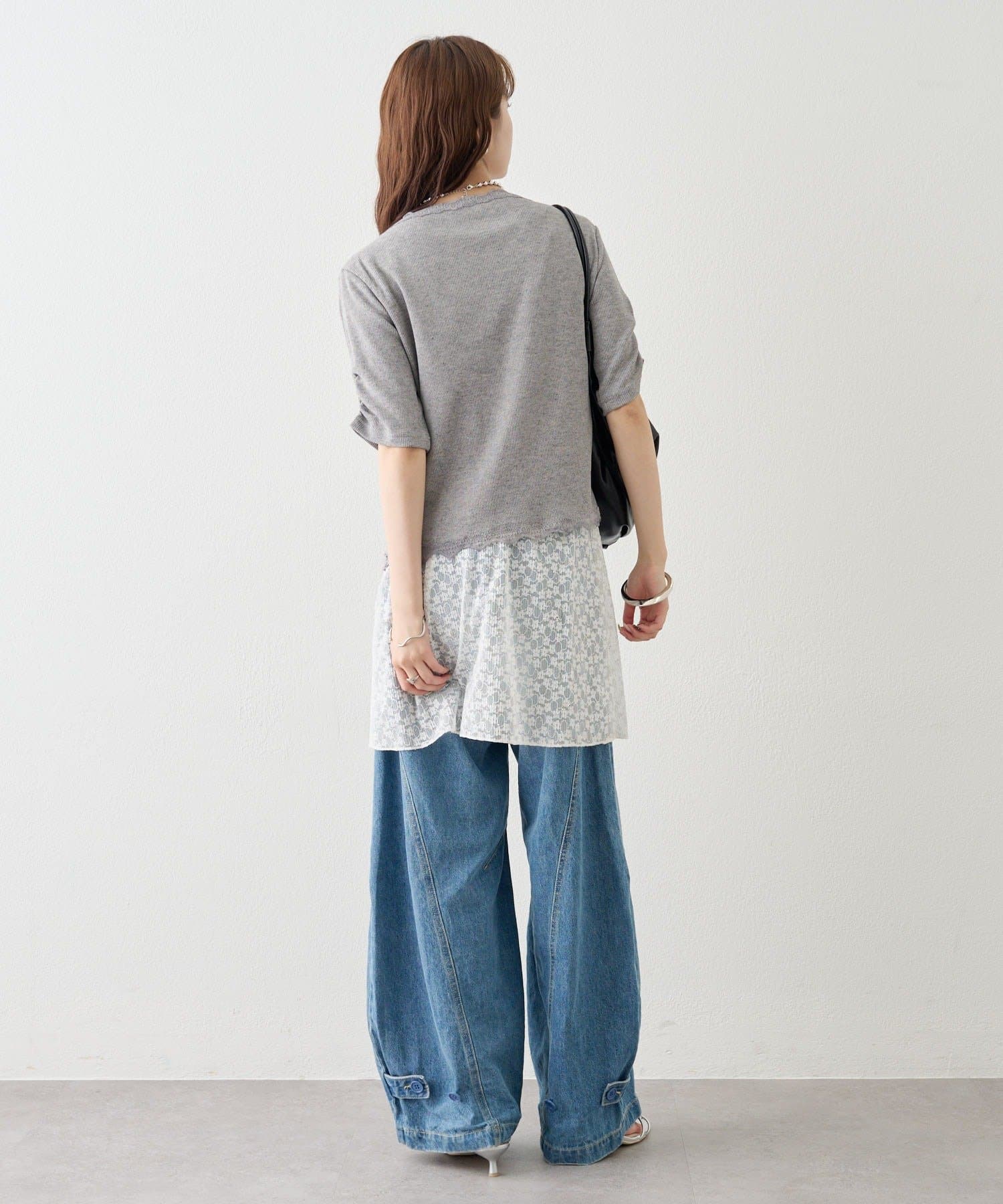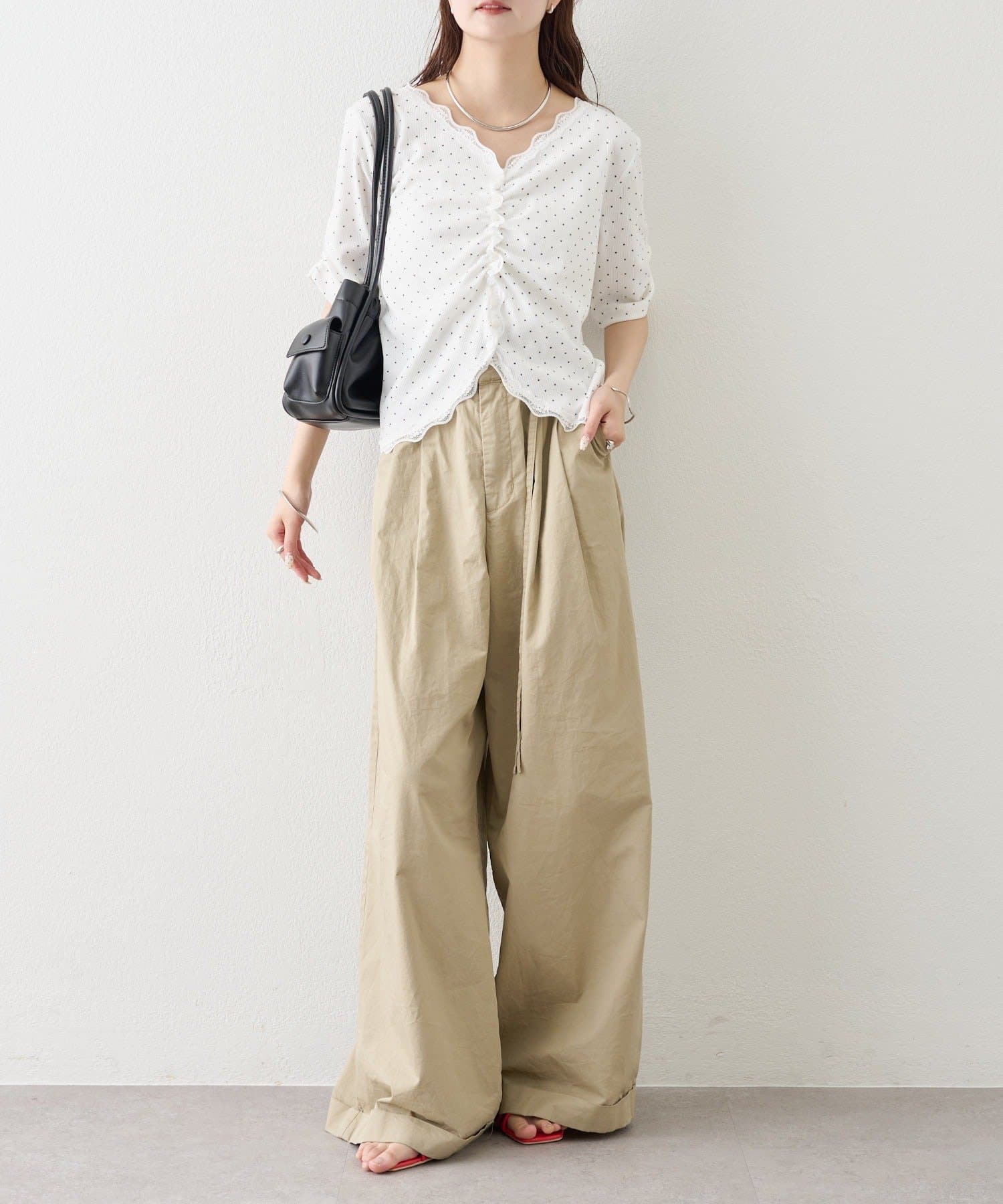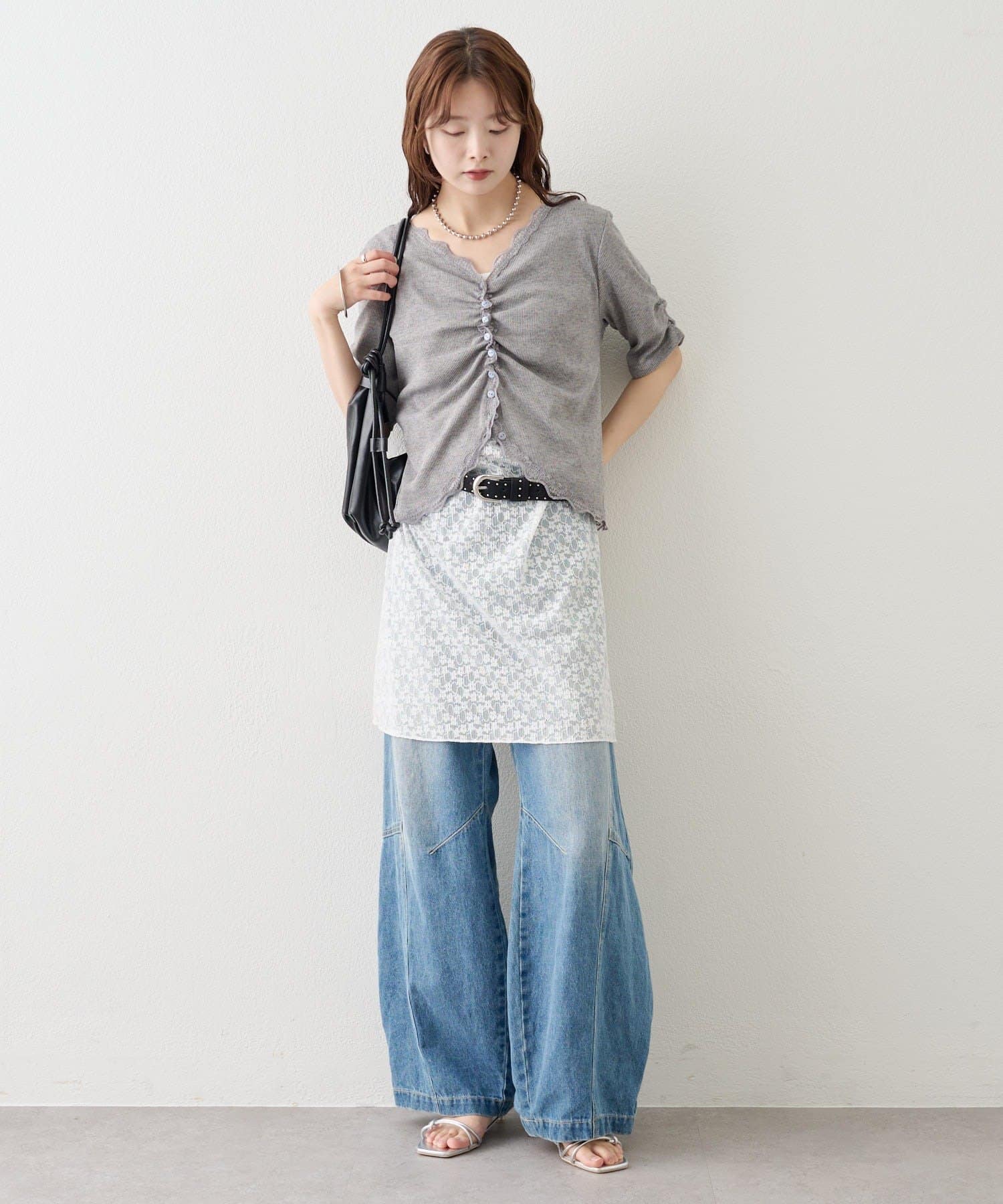 ・デニムやワイドパンツを合わせて、カジュアルフェミニンなスタイリングに。