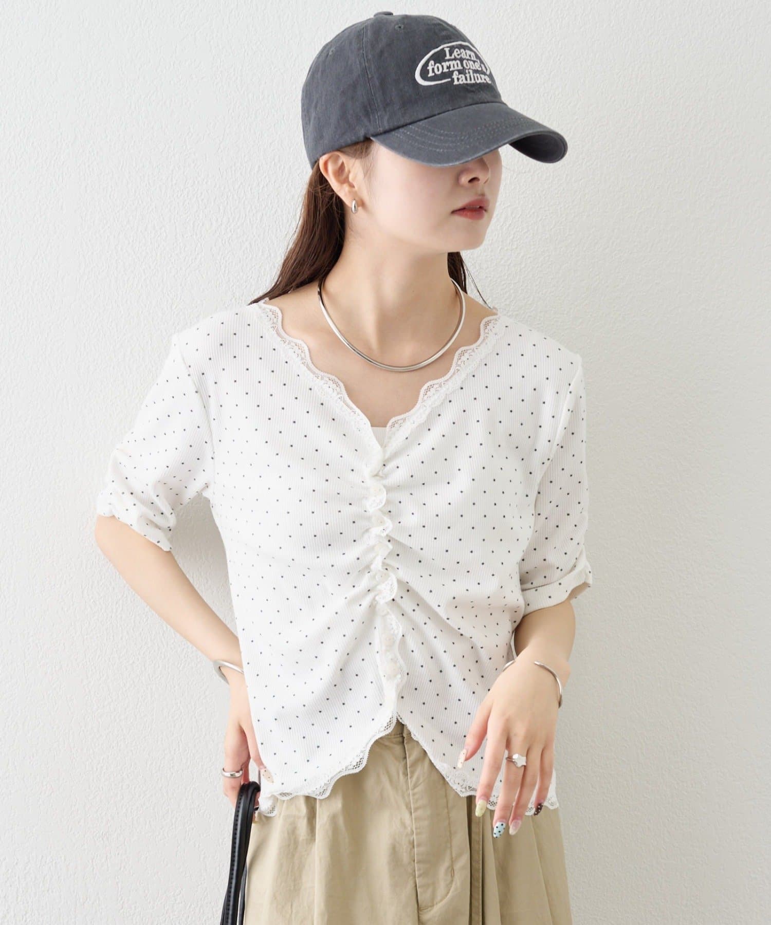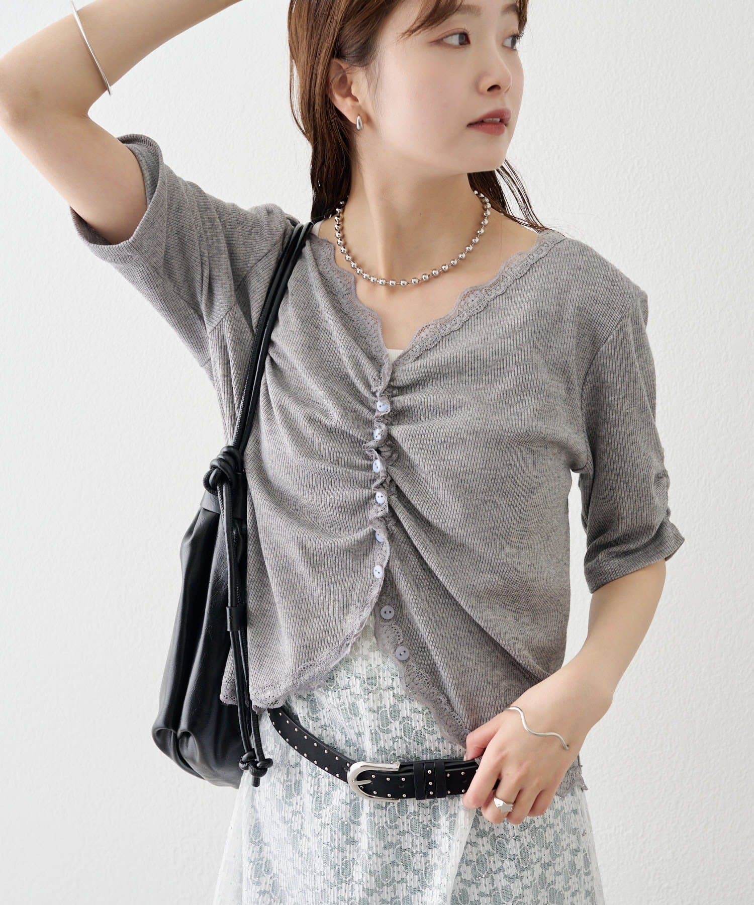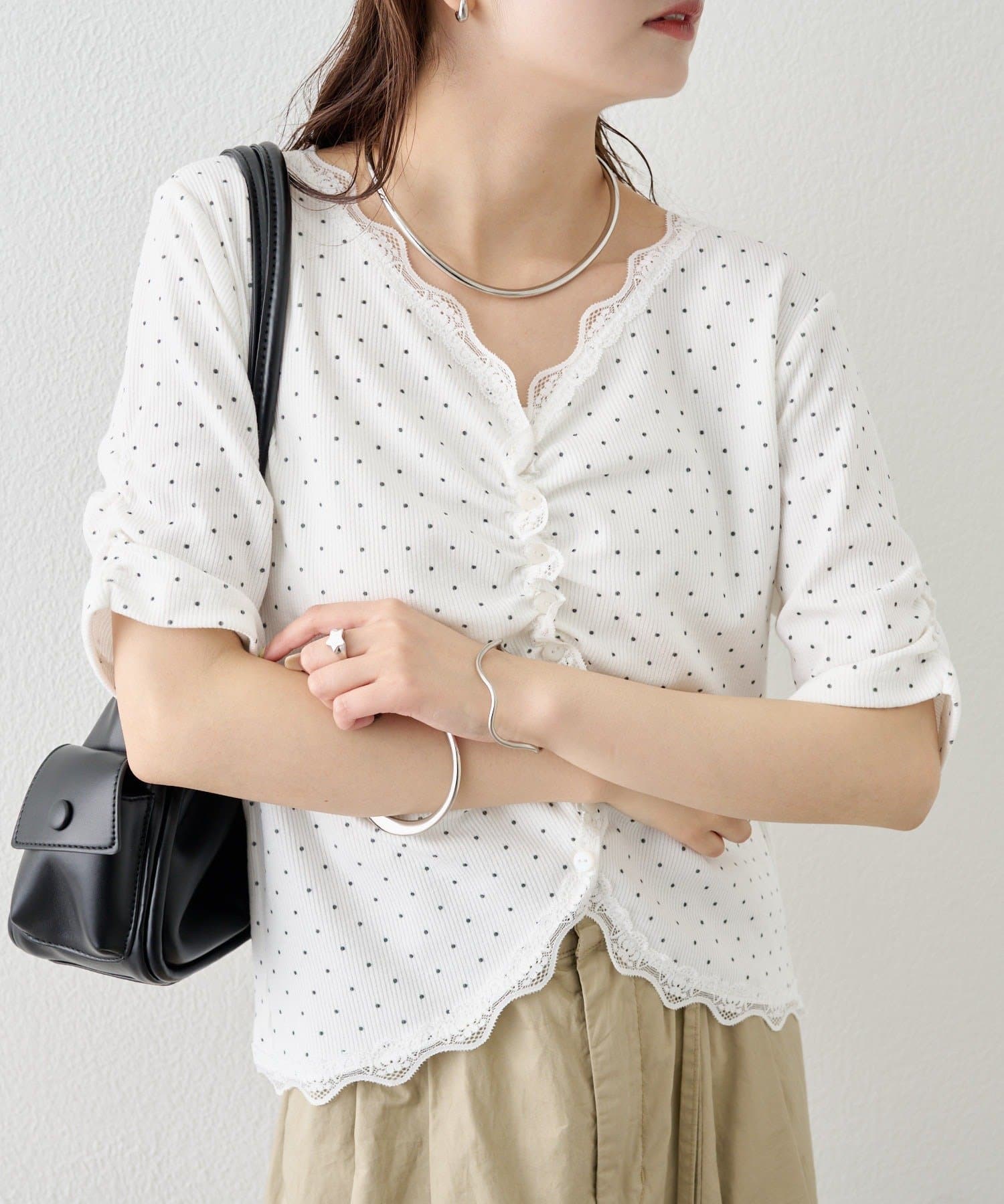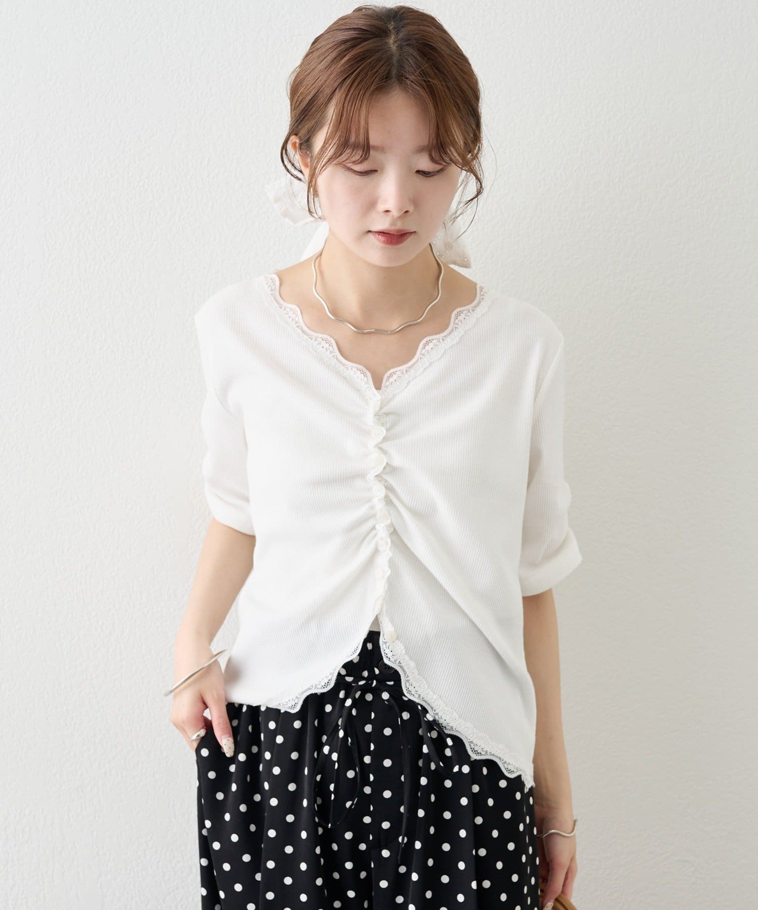 ・フロントボタンの開き具合を調節して、好みの抜け感をプラスします。