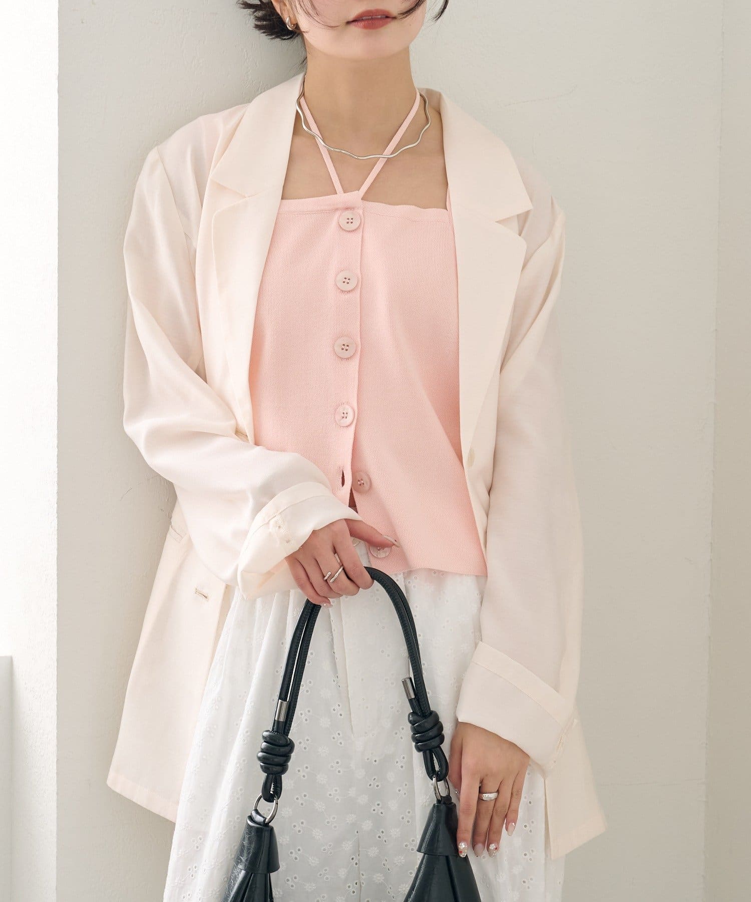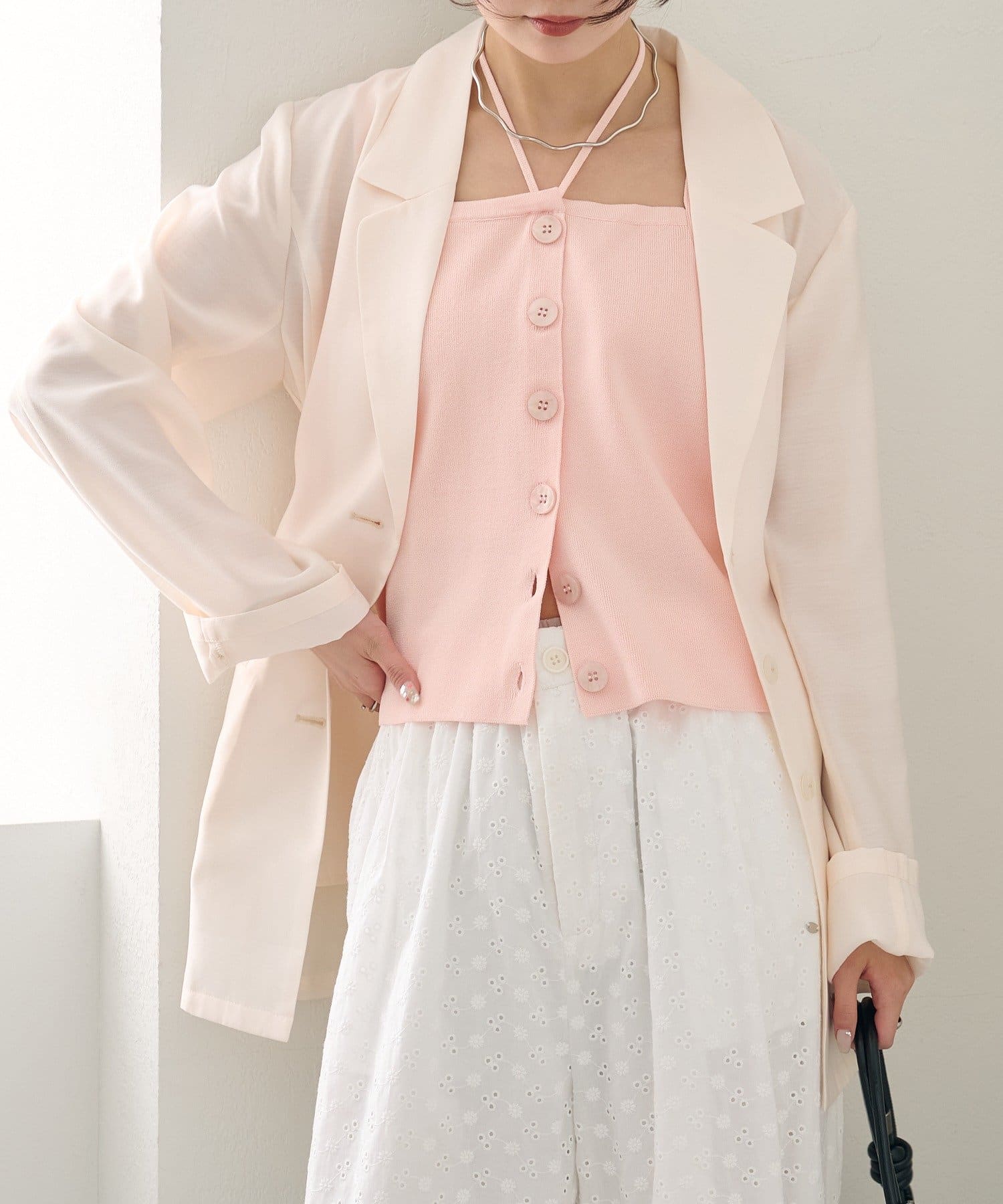 ・キャミワンピやスカートを合わせれば、女性らしい上品な着こなしに。