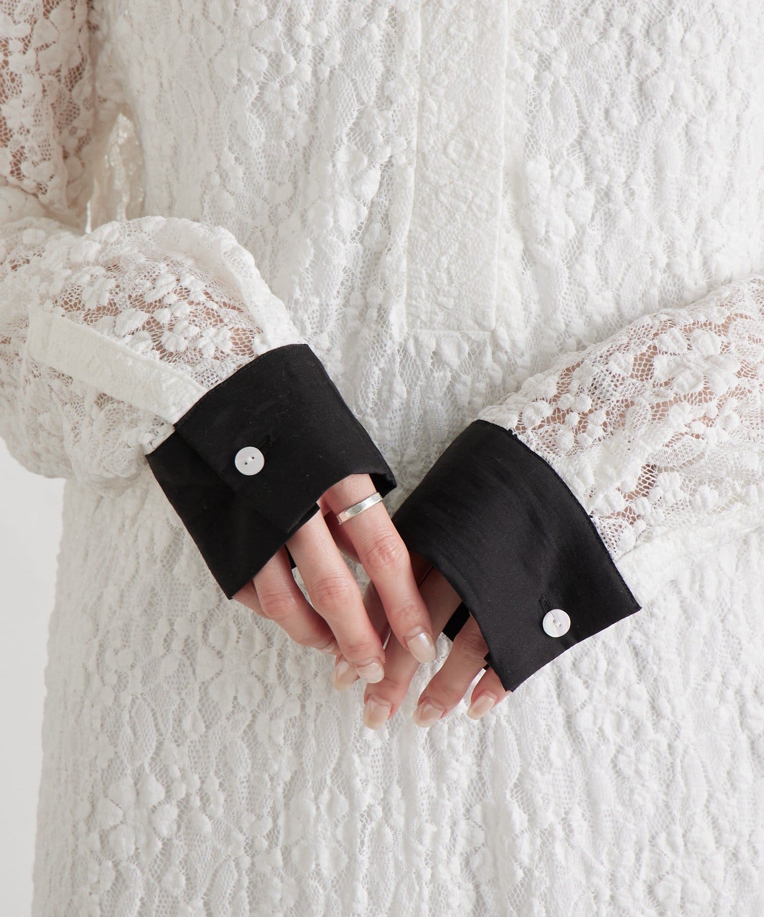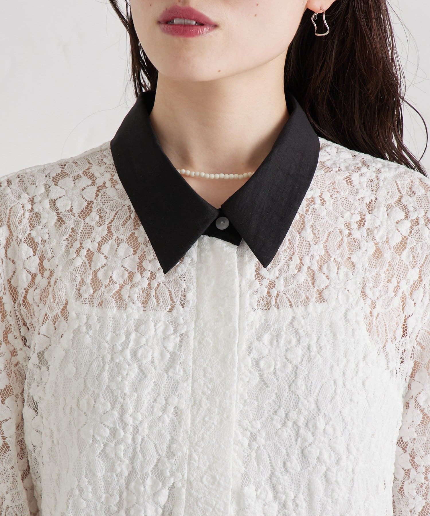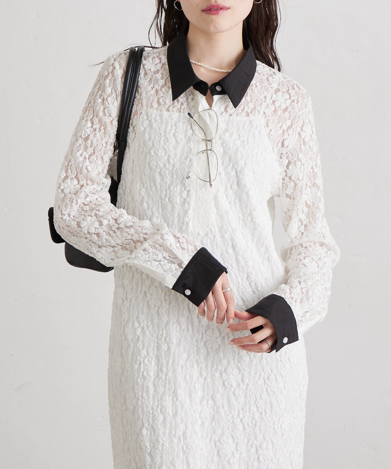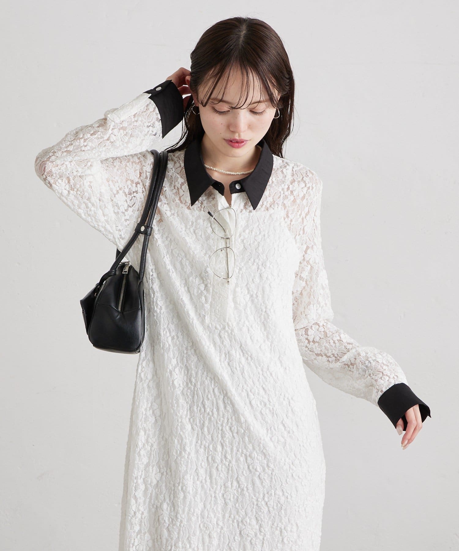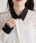 ・襟と袖口の配色デザインが、レースの甘さを引き締めクラシカルで大人っぽい印象に。