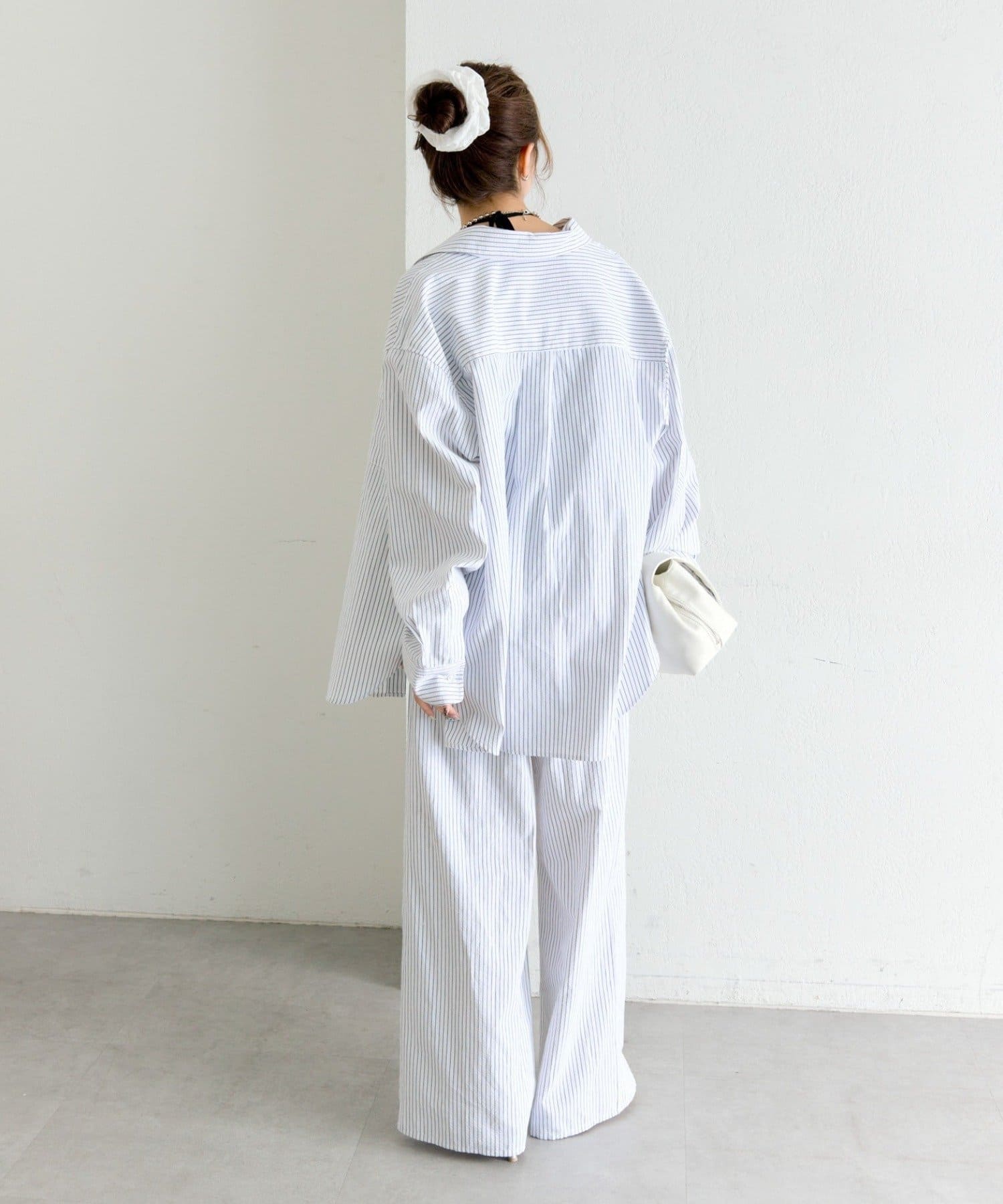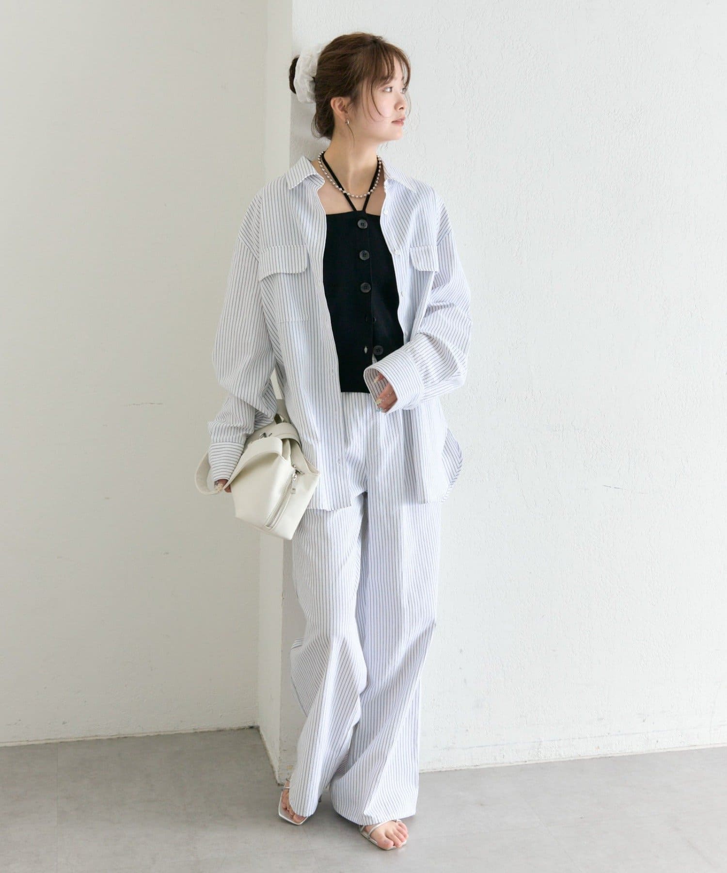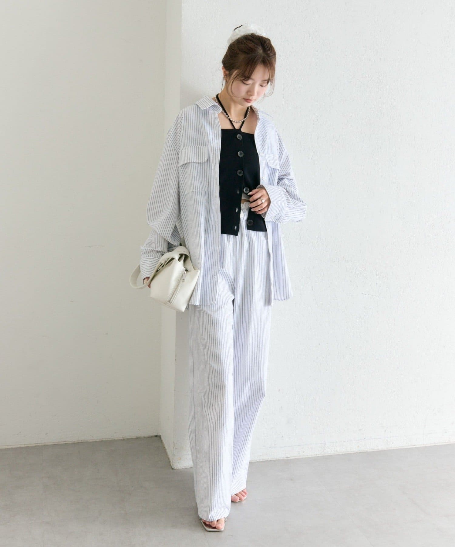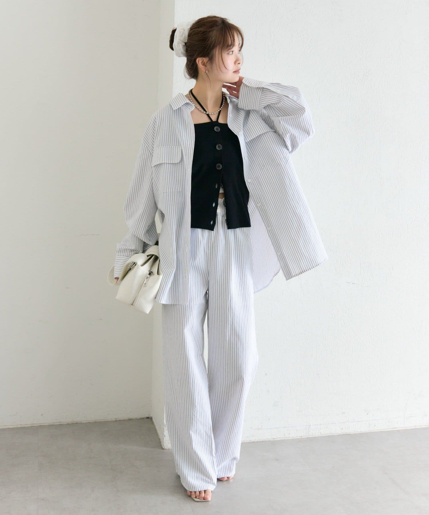 ・同素材のストライプBIGシャツとのセットアップスタイルもおすすめです。