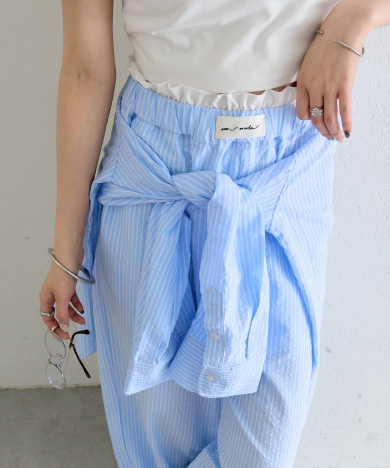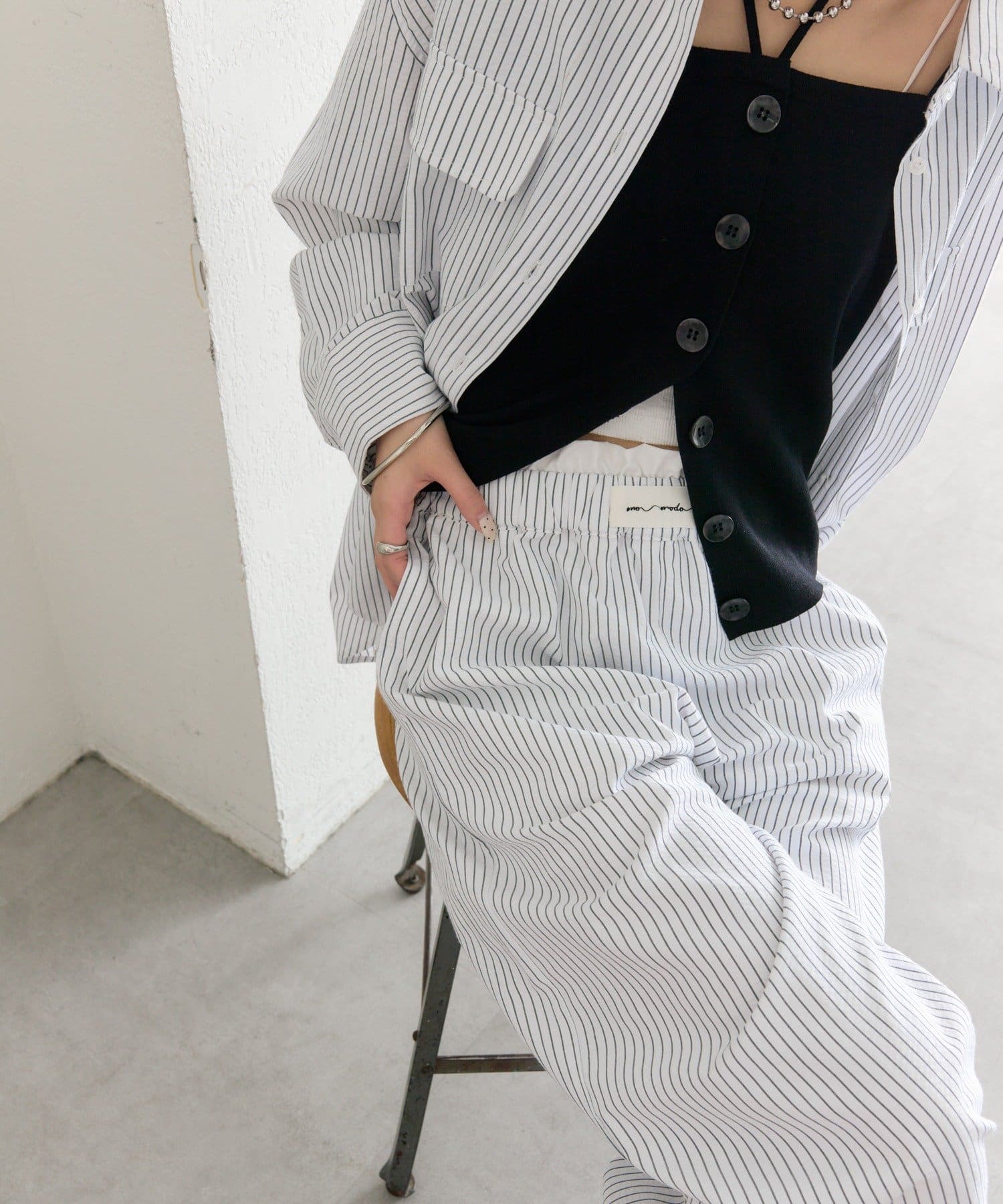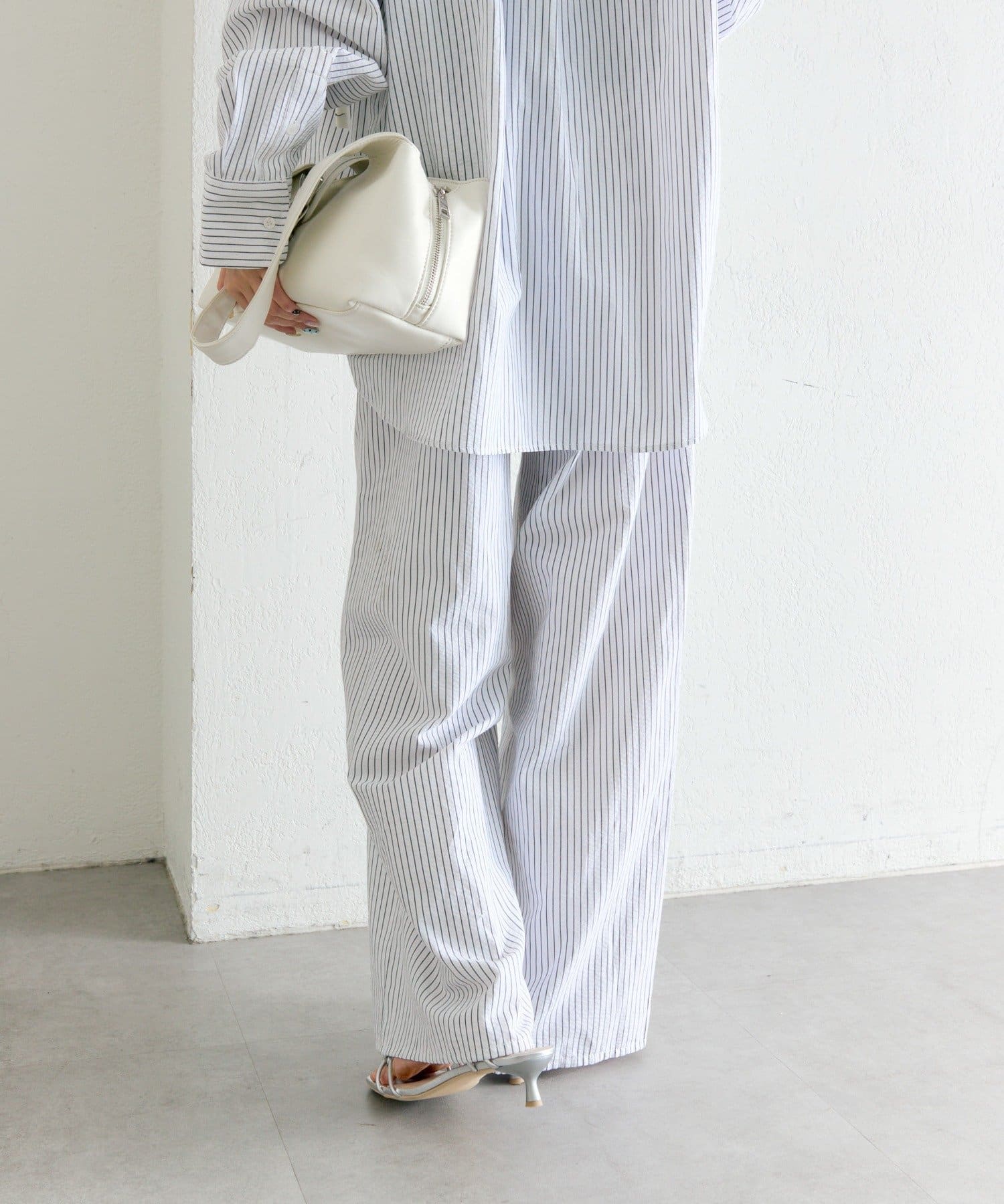 ・同素材のストライプBIGシャツとのセットアップスタイルもおすすめです。