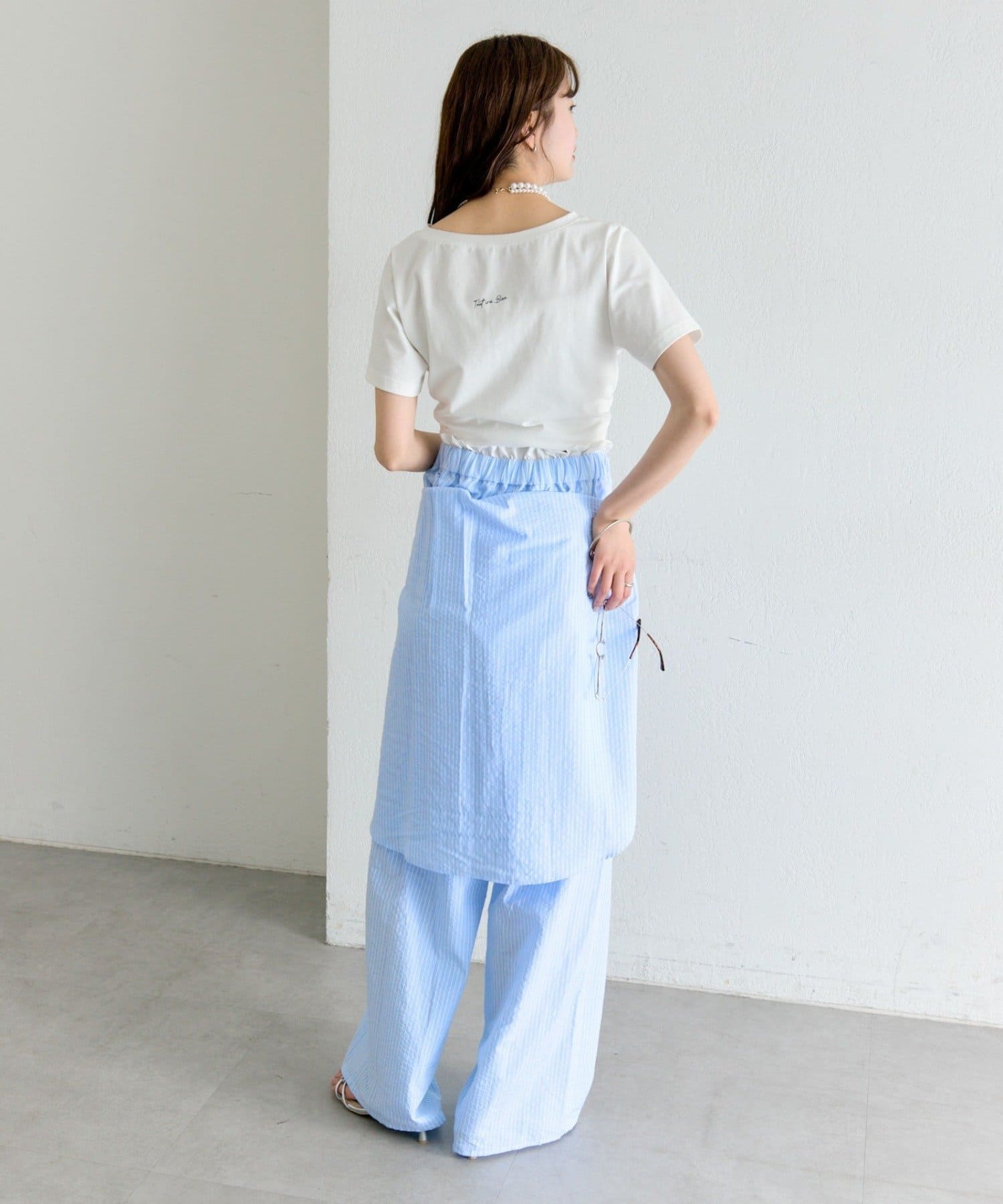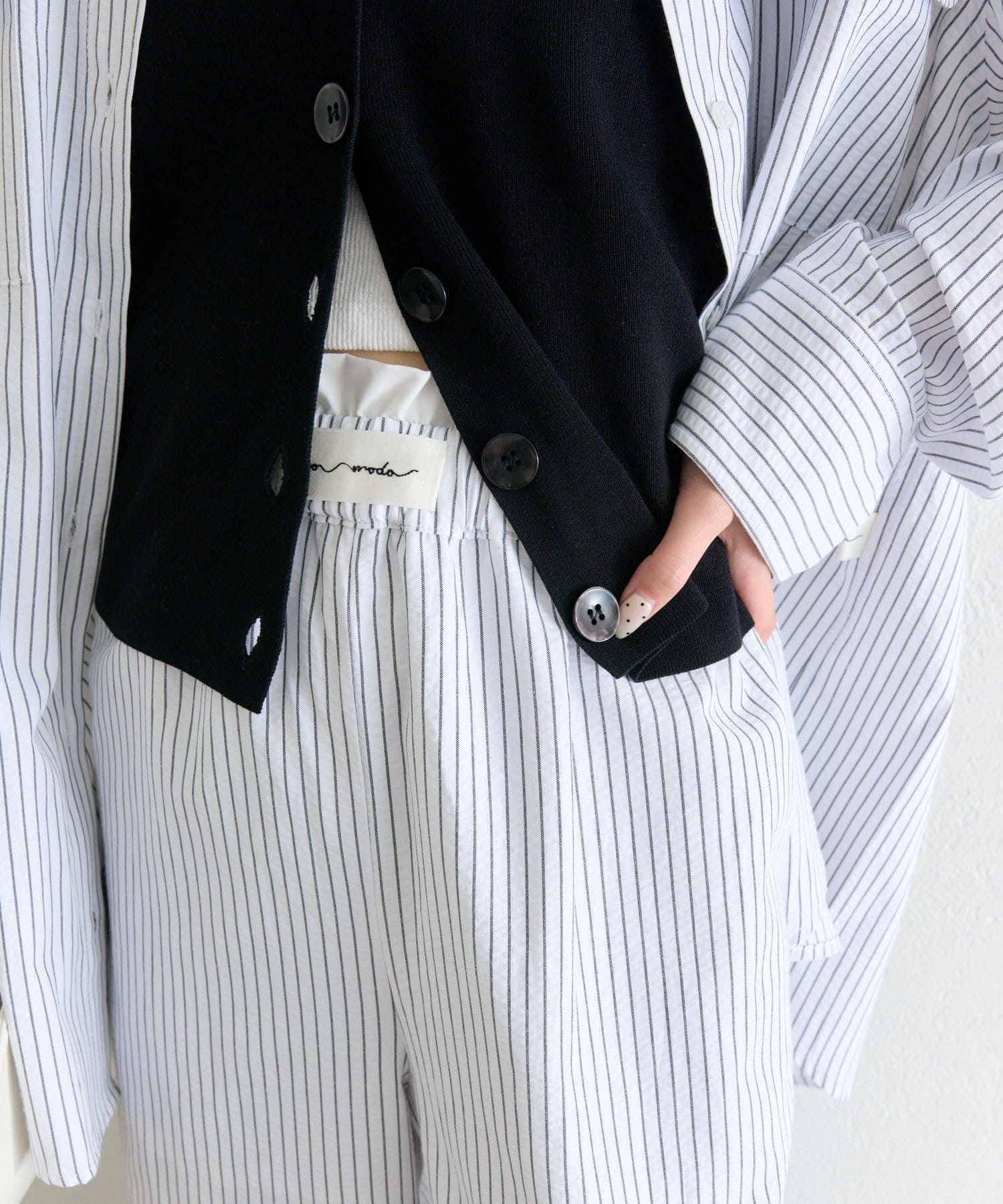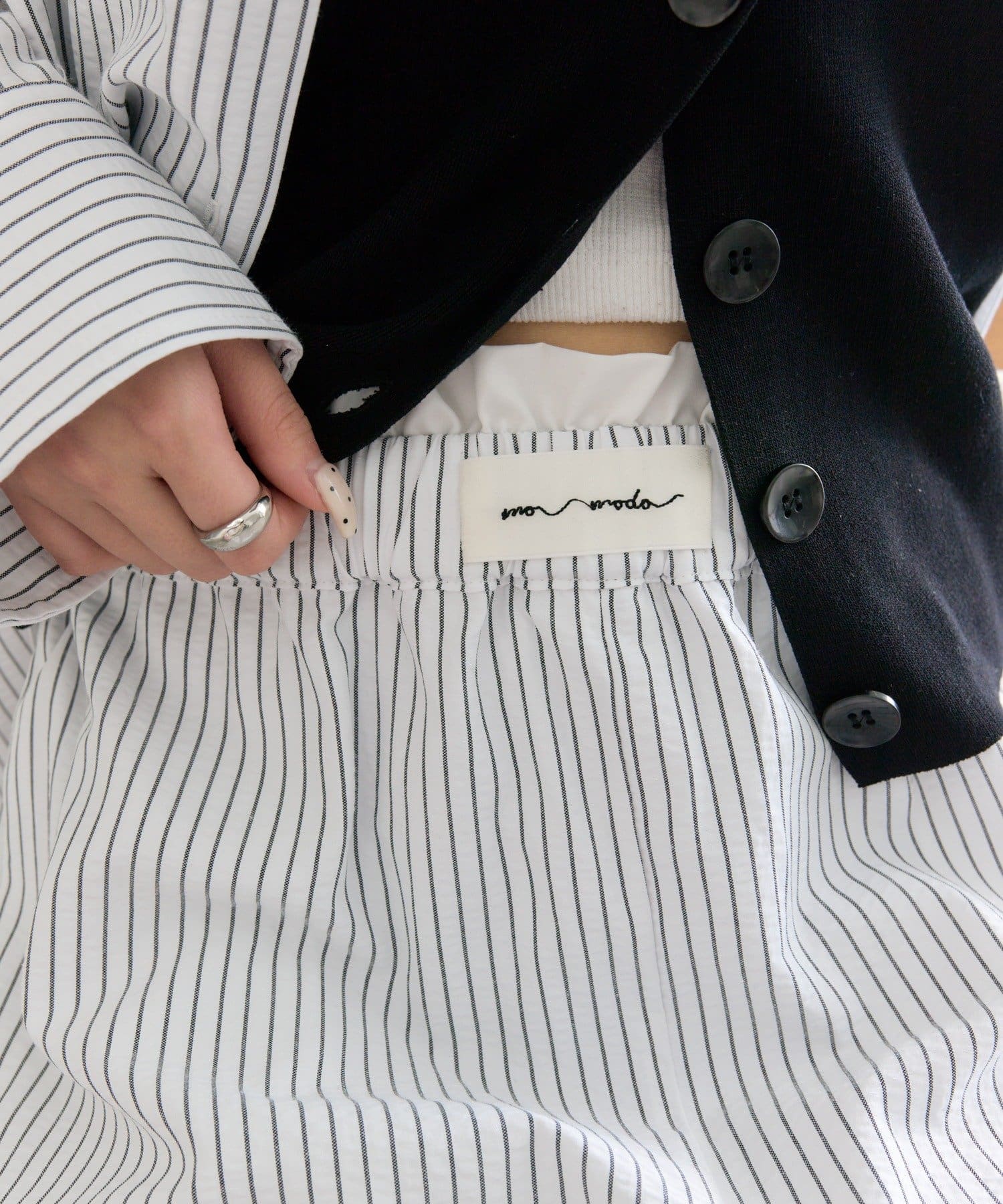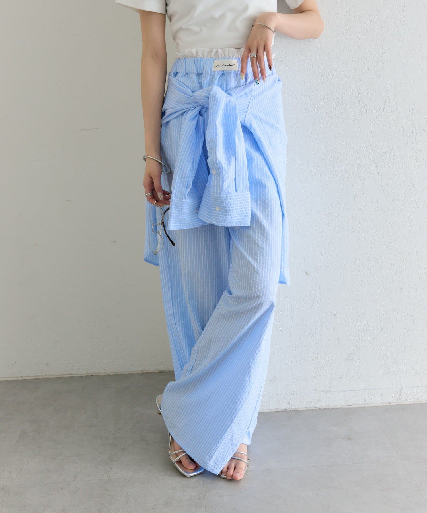 ・同素材のストライプBIGシャツとのセットアップスタイルもおすすめです。