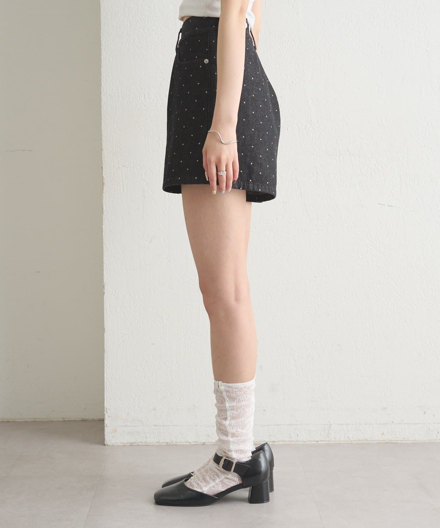 ・パンプス×ソックス合わせで、トレンド感のある着こなしに。