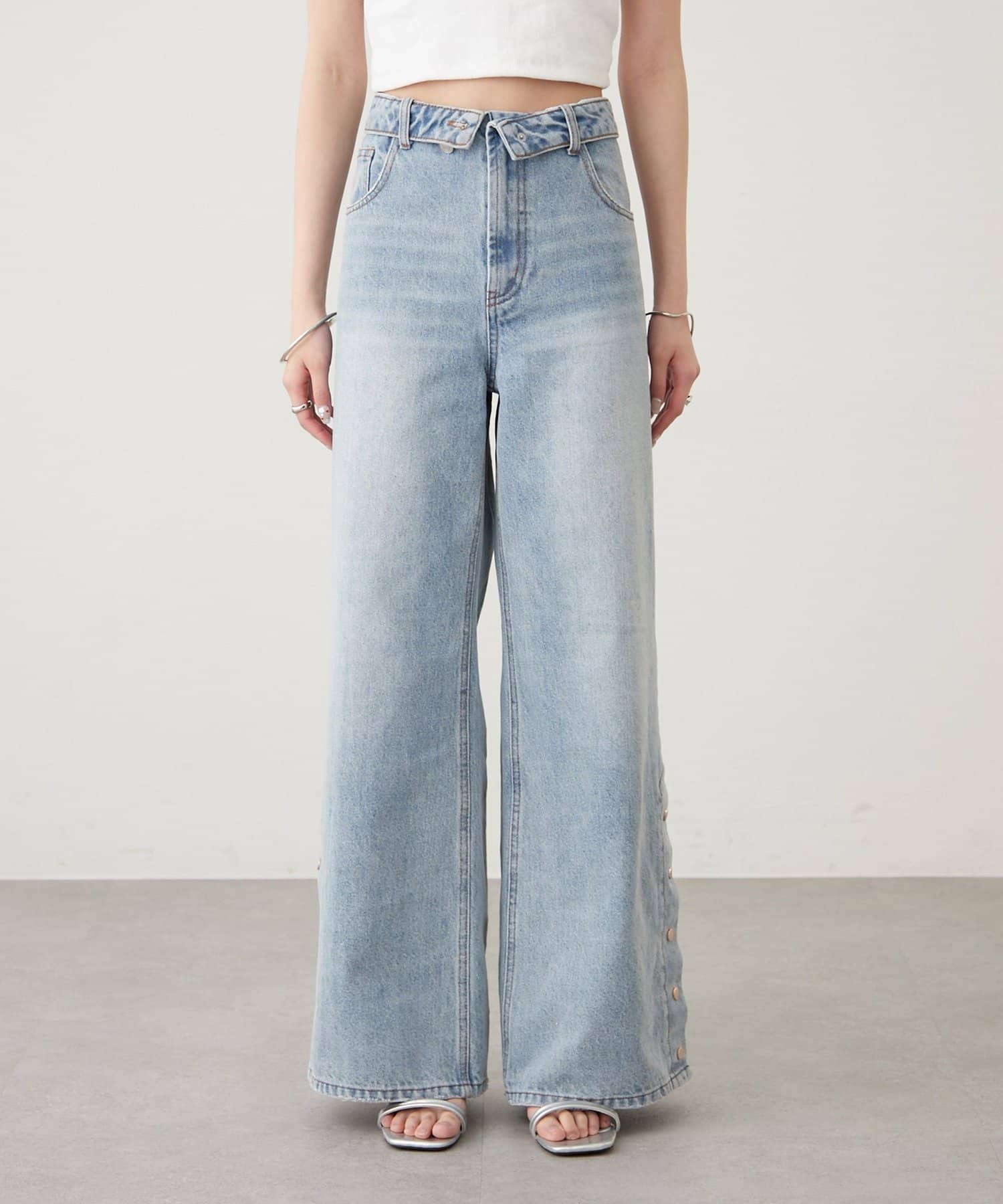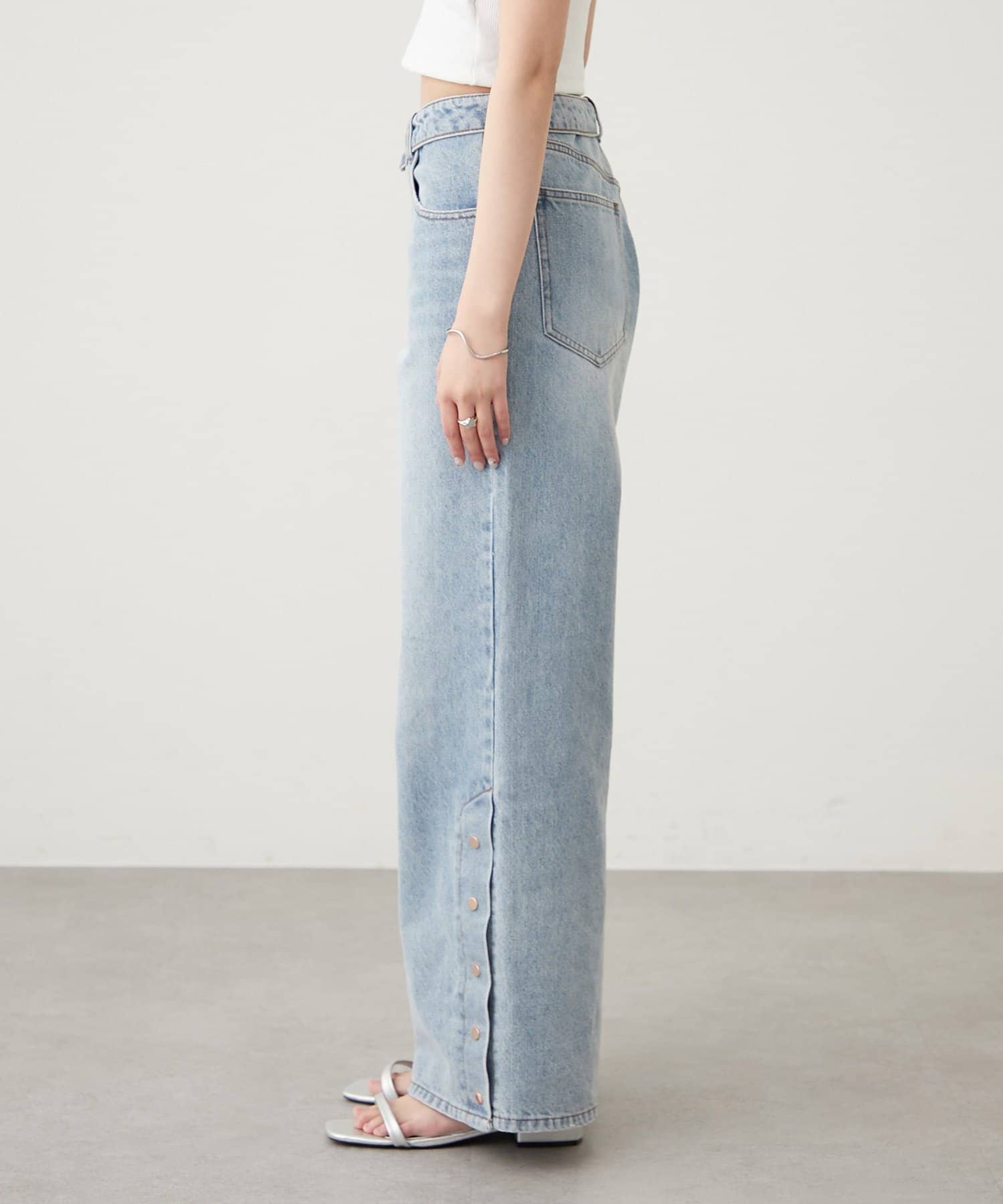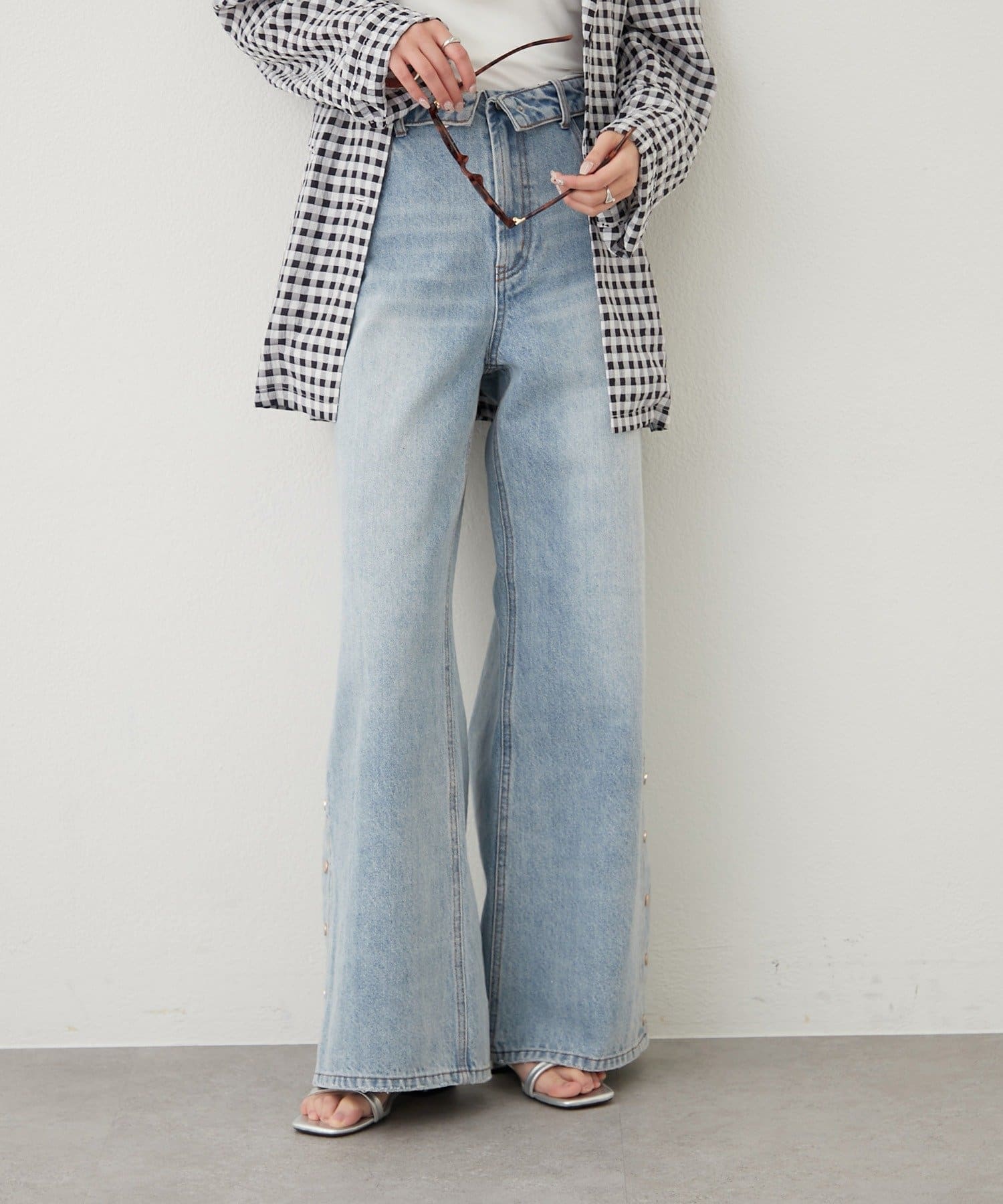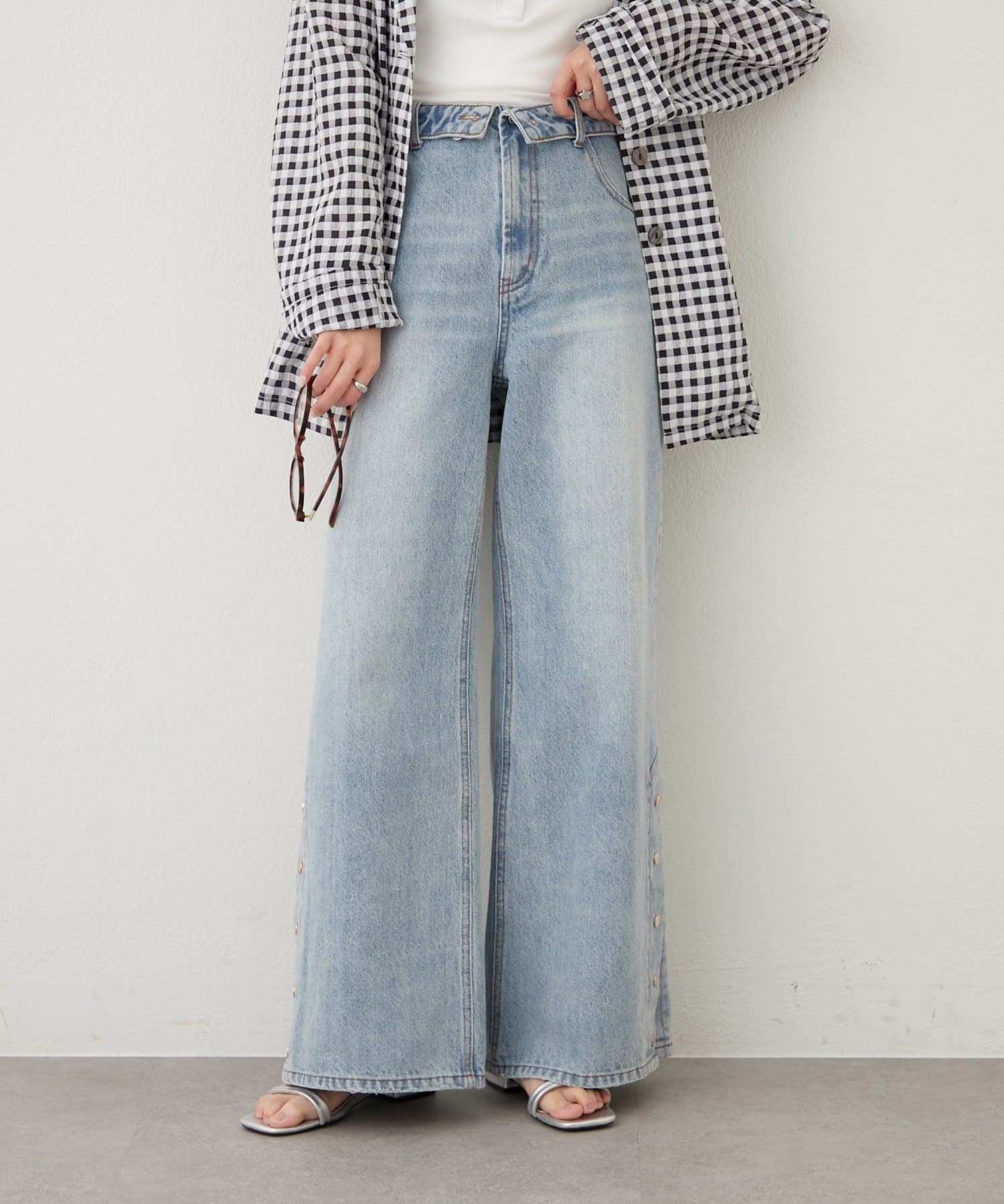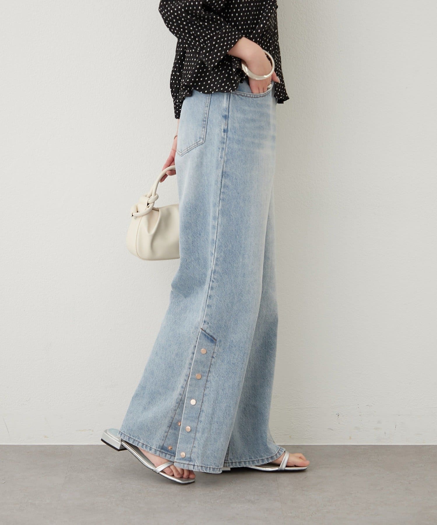 ・裾に施されたボタン×スリットデザインがポイントのフレアデニム。