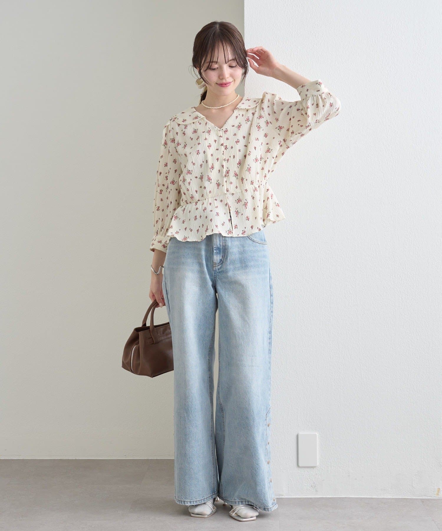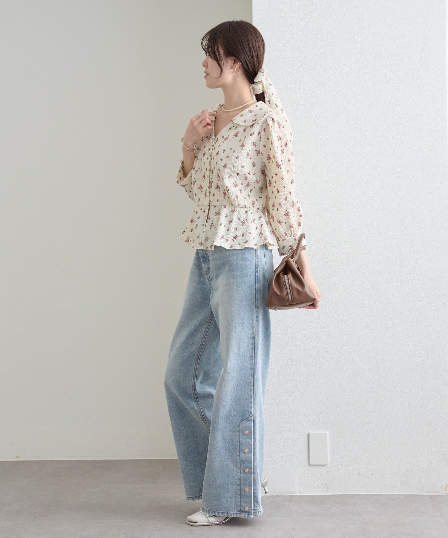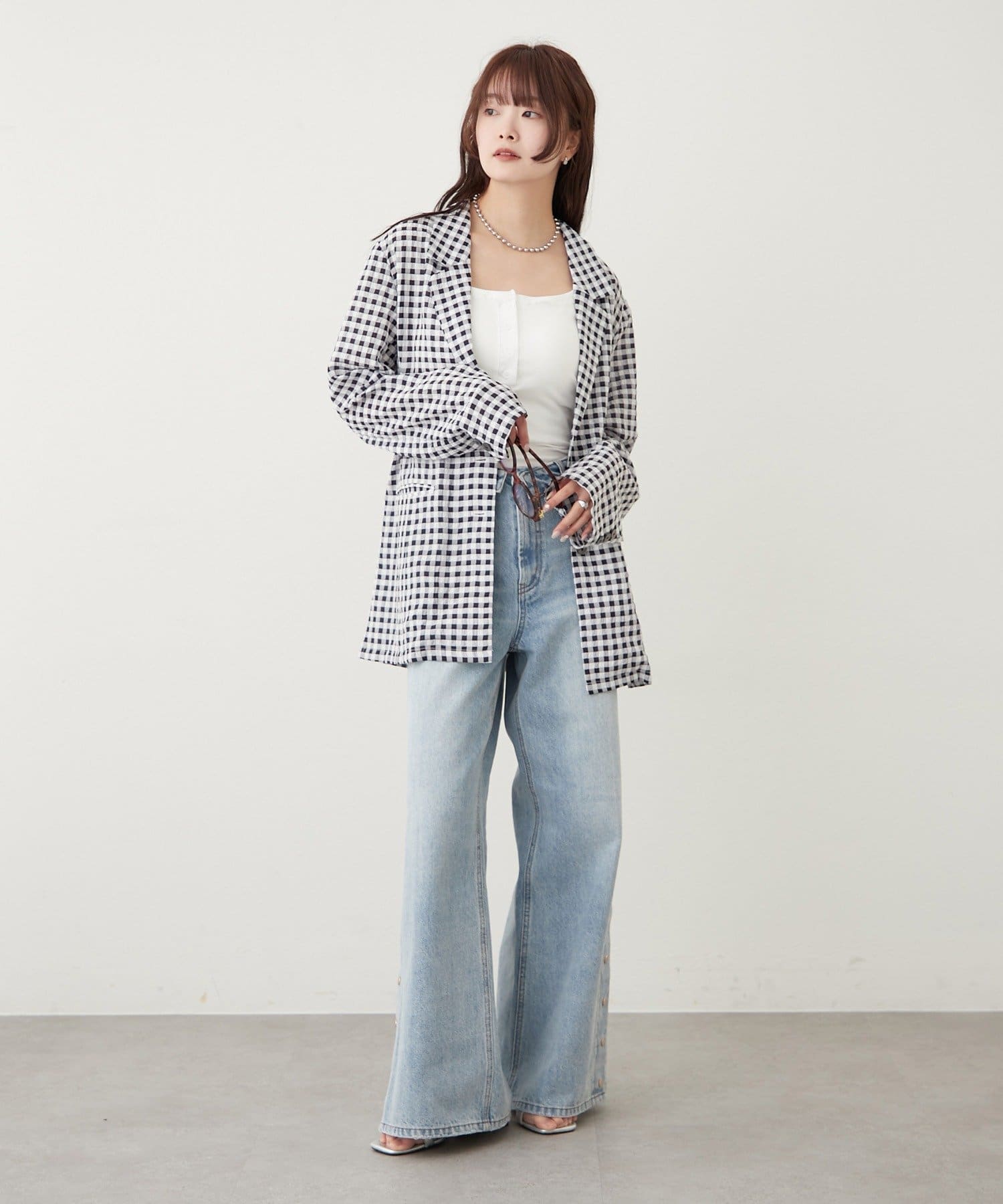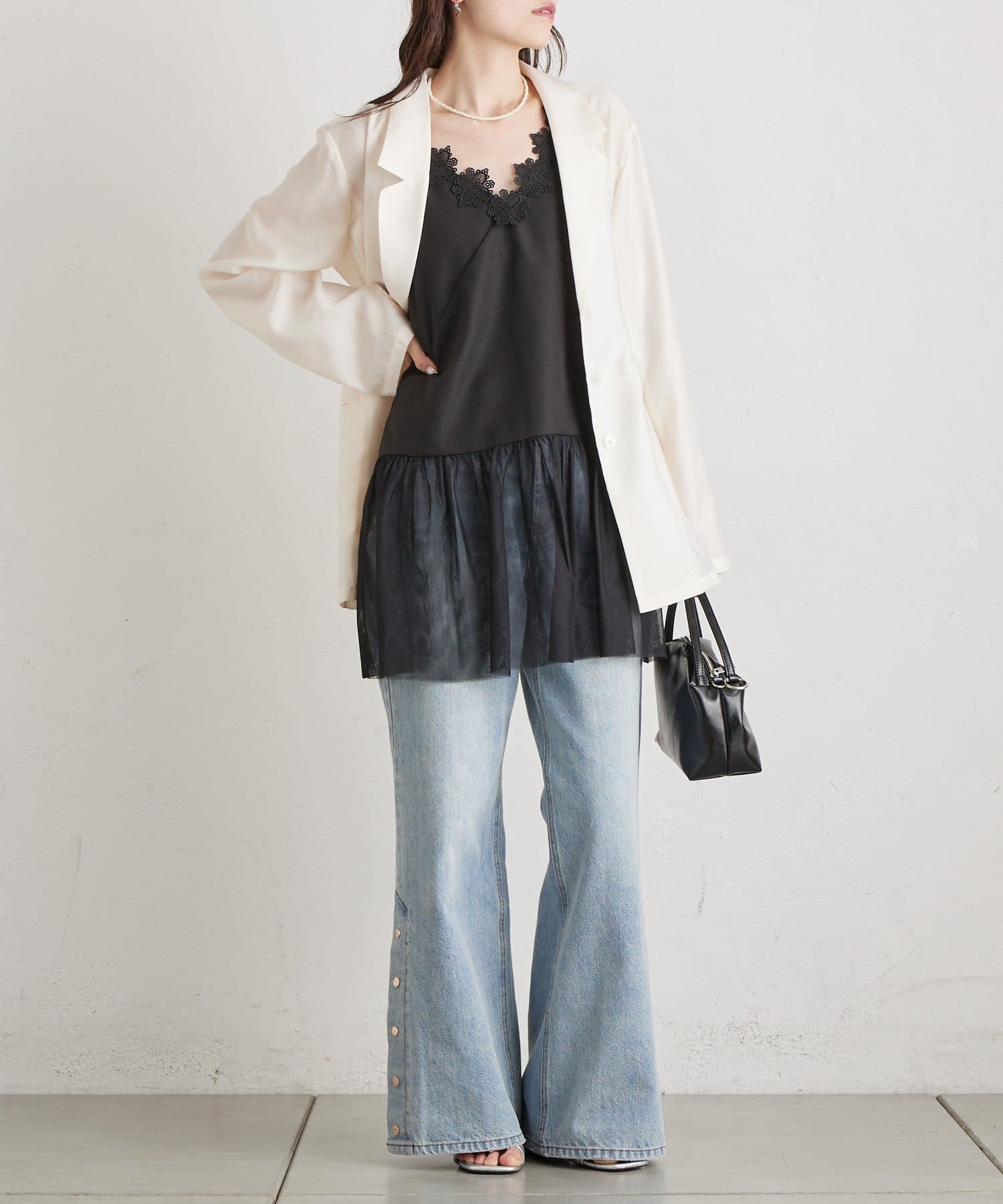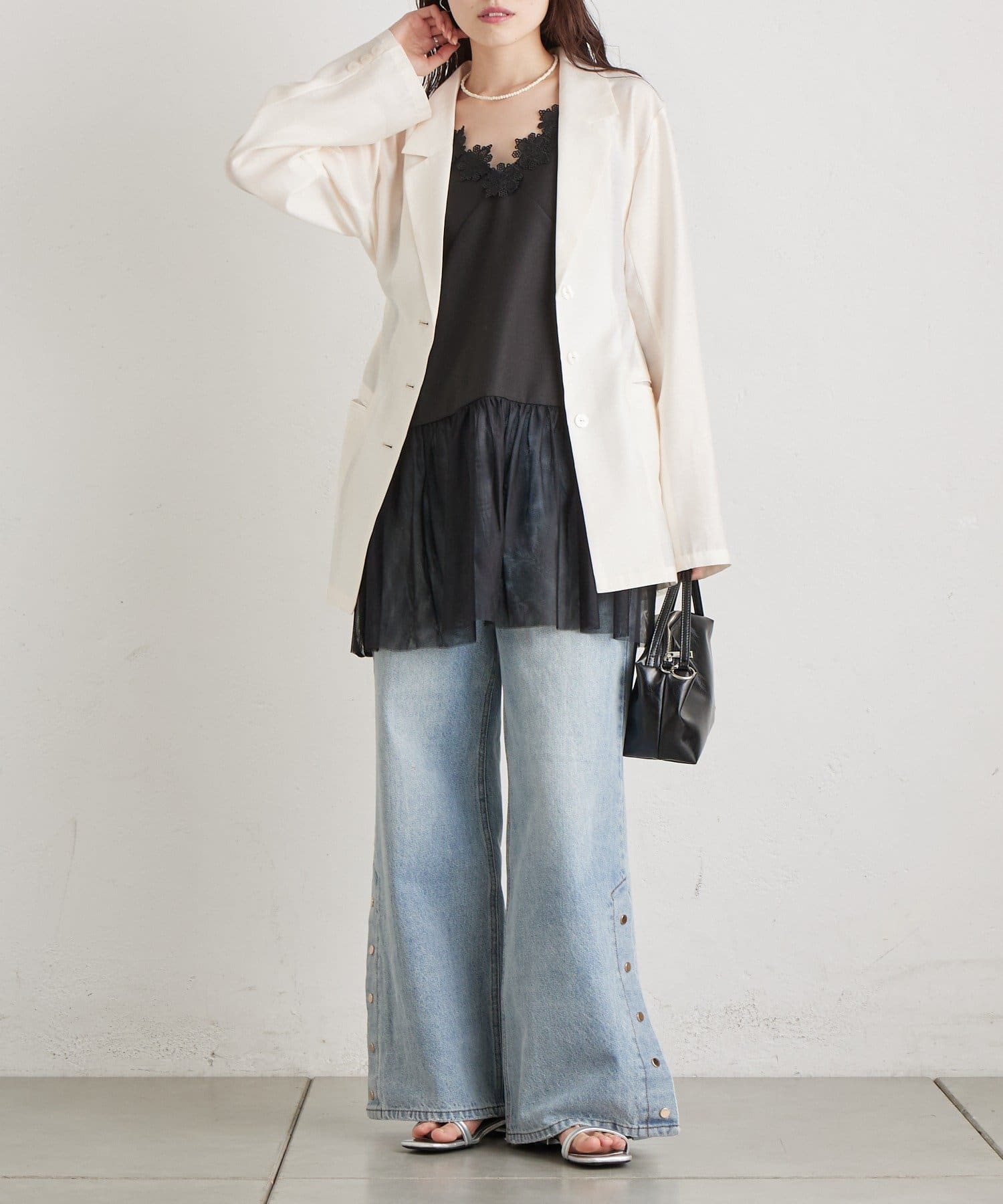・裾に施されたボタン×スリットデザインがポイントのフレアデニム。