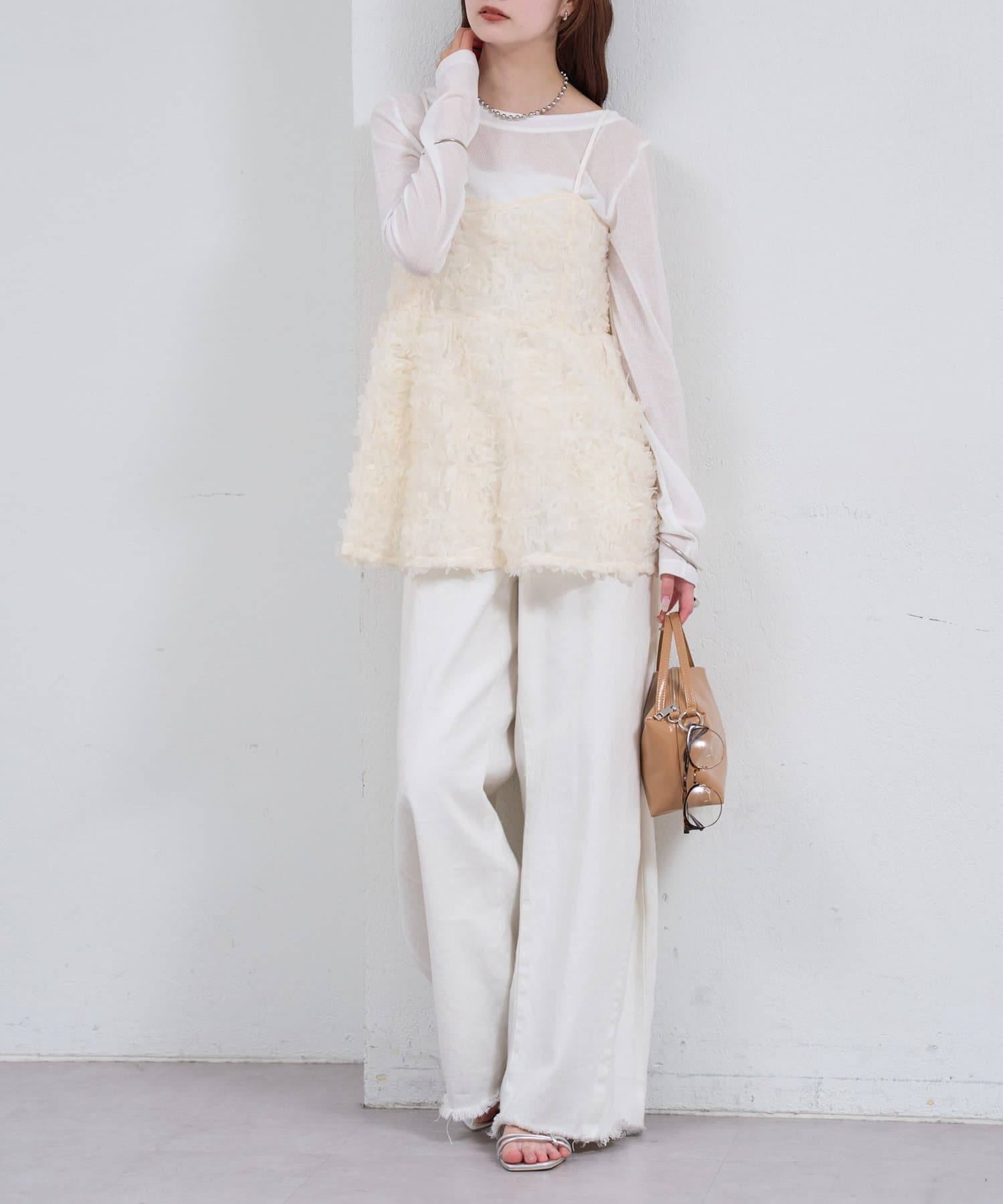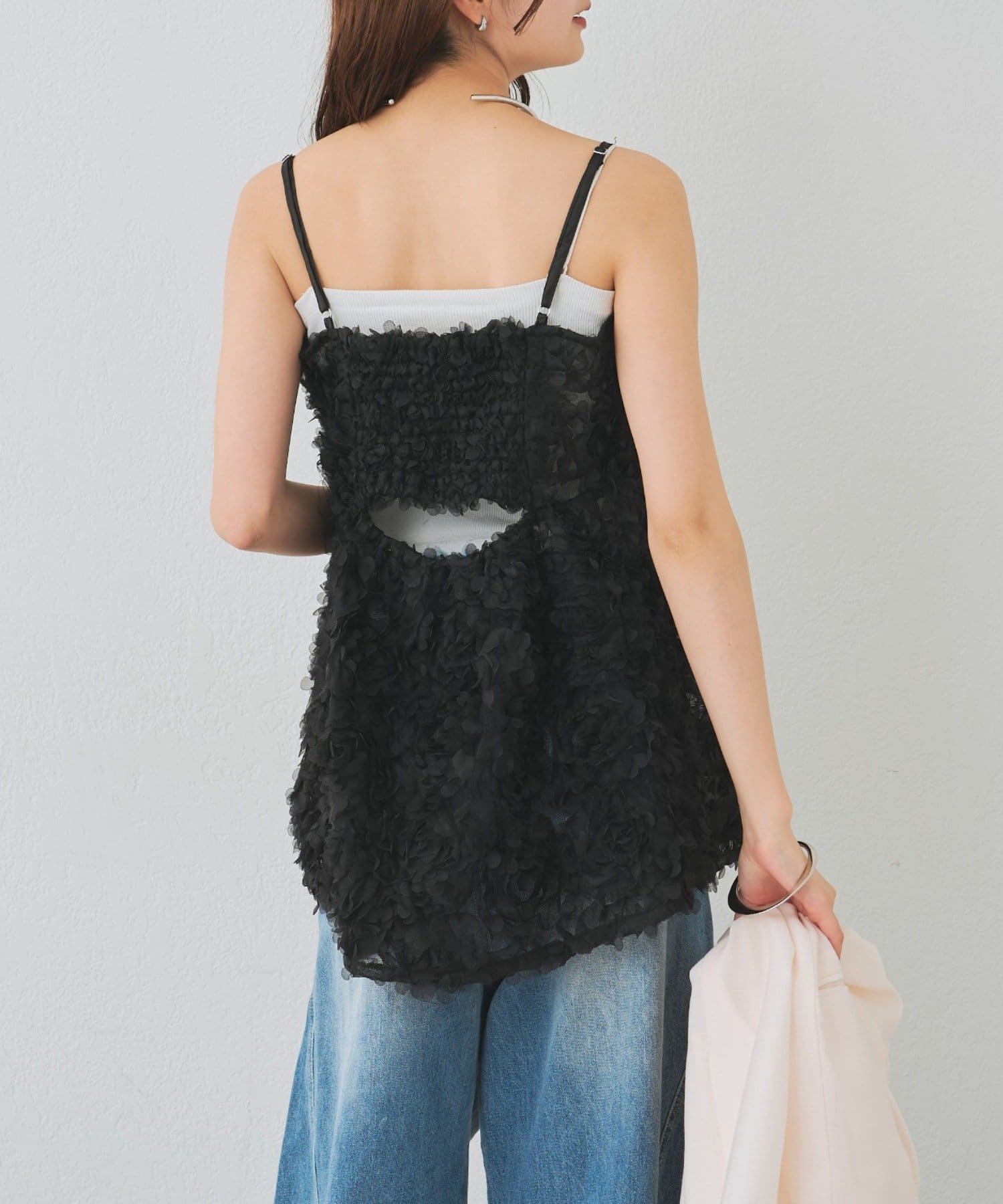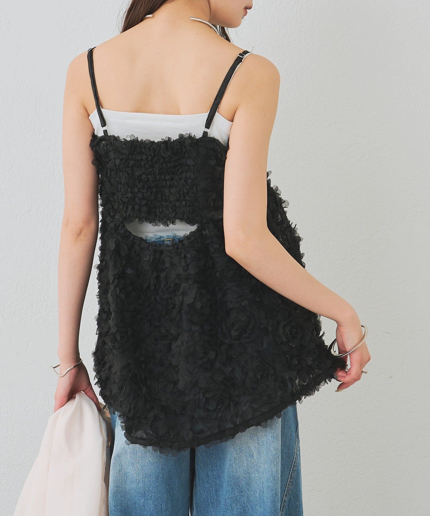・立体感のあるフラワーモチーフのチュール素材が目を惹くキャミチュニック。