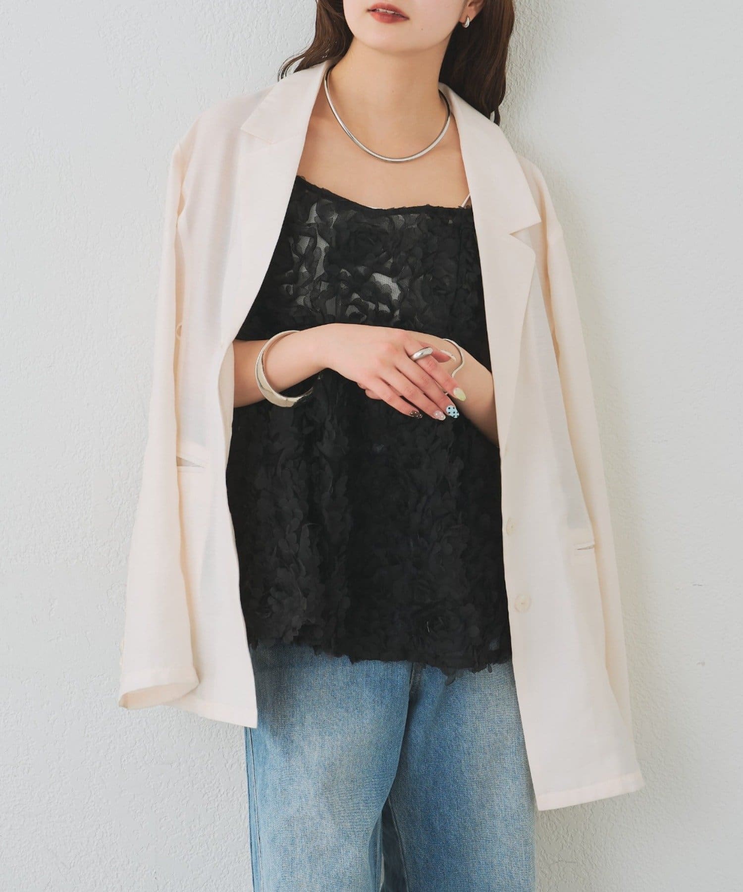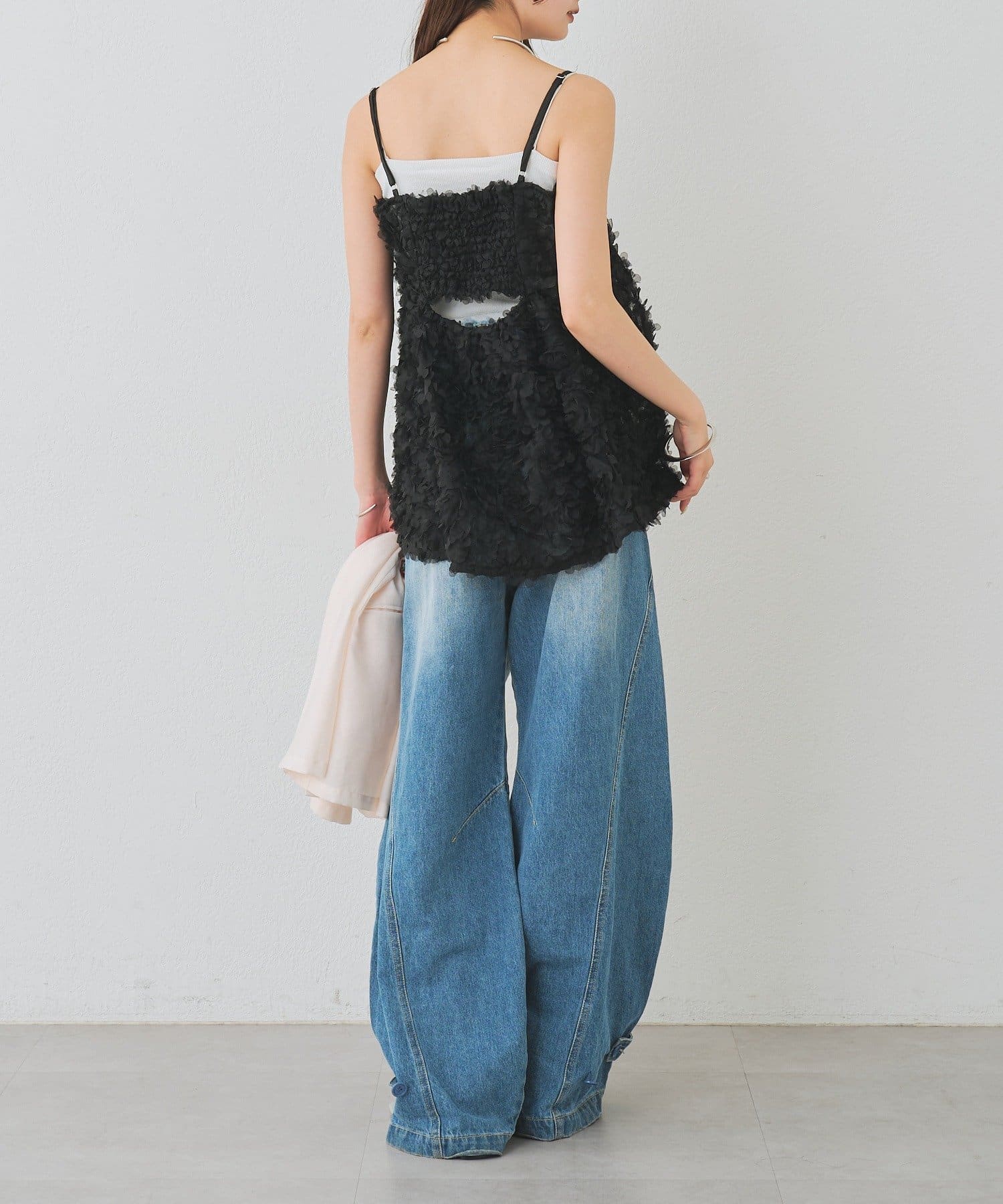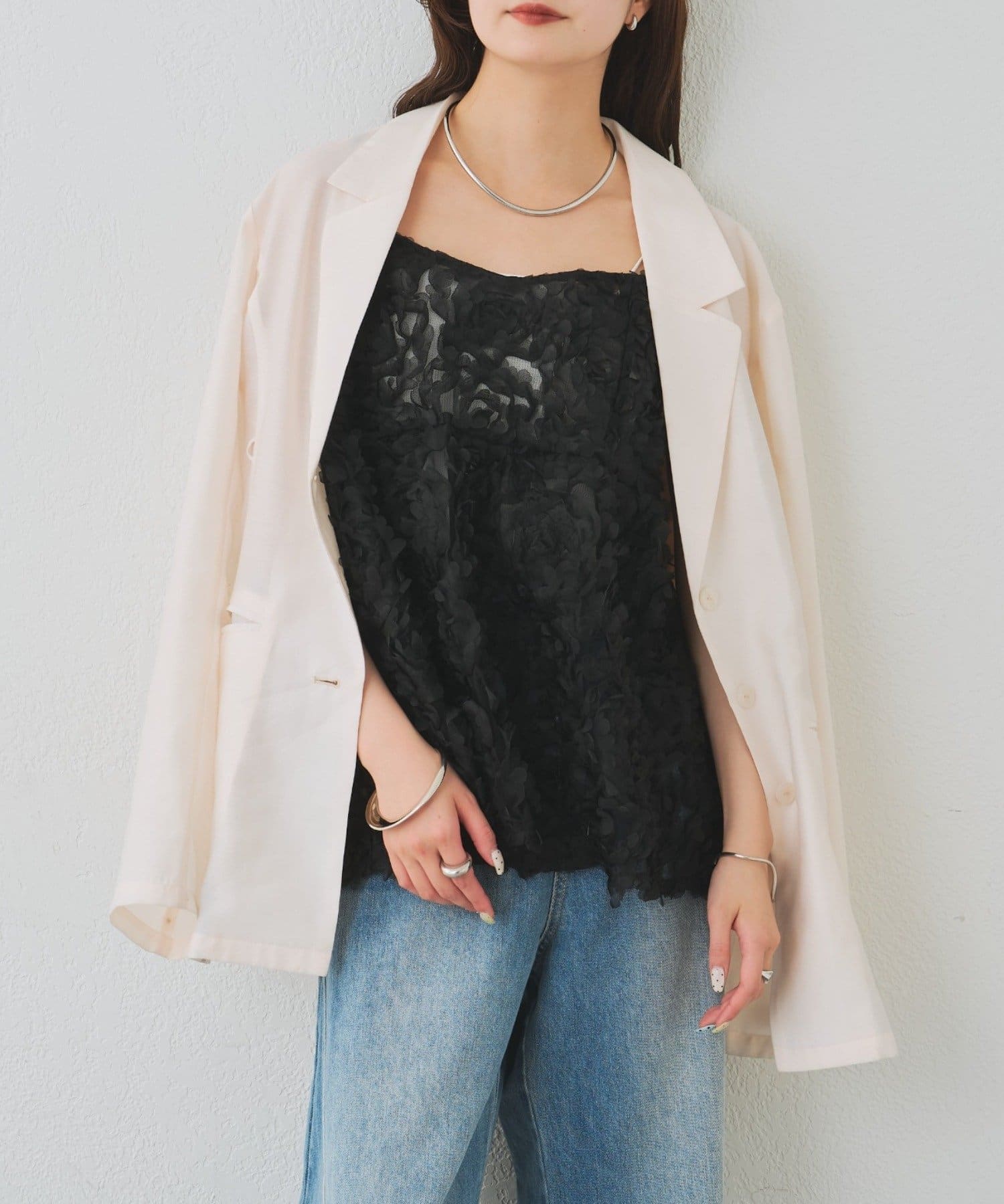 ・立体感のあるフラワーモチーフのチュール素材が目を惹くキャミチュニック。