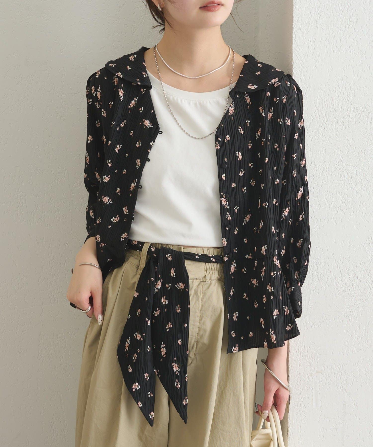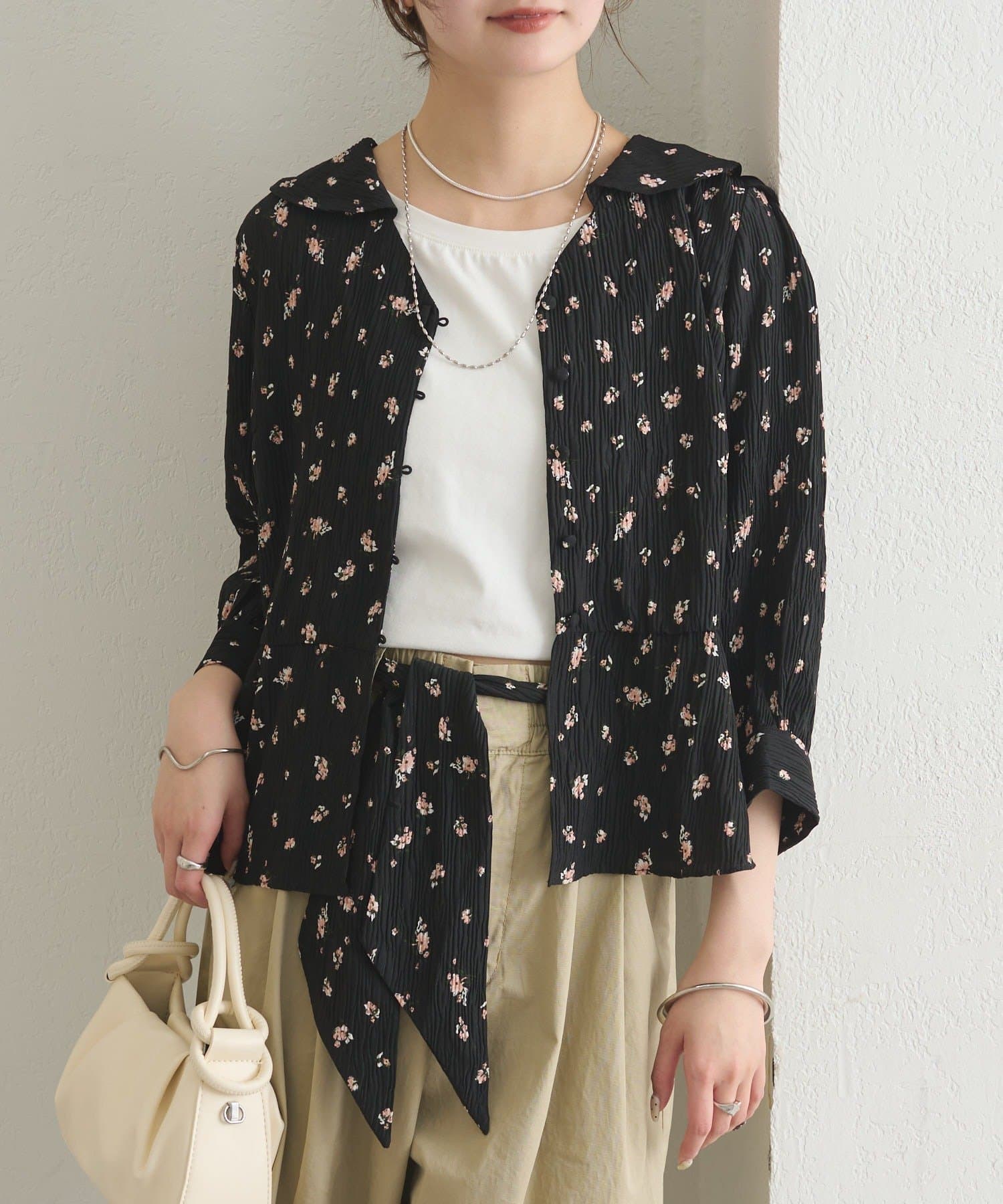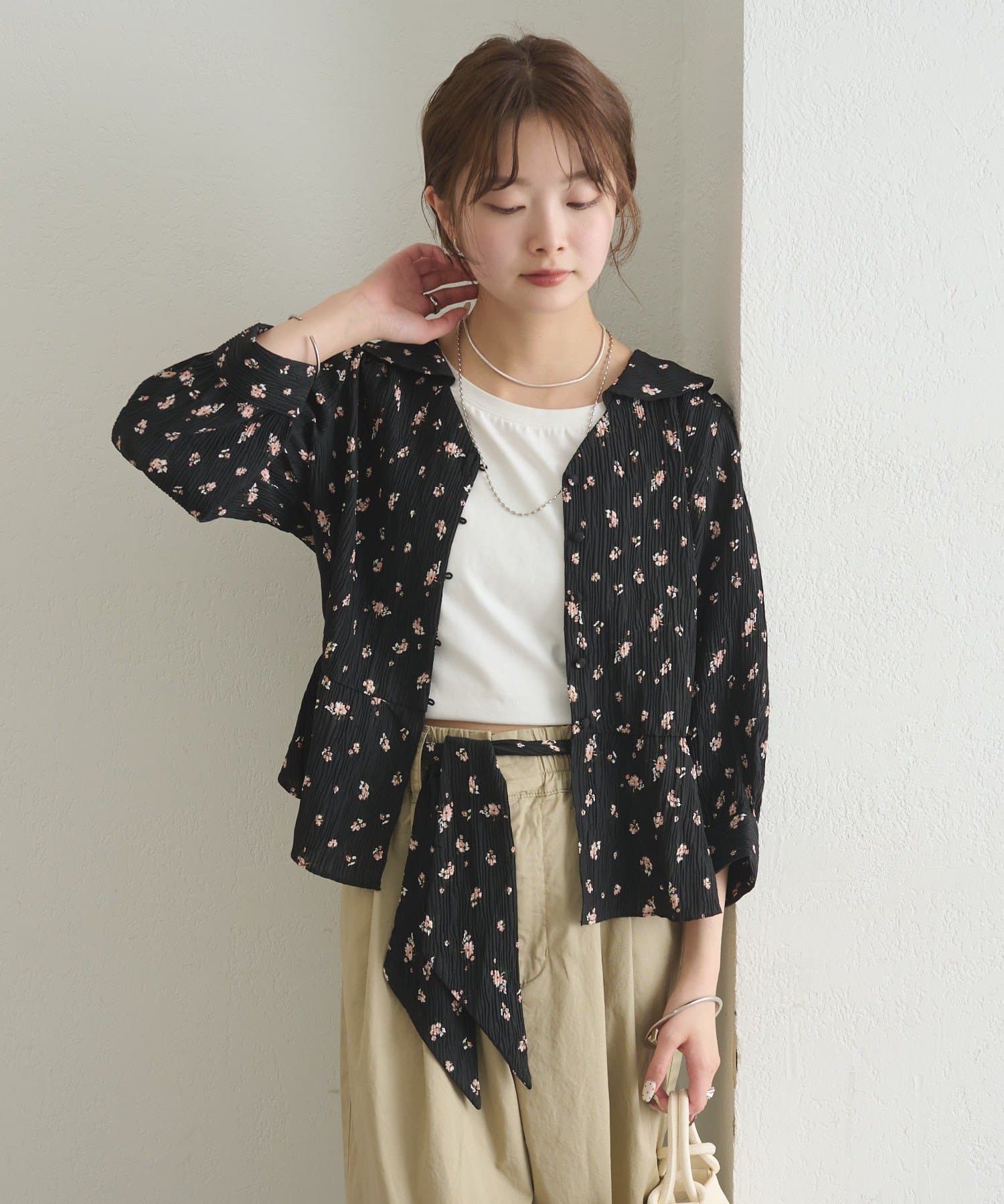 フロントで結んでフェミニンに、バックで結んで抜け感をプラス、リボンを外してシンプルにも着こなせるブラウス。