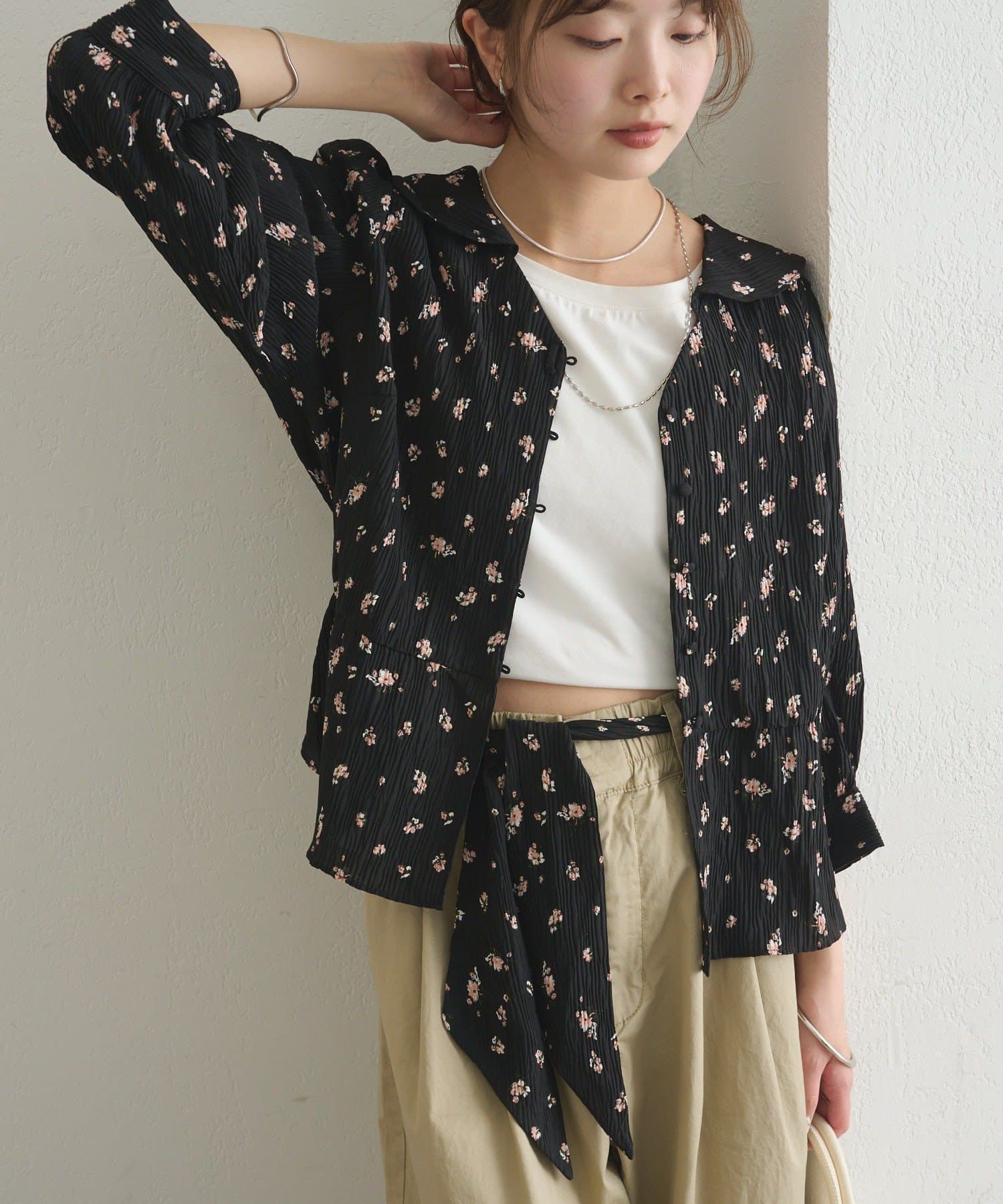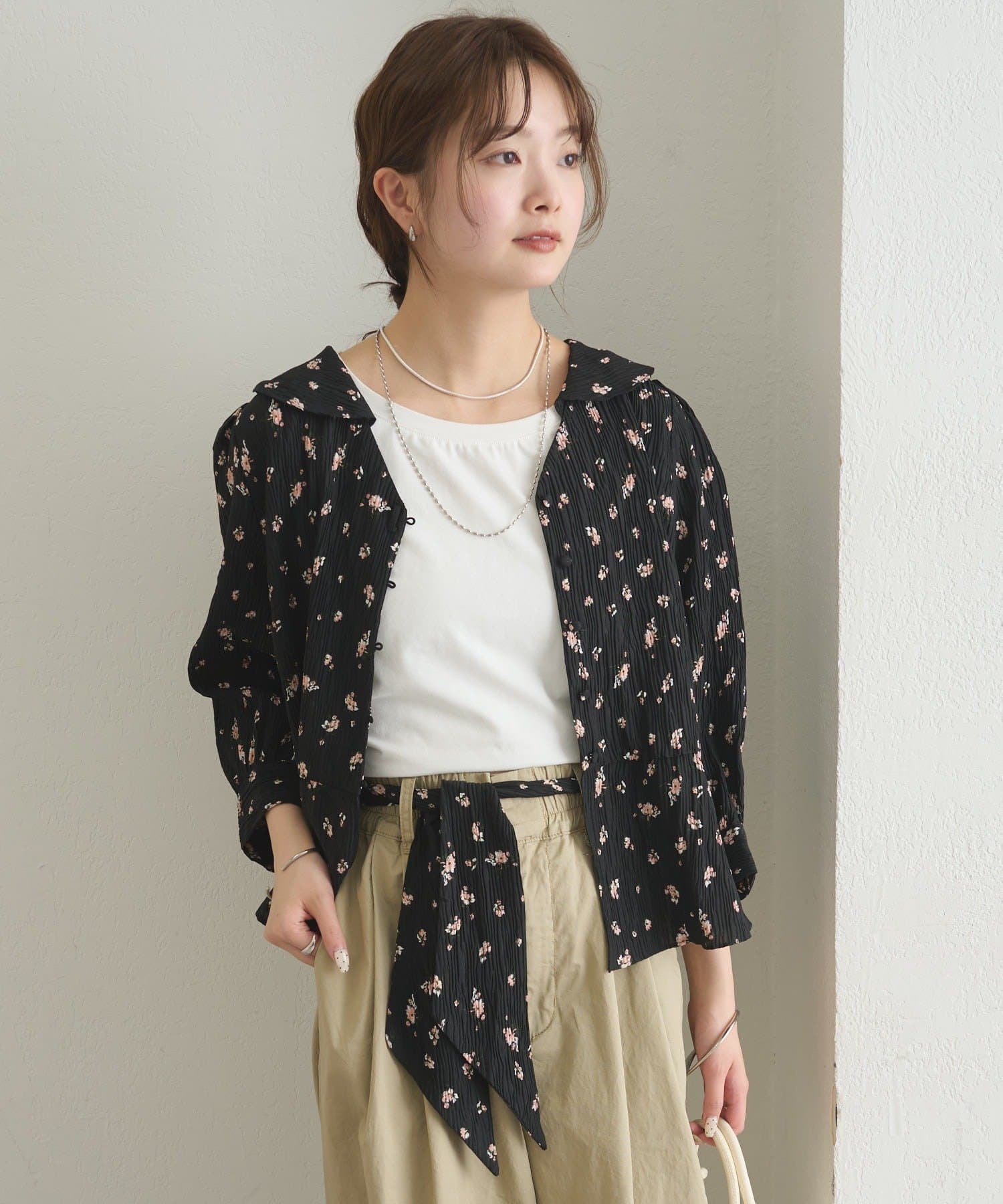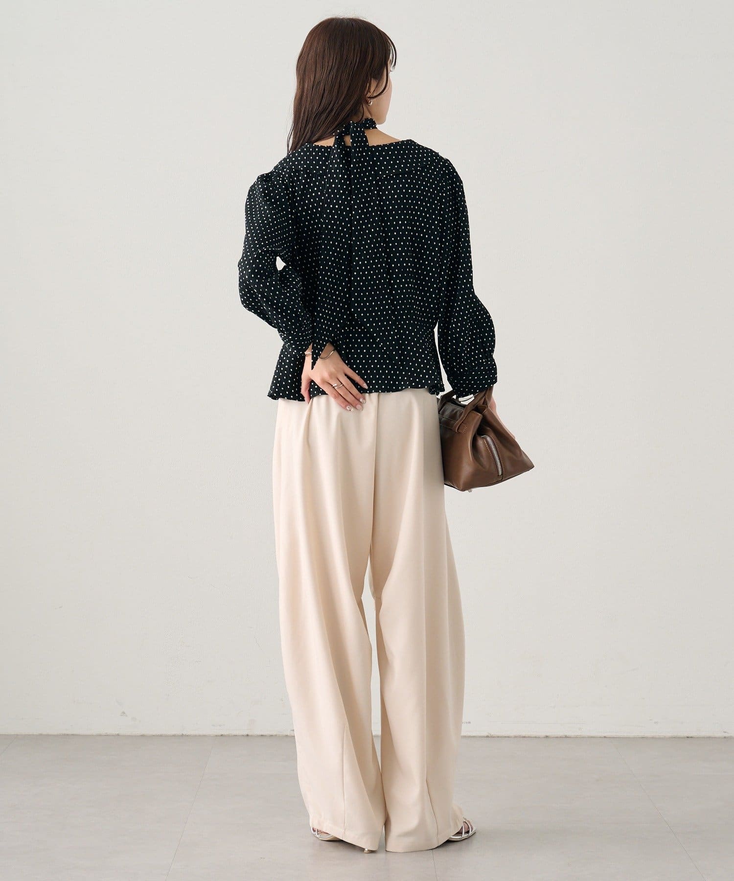 フロントで結んでフェミニンに、バックで結んで抜け感をプラス、リボンを外してシンプルにも着こなせるブラウス。