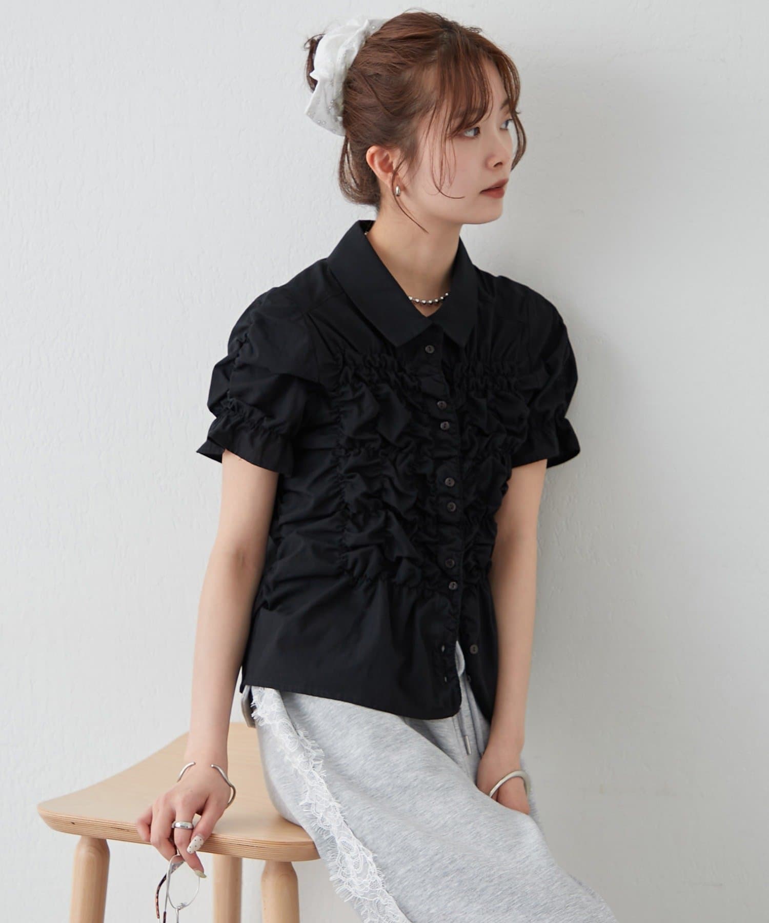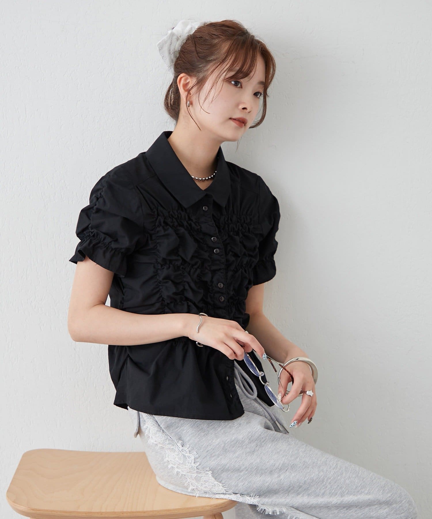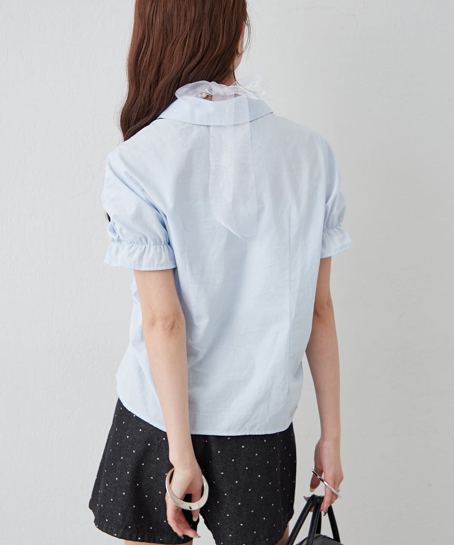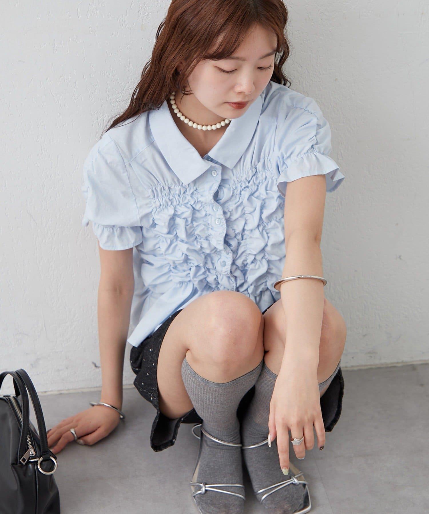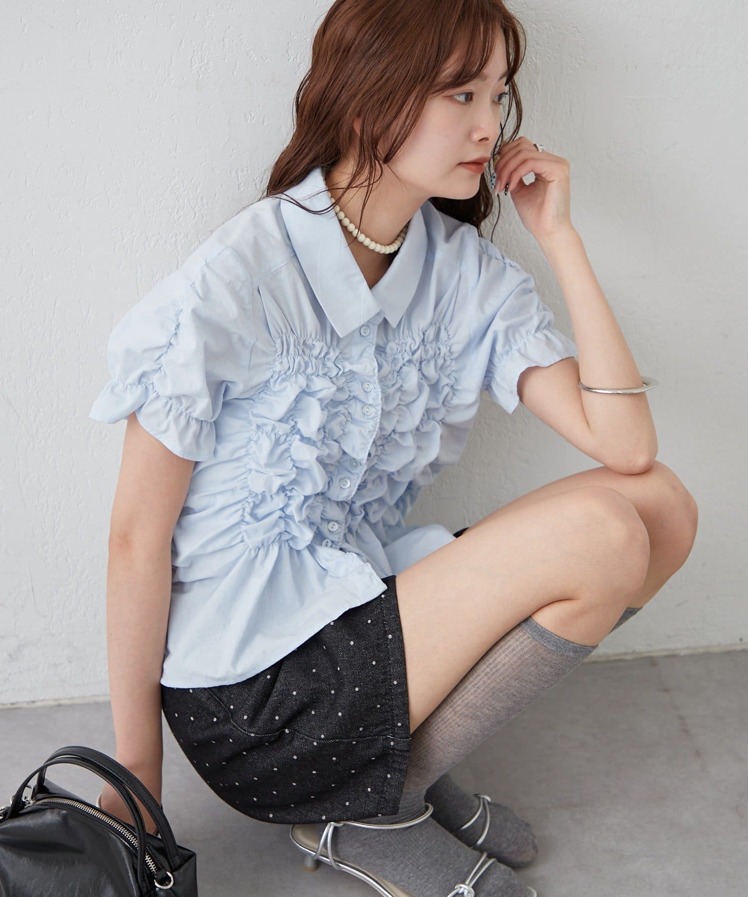 ・ミニボトムと合わせて、フェミニンさをプラスしたスタイリングにも。