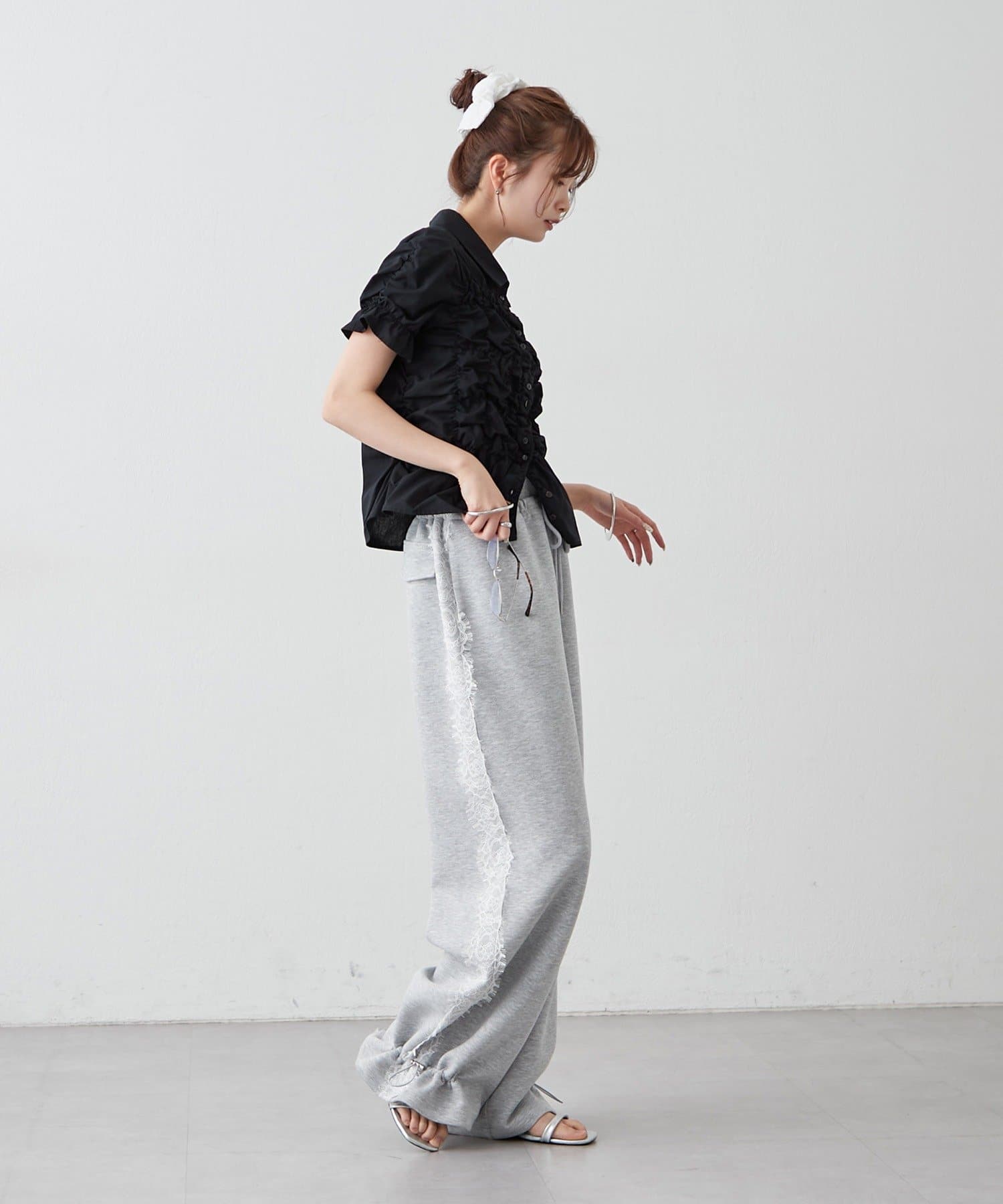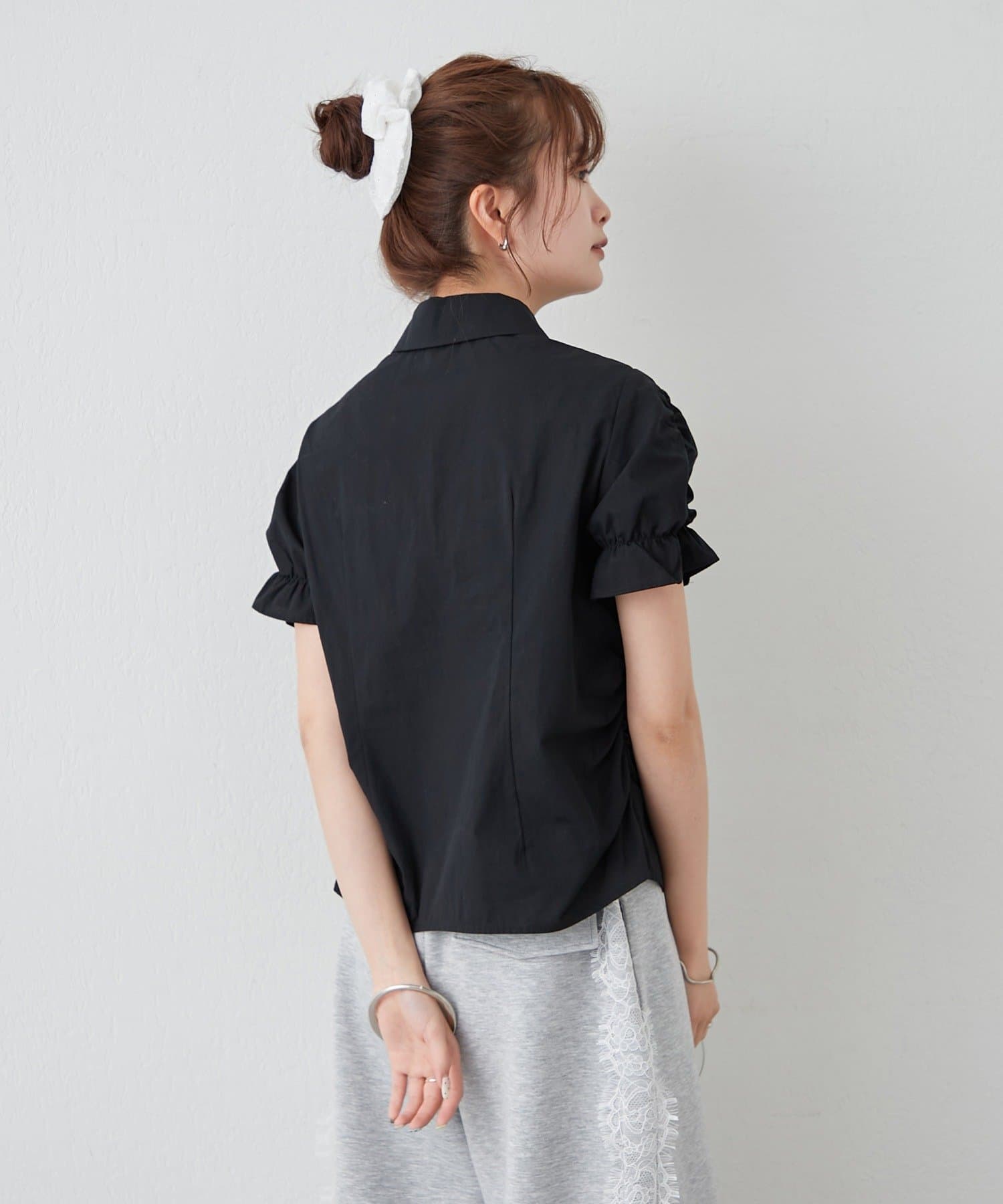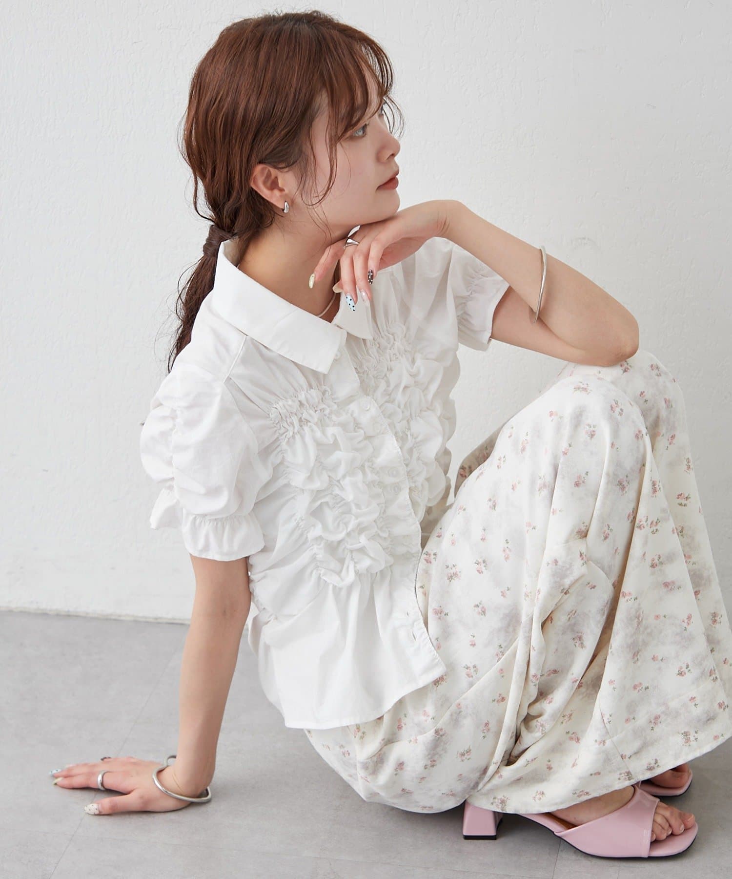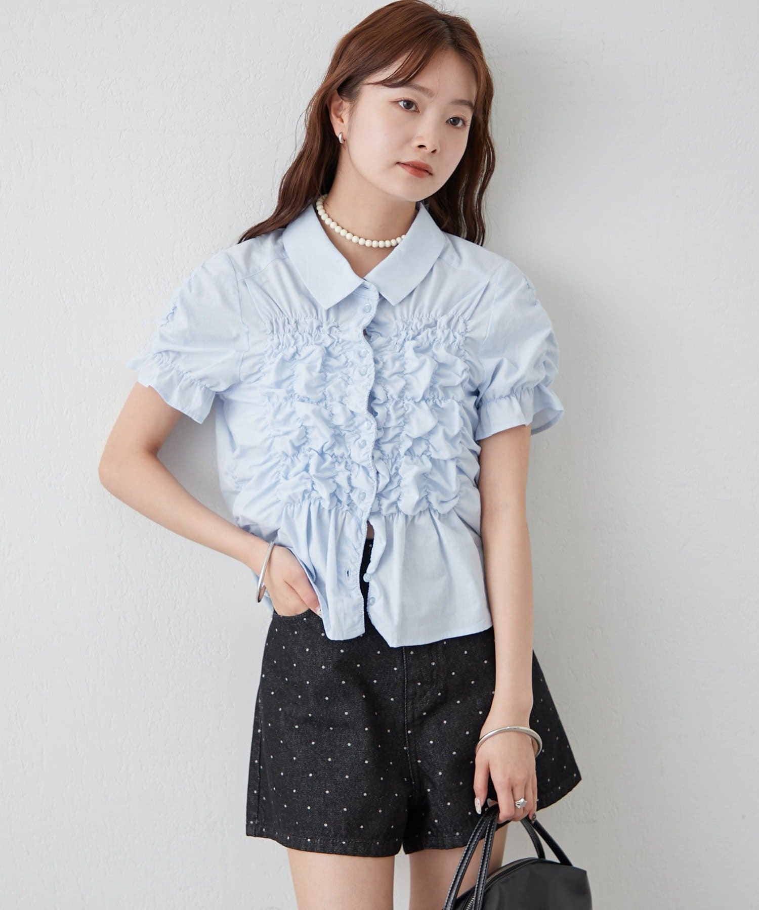 ・ミニボトムと合わせて、フェミニンさをプラスしたスタイリングにも。