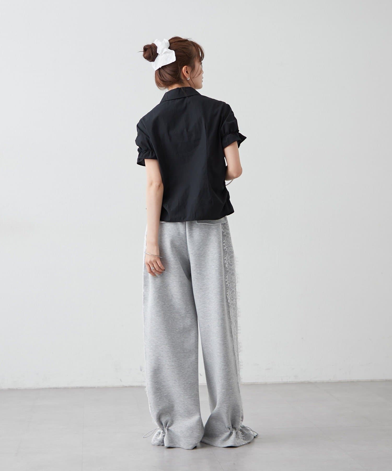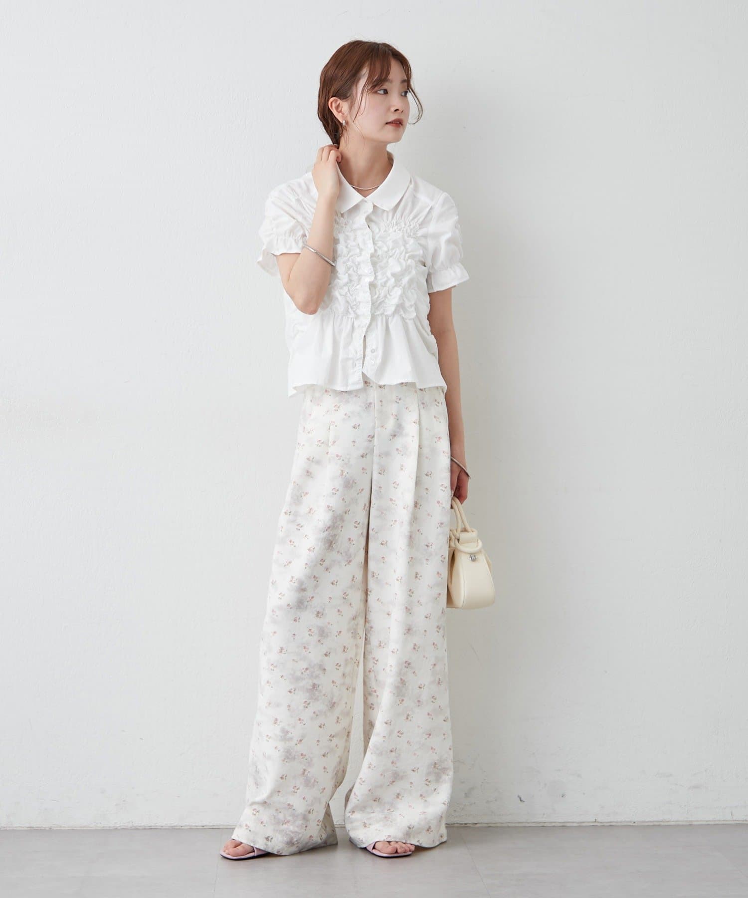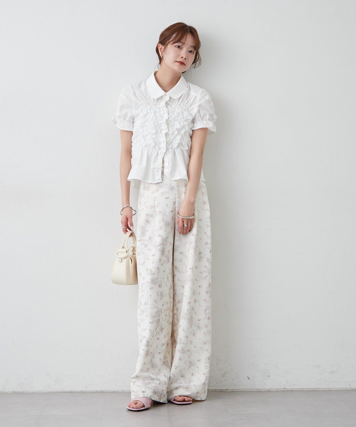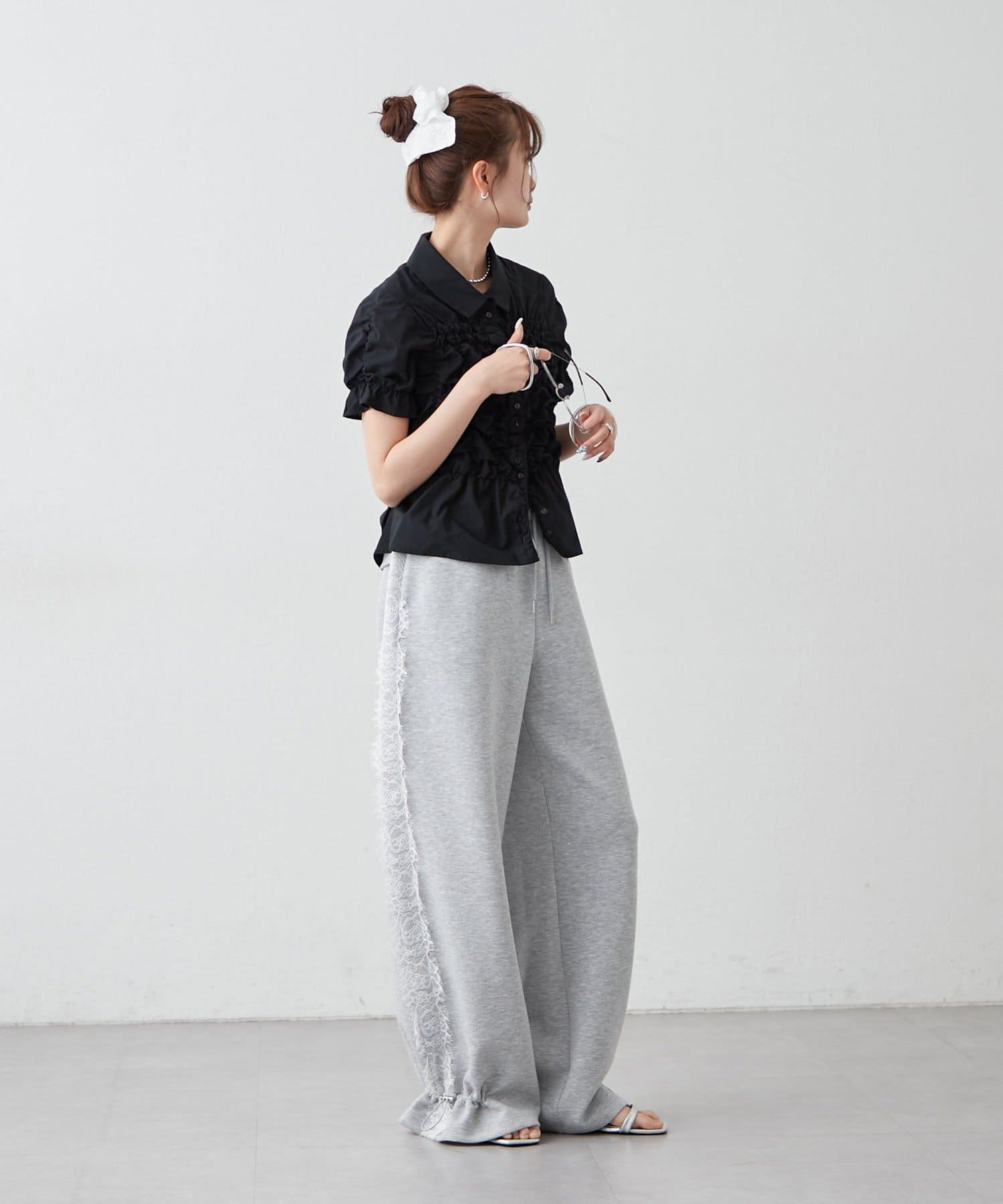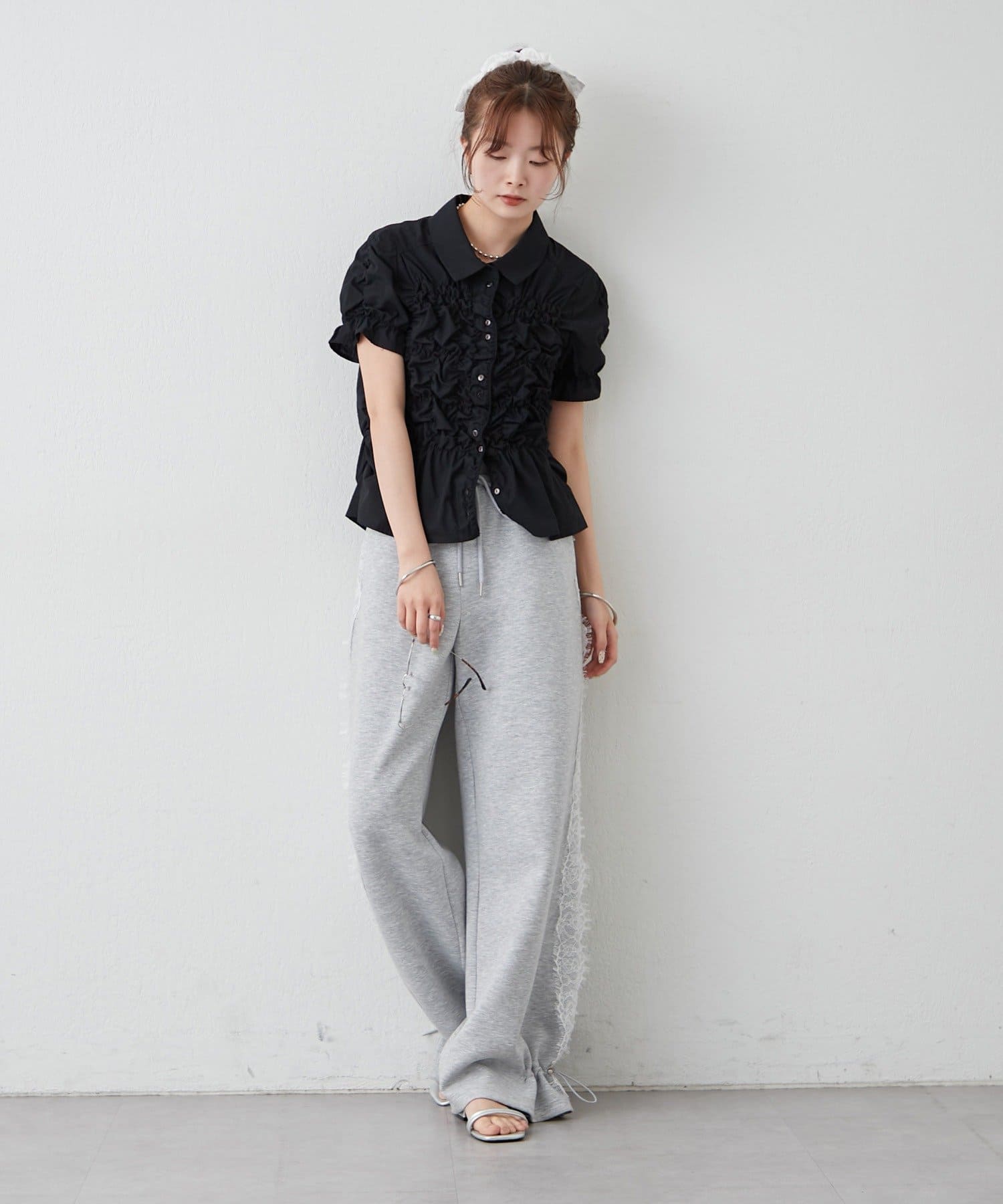 ・ミニボトムと合わせて、フェミニンさをプラスしたスタイリングにも。