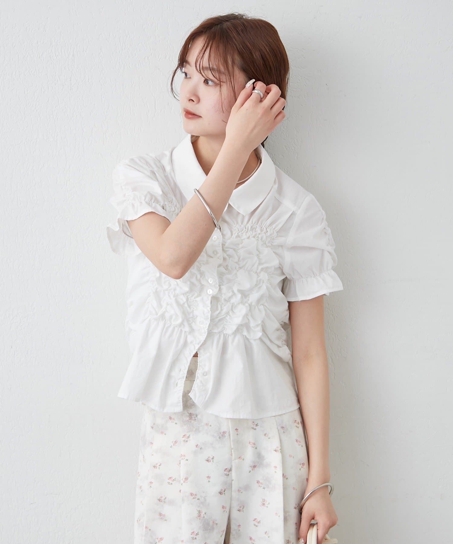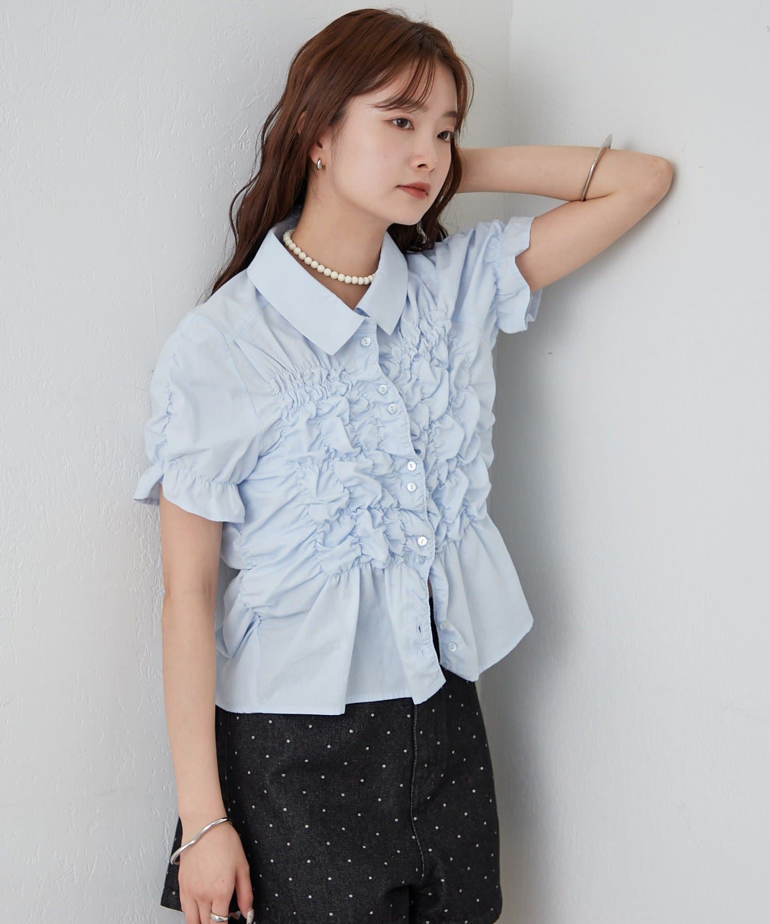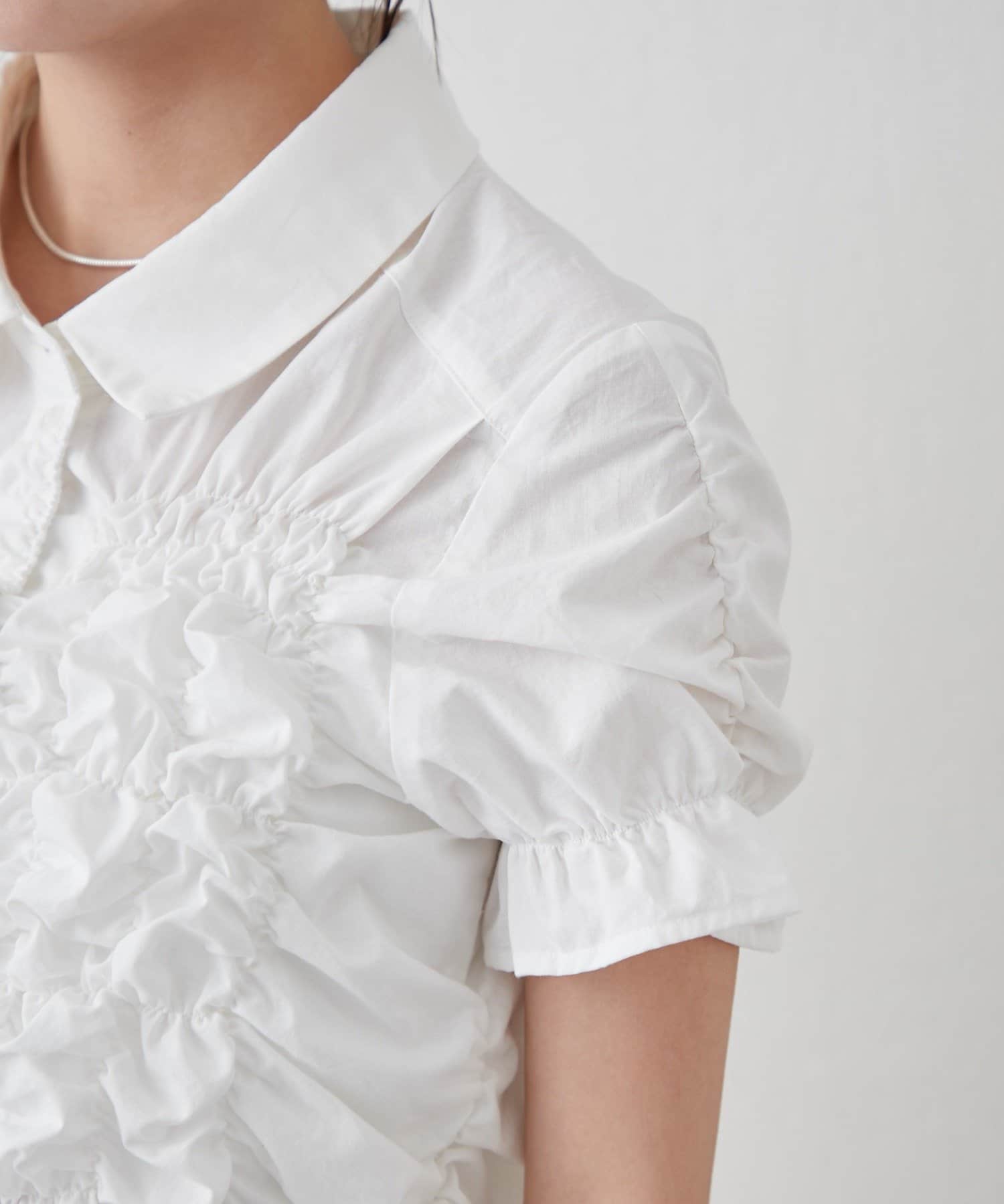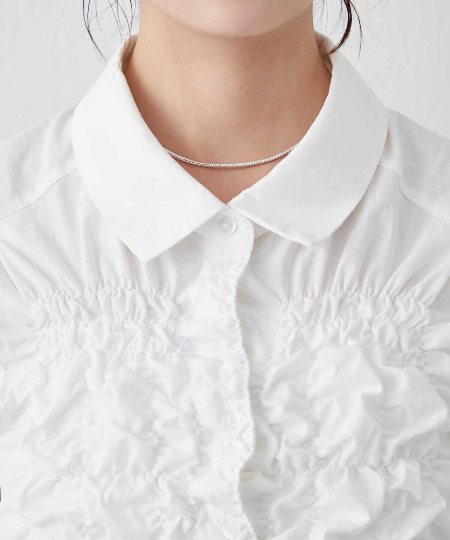 シャーリングデザインが素材感をプラスするシェイプシャツ