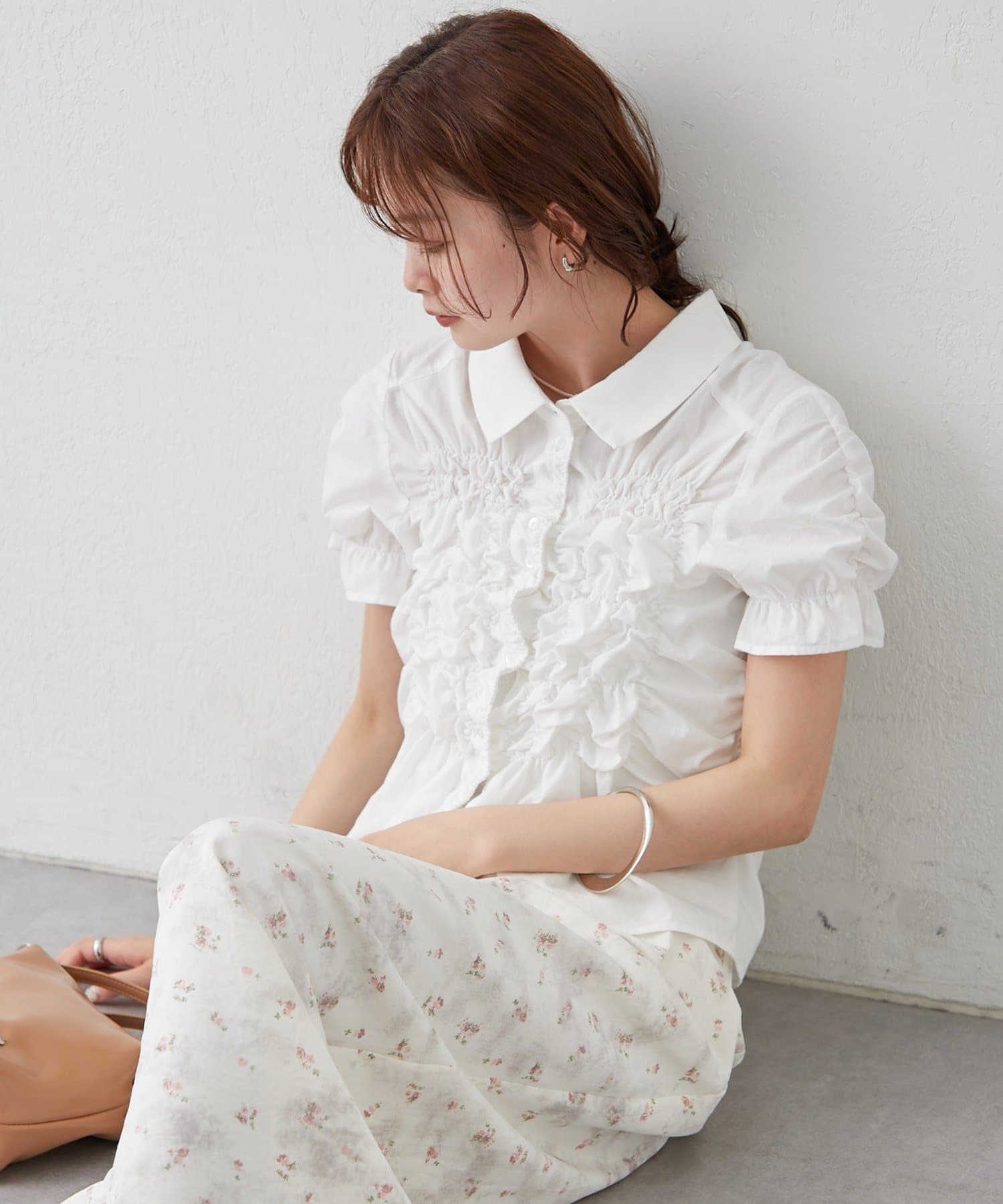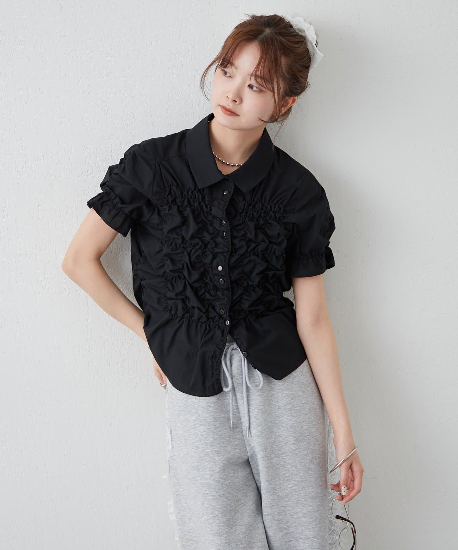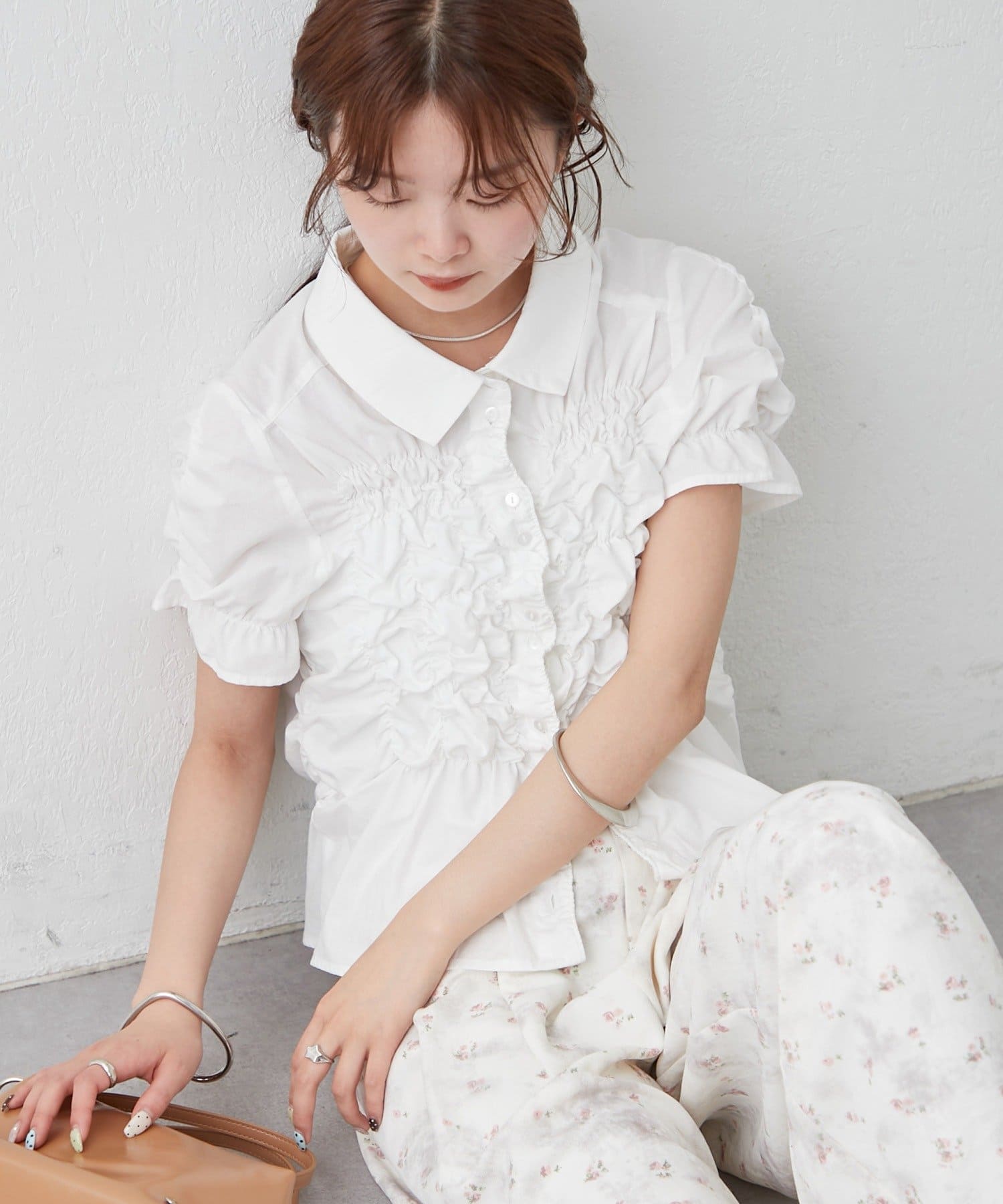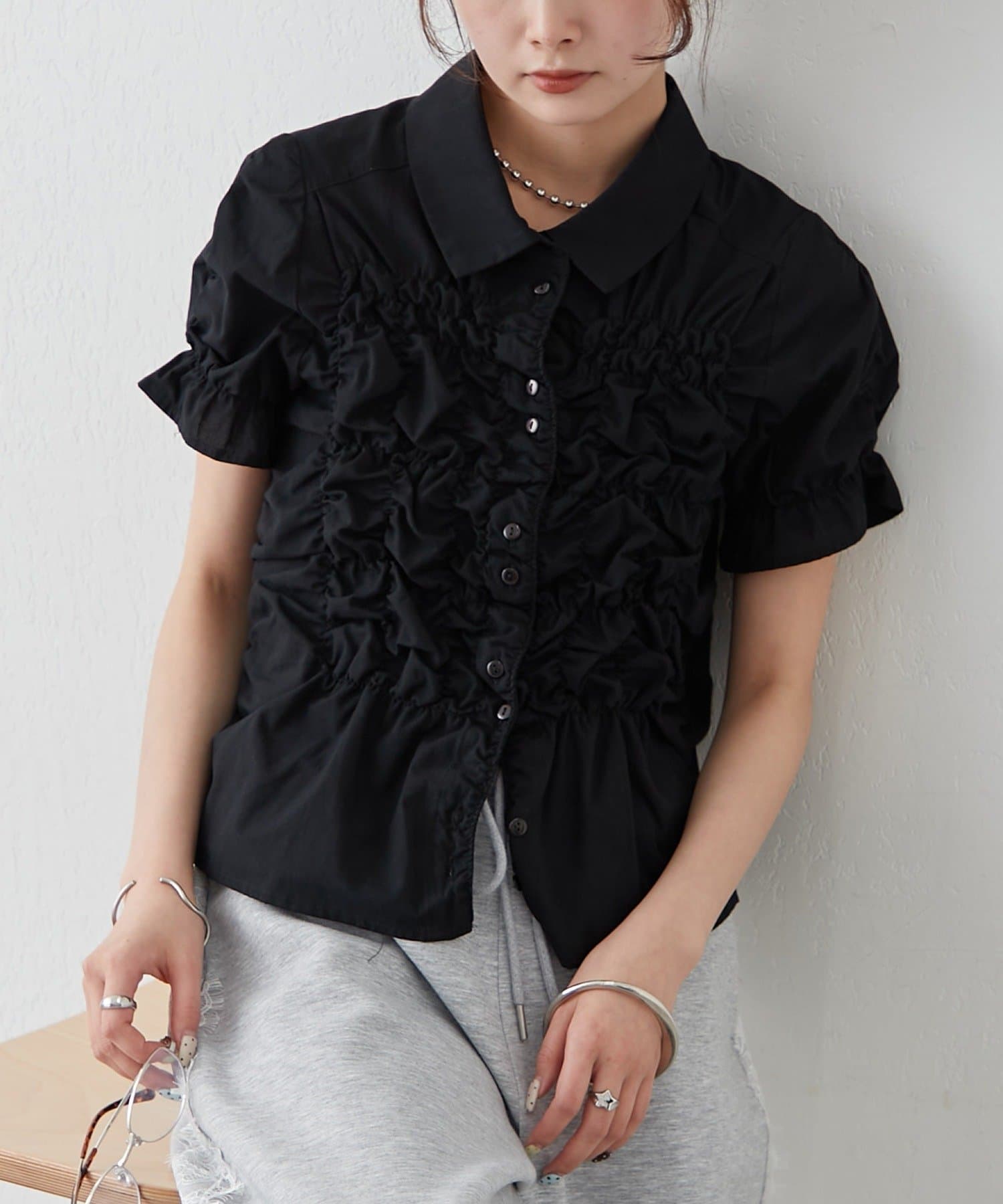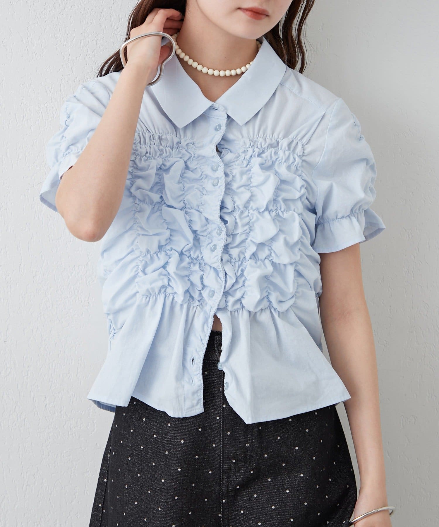 シャーリングデザインが素材感をプラスするシェイプシャツ