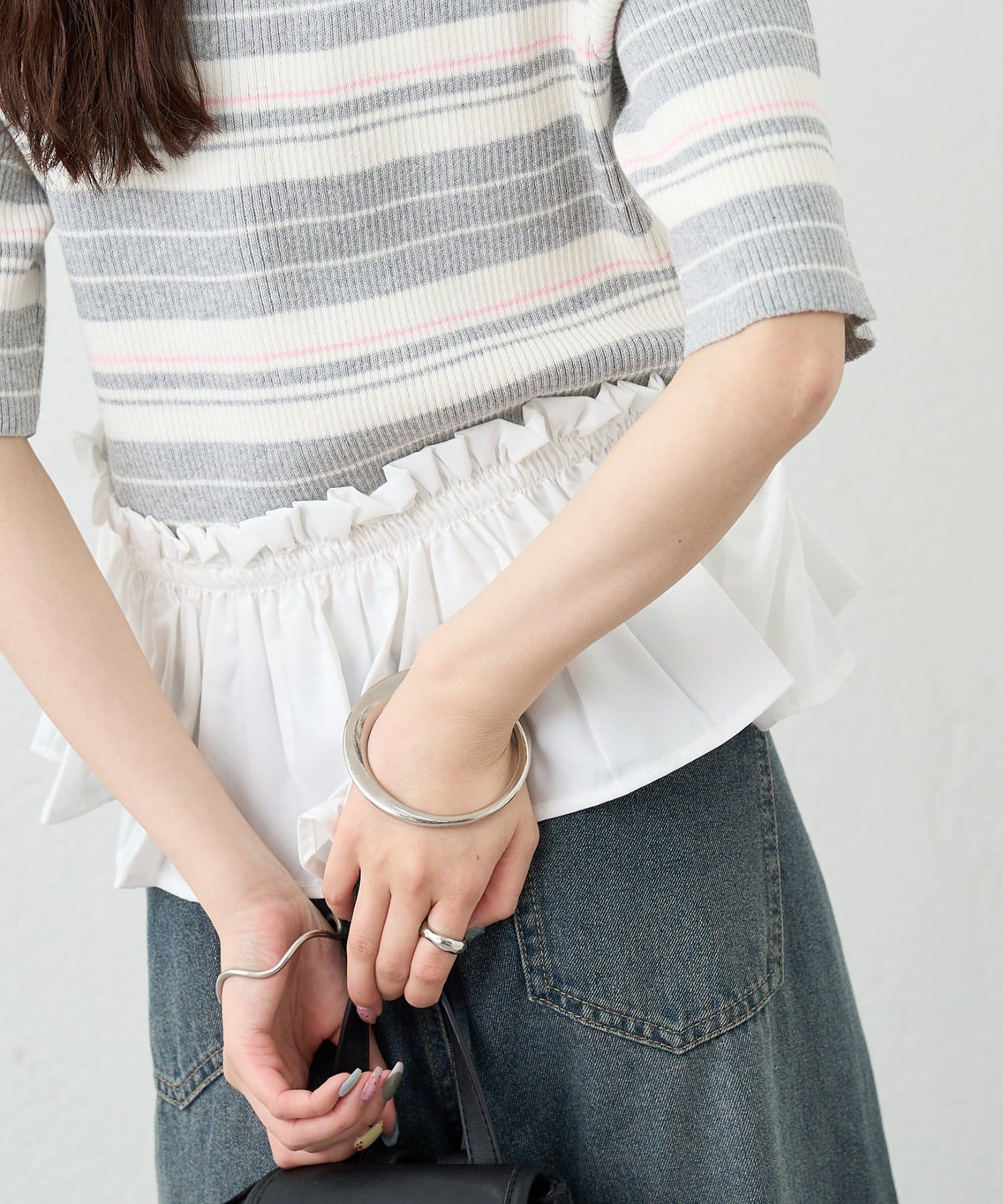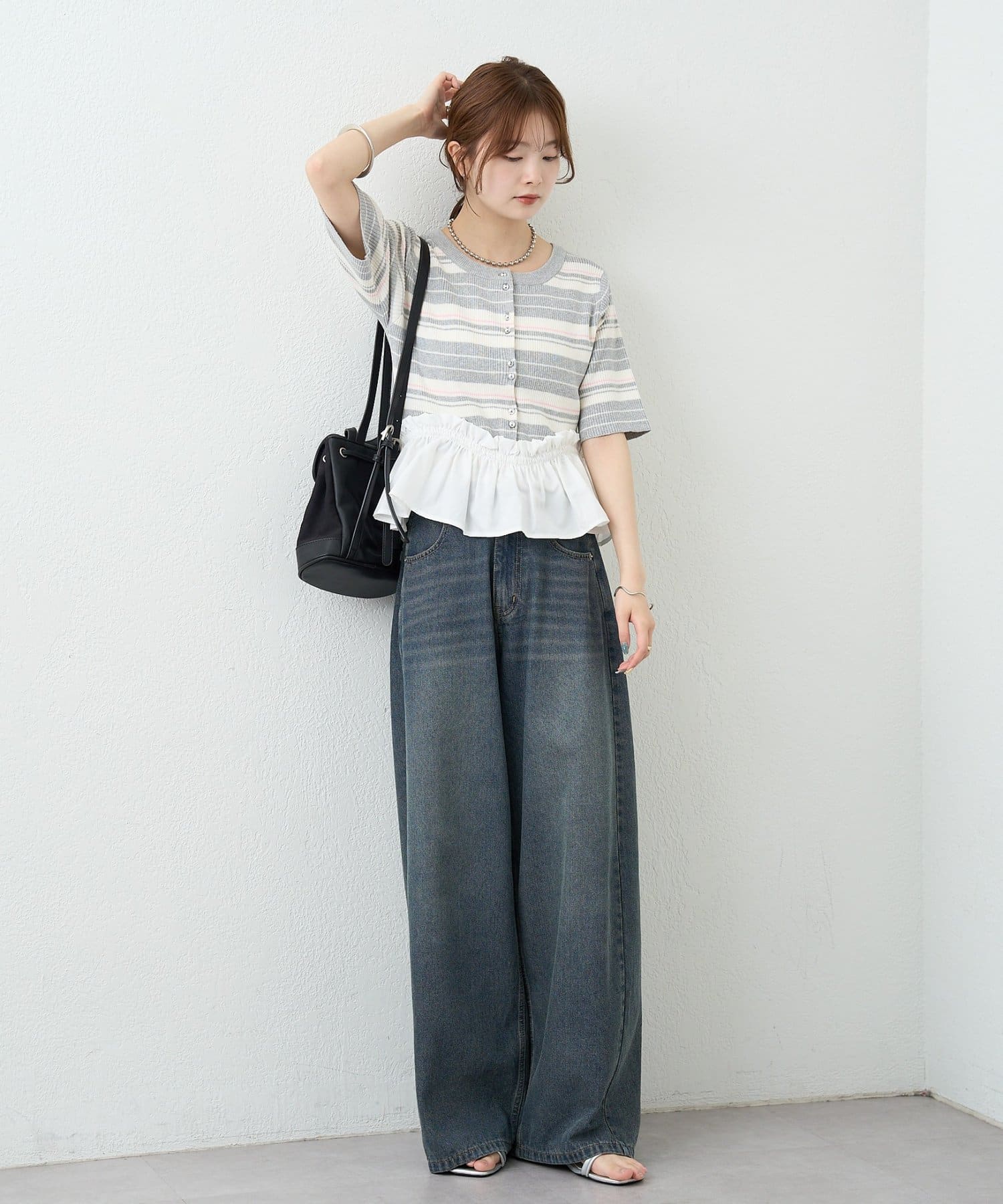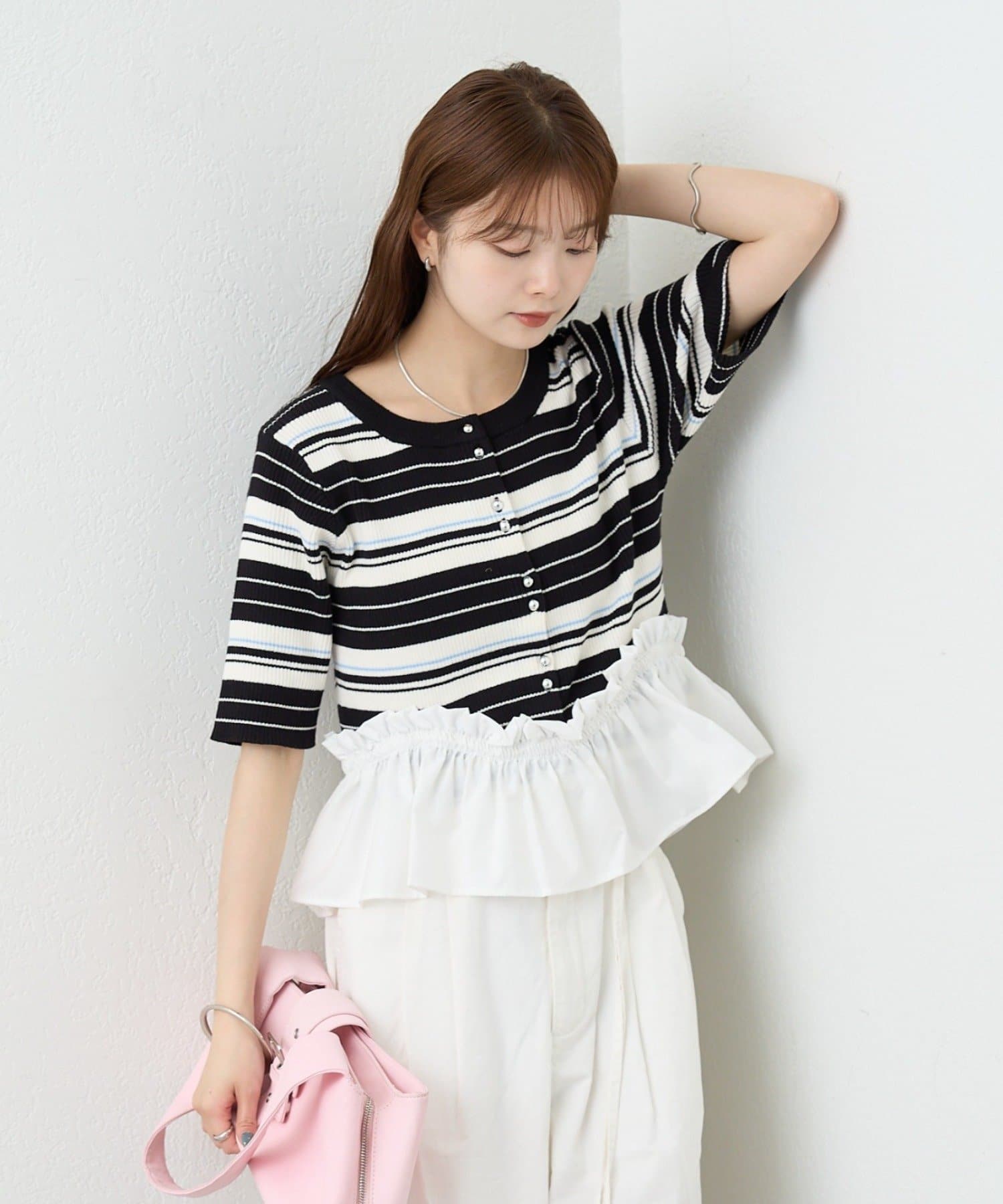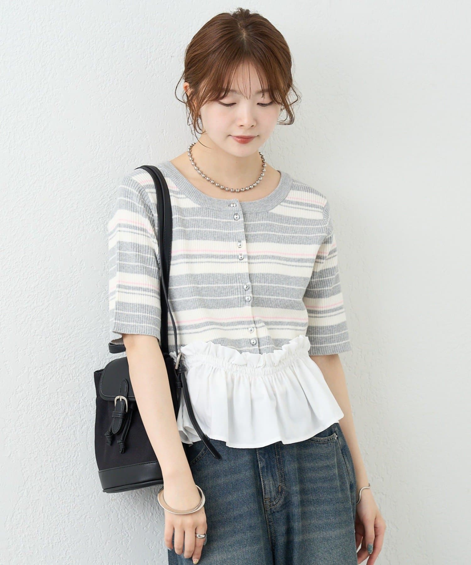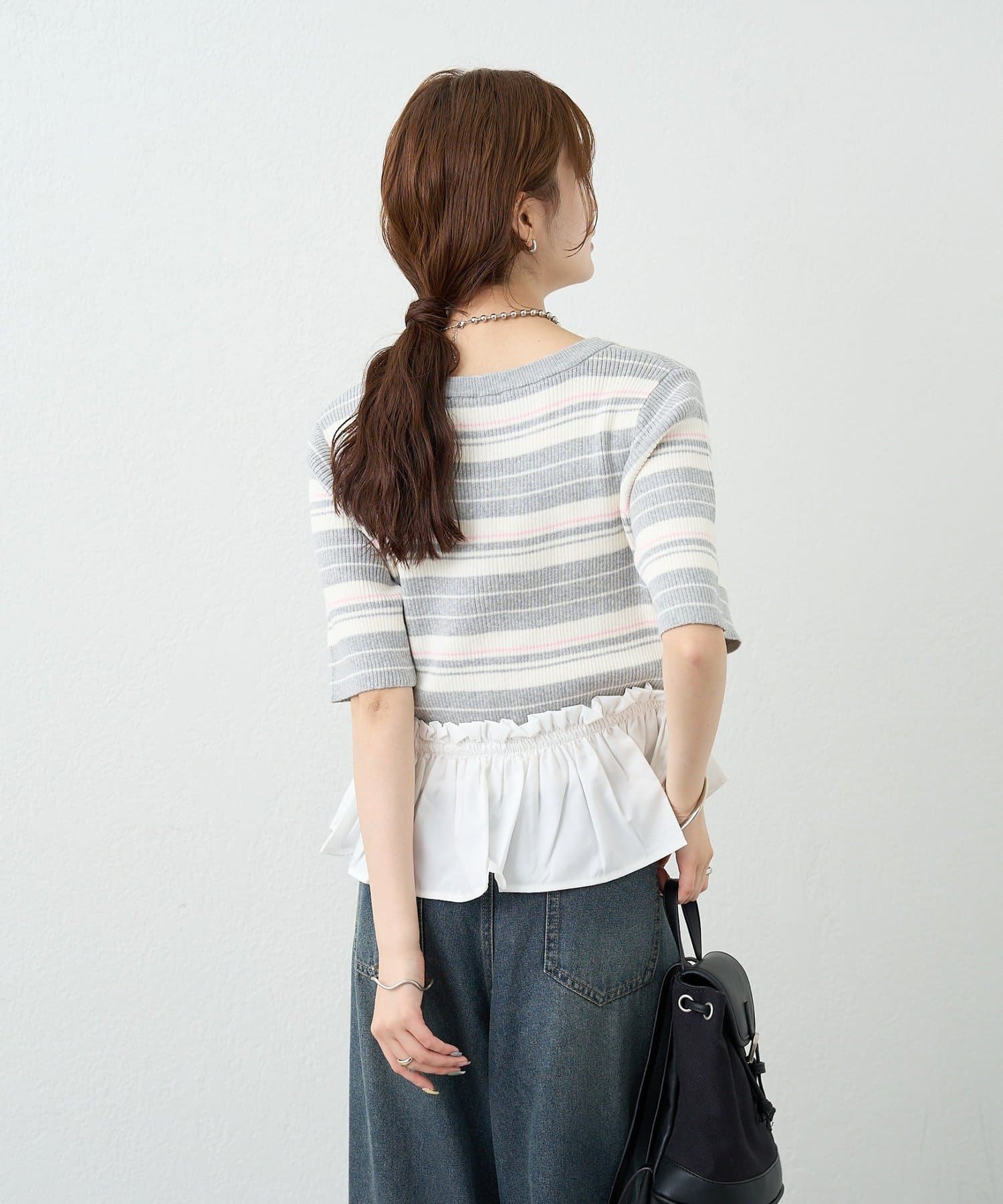 トレンドのペプラムデザインが目を惹く、上品な印象の半袖ニット。