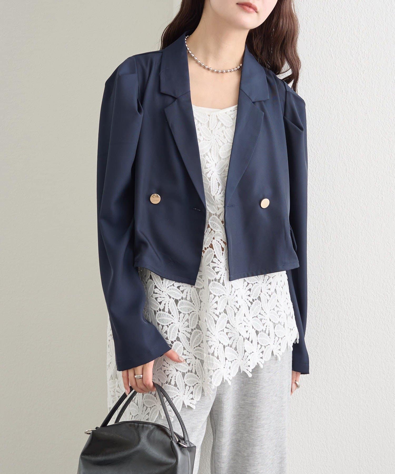 タンクトップやキャミソールに重ねて、ジャケットと合わせるだけで綺麗めスタイルに決まります。