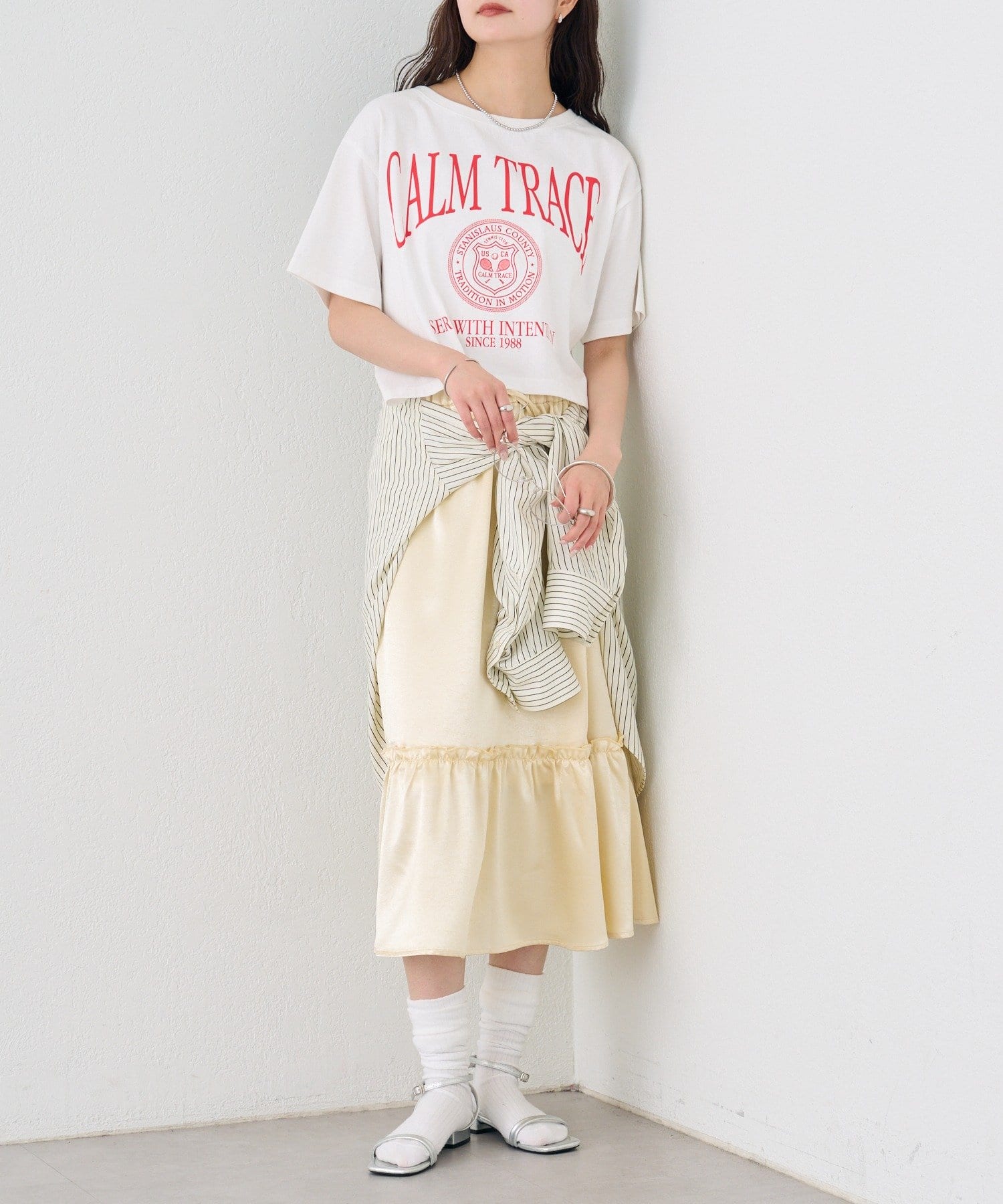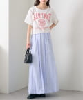 ・ロングスカートを合わせれば、カジュアルさの中に女性らしさをプラスできます。