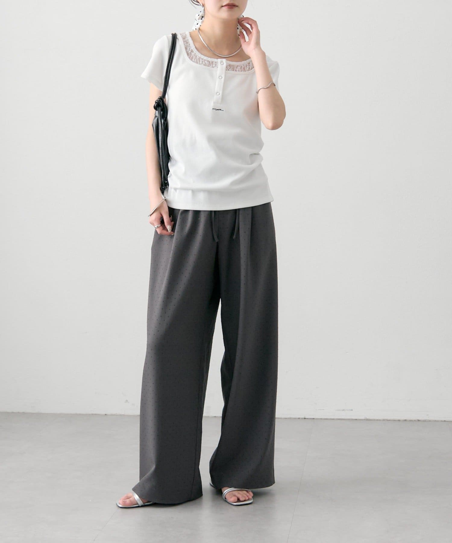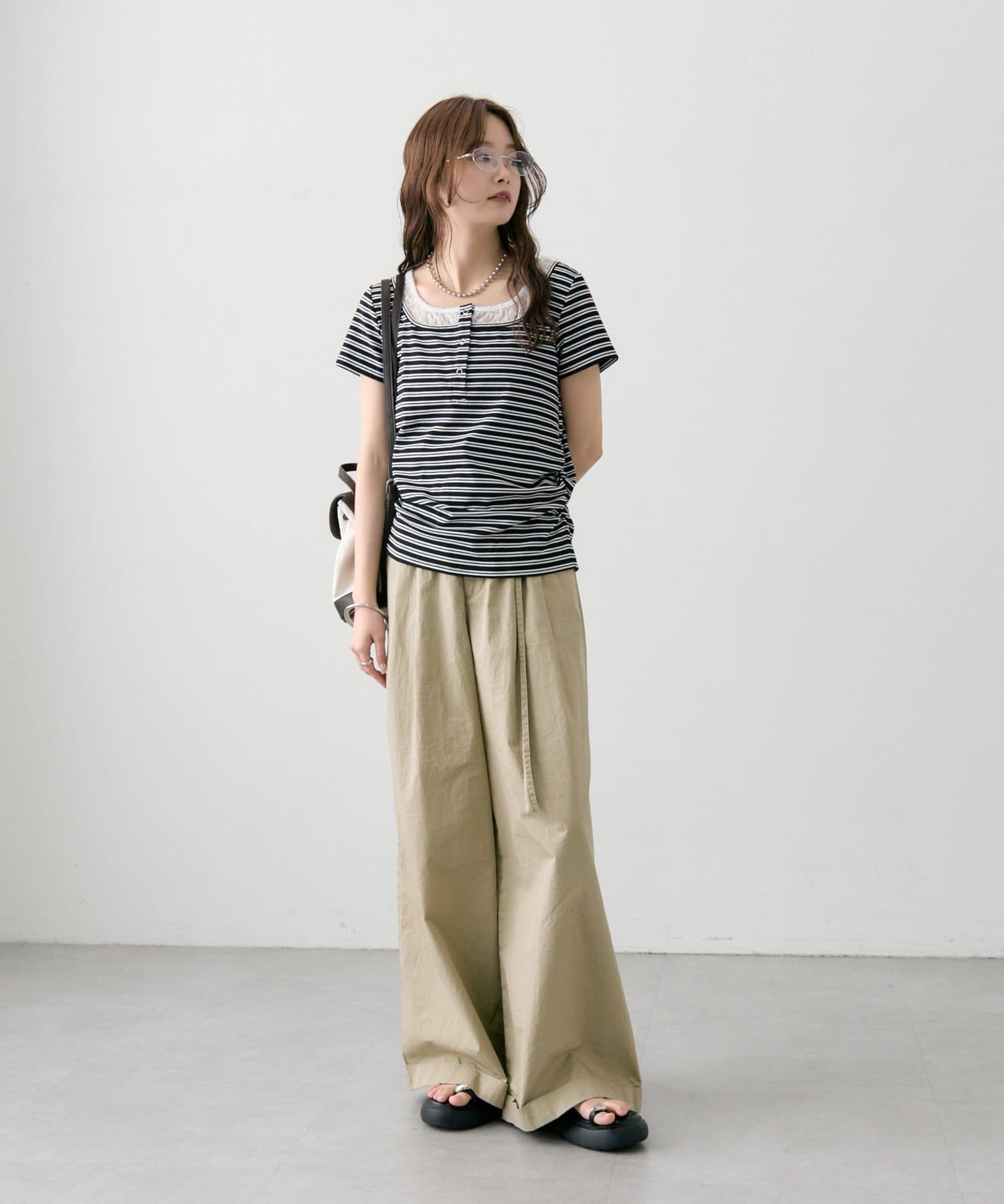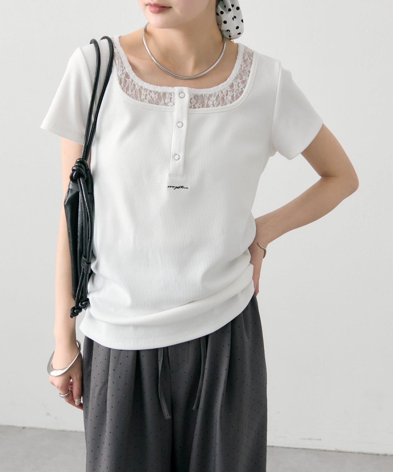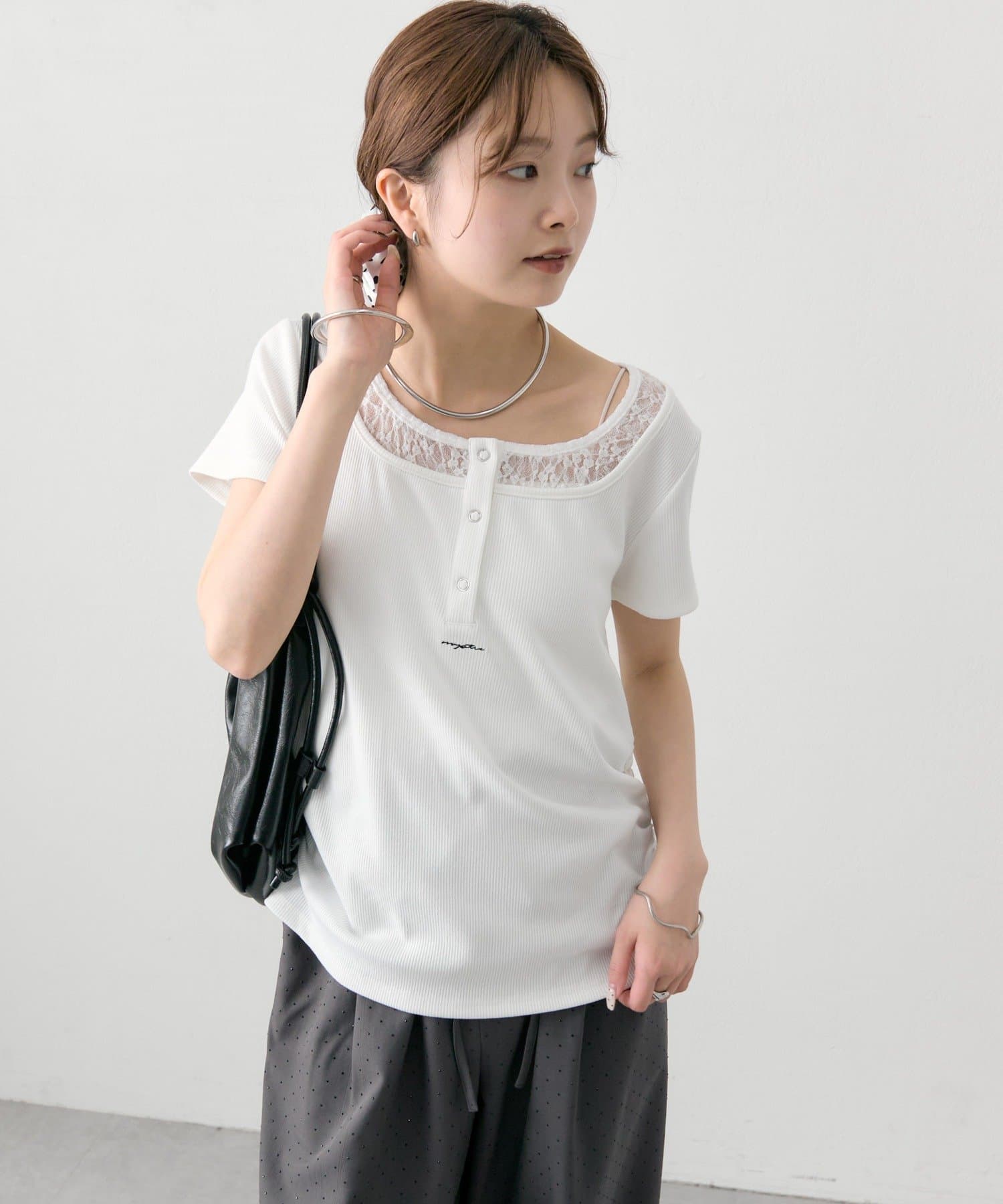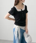・フロントのヘンリーボタンとレイヤード風デザインのネックラインが、シンプルながらもさりげないアクセントになっています。