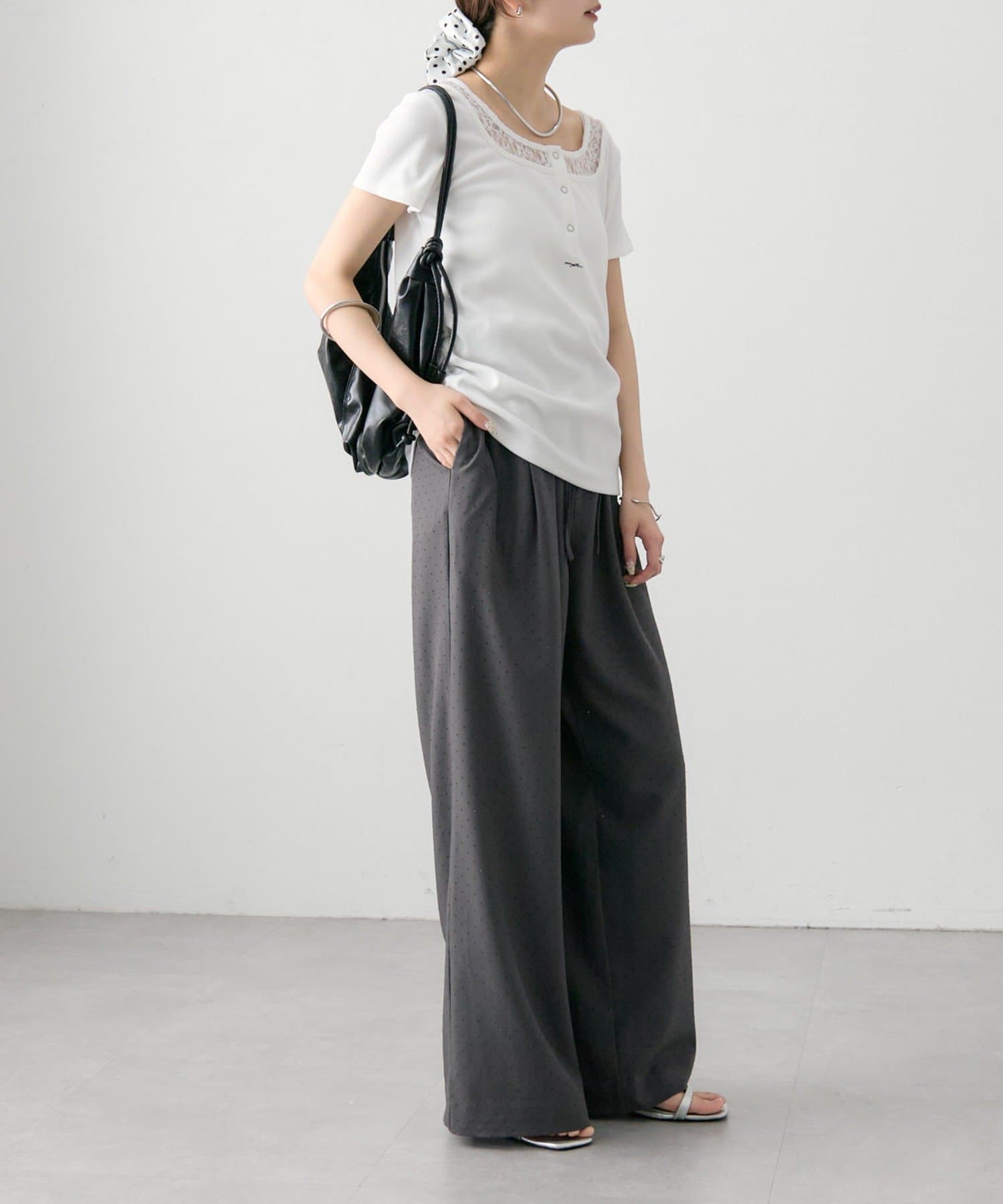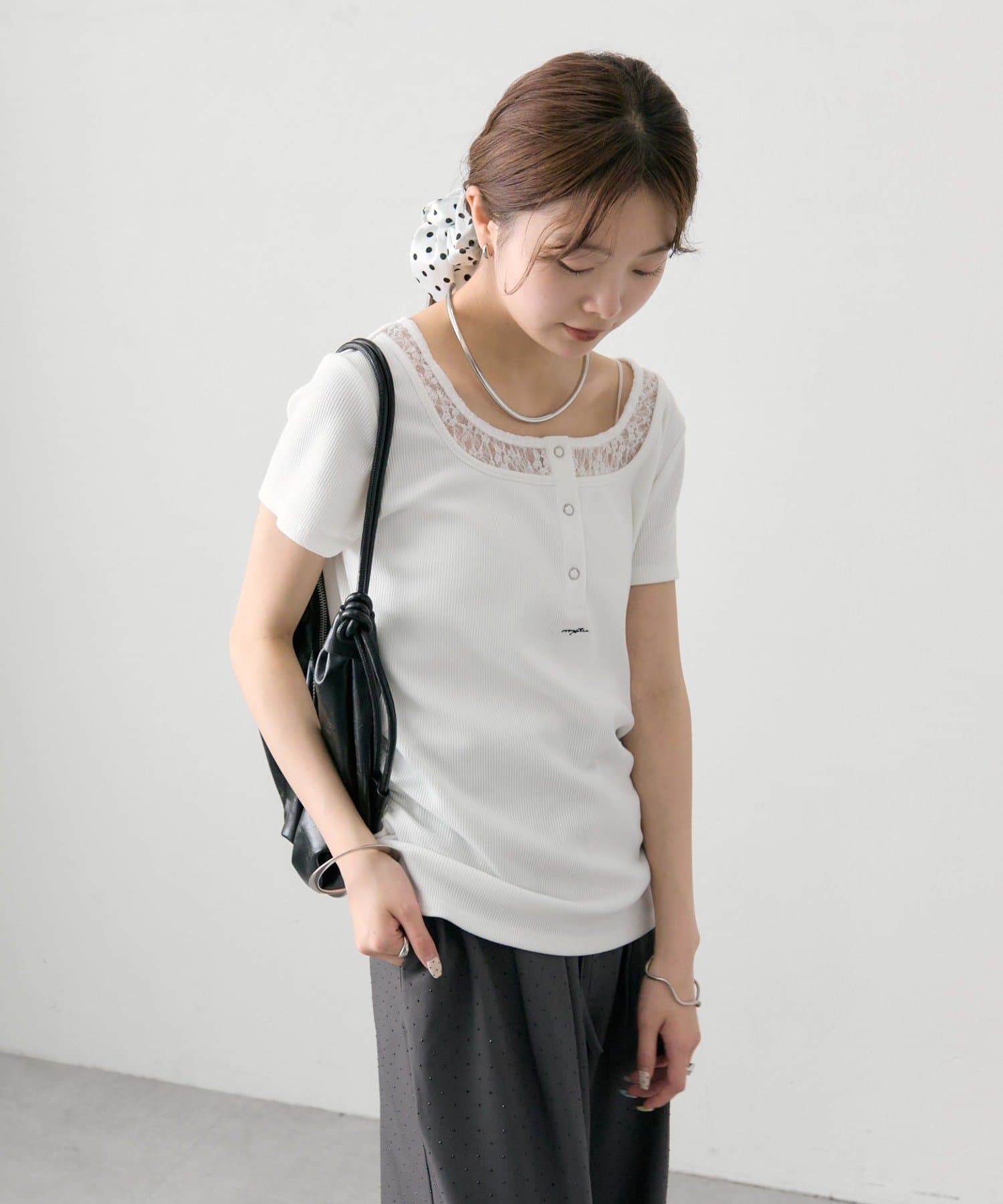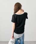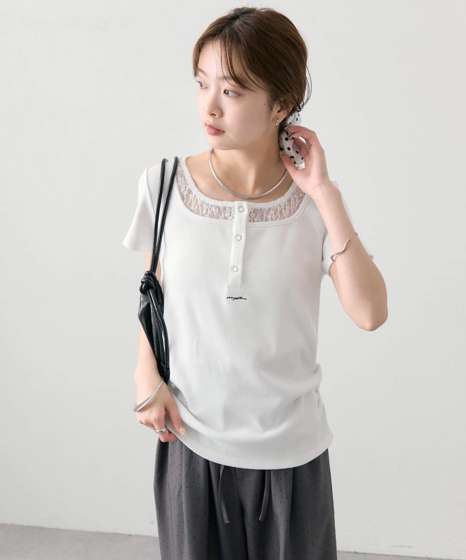 ・フロントのヘンリーボタンとレイヤード風デザインのネックラインが、シンプルながらもさりげないアクセントになっています。
