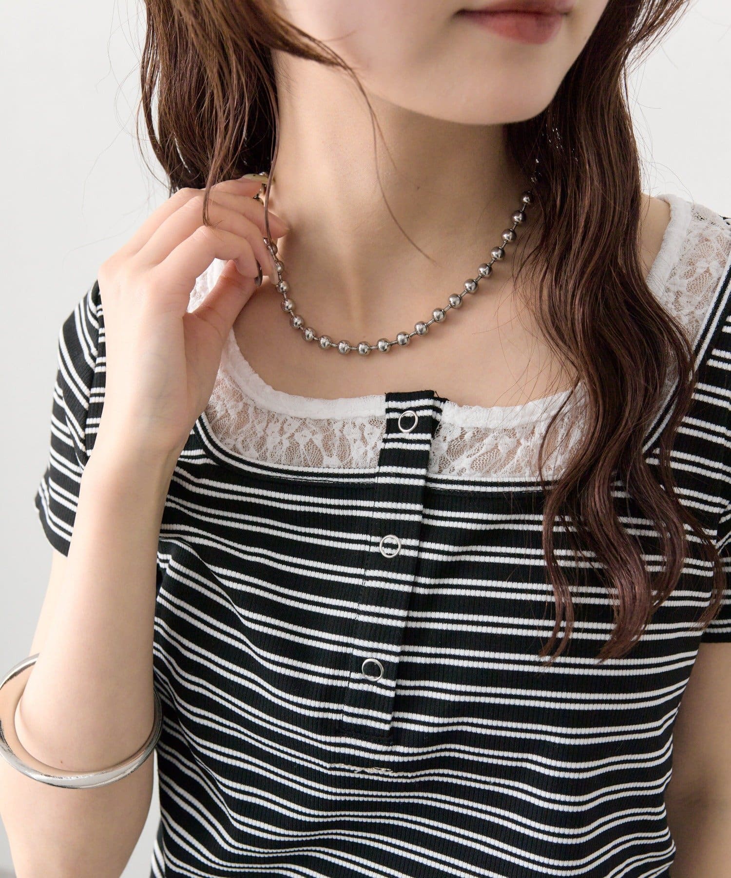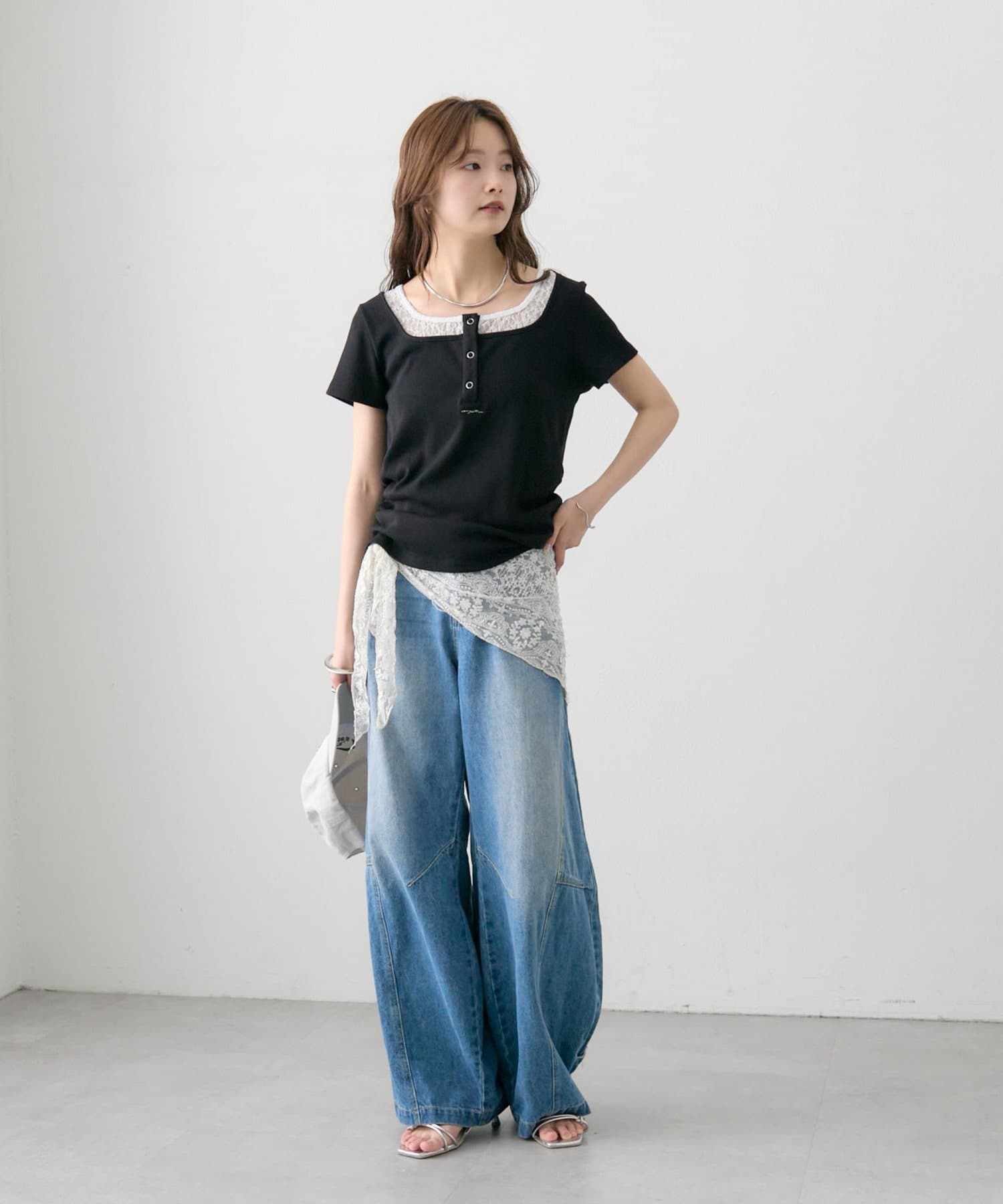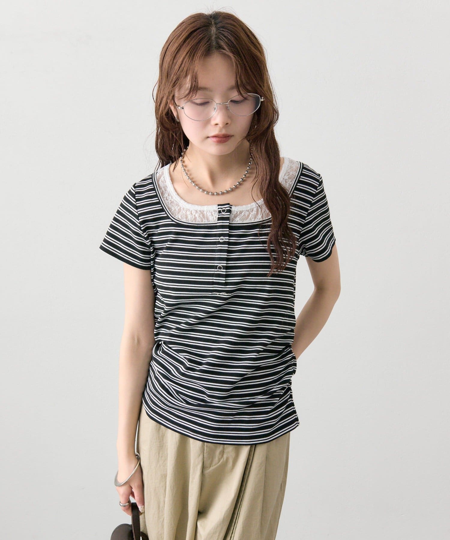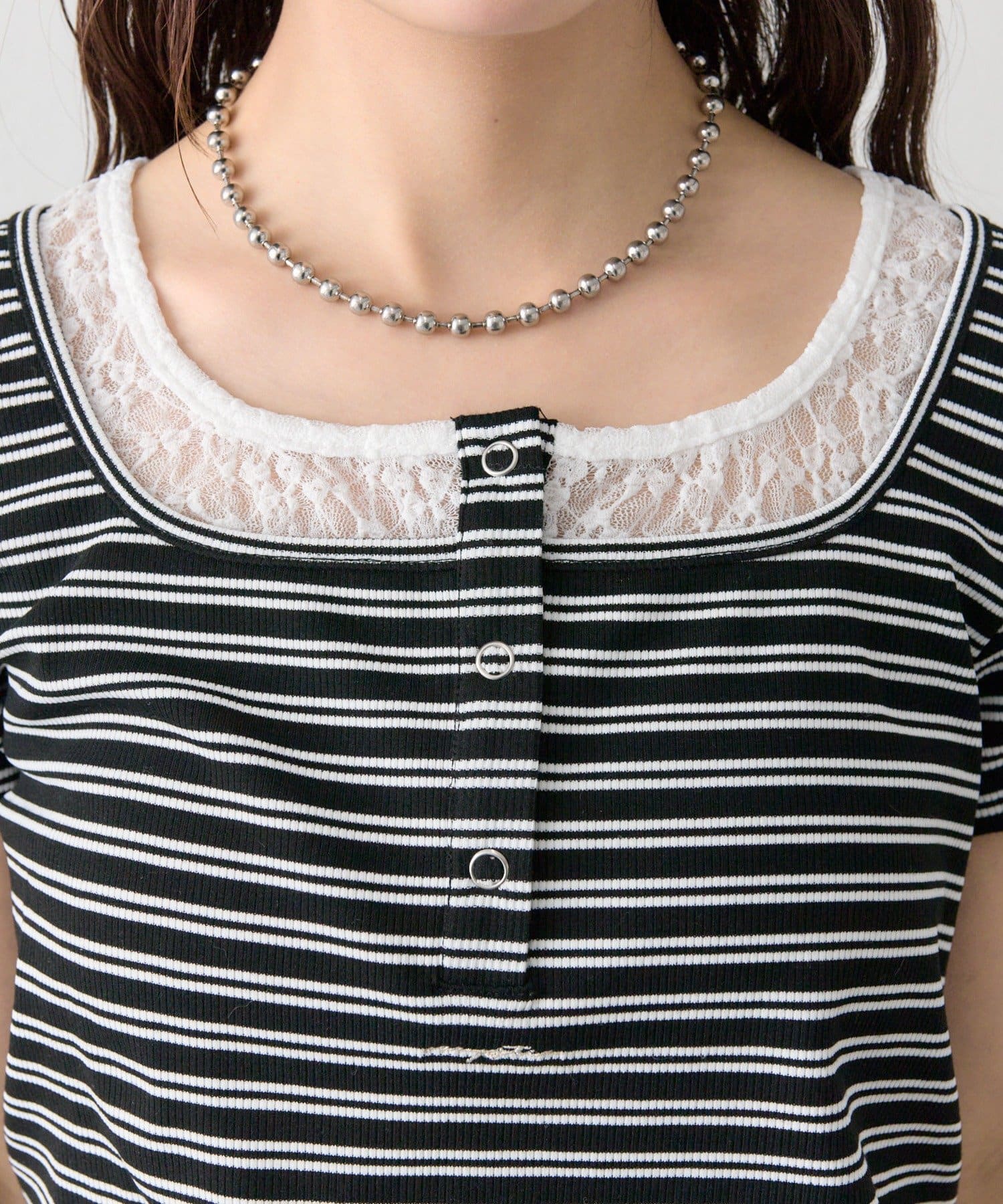 ・フロントのヘンリーボタンとレイヤード風デザインのネックラインが、シンプルながらもさりげないアクセントになっています。